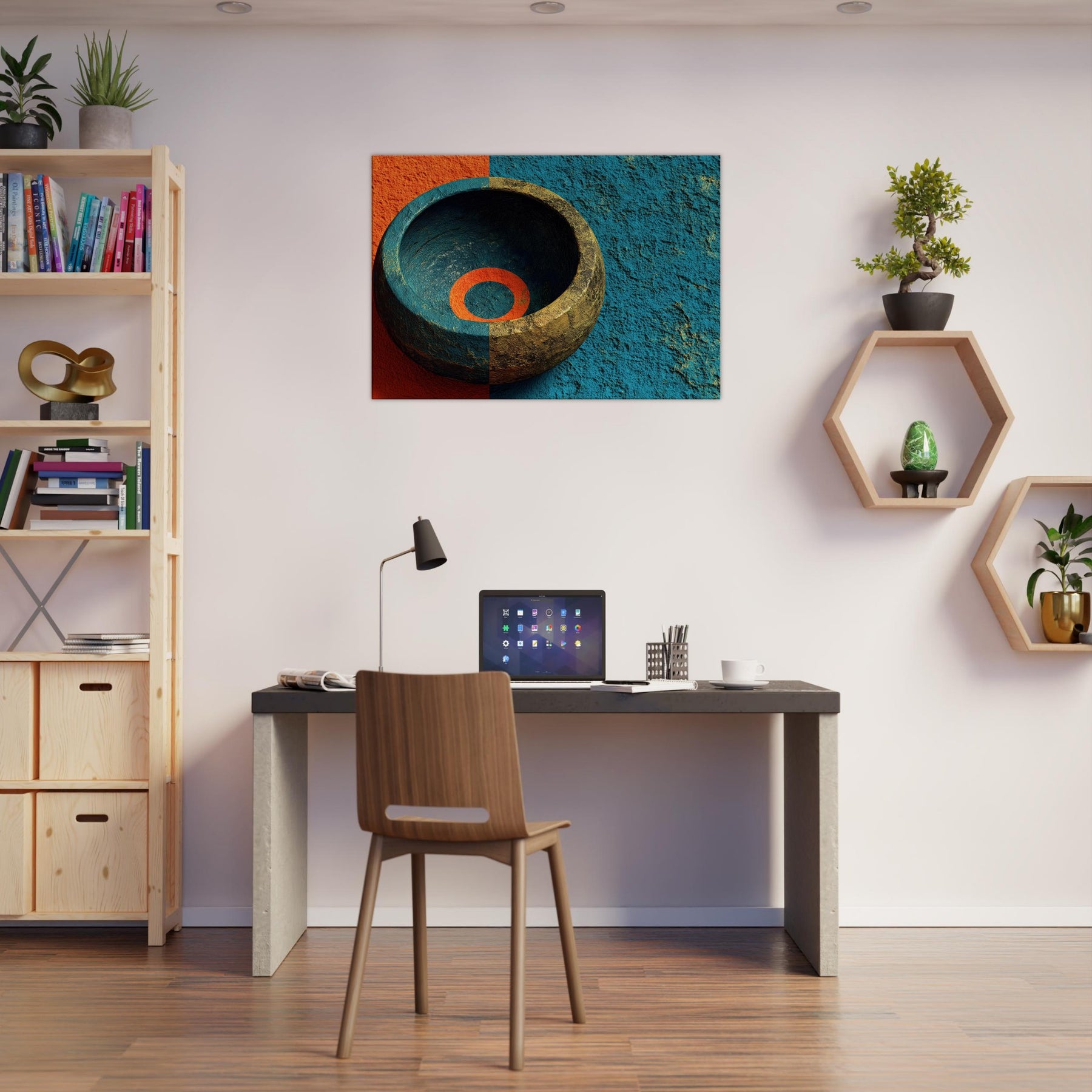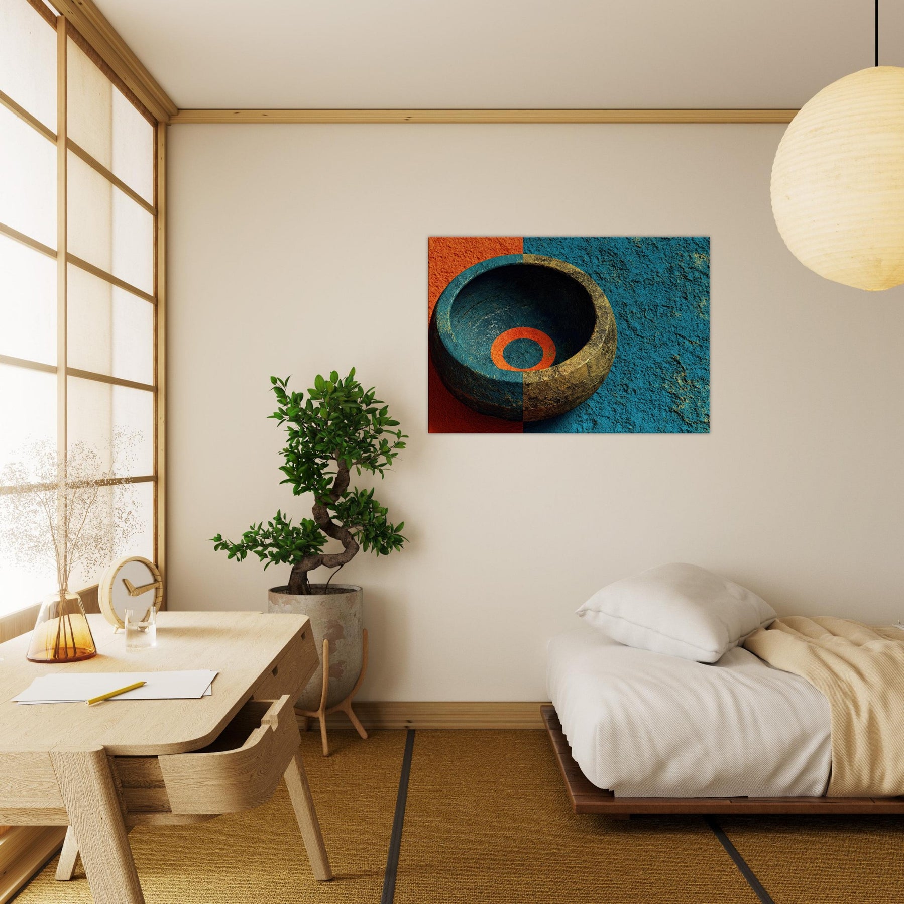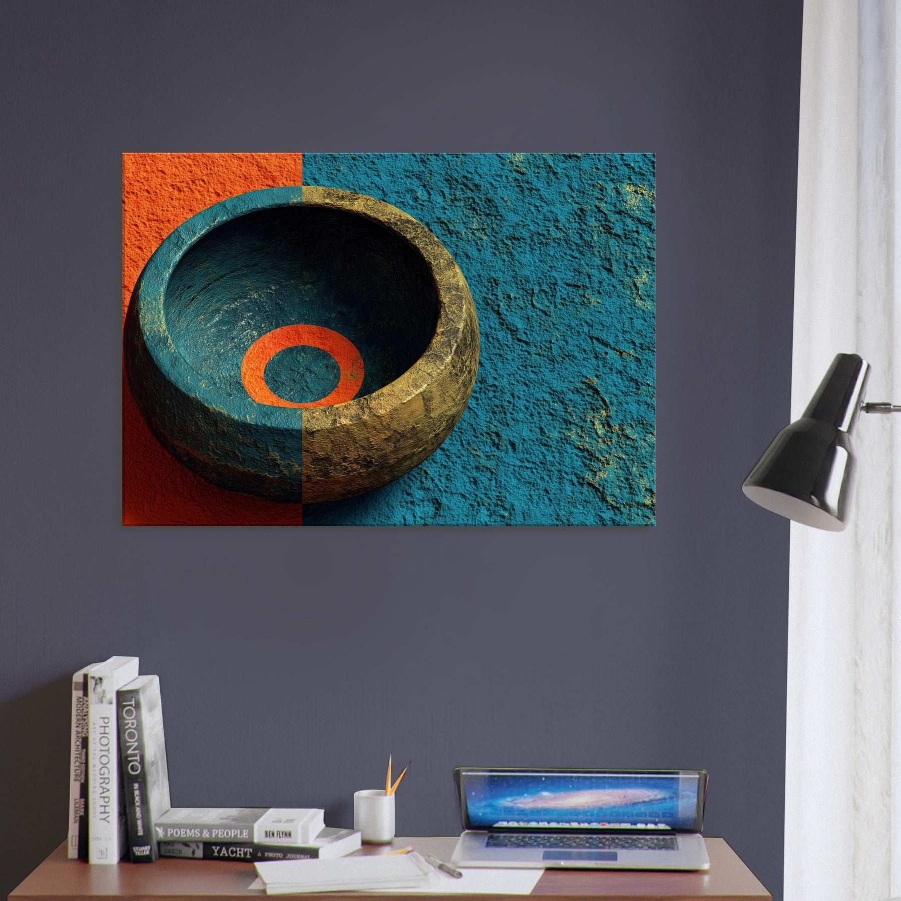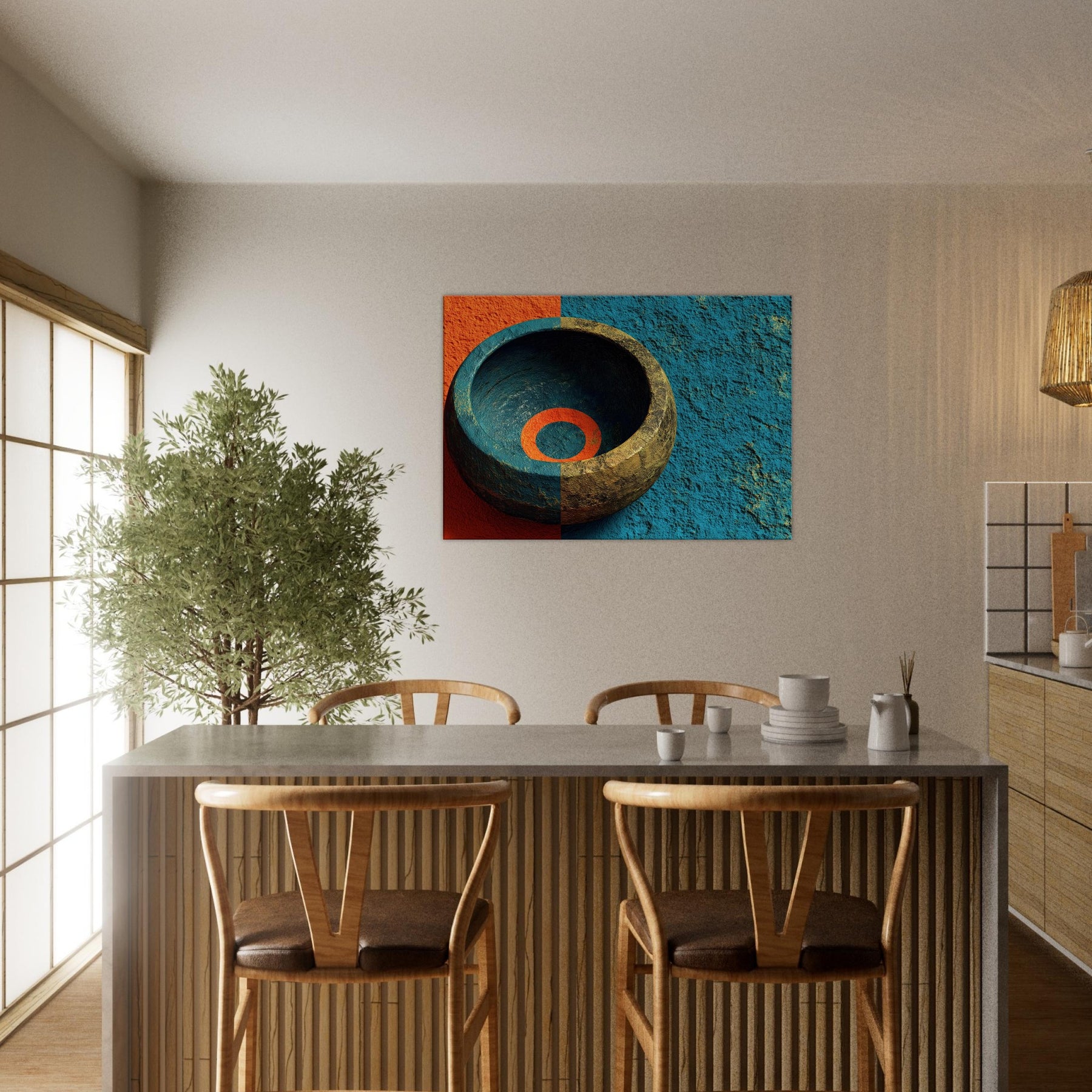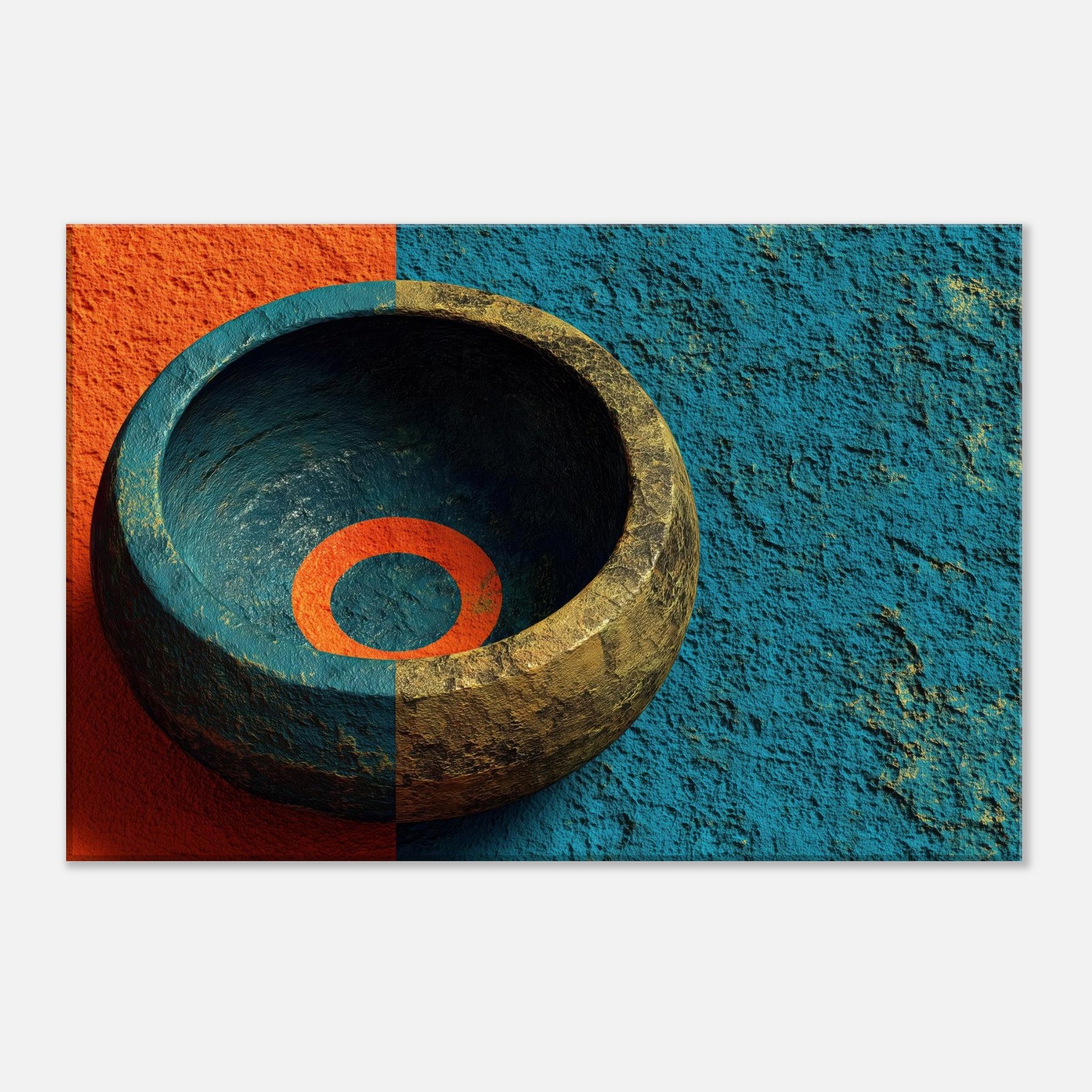 Let the Singing Bowl summon a quiet, celestial pulse within your living room. This abstract composition swirls the vessel’s warmth with a dawn tinged blue, as if sound could vibrate the air and soften its edges. The piece invites soft light to pool in its inner ring, turning a hallway or lounge into a sanctuary where rituals of breath and memory unfold. It is a mystical invitation to slow time and listen, to let ambience become art.