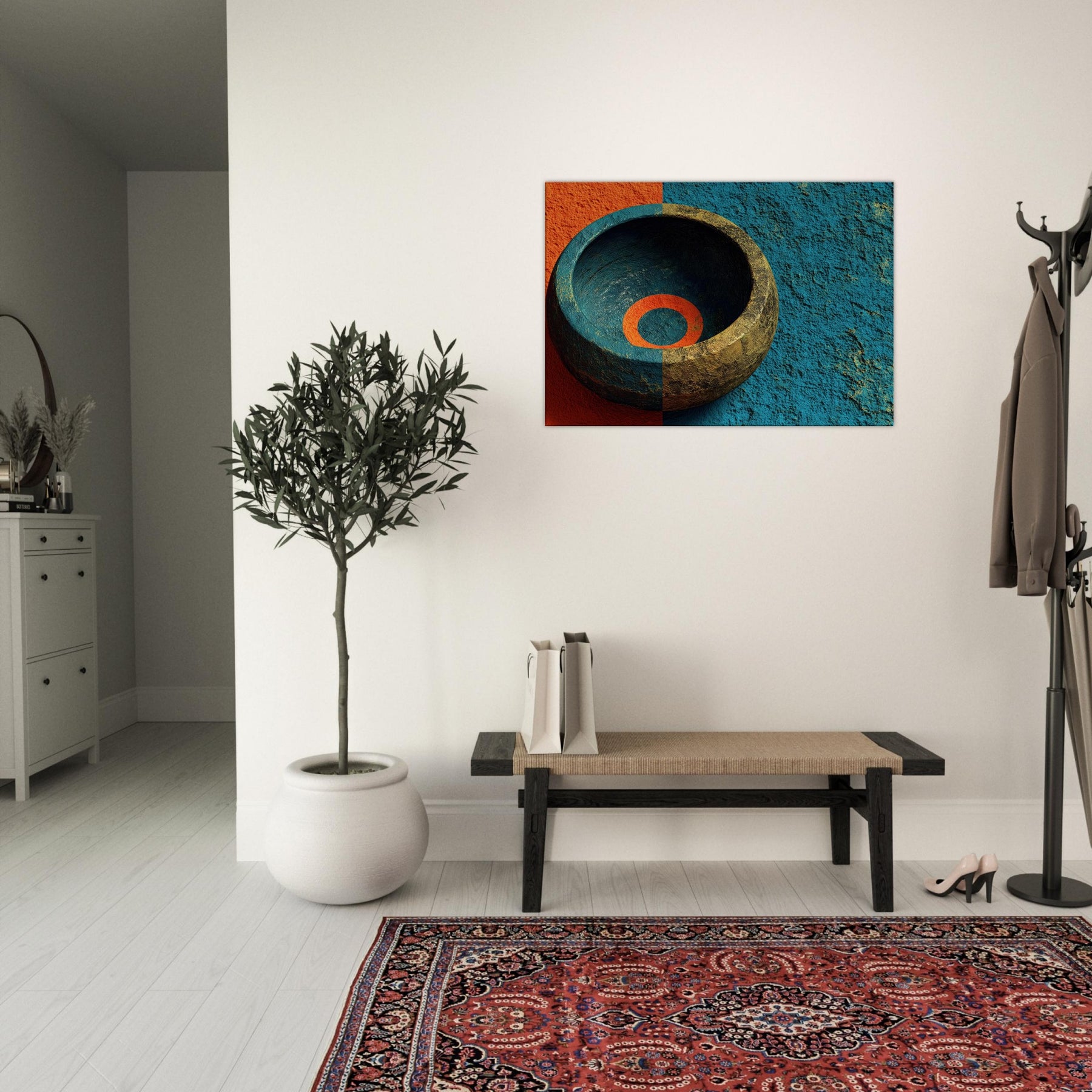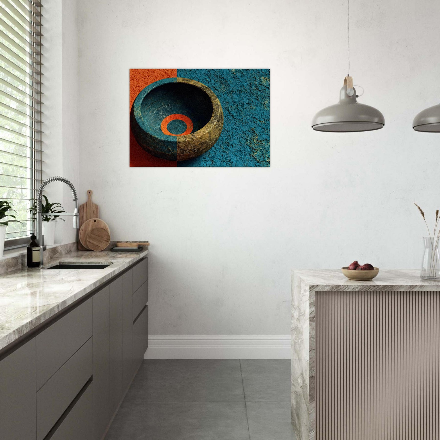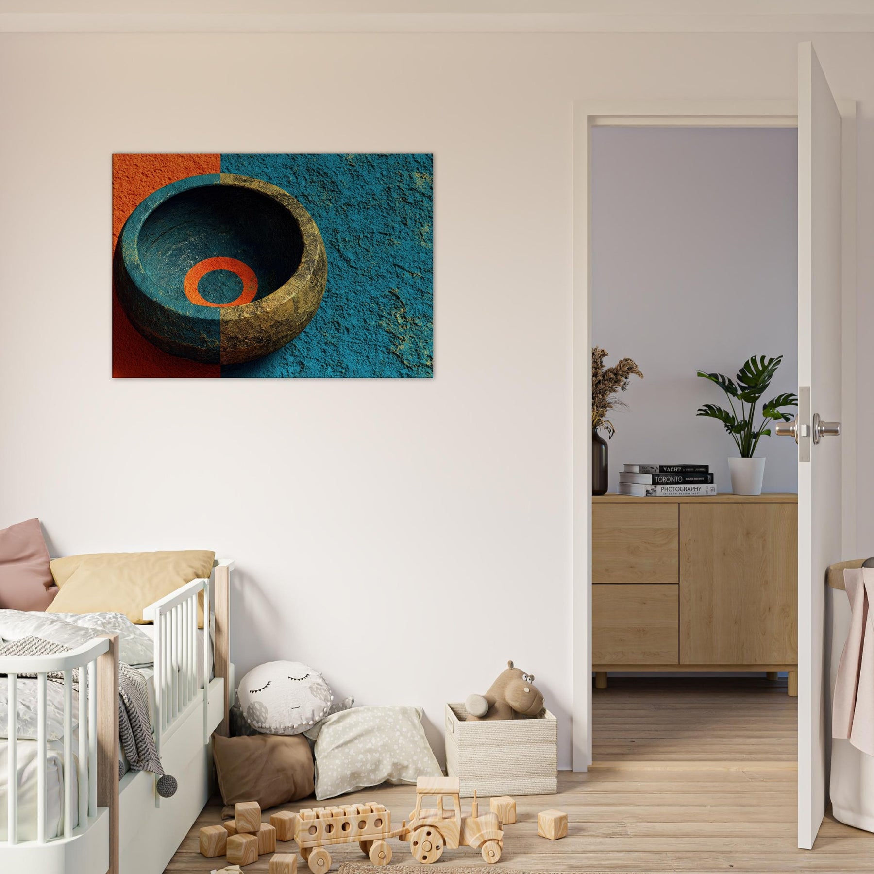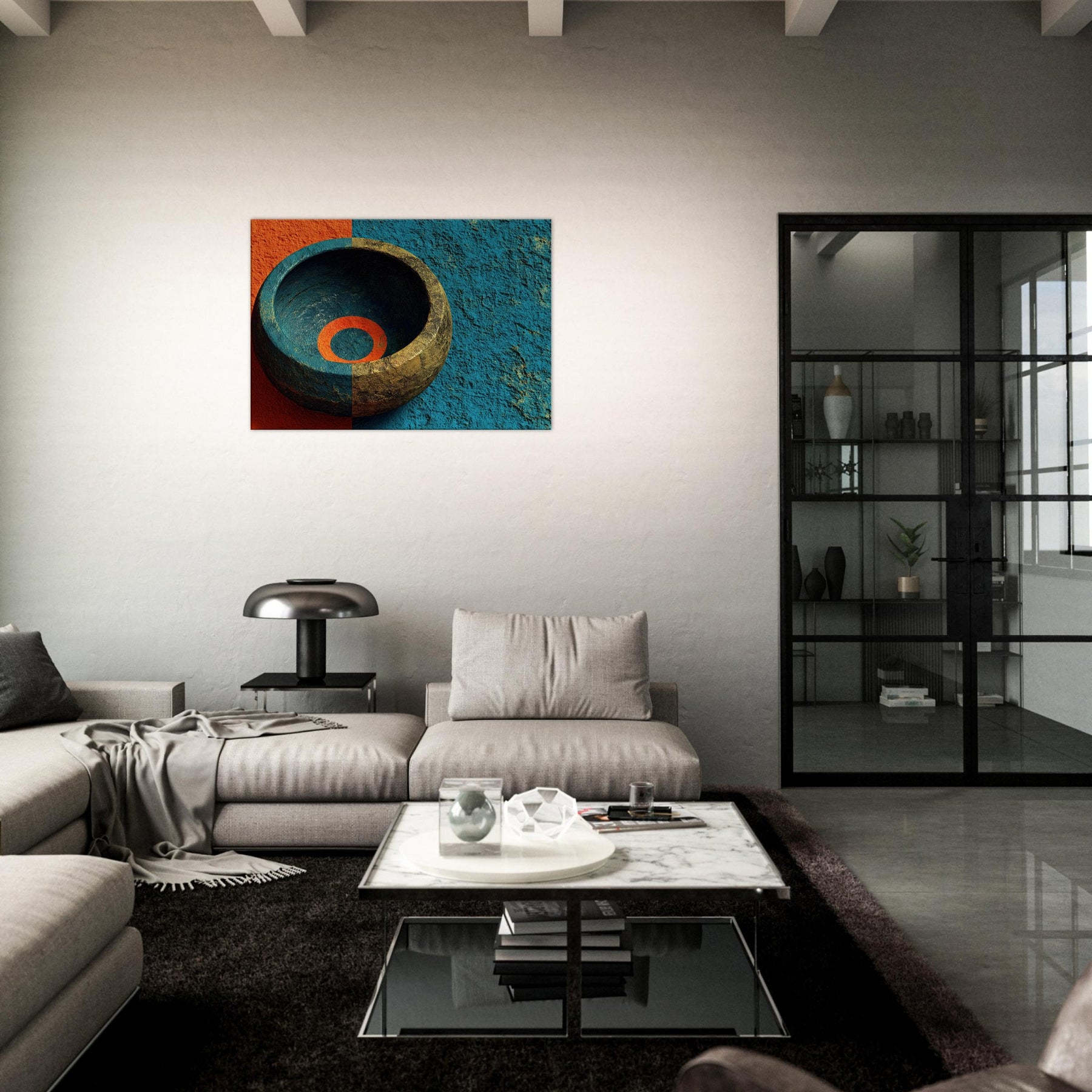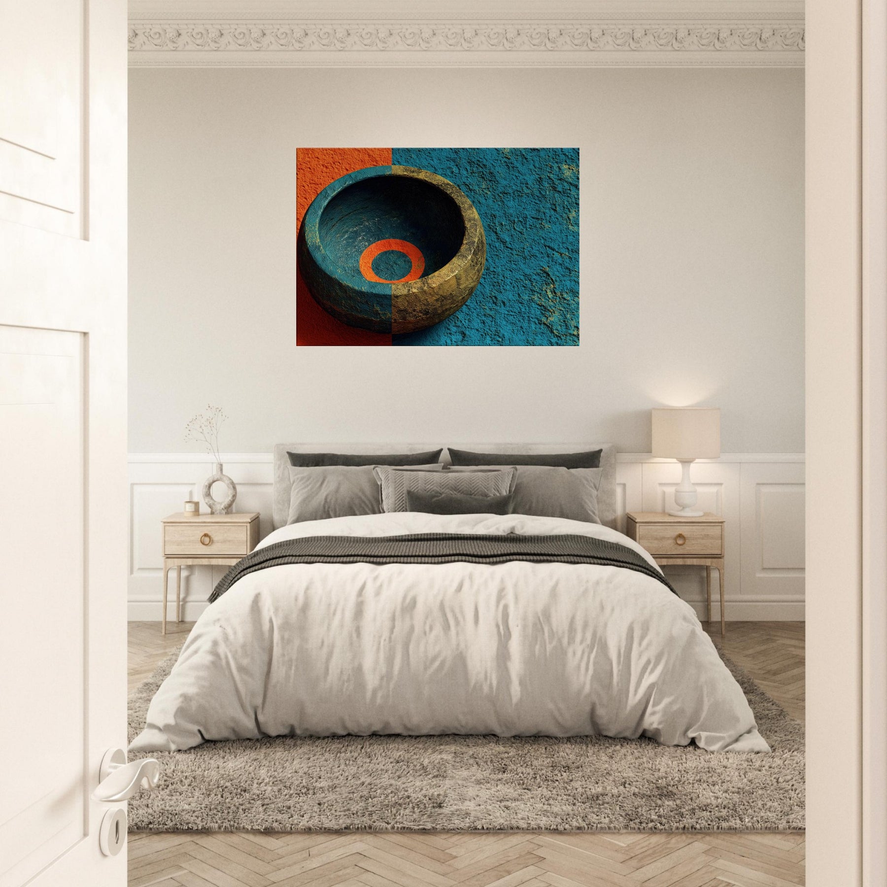 Let the Singing Bowl summon a quiet, celestial pulse within your living room. This abstract composition swirls the vessel’s warmth with a dawn tinged blue, as if sound could vibrate the air and soften its edges. The piece invites soft light to pool in its inner ring, turning a hallway or lounge into a sanctuary where rituals of breath and memory unfold. It is a mystical invitation to slow time and listen, to let ambience become art.