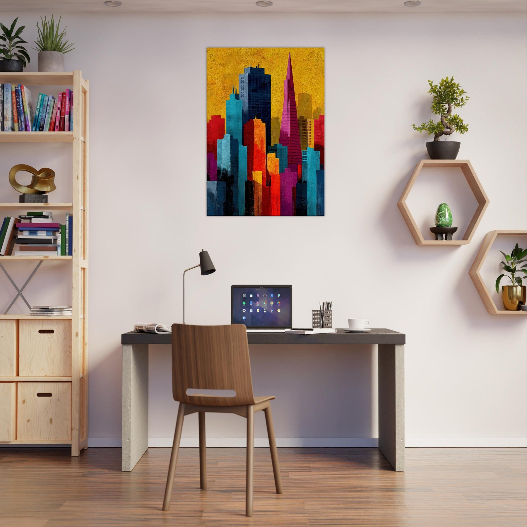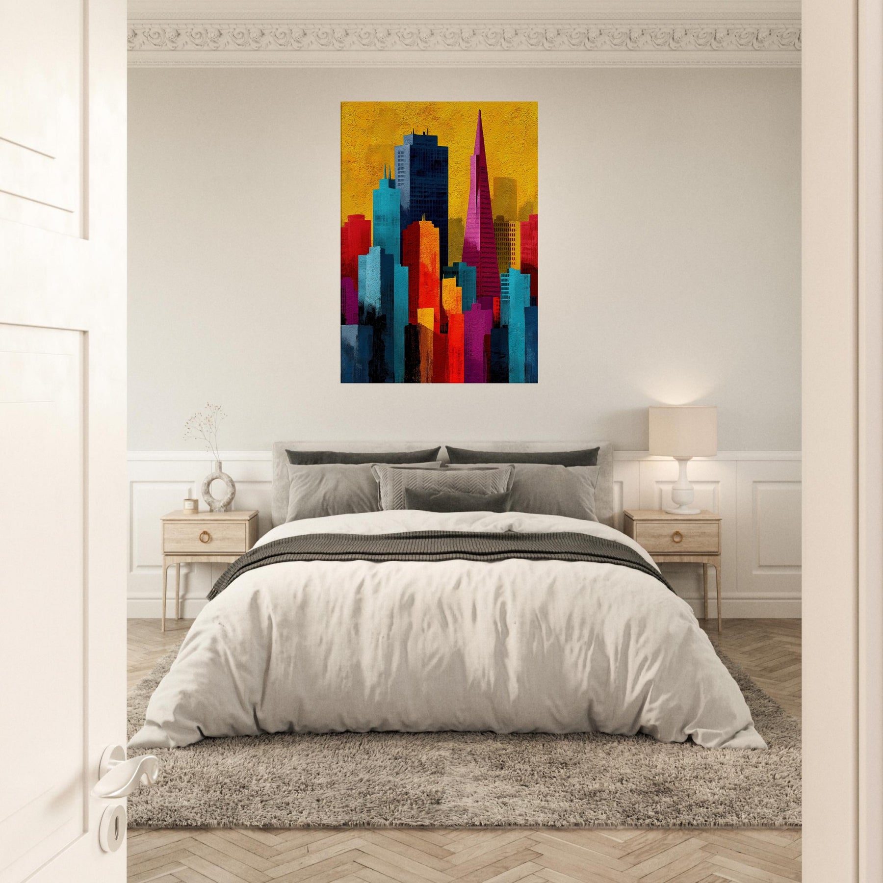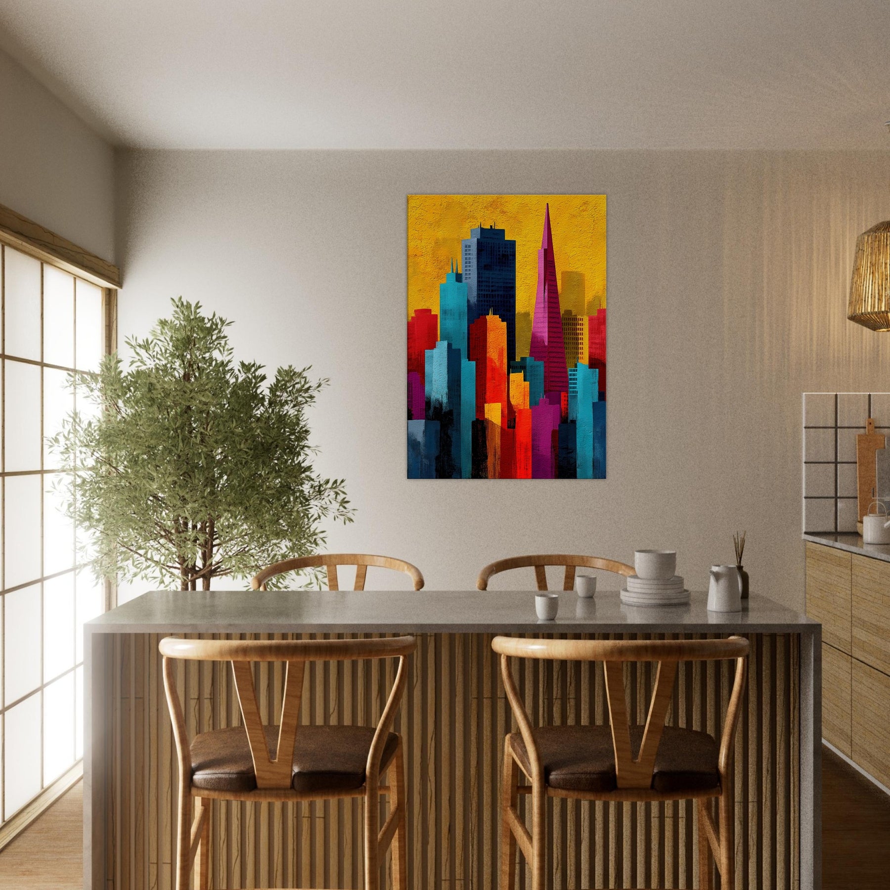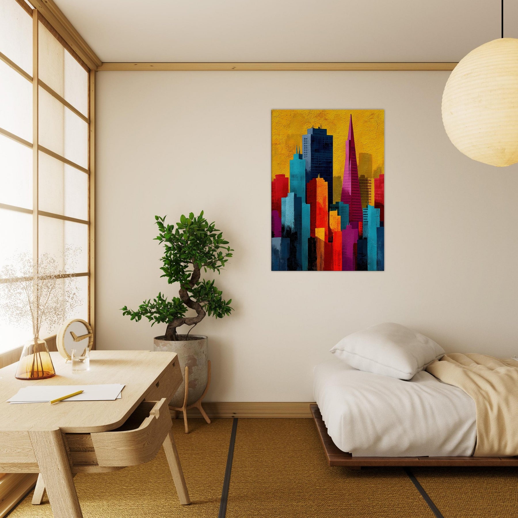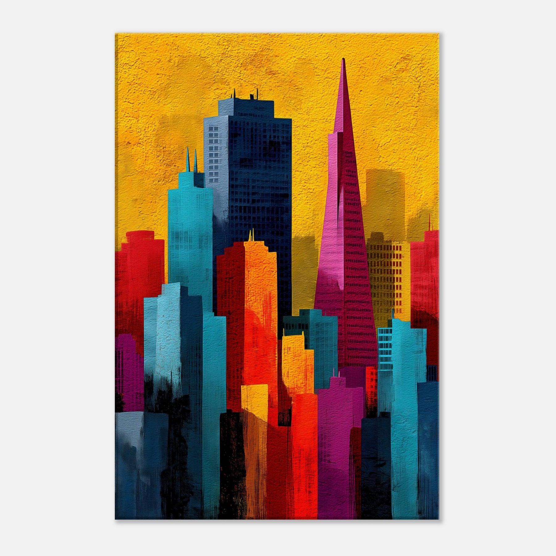 Immerse your space in a pulse of color and rhythm where San Francisco rises like a vivid memory. This abstract cityscape shifts with luminous blocks of turquoise, coral, and gold, capturing the energy of the bay and the hush of night under a sunlit sky. The artwork invites soft light and quiet corners to breathe, turning walls into a window of possibility. A modern heartbeat for living rooms, bedrooms, or studios, it endlessly reframes the urban dream.