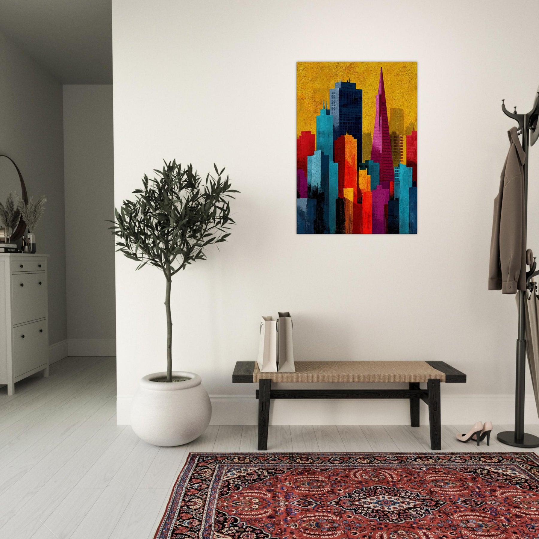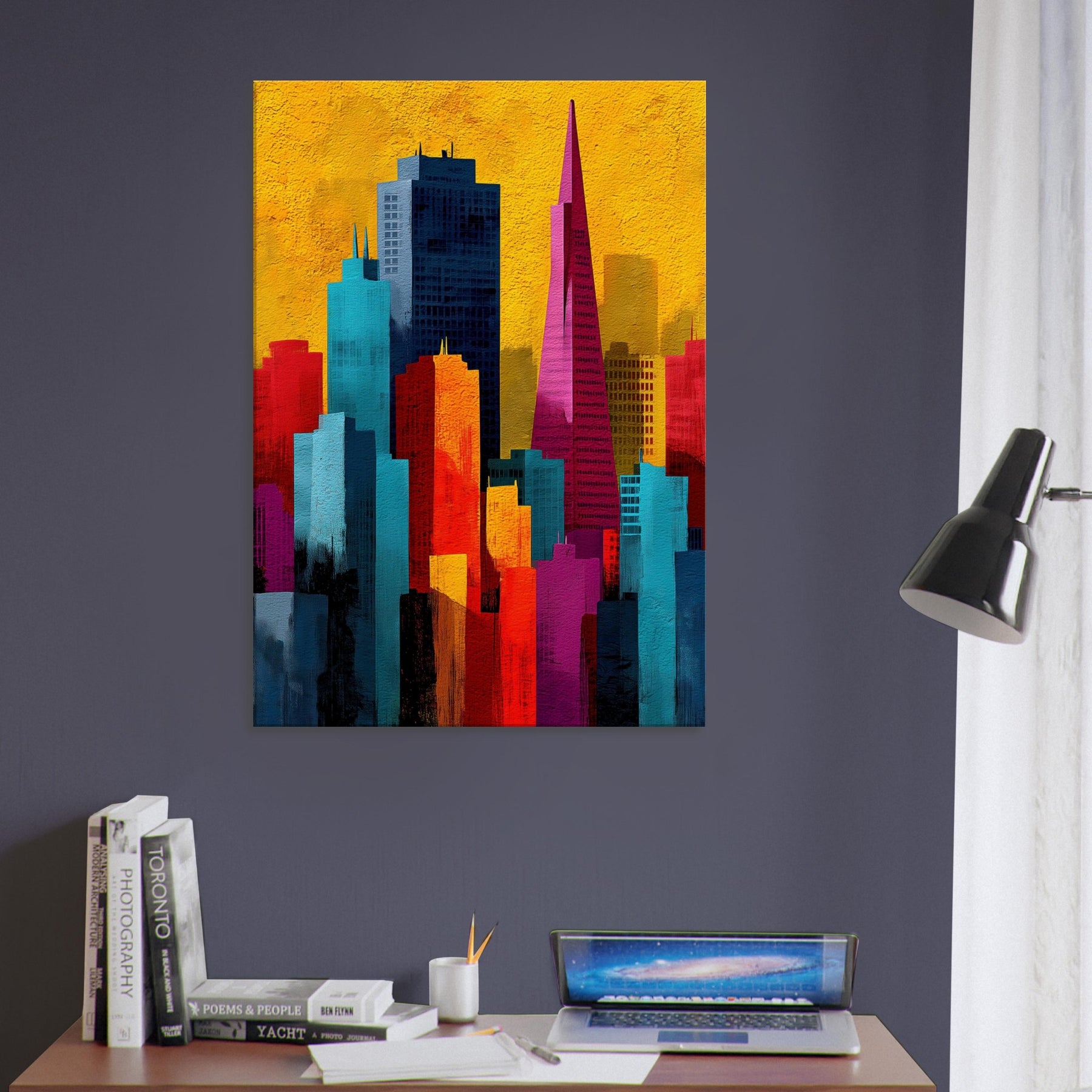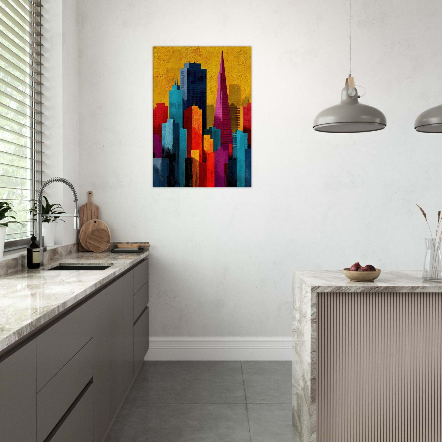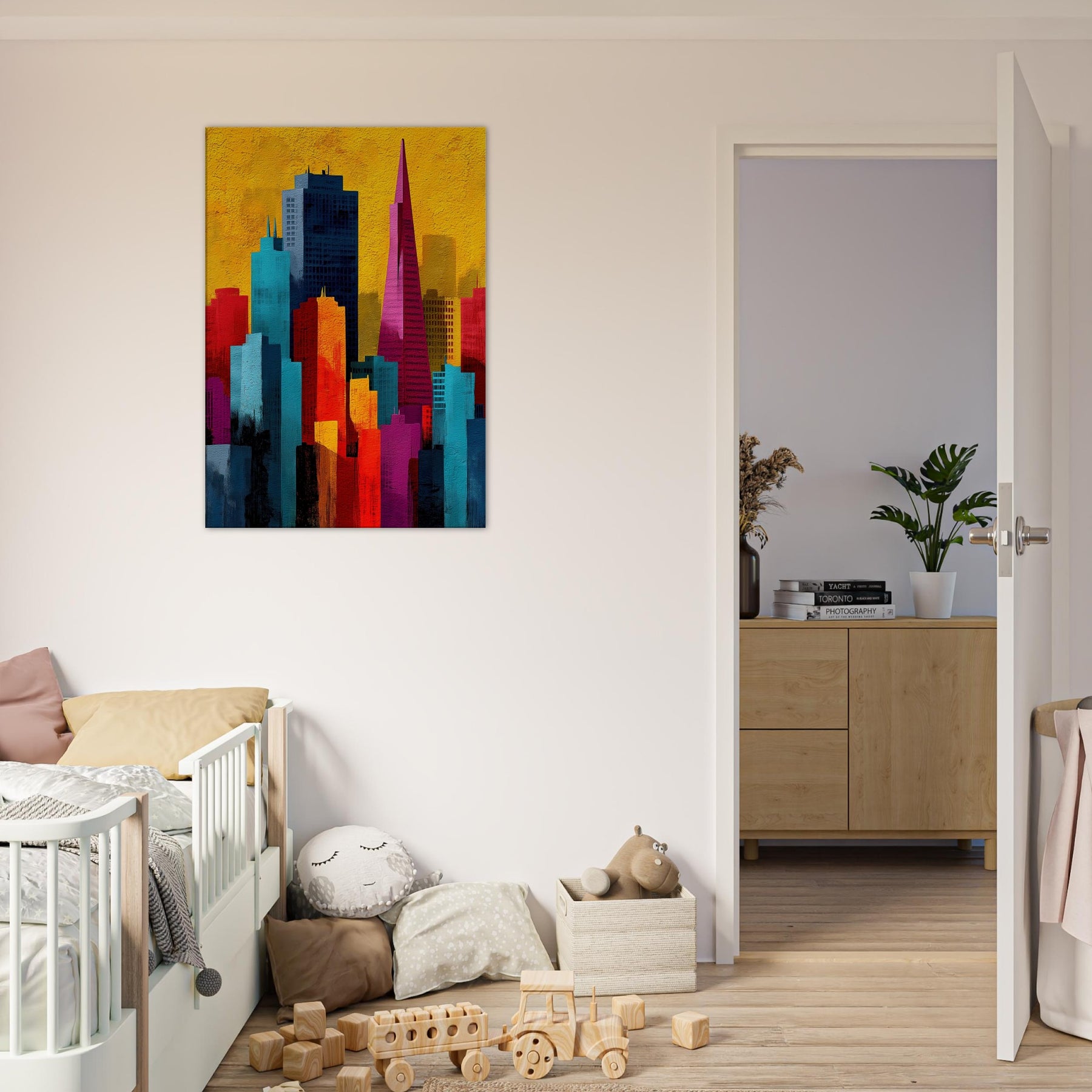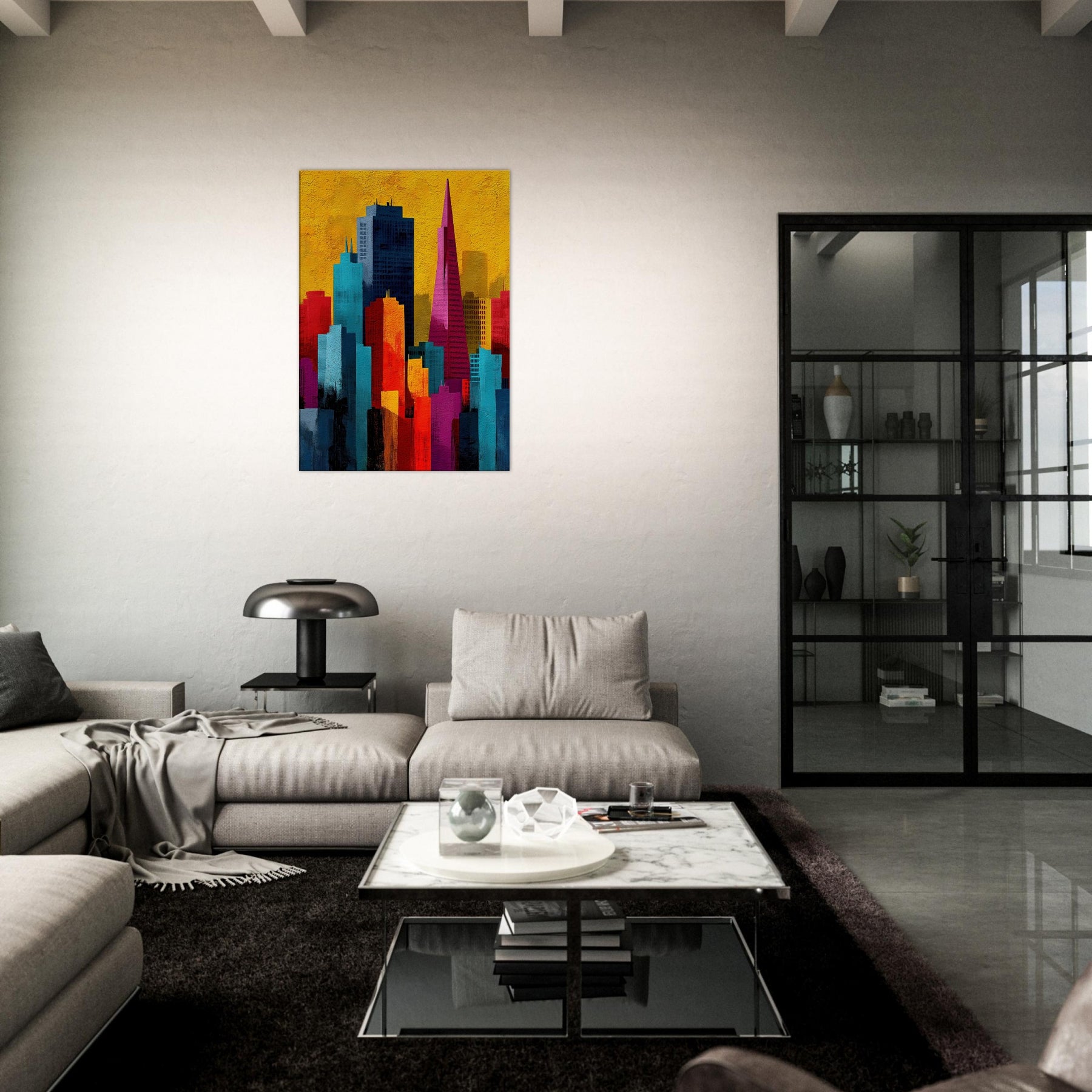 Immerse your space in a pulse of color and rhythm where San Francisco rises like a vivid memory. This abstract cityscape shifts with luminous blocks of turquoise, coral, and gold, capturing the energy of the bay and the hush of night under a sunlit sky. The artwork invites soft light and quiet corners to breathe, turning walls into a window of possibility. A modern heartbeat for living rooms, bedrooms, or studios, it endlessly reframes the urban dream.