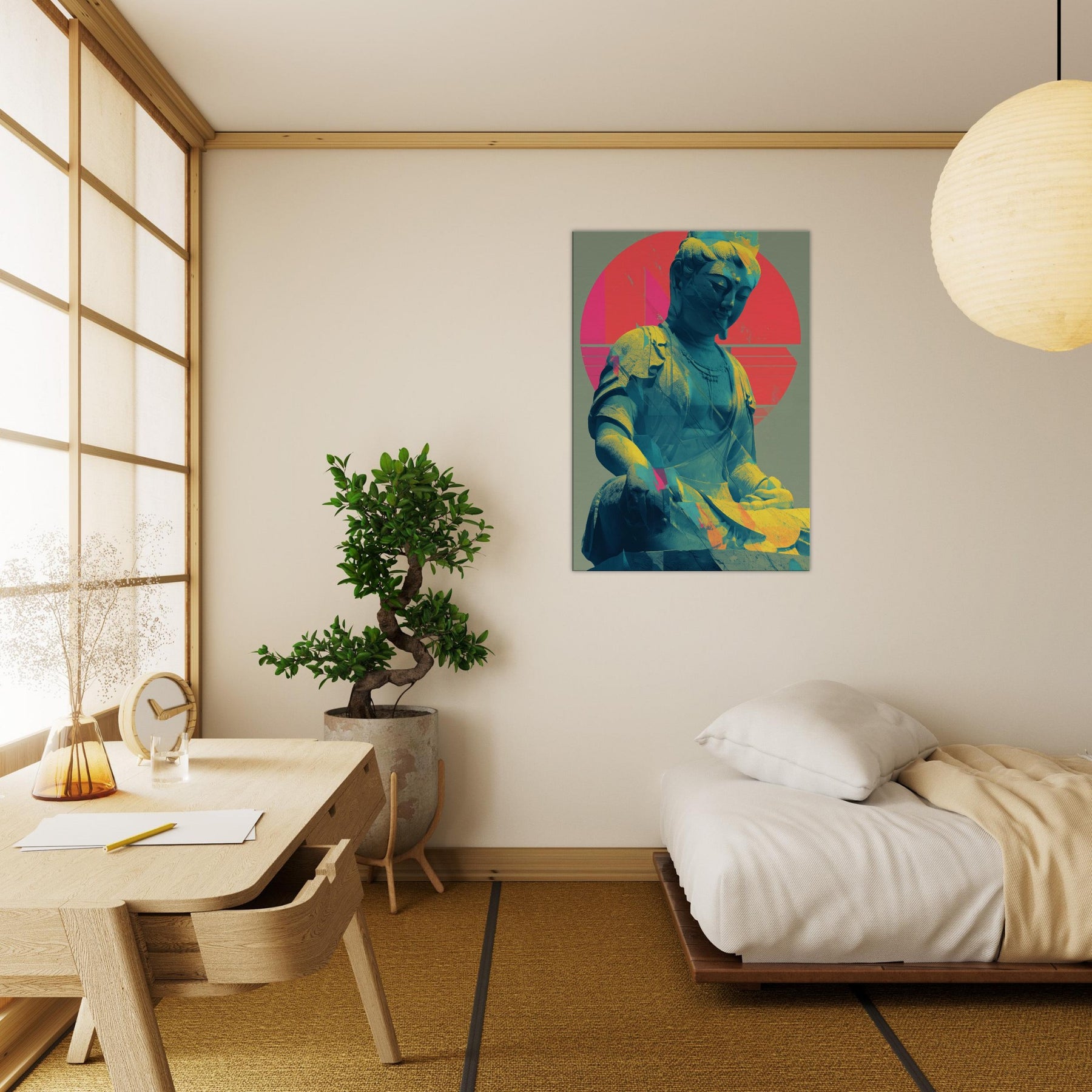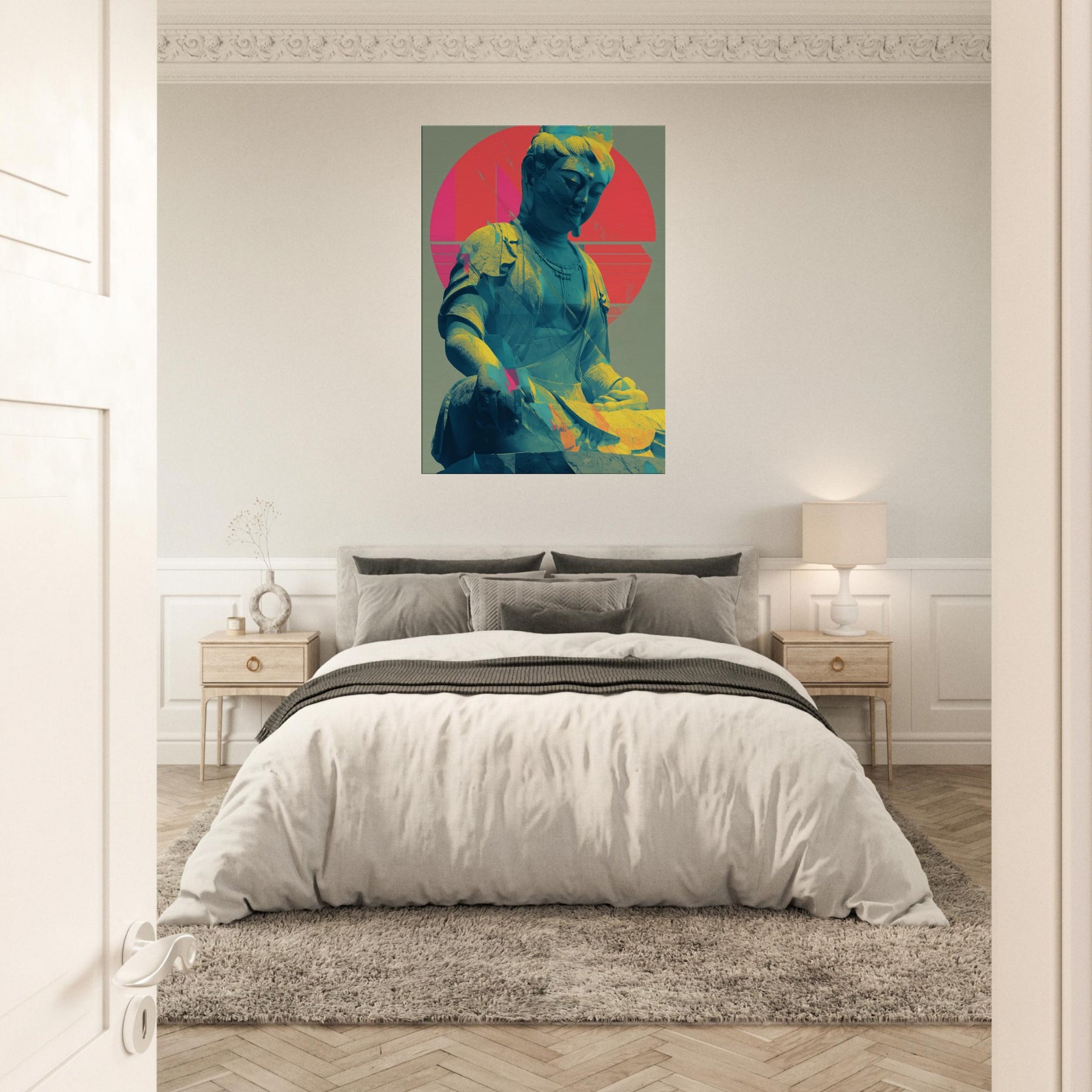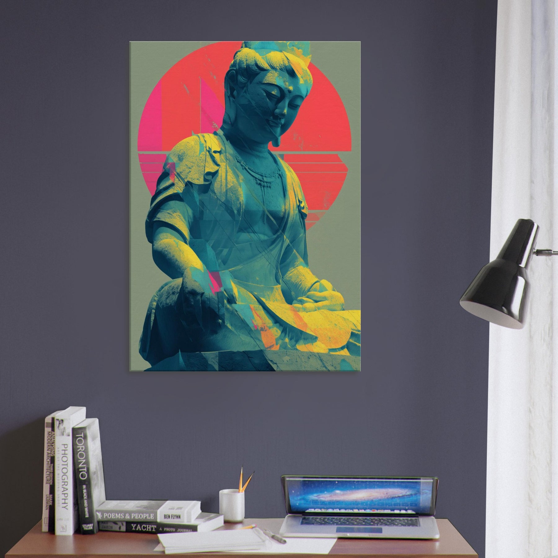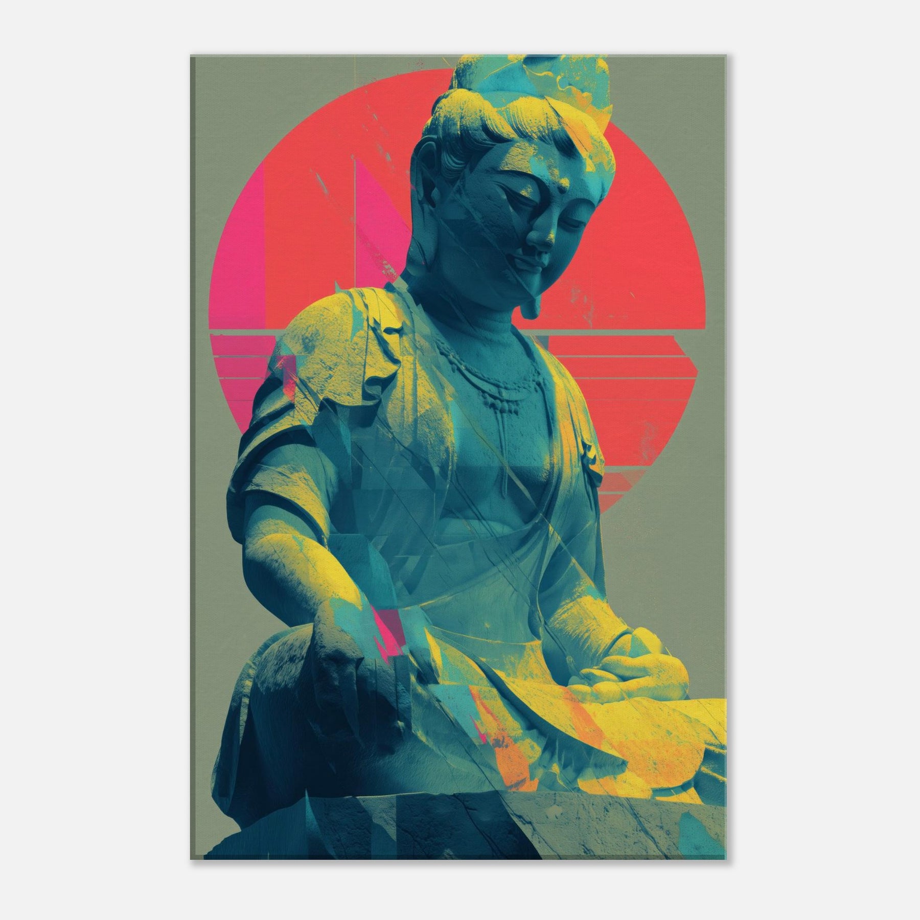 Guanyin, rendered in a luminous, dreamlike palette, emerges as a serene, meditative presence. The sculpture’s calm smile meets a halo of radiant circles and folded color, where turquoise blues drift into coral pinks and sunlit gold. This piece invites a quiet breath and a gentle gaze, turning any wall into a sanctuary. Place it beside a sofa or desk for a soft focal point that nurtures mindfulness and a glow of tranquil energy. The central subject is Kuan Yin (Guanyin).