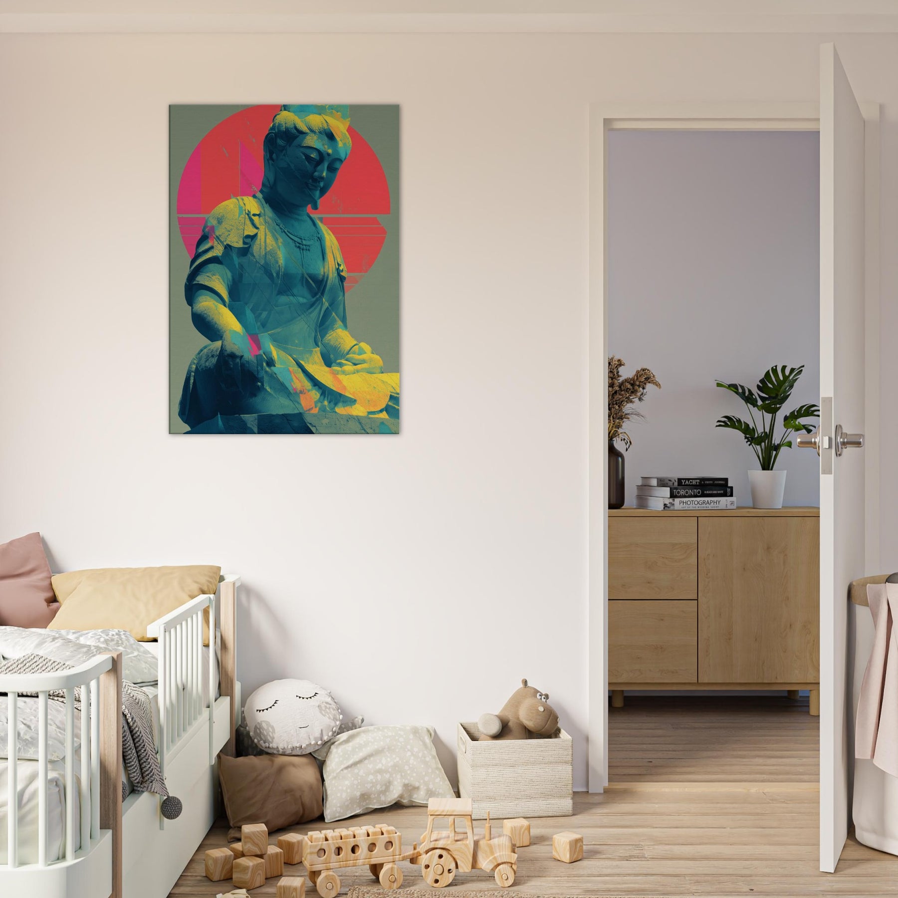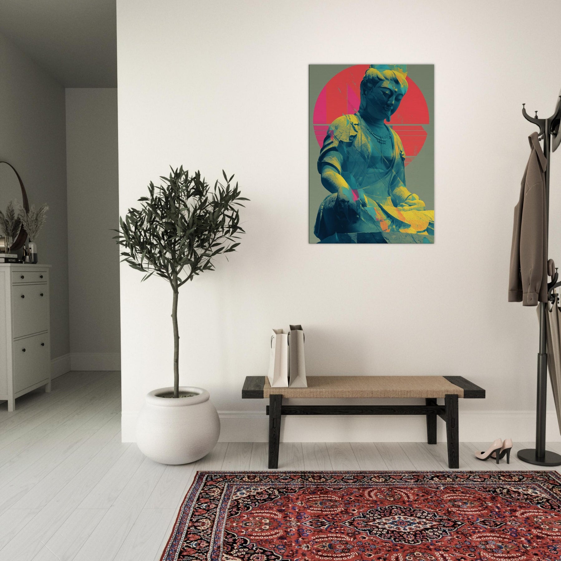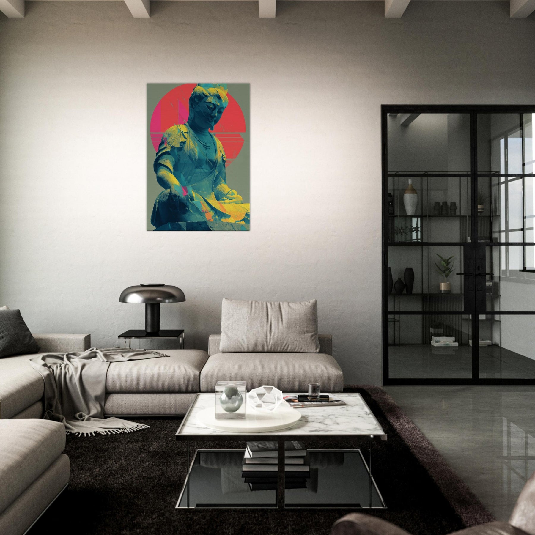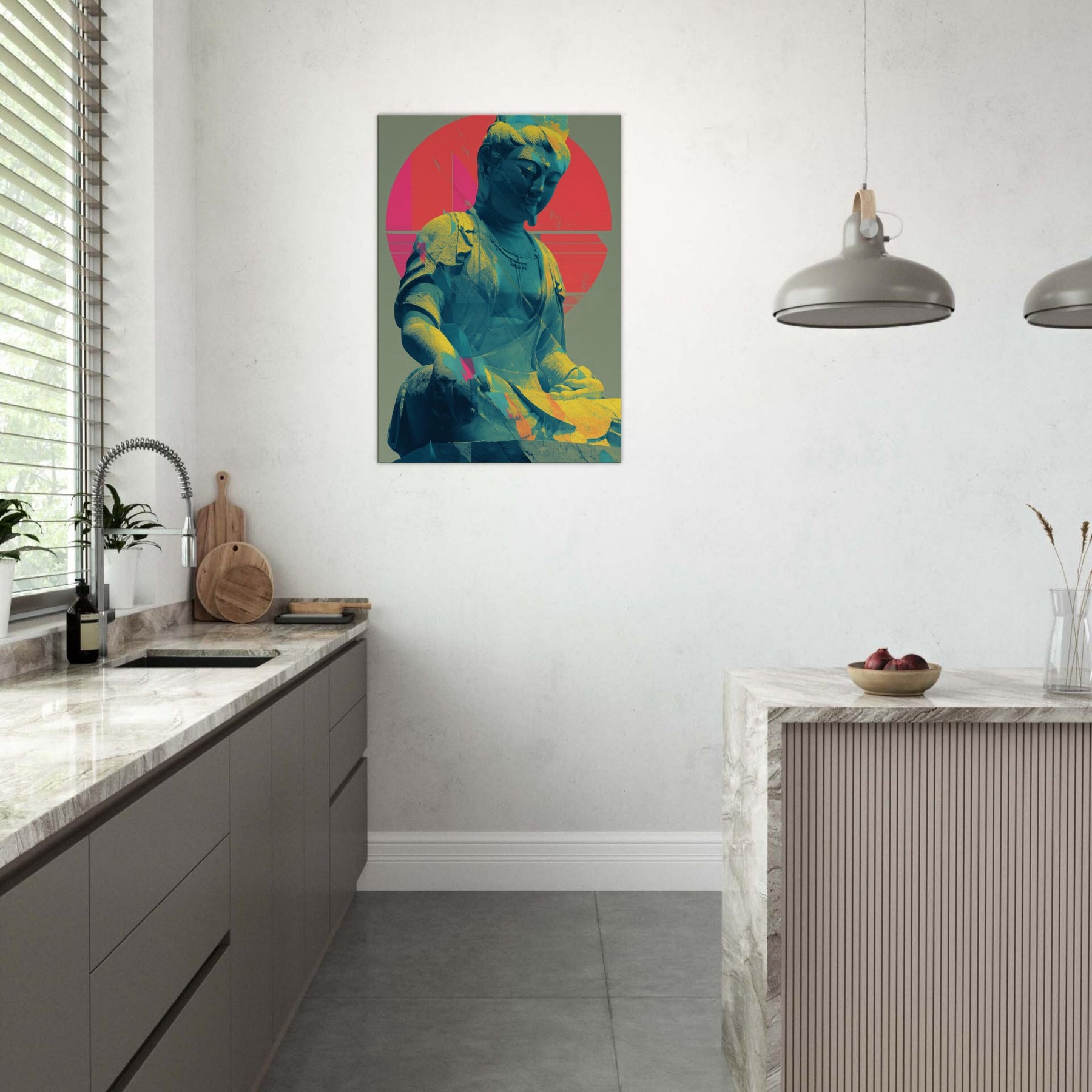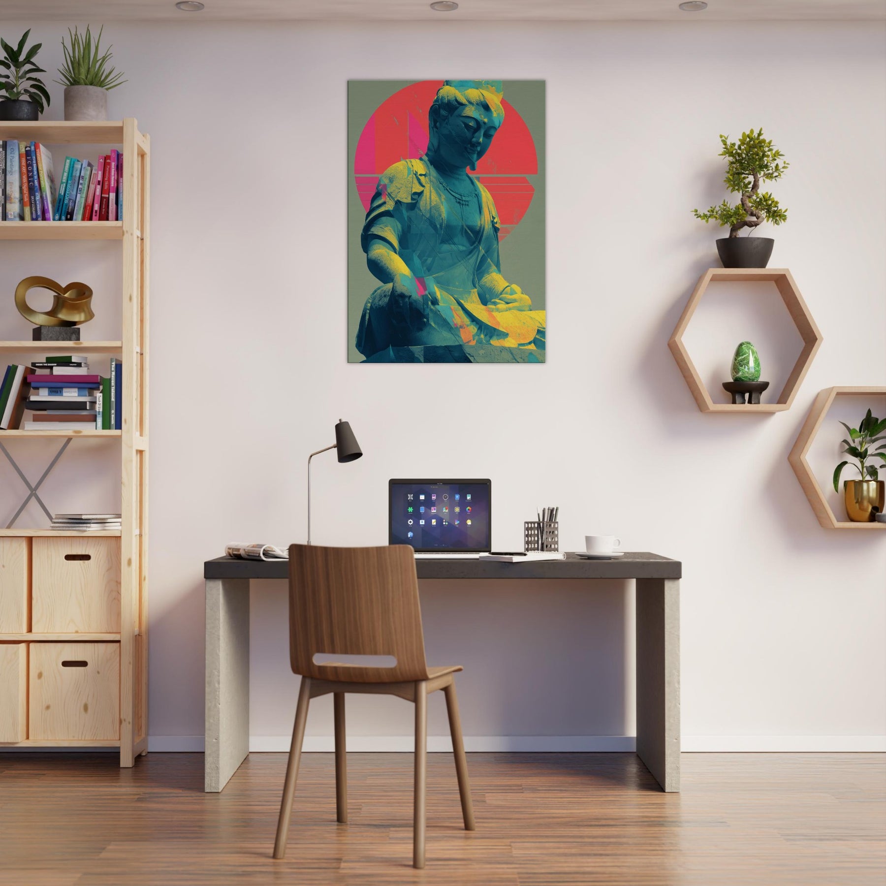 Guanyin, rendered in a luminous, dreamlike palette, emerges as a serene, meditative presence. The sculpture’s calm smile meets a halo of radiant circles and folded color, where turquoise blues drift into coral pinks and sunlit gold. This piece invites a quiet breath and a gentle gaze, turning any wall into a sanctuary. Place it beside a sofa or desk for a soft focal point that nurtures mindfulness and a glow of tranquil energy. The central subject is Kuan Yin (Guanyin).