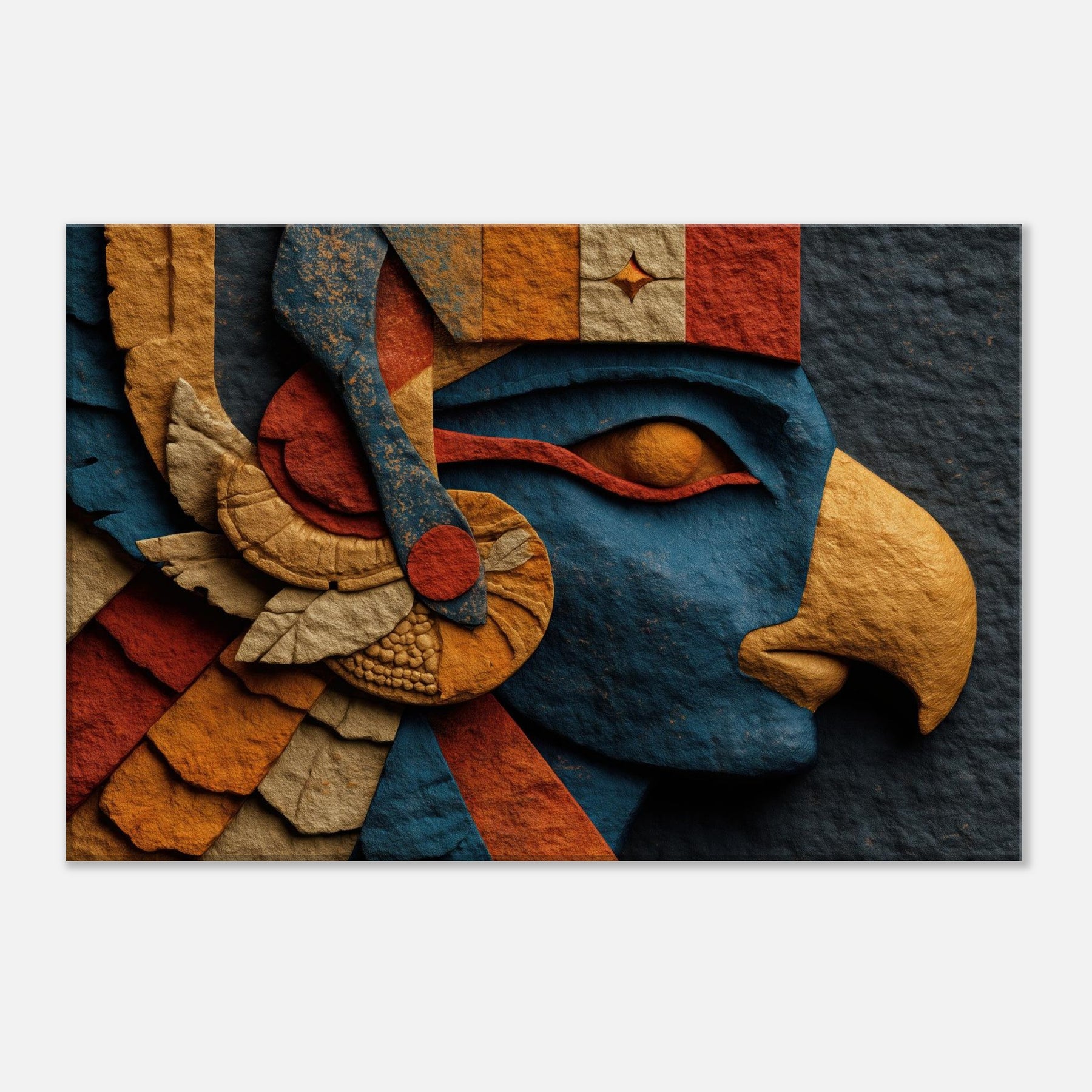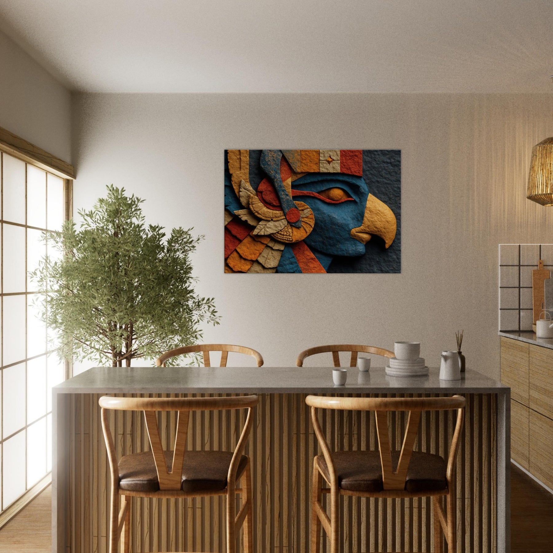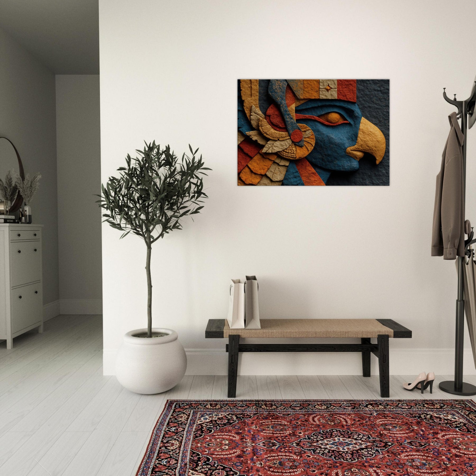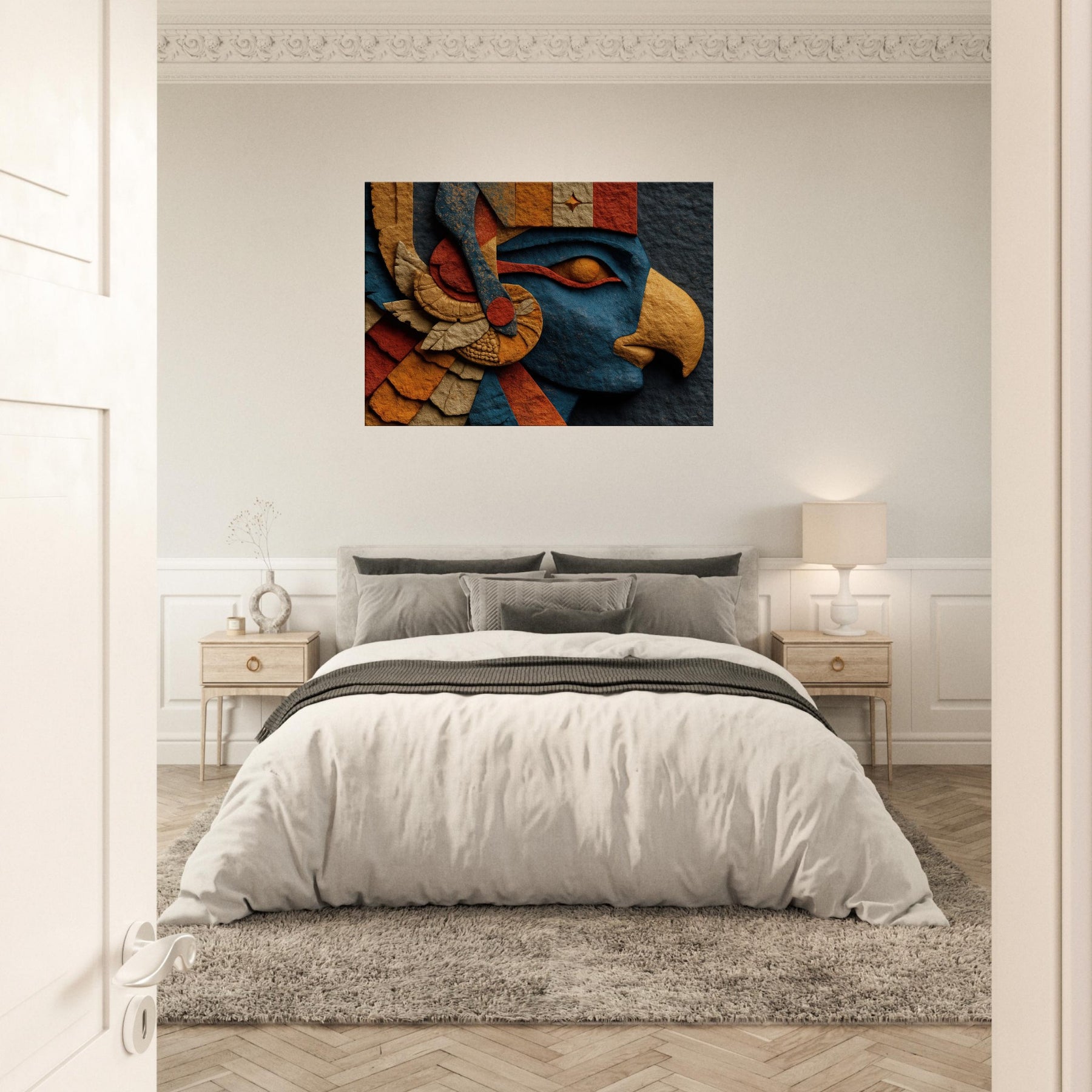 An immersive, luminous tribute to Ra, the Egyptian Sun God with A Falcon Head and Solar Crown, rendered in layered, tactile shapes that recall ancient reliefs. The palette of deep blues, sun warmed golds, and clay reds glows with dawn and dusk, inviting contemplation and conversation. The piece exudes majesty and motion, elevating living spaces with a cinematic presence that feels both timeless and alive.