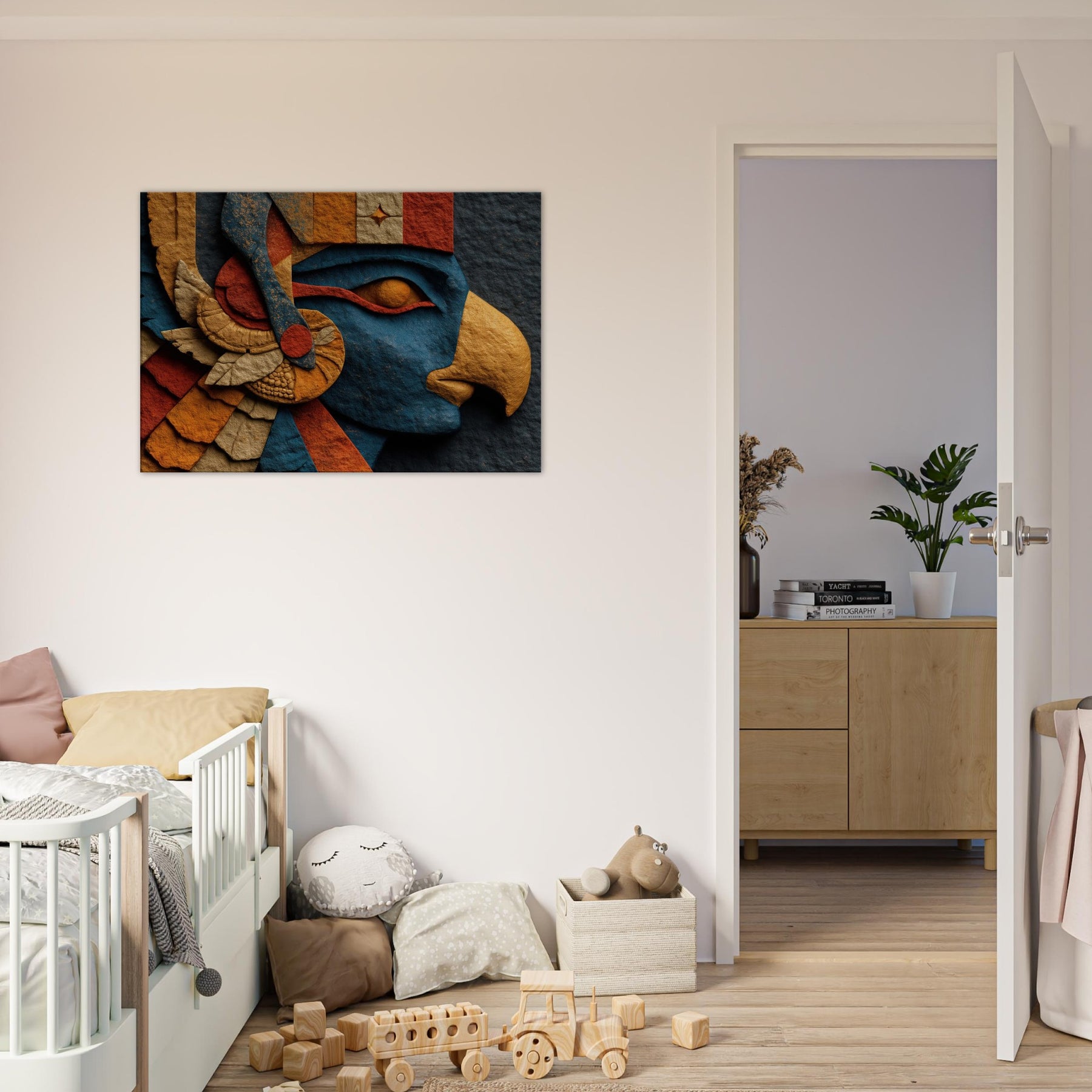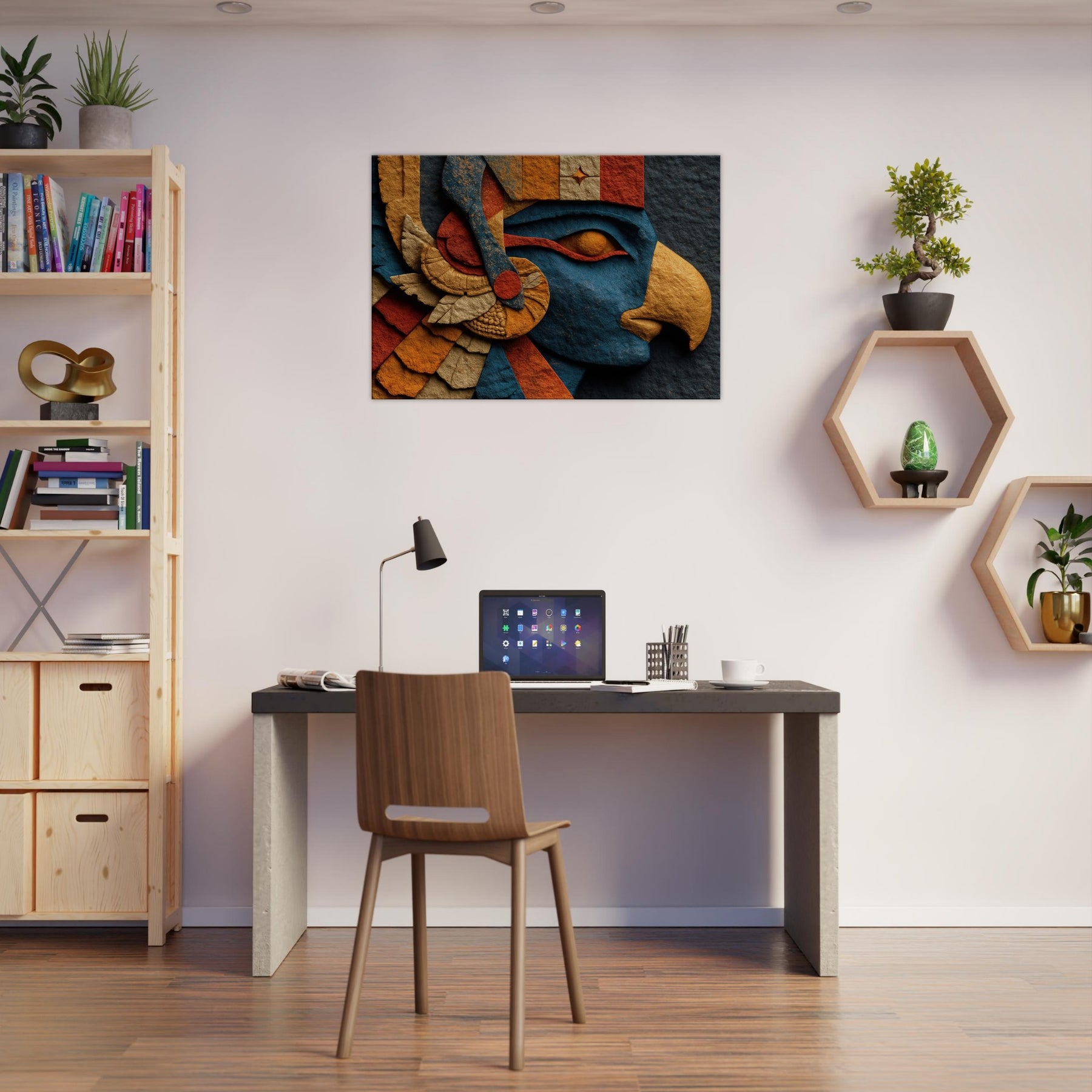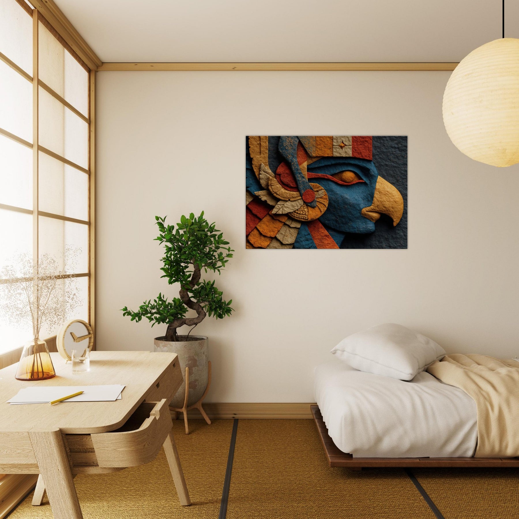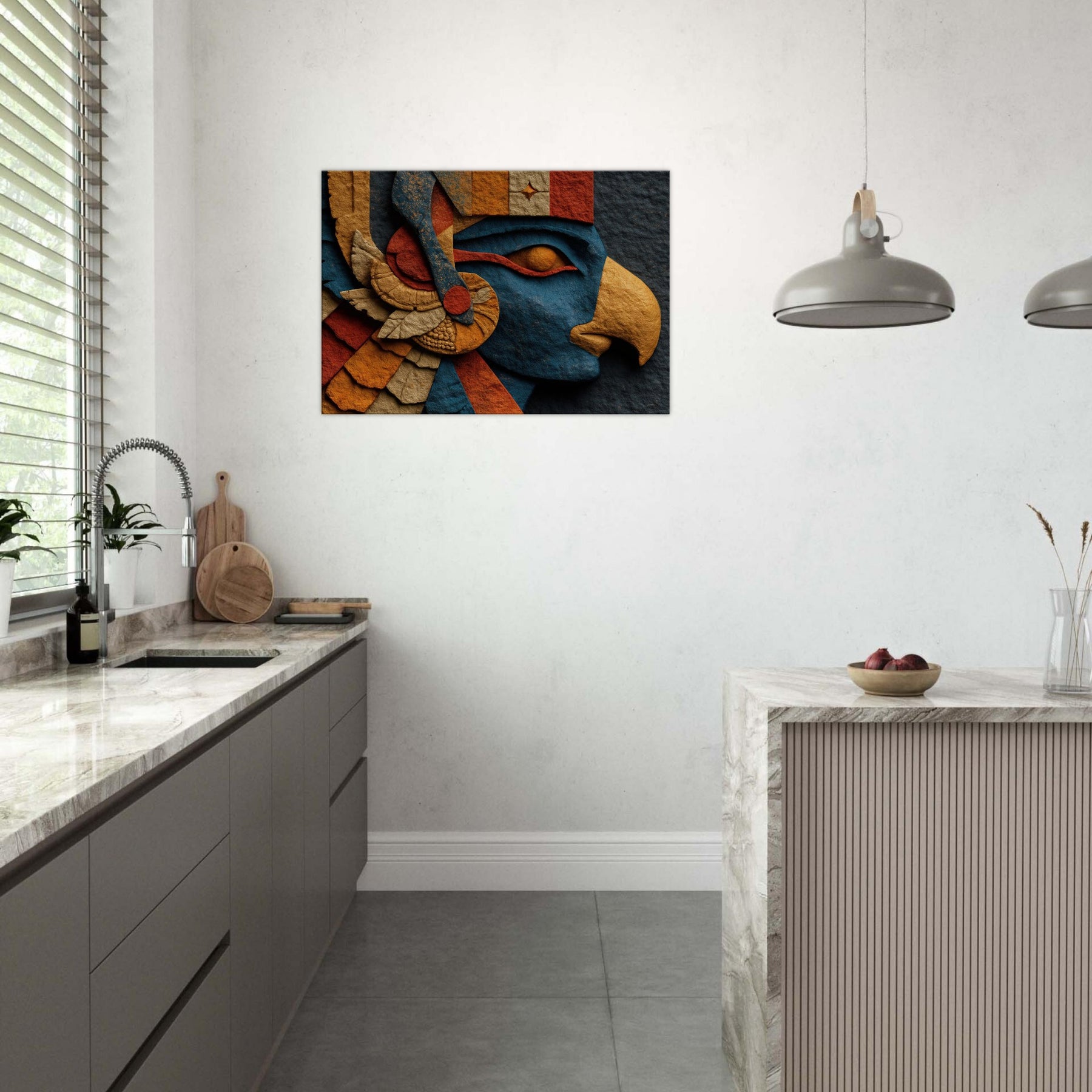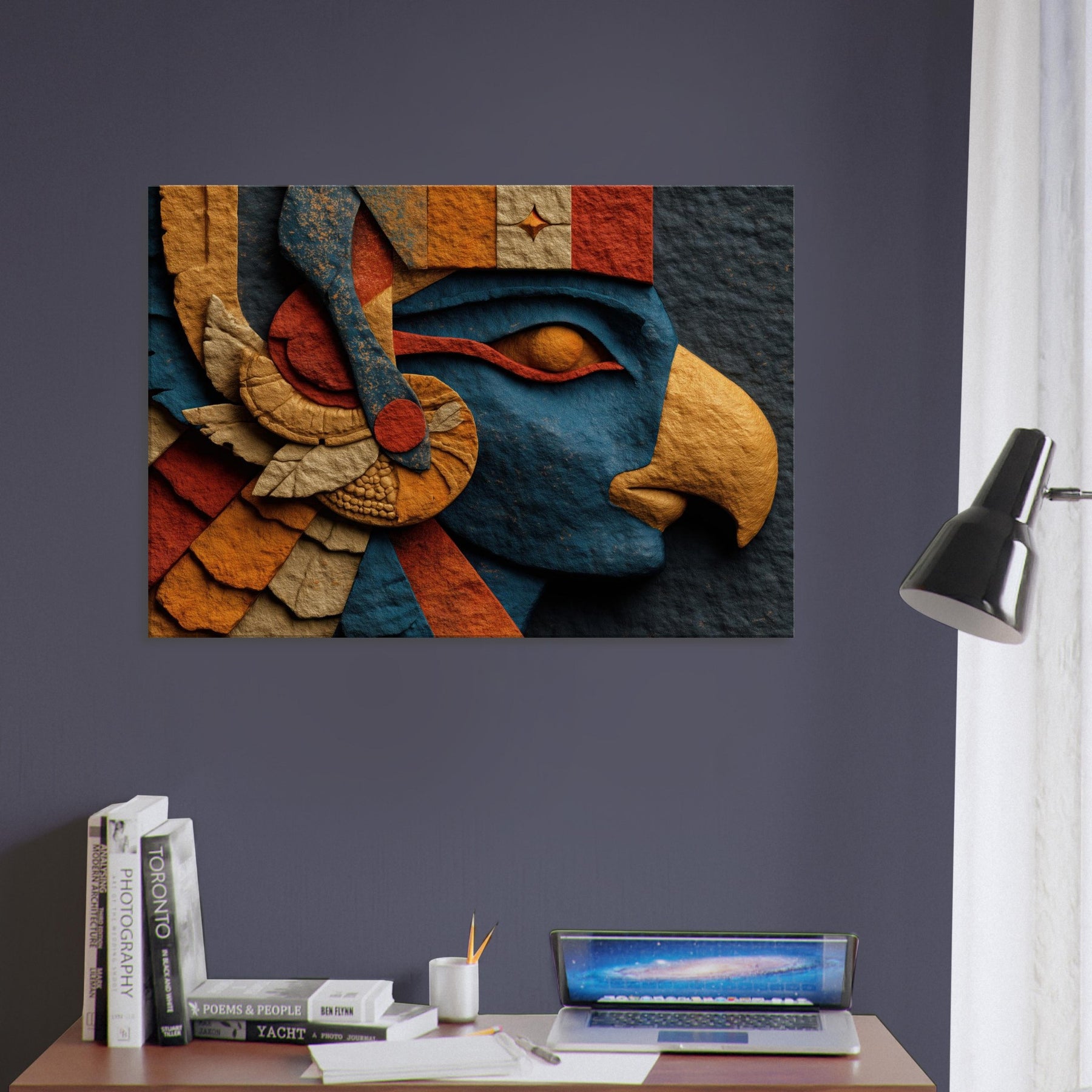An immersive, luminous tribute to Ra, the Egyptian Sun God with A Falcon Head and Solar Crown, rendered in layered, tactile shapes that recall ancient reliefs. The palette of deep blues, sun warmed golds, and clay reds glows with dawn and dusk, inviting contemplation and conversation. The piece exudes majesty and motion, elevating living spaces with a cinematic presence that feels both timeless and alive.