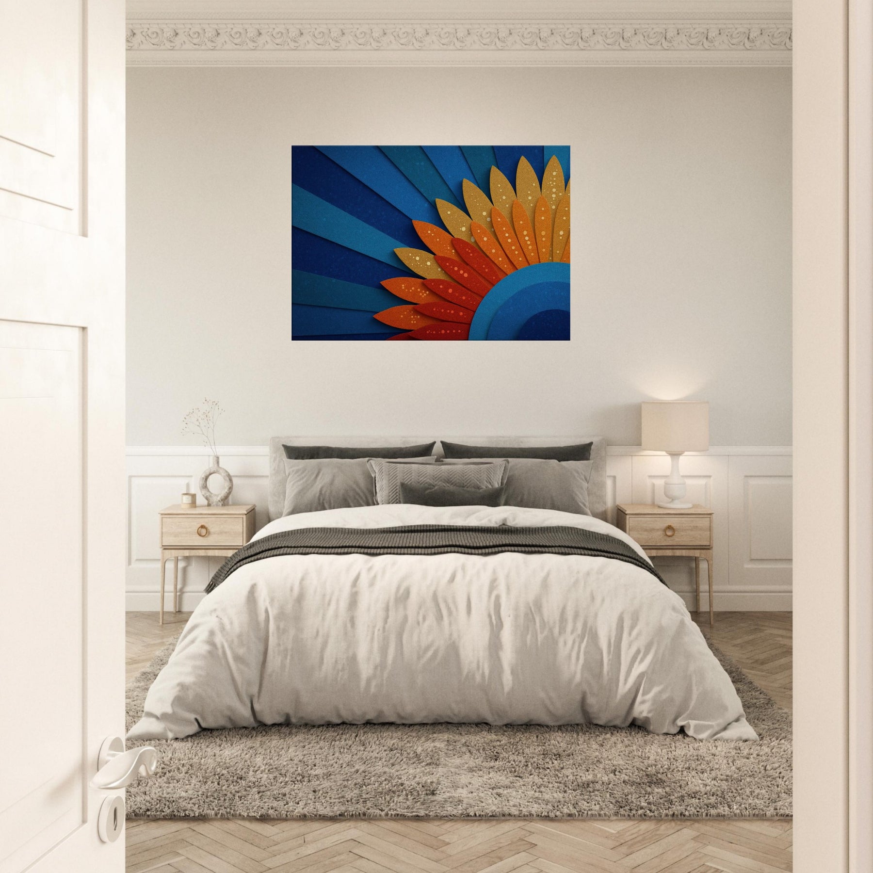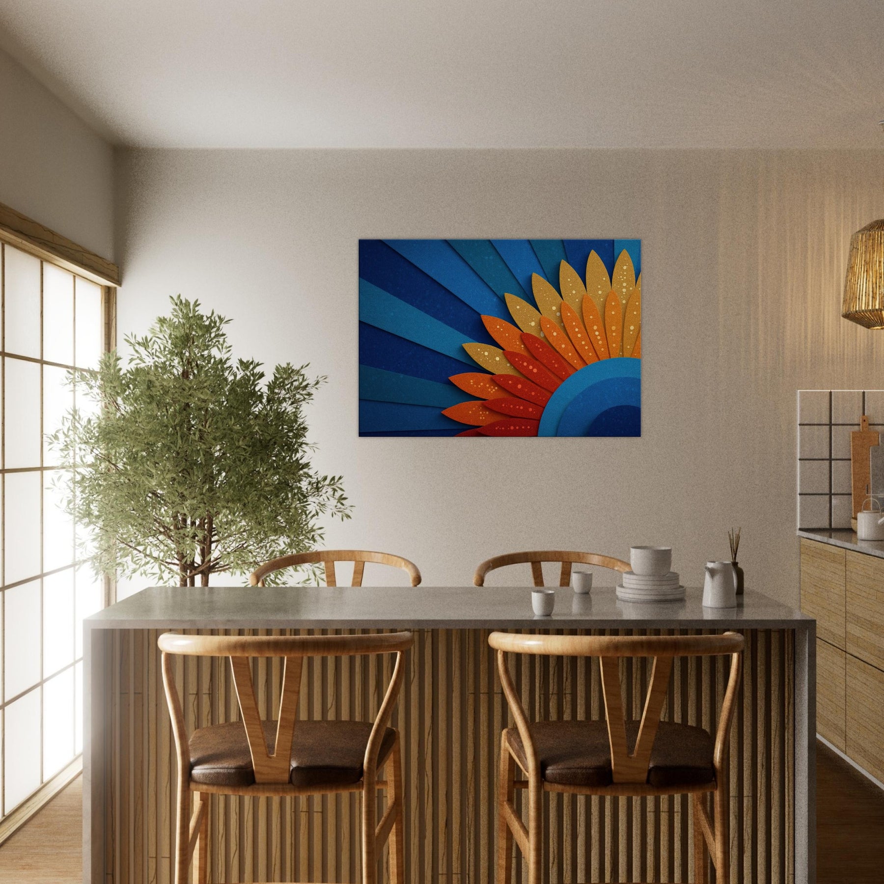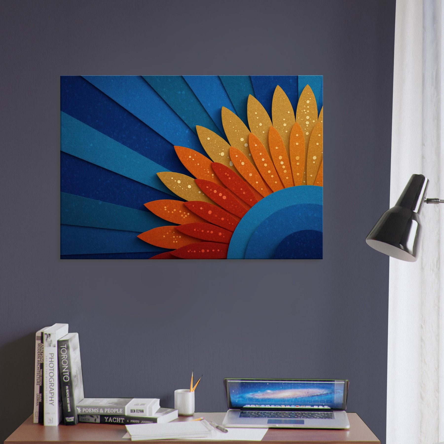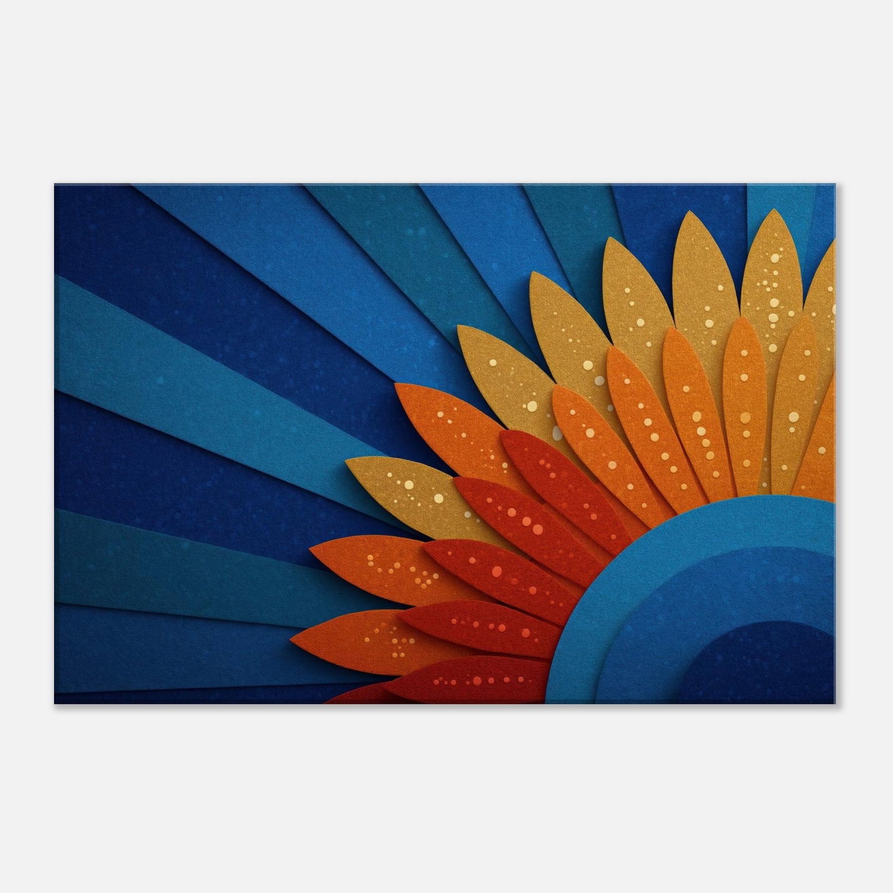 A mystical Sun unfurls across space in layered blues and ember hues. This abstract piece channels warmth and wonder, inviting the room to glow with quiet energy. The Sun radiates through curved cobalt arcs and sun kissed petals, creating a horizon of serenity. Hang it above a sofa or dining nook to bathe the space in hazy gold and cerulean light, making conversations linger and windows feel brighter.