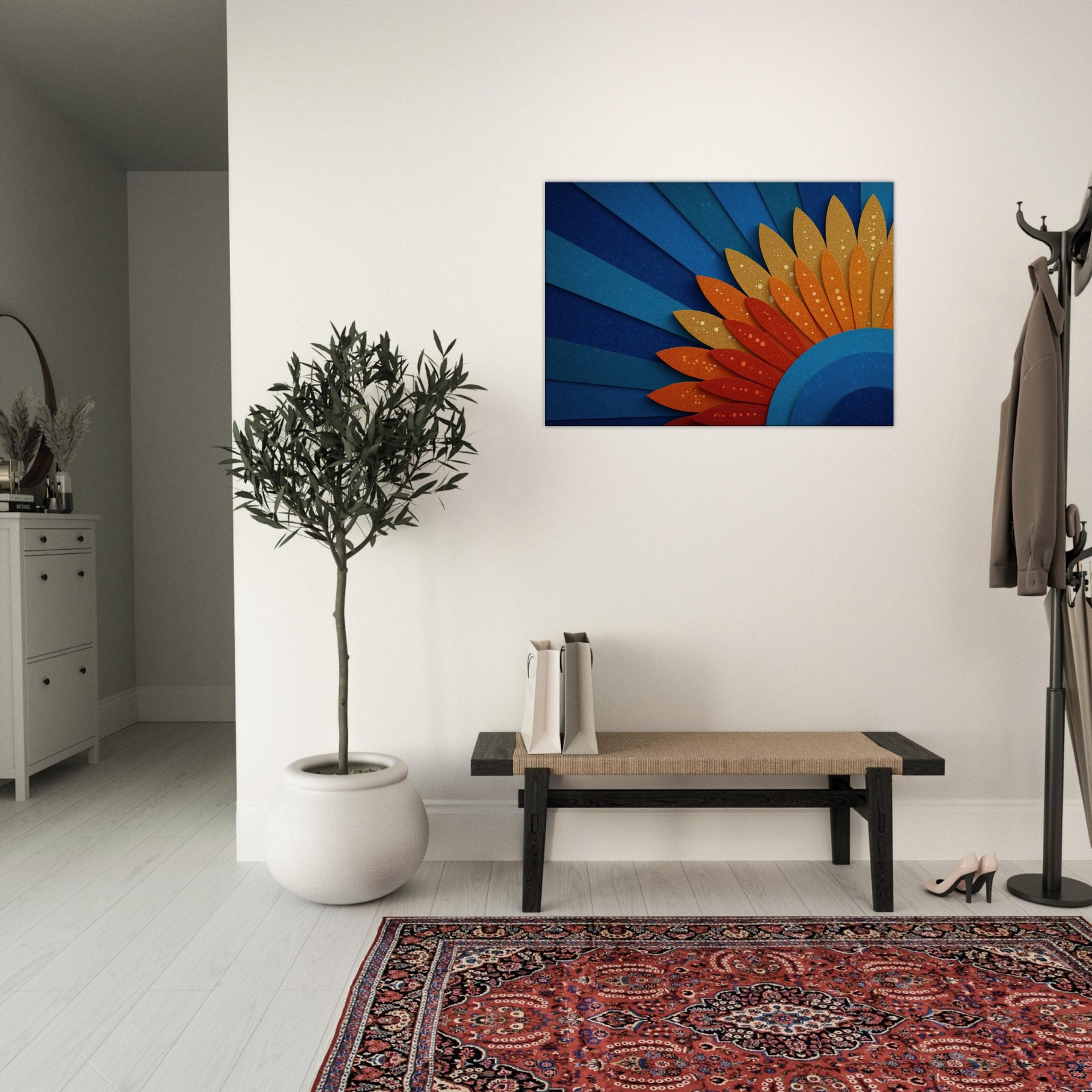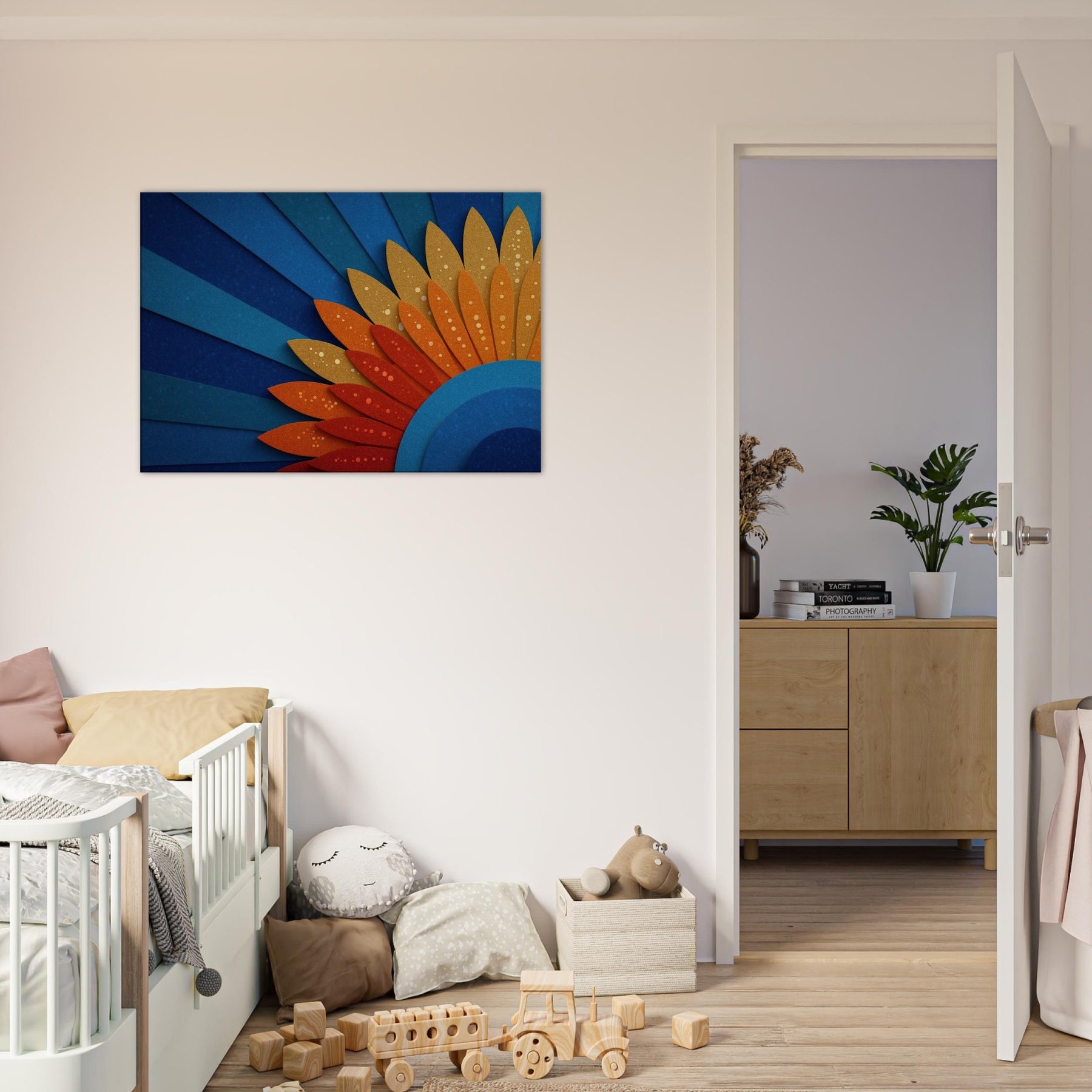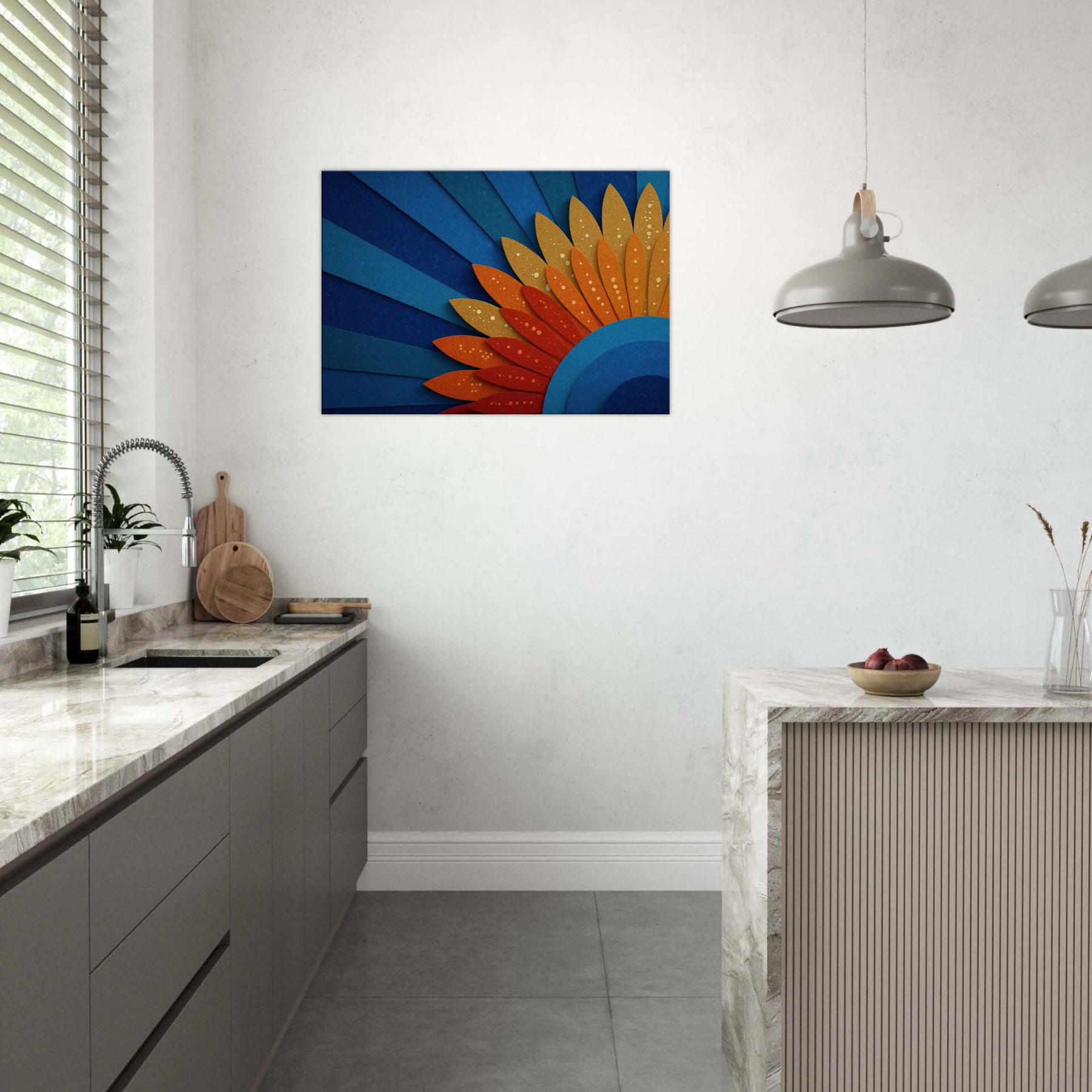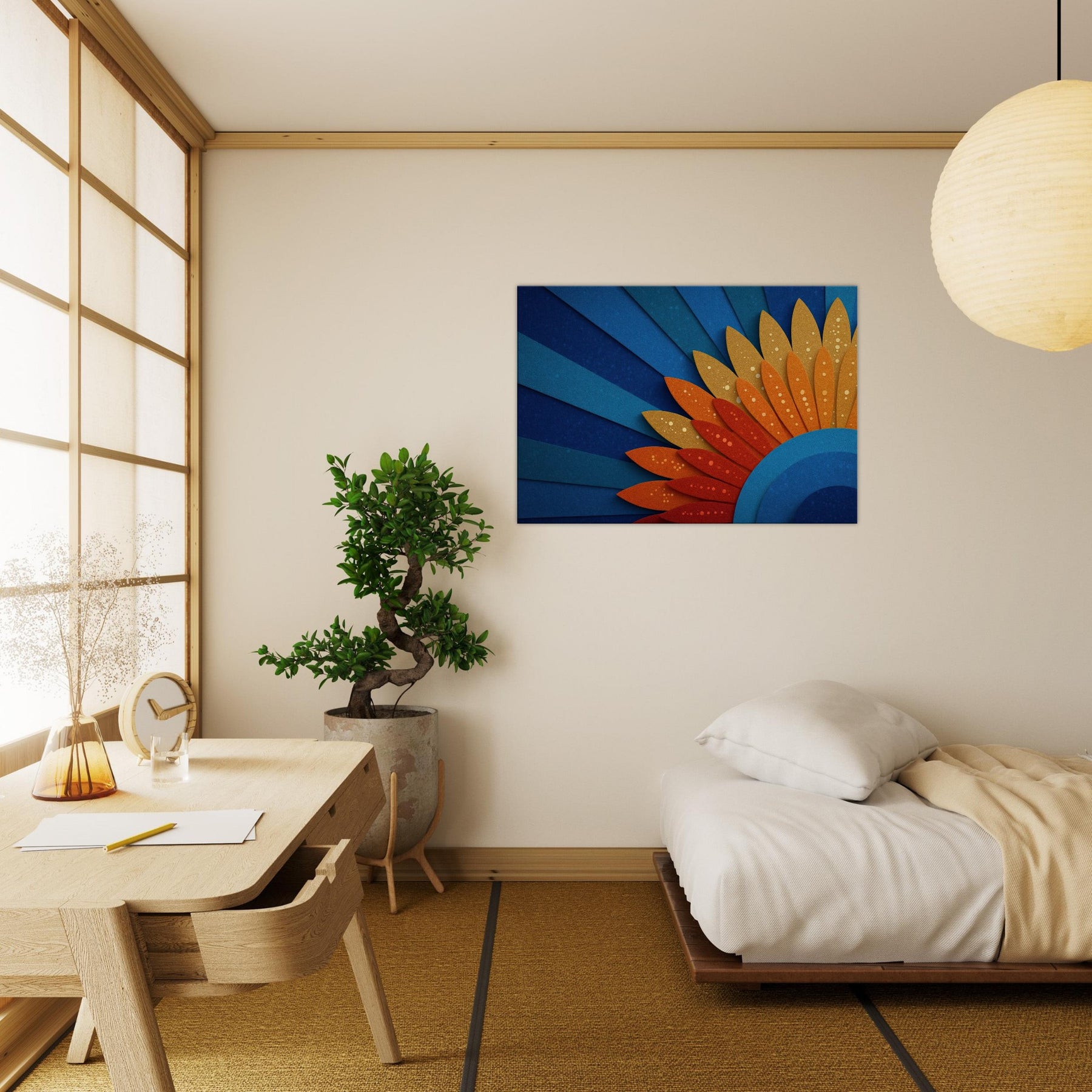 A mystical Sun unfurls across space in layered blues and ember hues. This abstract piece channels warmth and wonder, inviting the room to glow with quiet energy. The Sun radiates through curved cobalt arcs and sun kissed petals, creating a horizon of serenity. Hang it above a sofa or dining nook to bathe the space in hazy gold and cerulean light, making conversations linger and windows feel brighter.