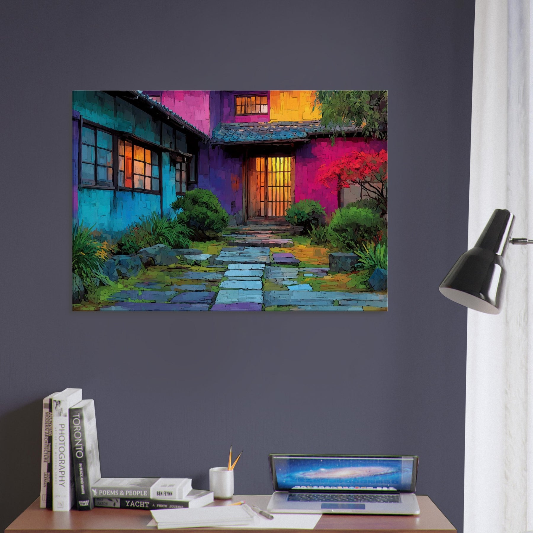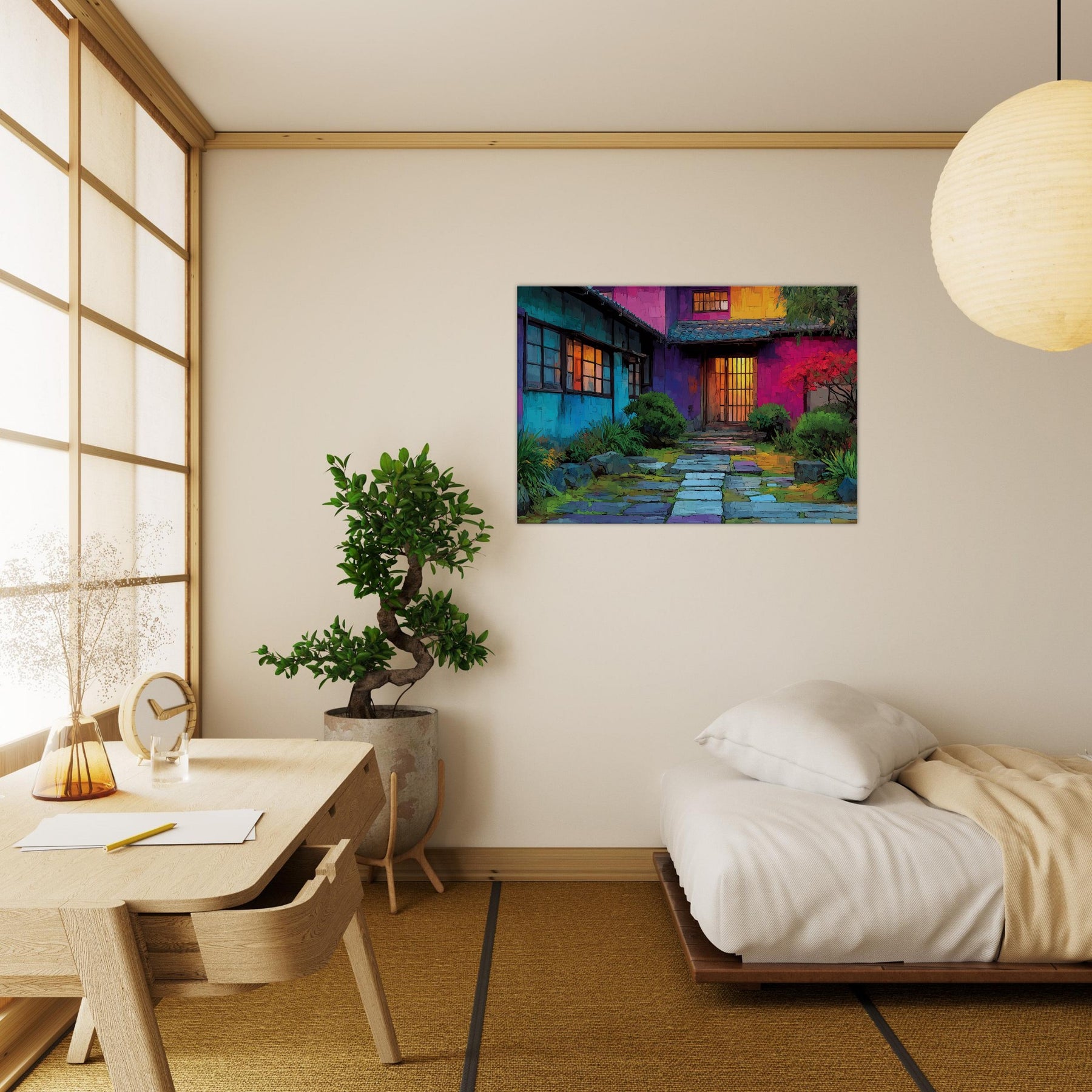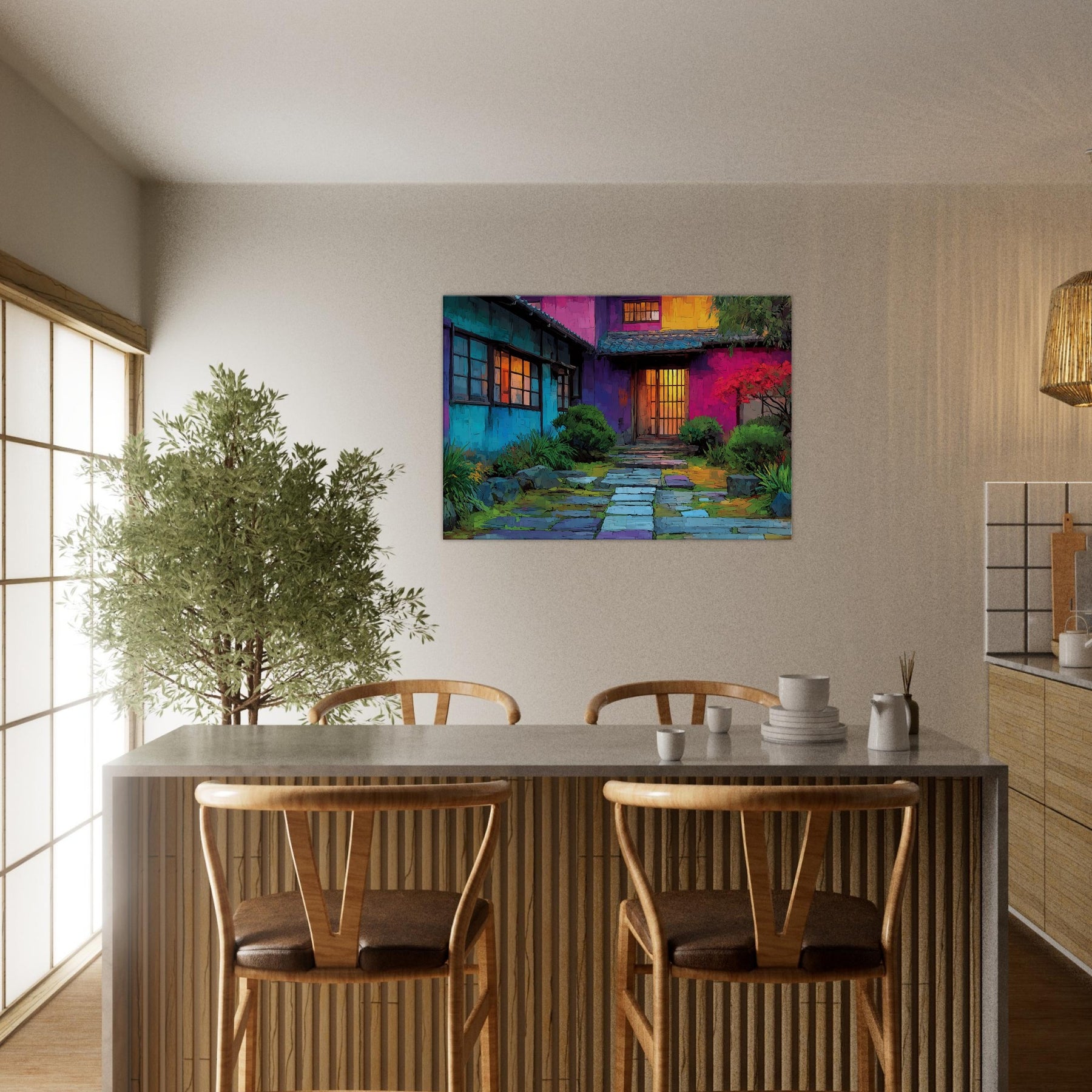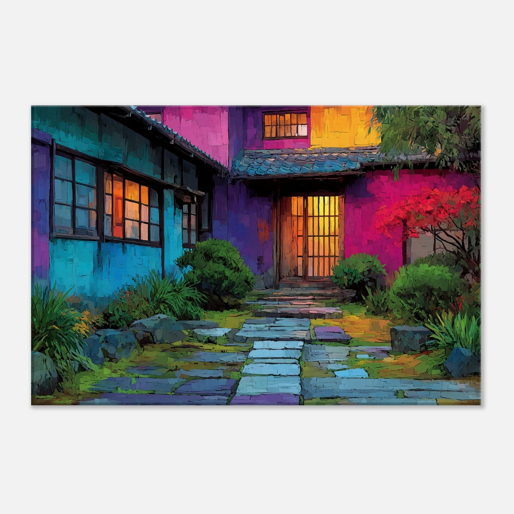 Step into a courtyard of color where Japanese Houses breathe with light and rhythm. This abstract portrayal dissolves lines into a luminous tapestry, inviting the eye to wander from cool blues at the walls to the amber glow of doorway doors. The scene feels intimate yet expansive, as if the home itself hums softly in your living space. Hang it above a sofa or console to create a daily invitation to calm, curiosity, and urban poetry a wearable mood board for home and heart.
