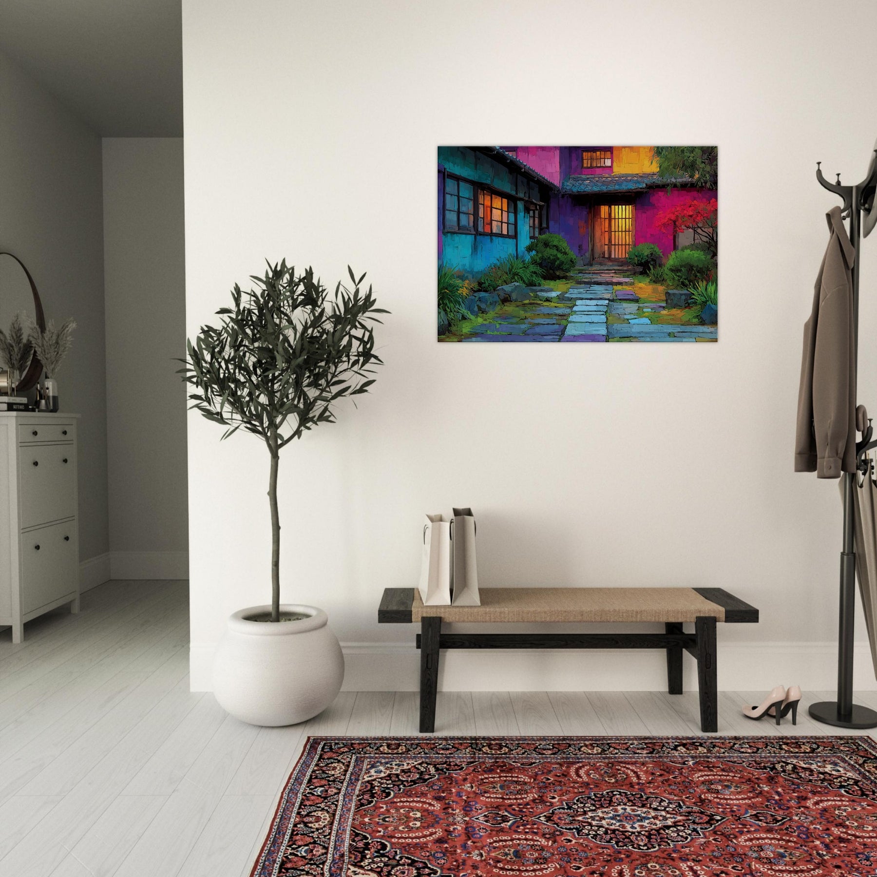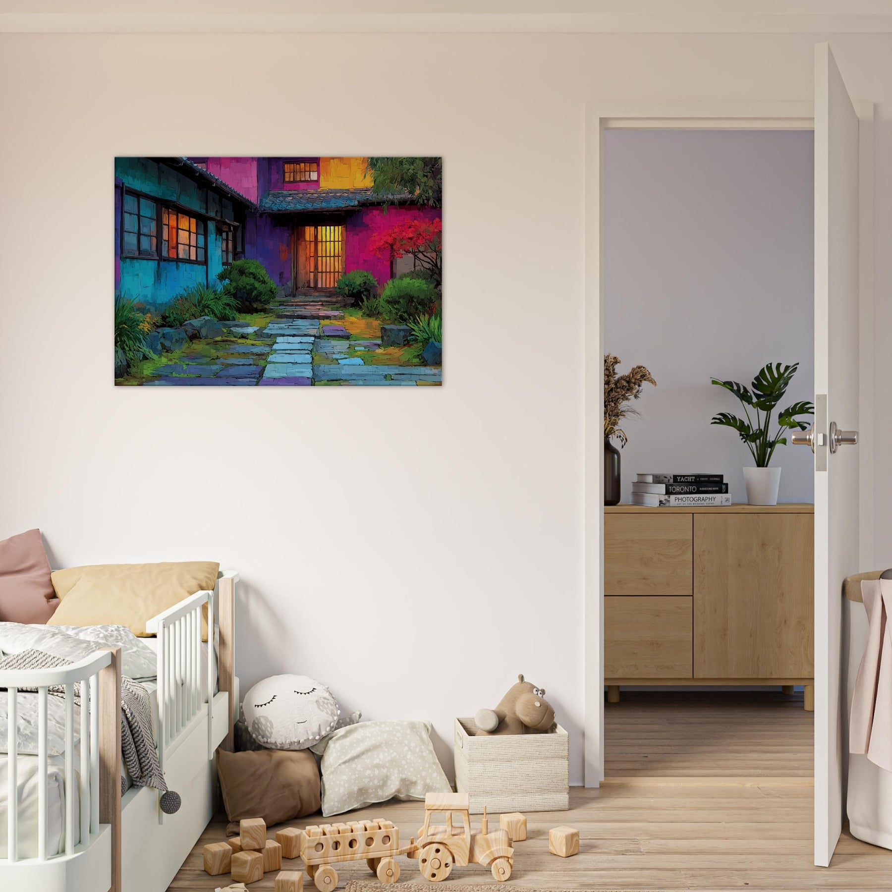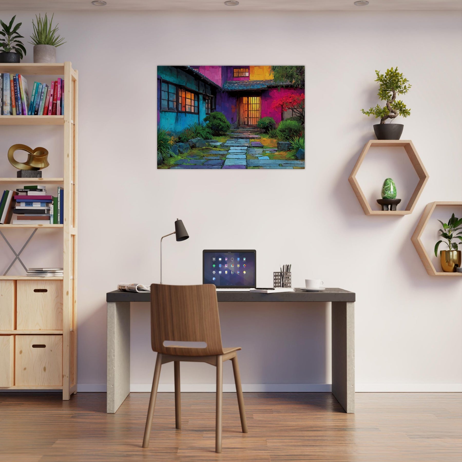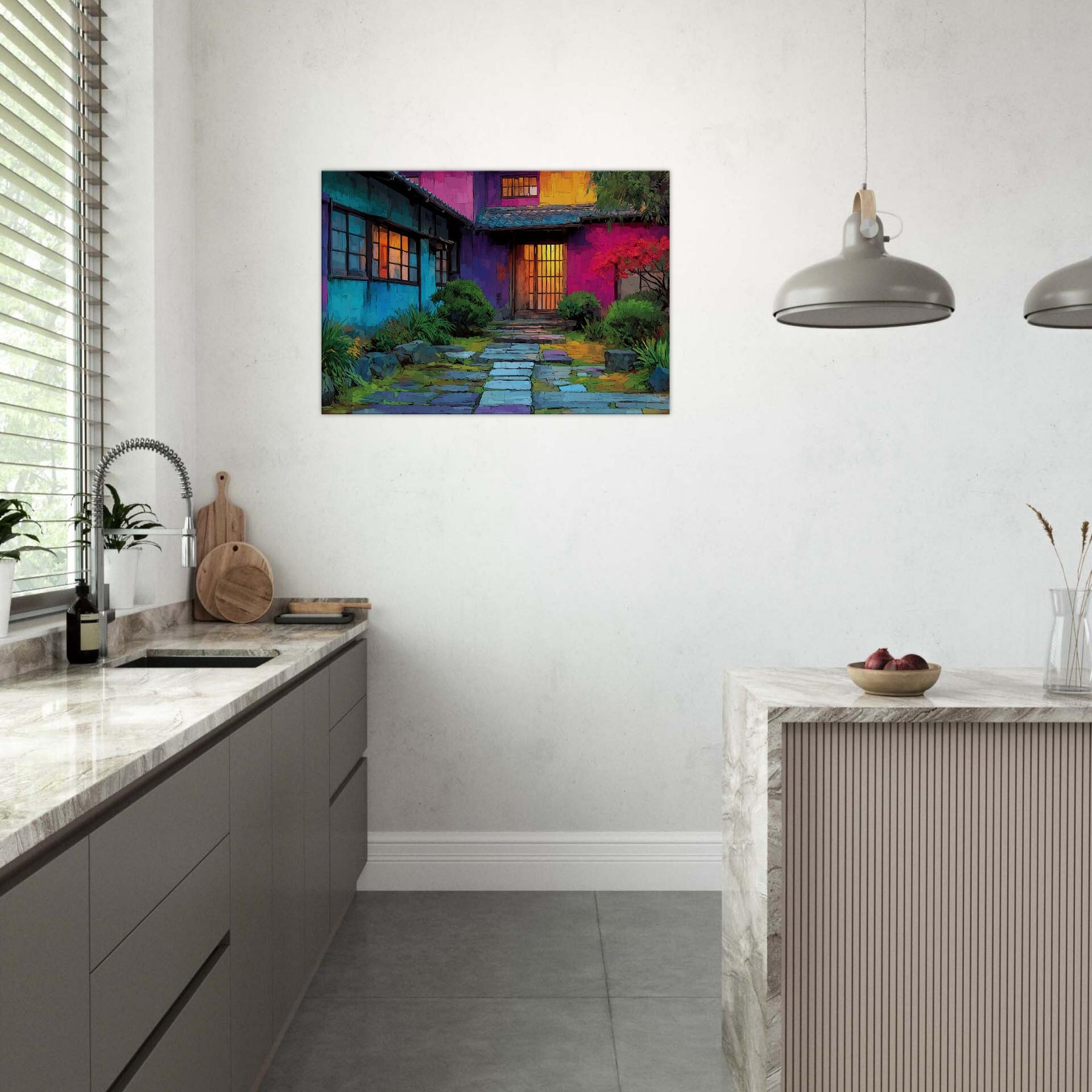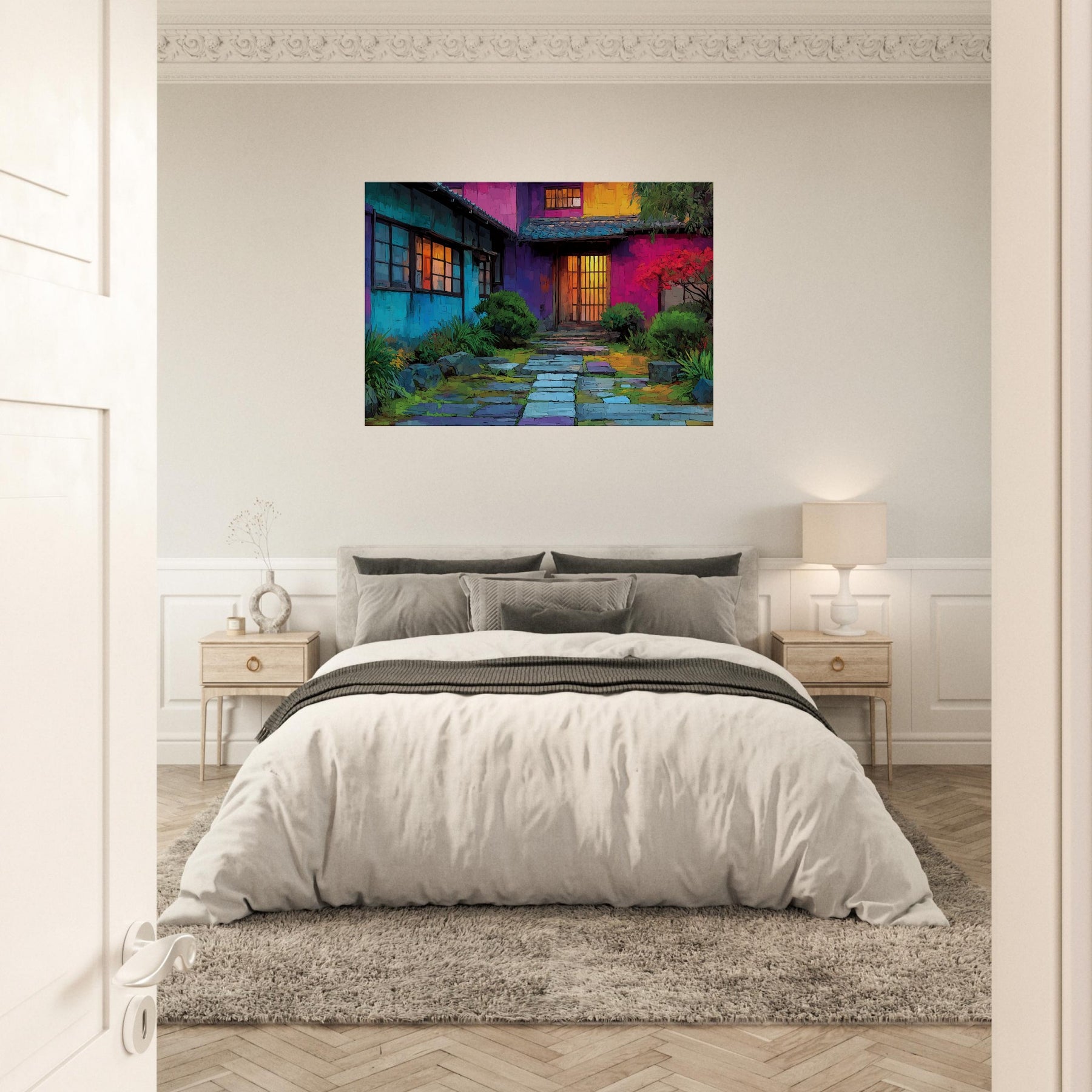 Step into a courtyard of color where Japanese Houses breathe with light and rhythm. This abstract portrayal dissolves lines into a luminous tapestry, inviting the eye to wander from cool blues at the walls to the amber glow of doorway doors. The scene feels intimate yet expansive, as if the home itself hums softly in your living space. Hang it above a sofa or console to create a daily invitation to calm, curiosity, and urban poetry a wearable mood board for home and heart.