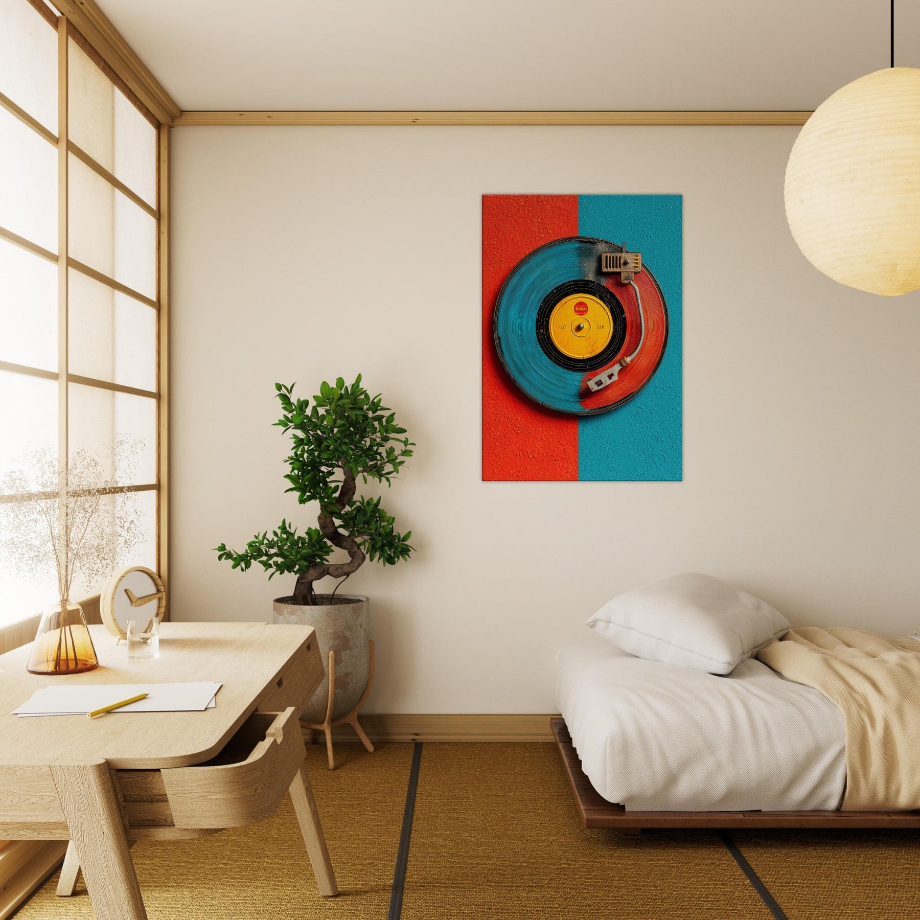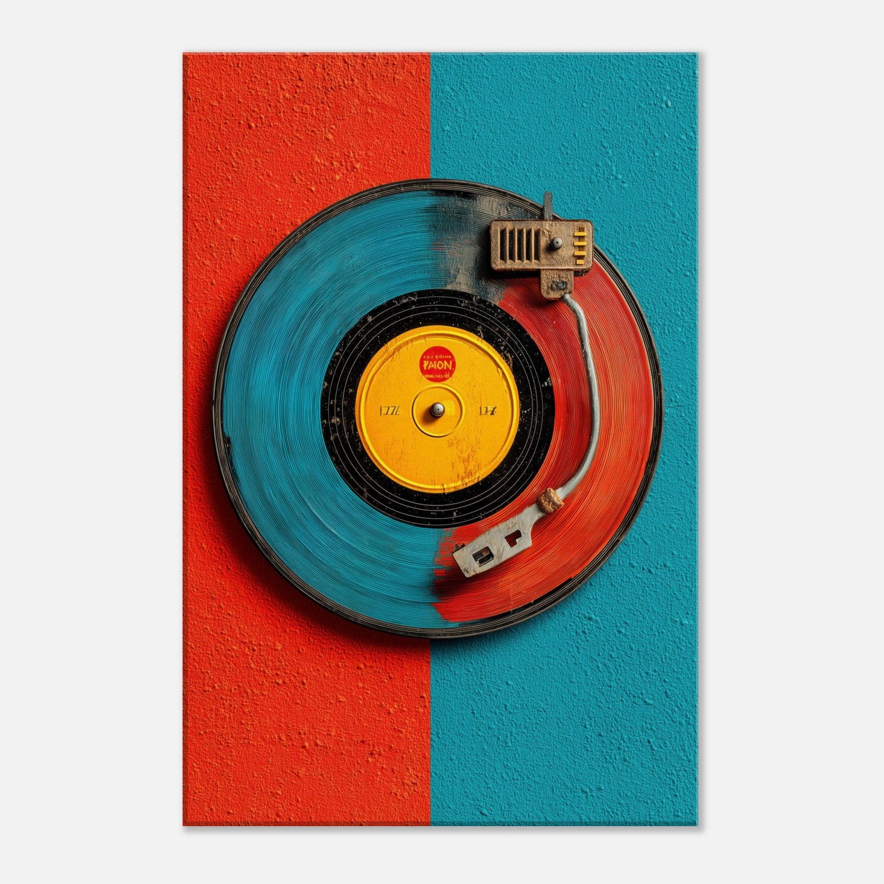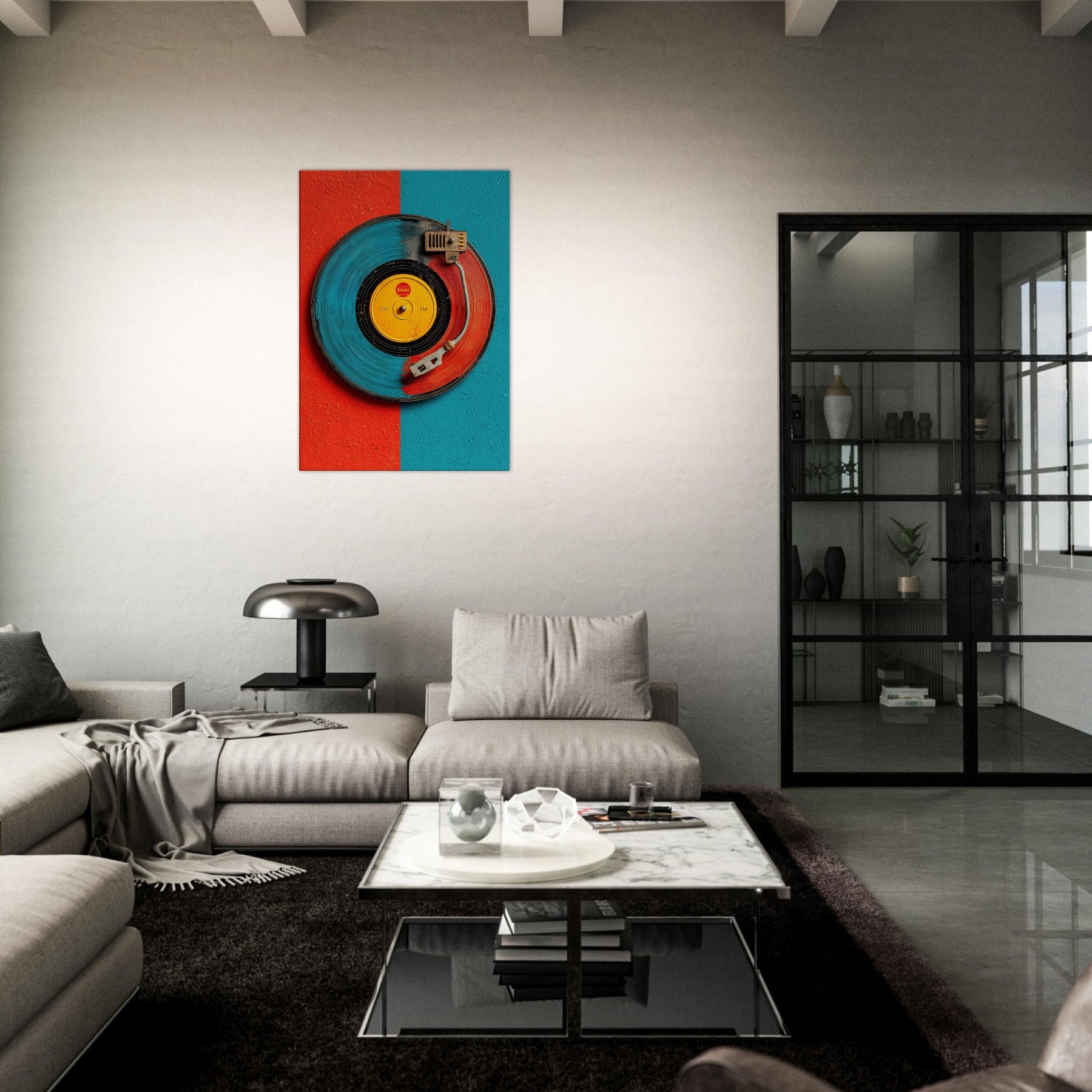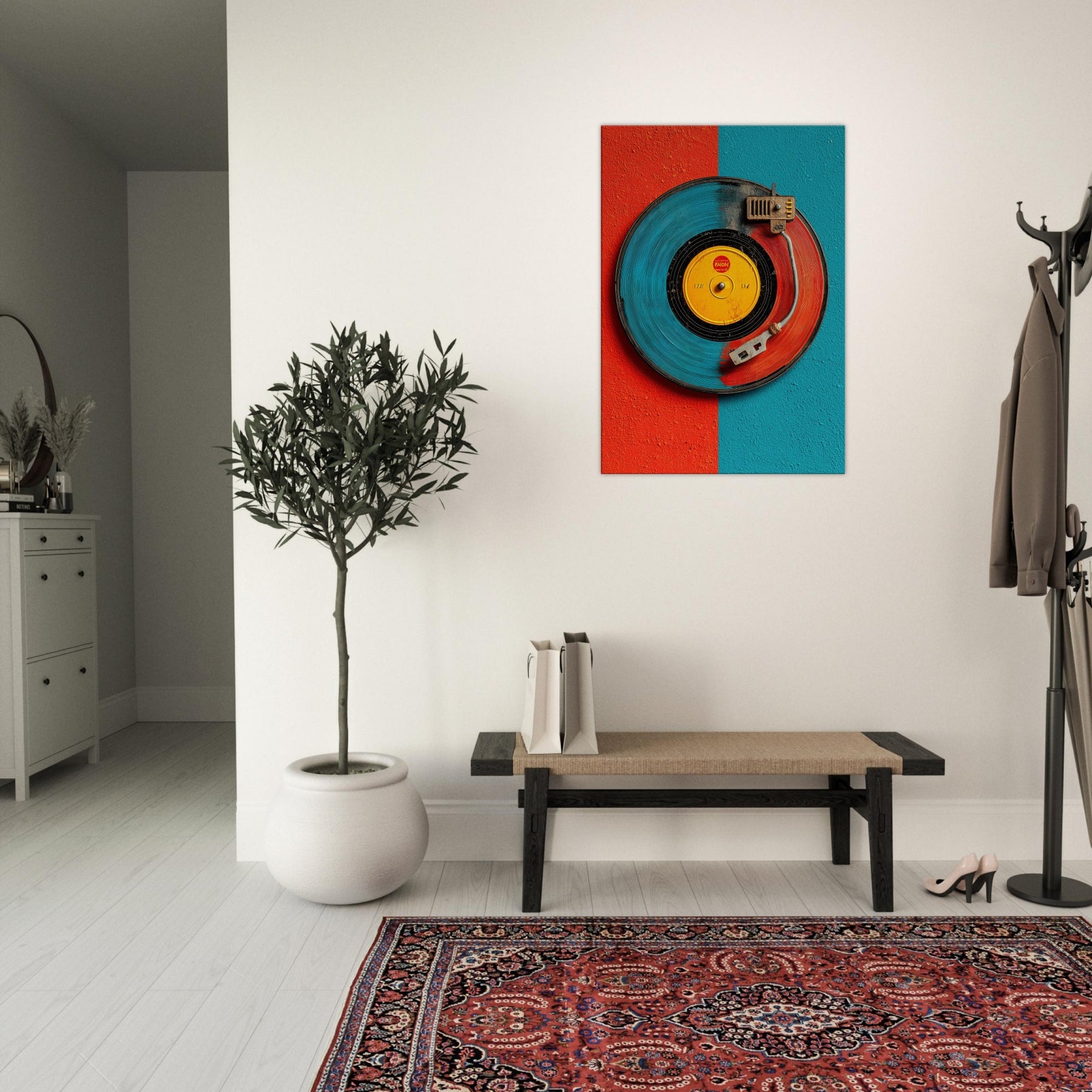 Warmth hums from the room as the vinyl record spins into color, turning a familiar object into a pulse of atmosphere. This piece evokes midnight playlists and sunlit afternoons, where edges blur into velvet air and sound becomes texture. The bold palette, split between red and teal, invites gaze to travel the circumference, then rest on the sunlit center. Placed in a living room or hallway, it transforms walls into a sensory moment ambience, memory, and movement all in one elegant, wearable moment of art.