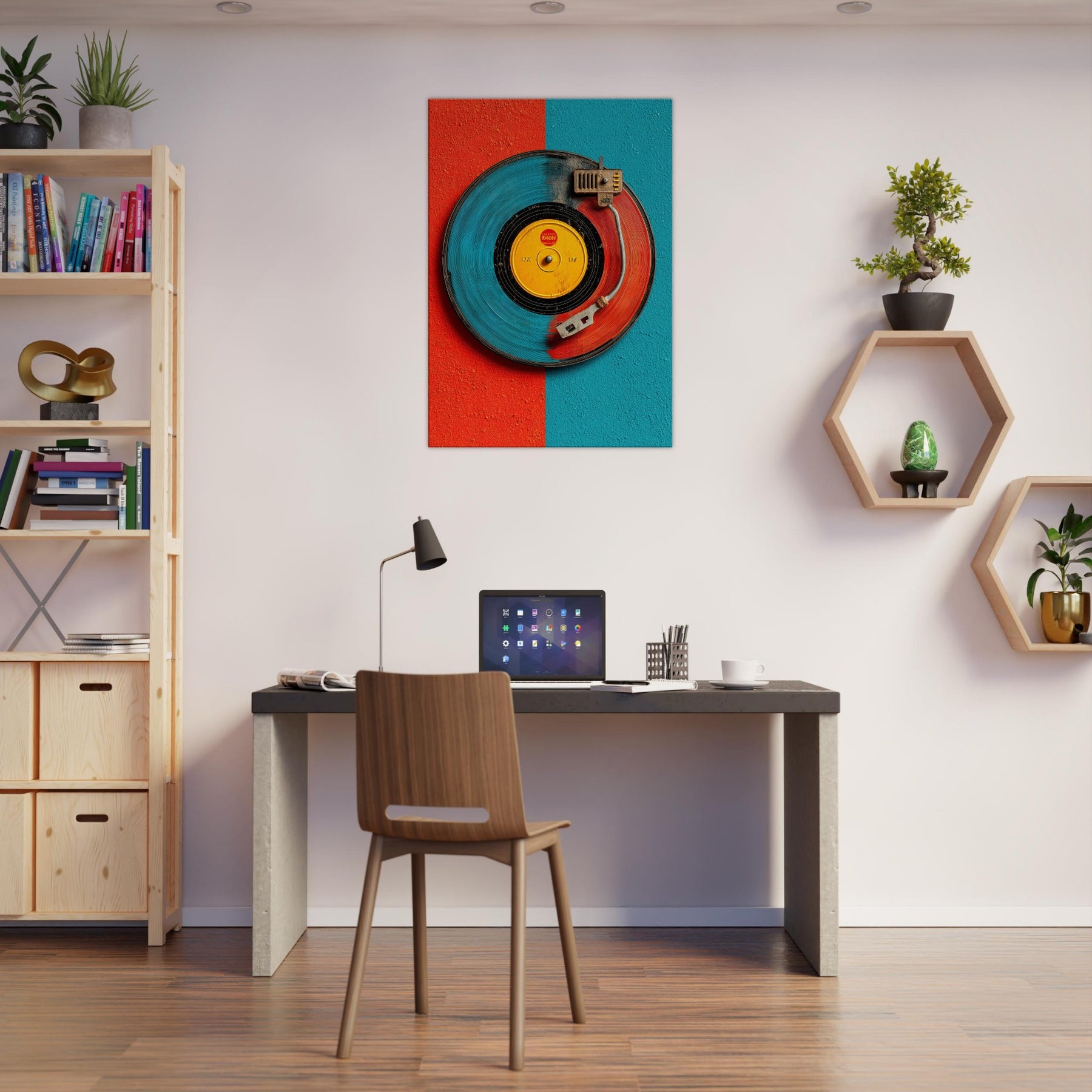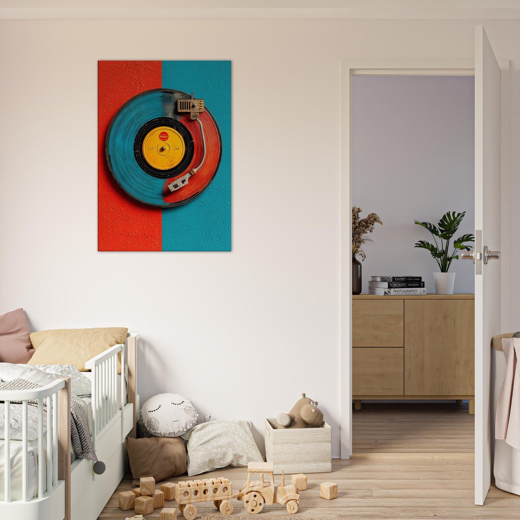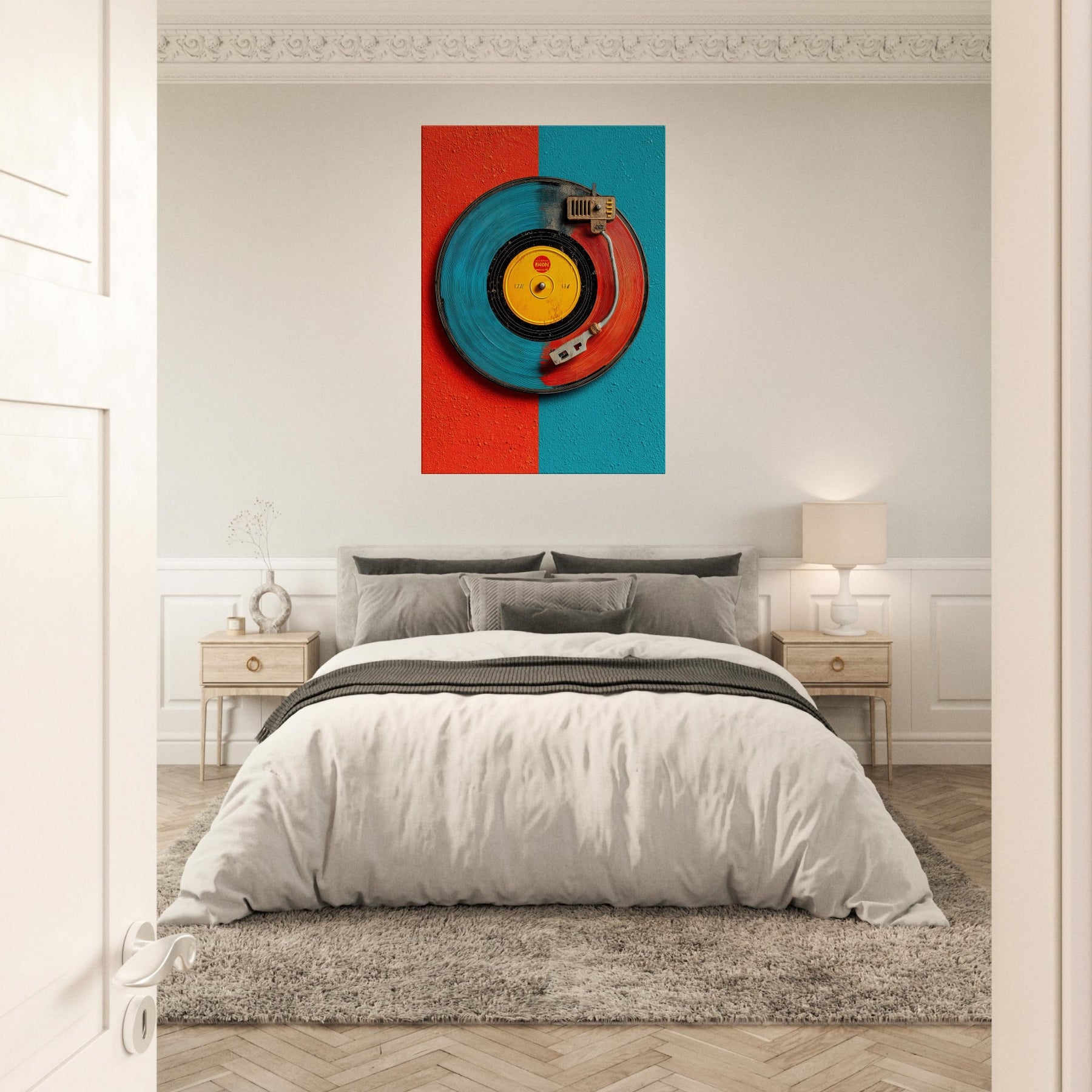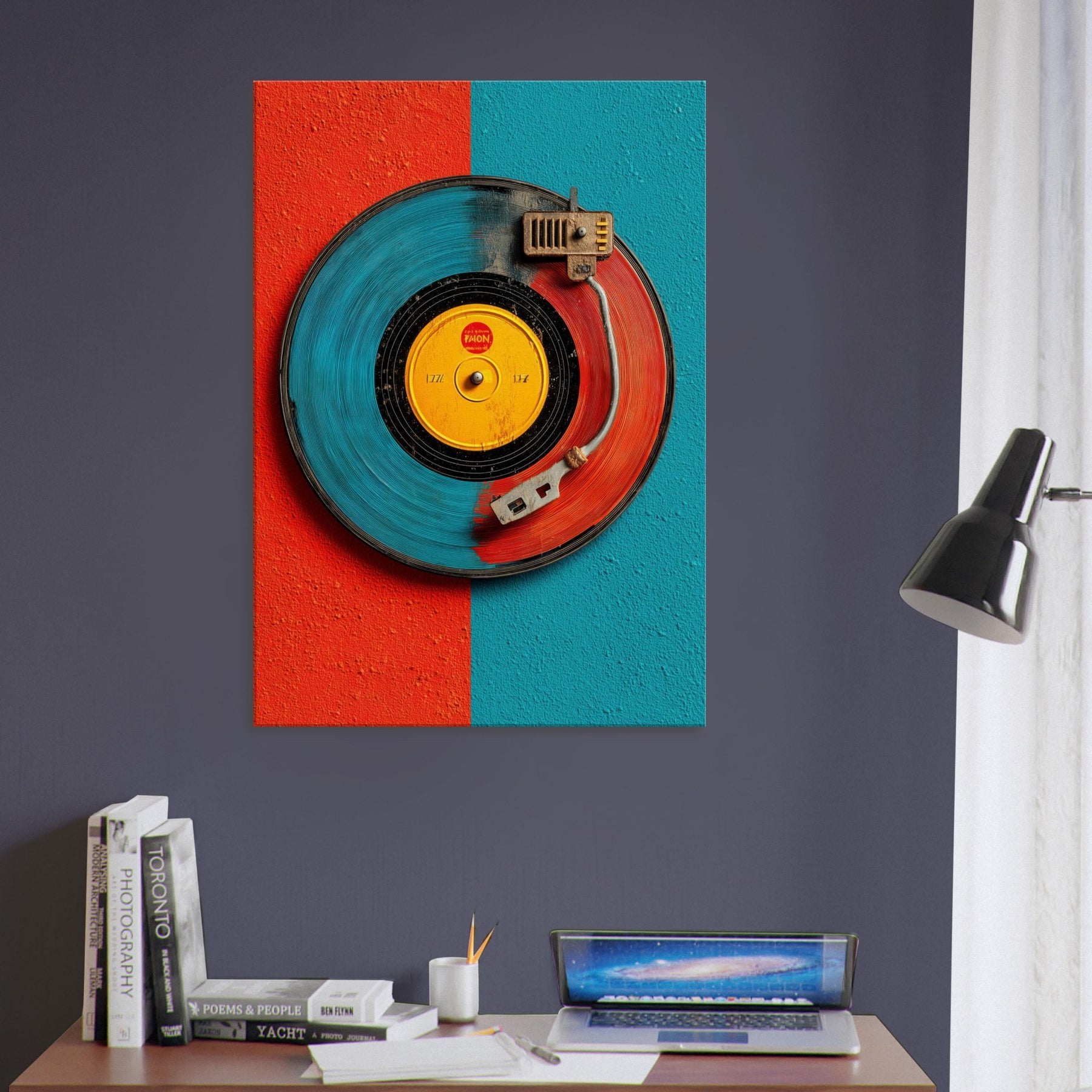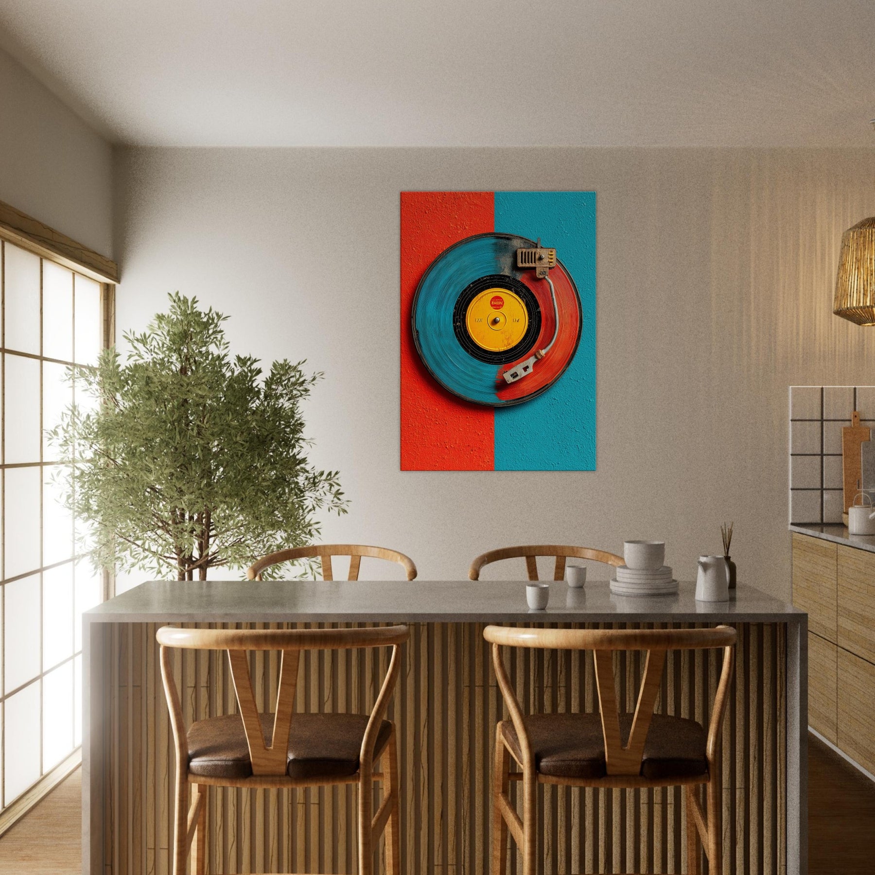 Warmth hums from the room as the vinyl record spins into color, turning a familiar object into a pulse of atmosphere. This piece evokes midnight playlists and sunlit afternoons, where edges blur into velvet air and sound becomes texture. The bold palette, split between red and teal, invites gaze to travel the circumference, then rest on the sunlit center. Placed in a living room or hallway, it transforms walls into a sensory moment ambience, memory, and movement all in one elegant, wearable moment of art.