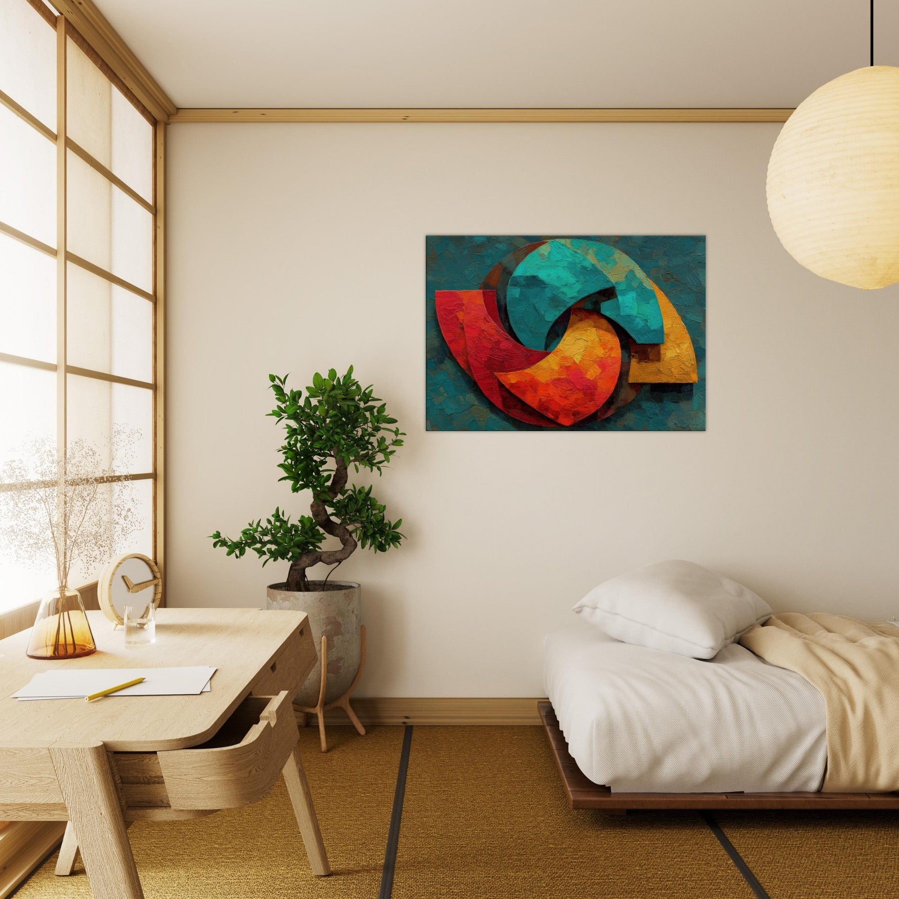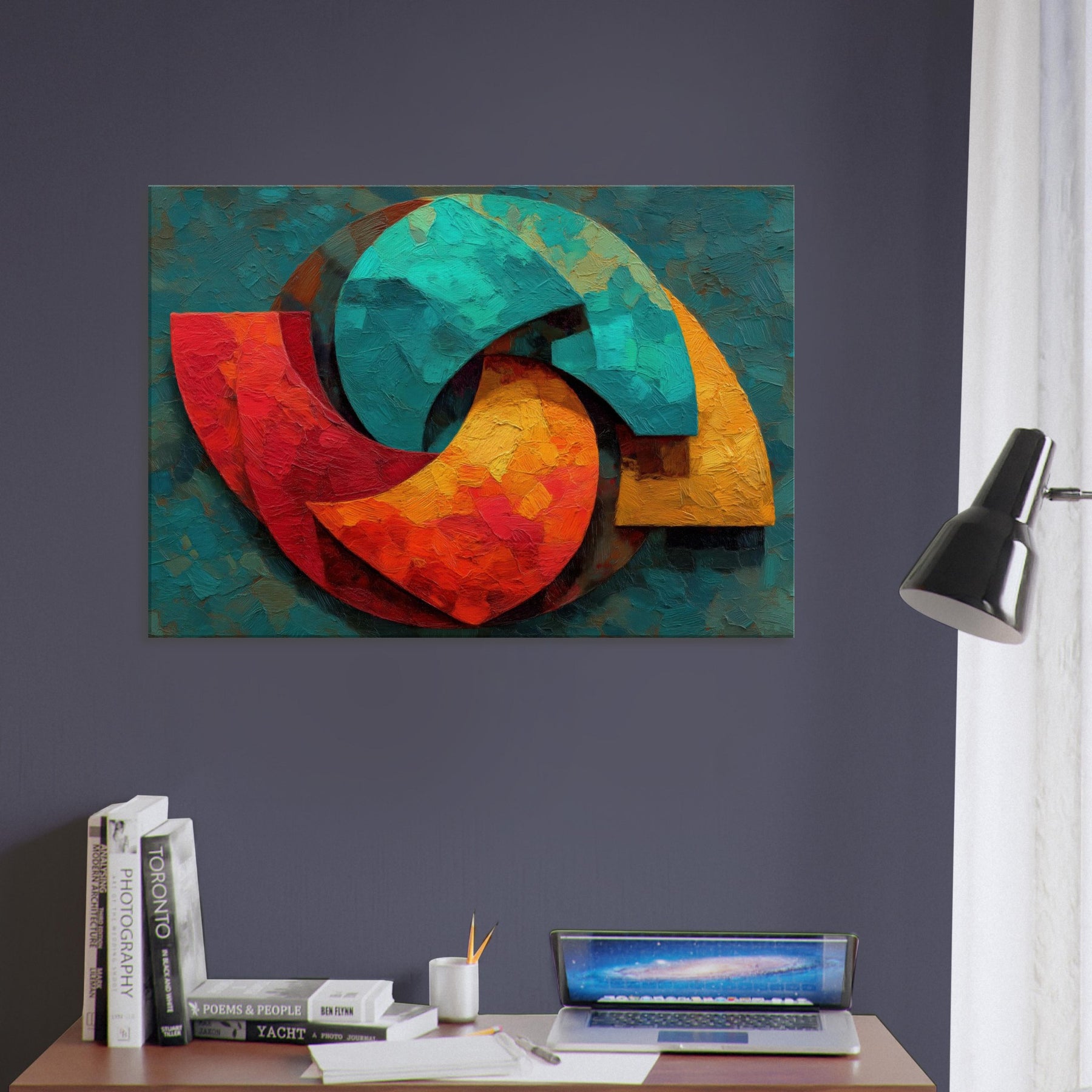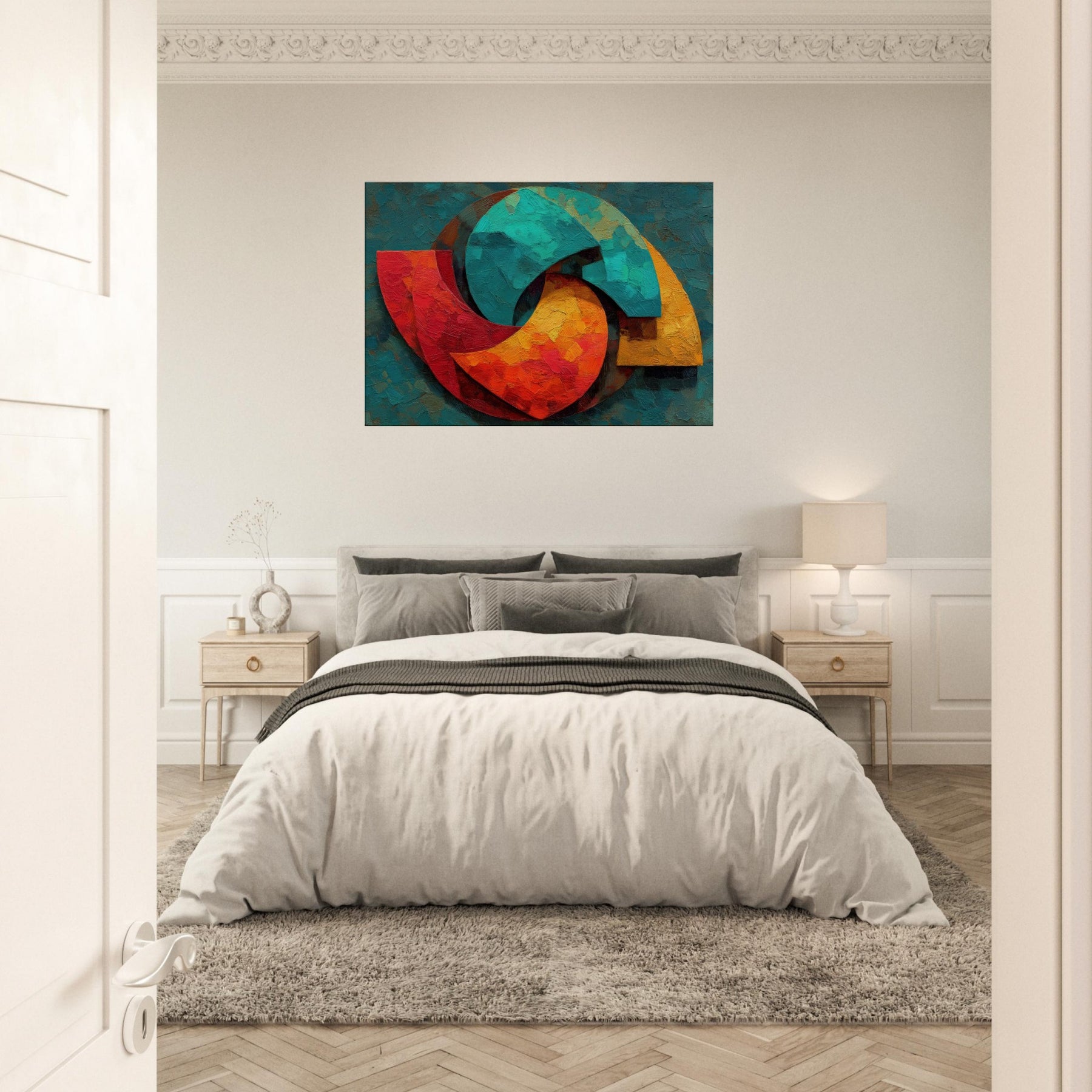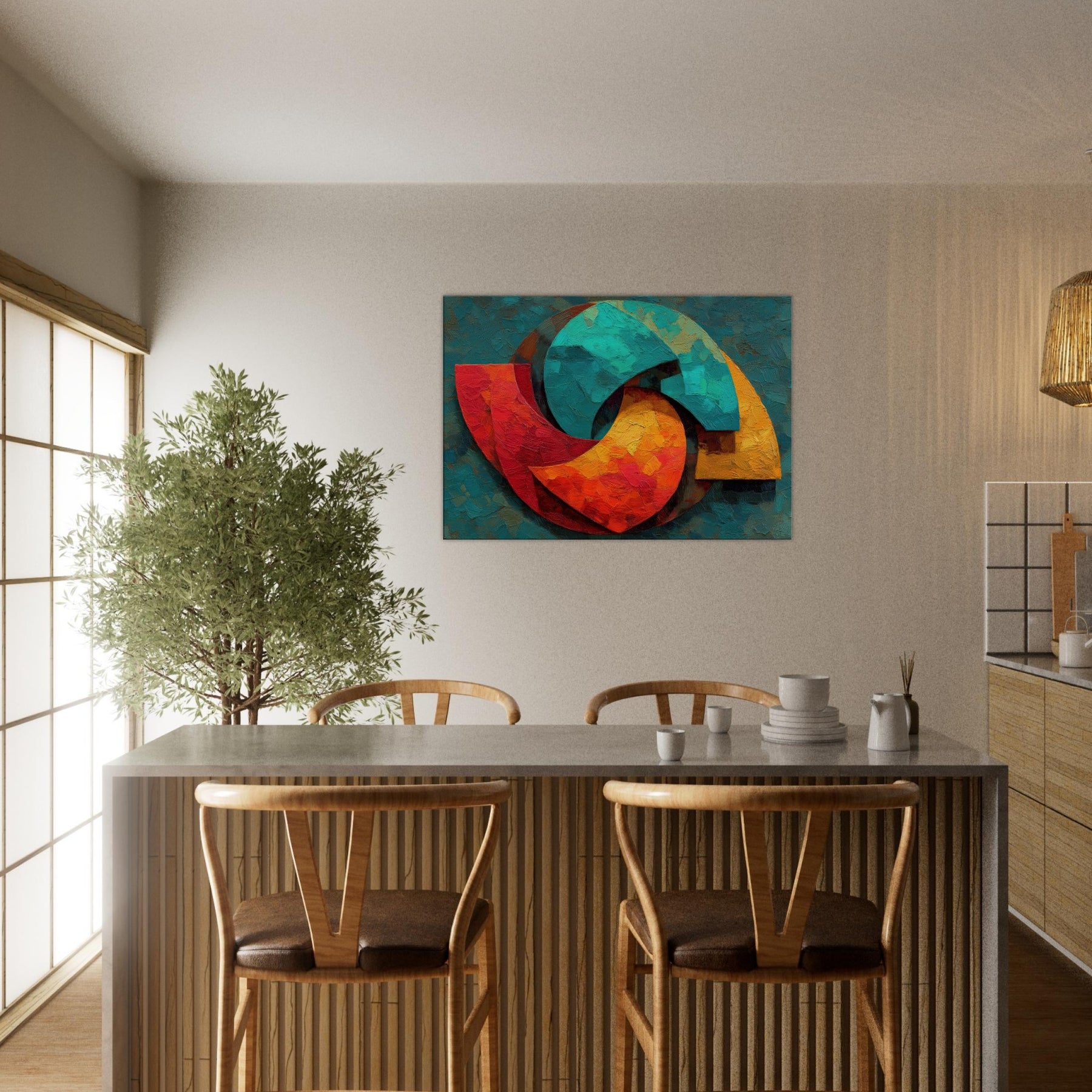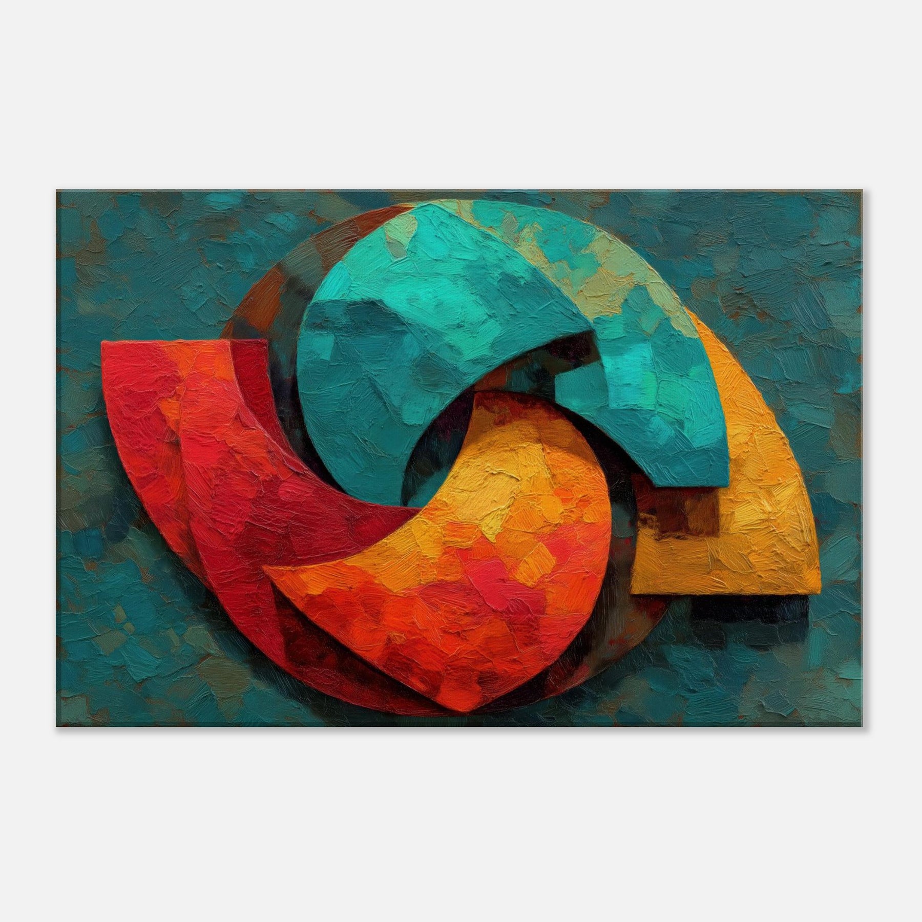 Triskelion rises from a field of layered color, a luminous carousel of motion and mystery. The abstract forms coil and reassemble in warm reds, teal blues, and sunlit yellows, inviting the eye to trace a whispered cycle of energy. Thick, sculptural brushwork catches light, lending the surface a living texture that shifts with the day. Placed in a living space, it becomes a meditative focal point a mystical invitation to pause, breathe, and feel the room awaken with color and calm.