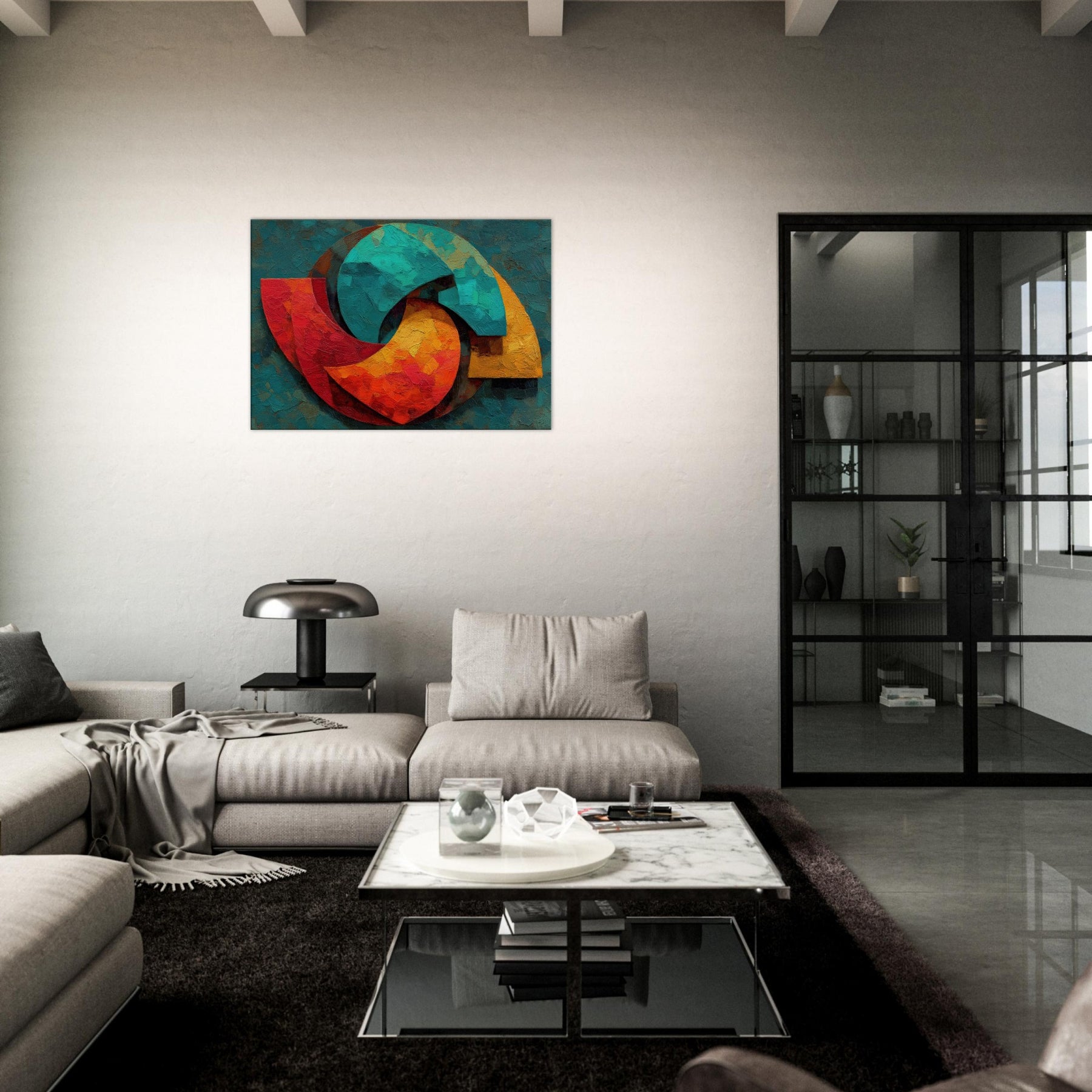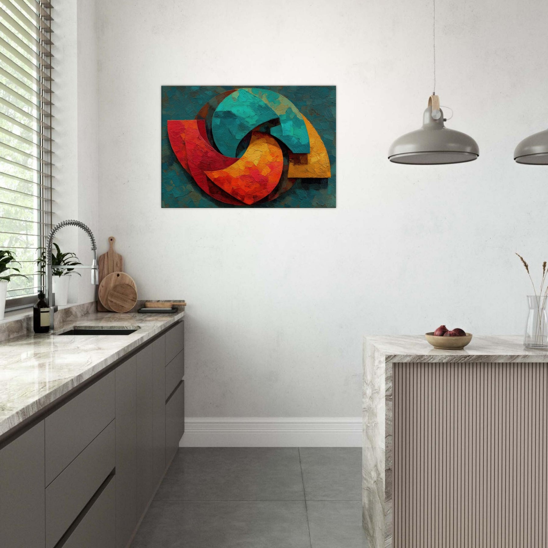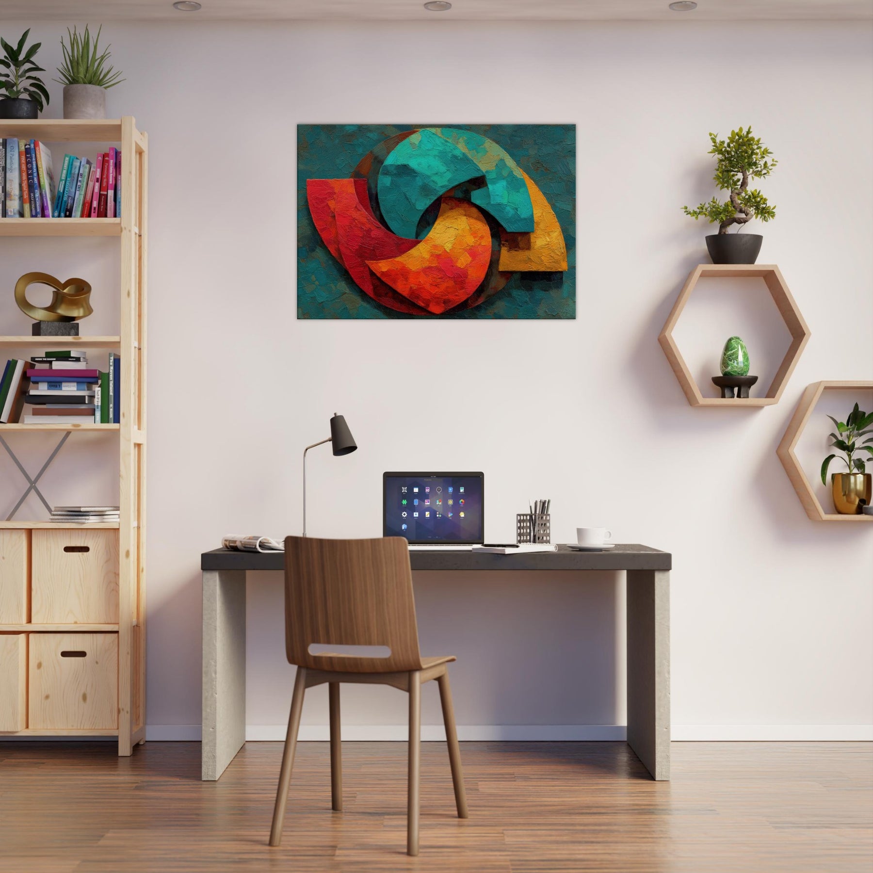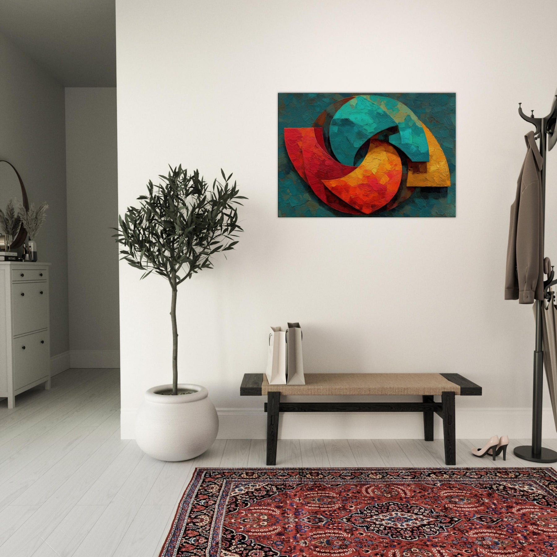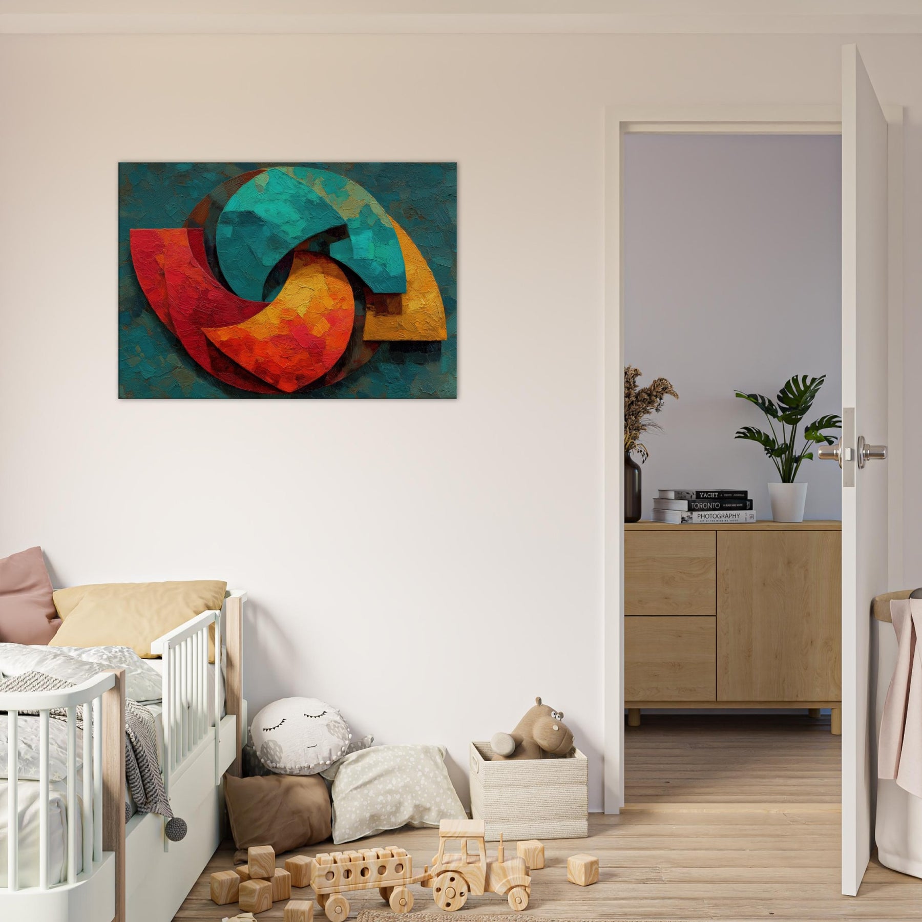 Triskelion rises from a field of layered color, a luminous carousel of motion and mystery. The abstract forms coil and reassemble in warm reds, teal blues, and sunlit yellows, inviting the eye to trace a whispered cycle of energy. Thick, sculptural brushwork catches light, lending the surface a living texture that shifts with the day. Placed in a living space, it becomes a meditative focal point a mystical invitation to pause, breathe, and feel the room awaken with color and calm.