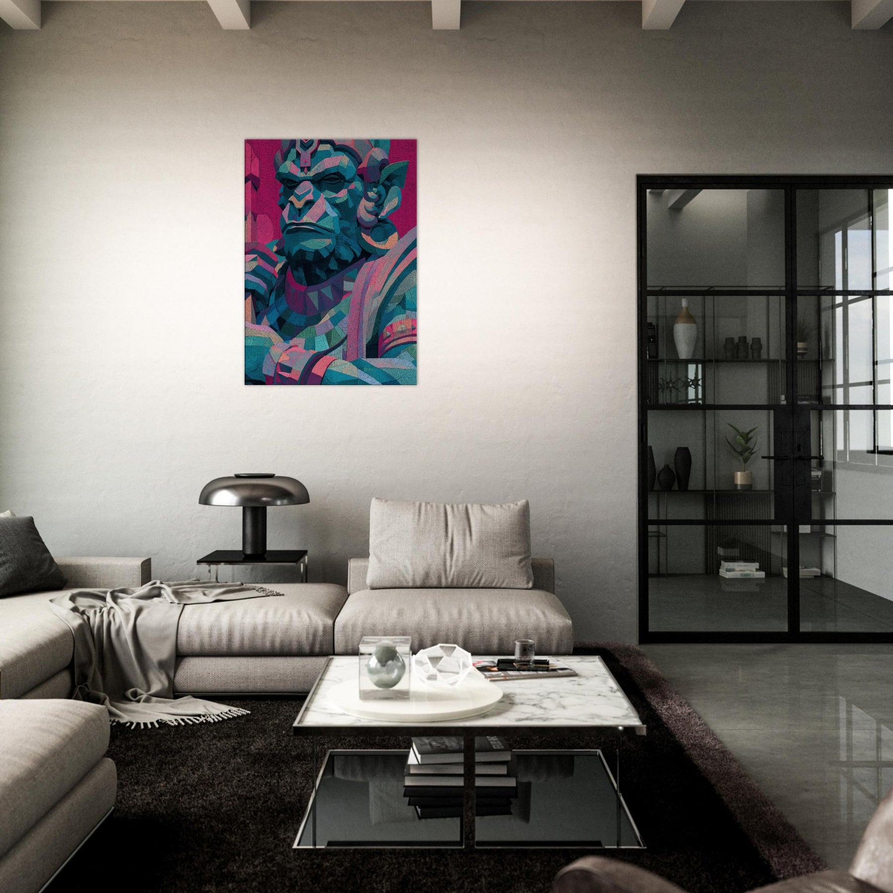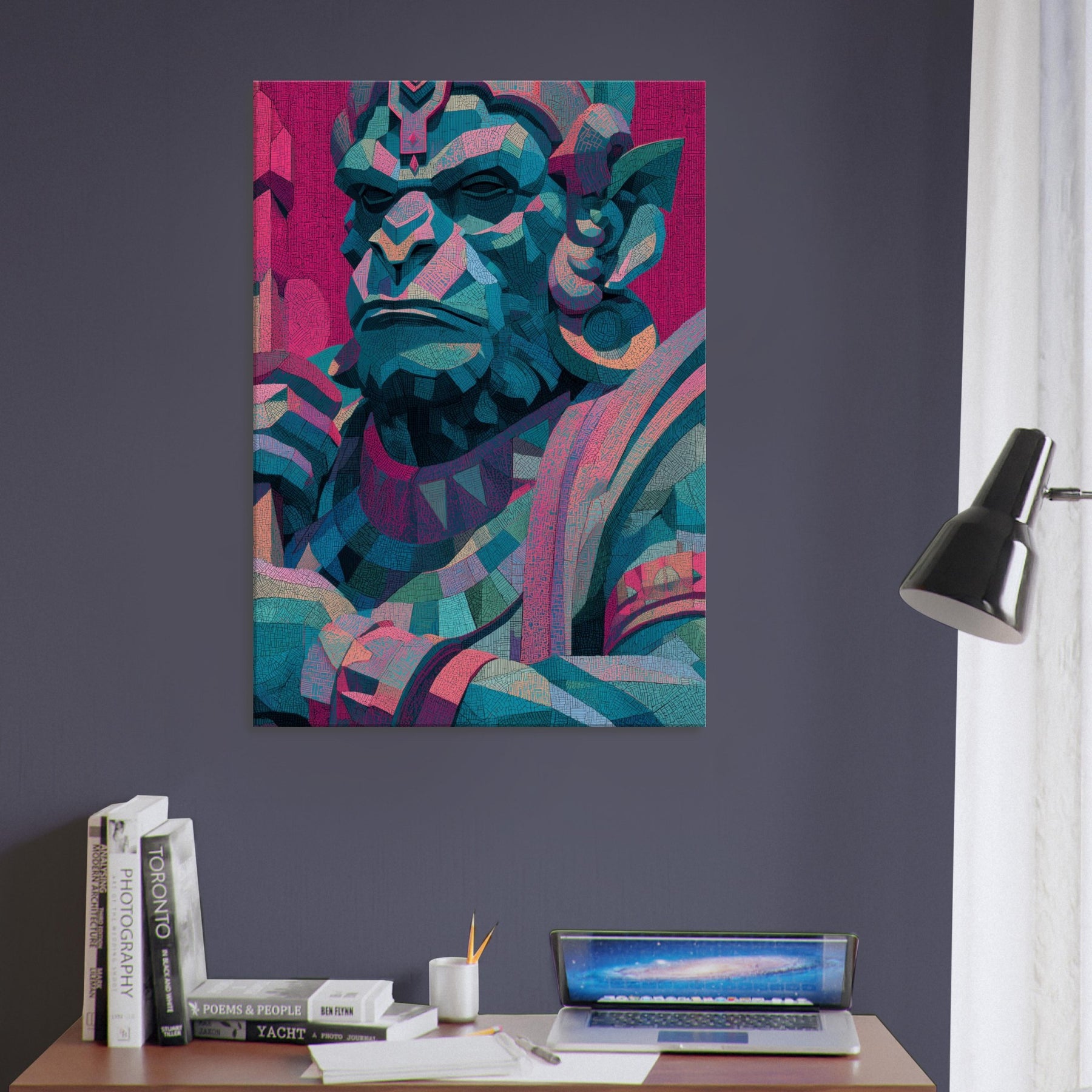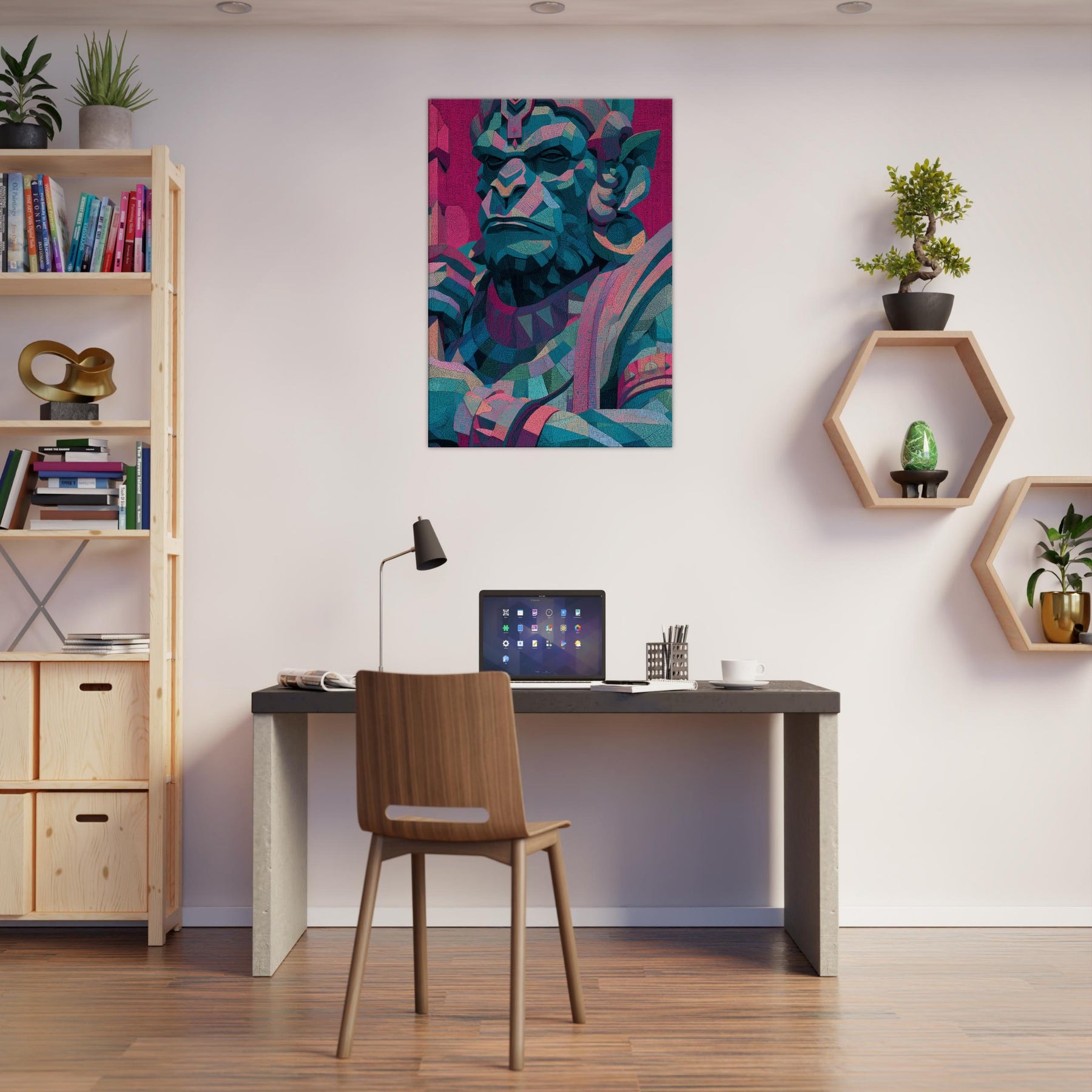 An abstract visage of Hanuman glows with electric teal, magenta, and sapphire, a mystical presence that softens the edges of any room. This piece hums with quiet power, inviting reflection as light shifts across its faceted planes. Positioned in a living area, its layered geometry becomes a focal calm a meditative companion for conversations, quiet evenings, and bold social spaces. The figure’s timeless gaze breathes energy into walls, turning atmosphere into art and transforming a space into a sanctuary of wonder.