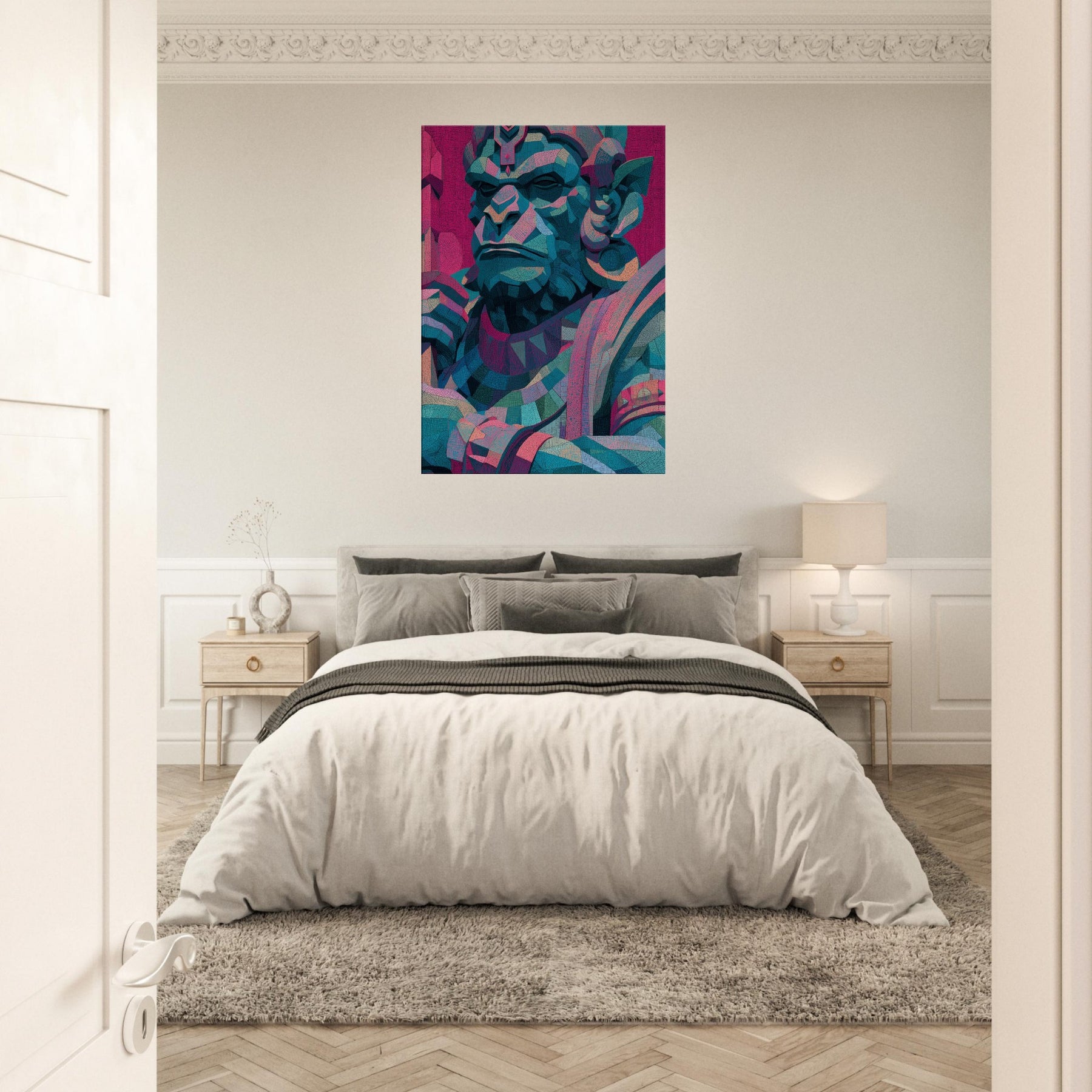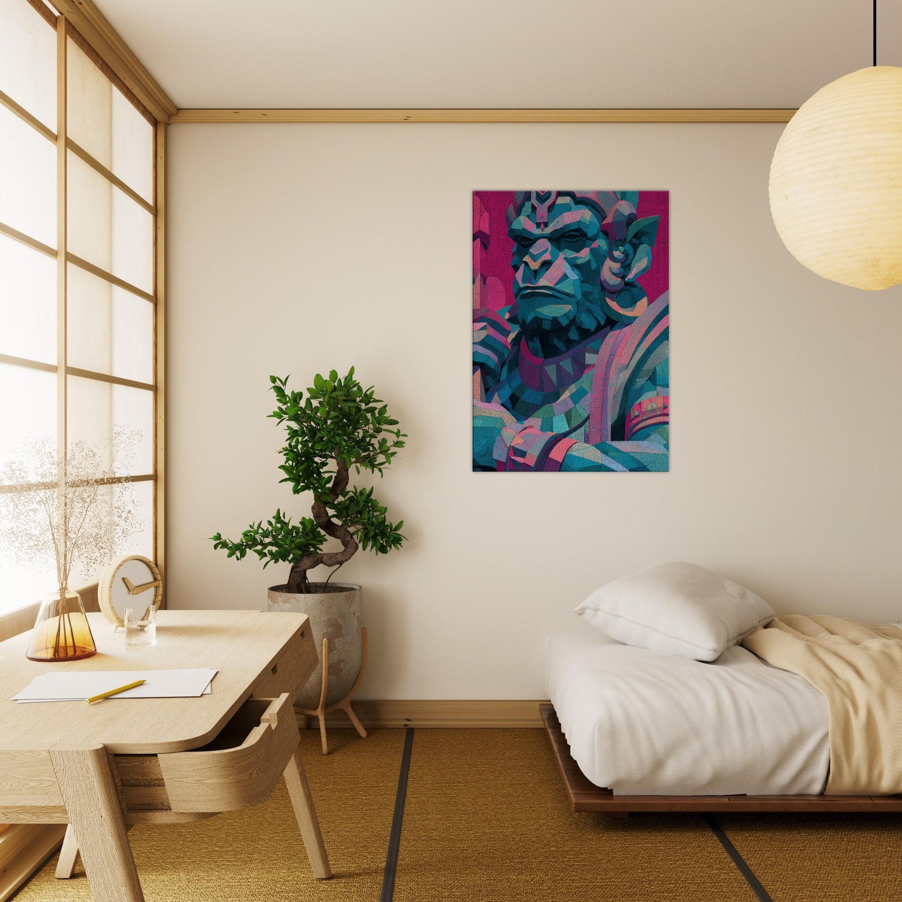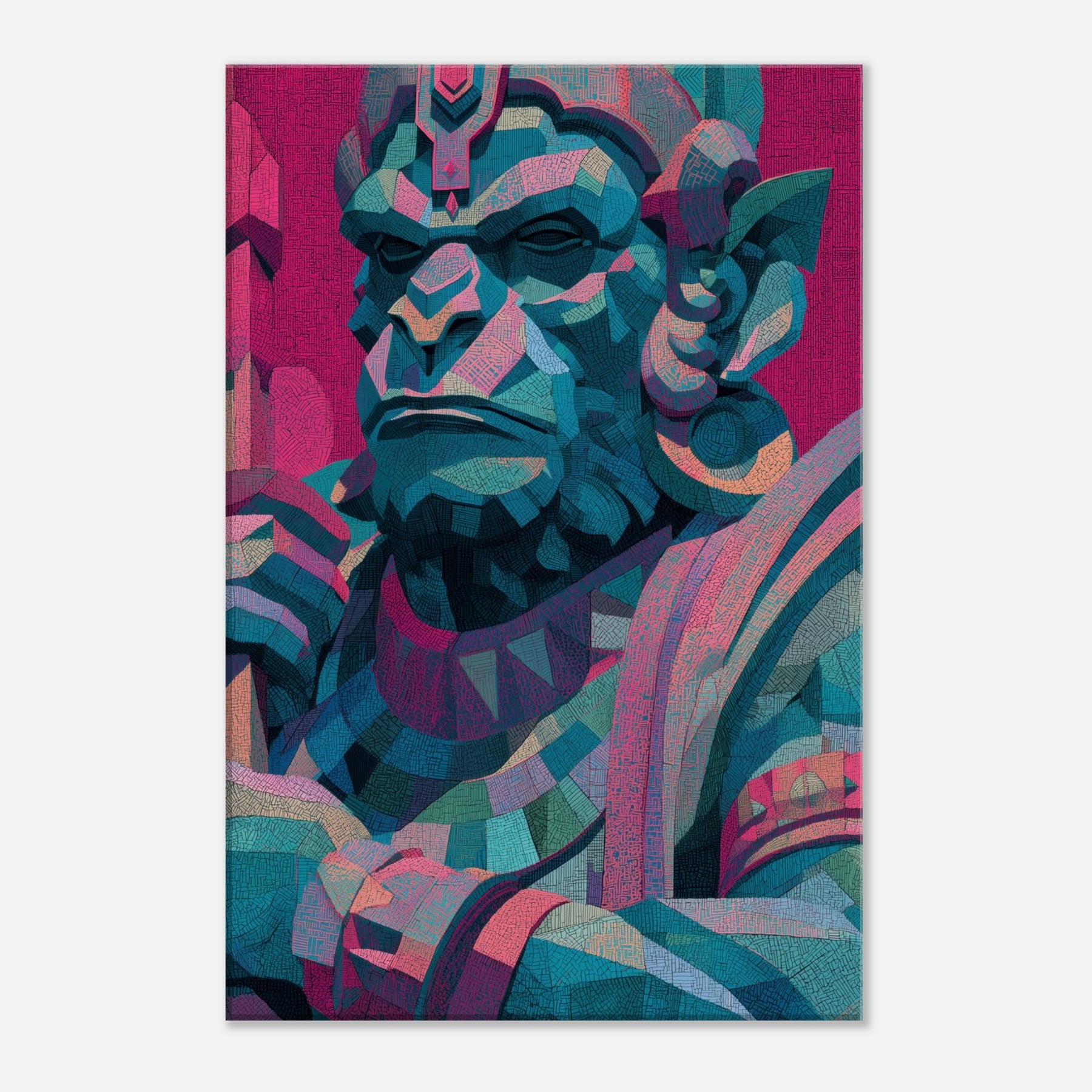 An abstract visage of Hanuman glows with electric teal, magenta, and sapphire, a mystical presence that softens the edges of any room. This piece hums with quiet power, inviting reflection as light shifts across its faceted planes. Positioned in a living area, its layered geometry becomes a focal calm a meditative companion for conversations, quiet evenings, and bold social spaces. The figure’s timeless gaze breathes energy into walls, turning atmosphere into art and transforming a space into a sanctuary of wonder.