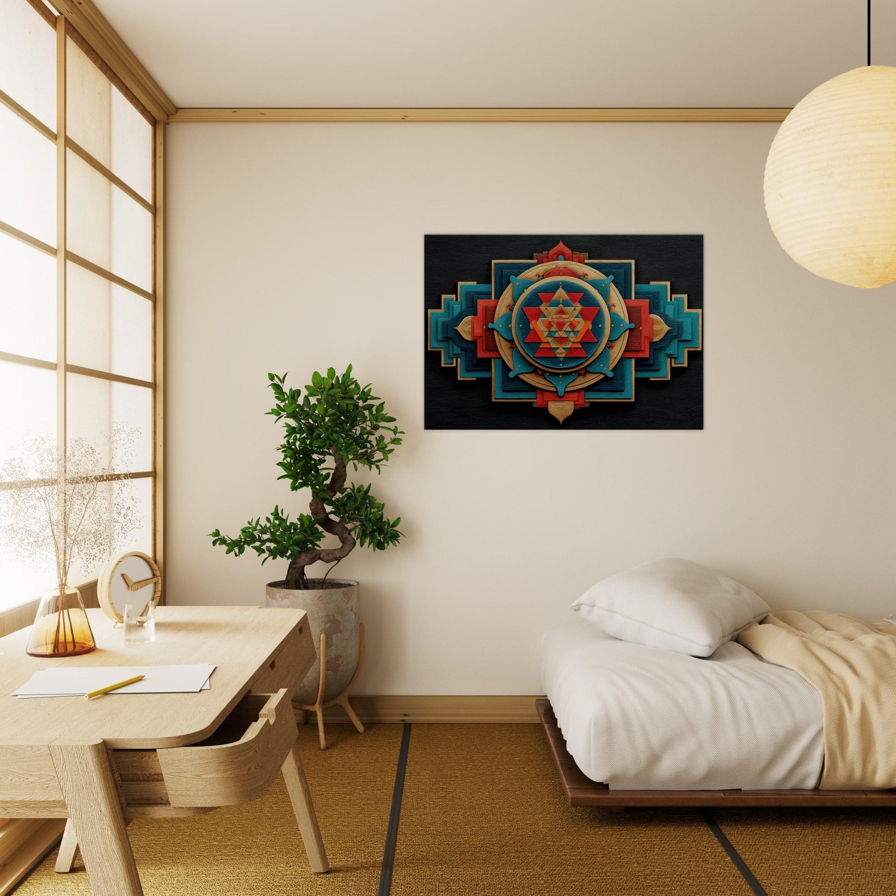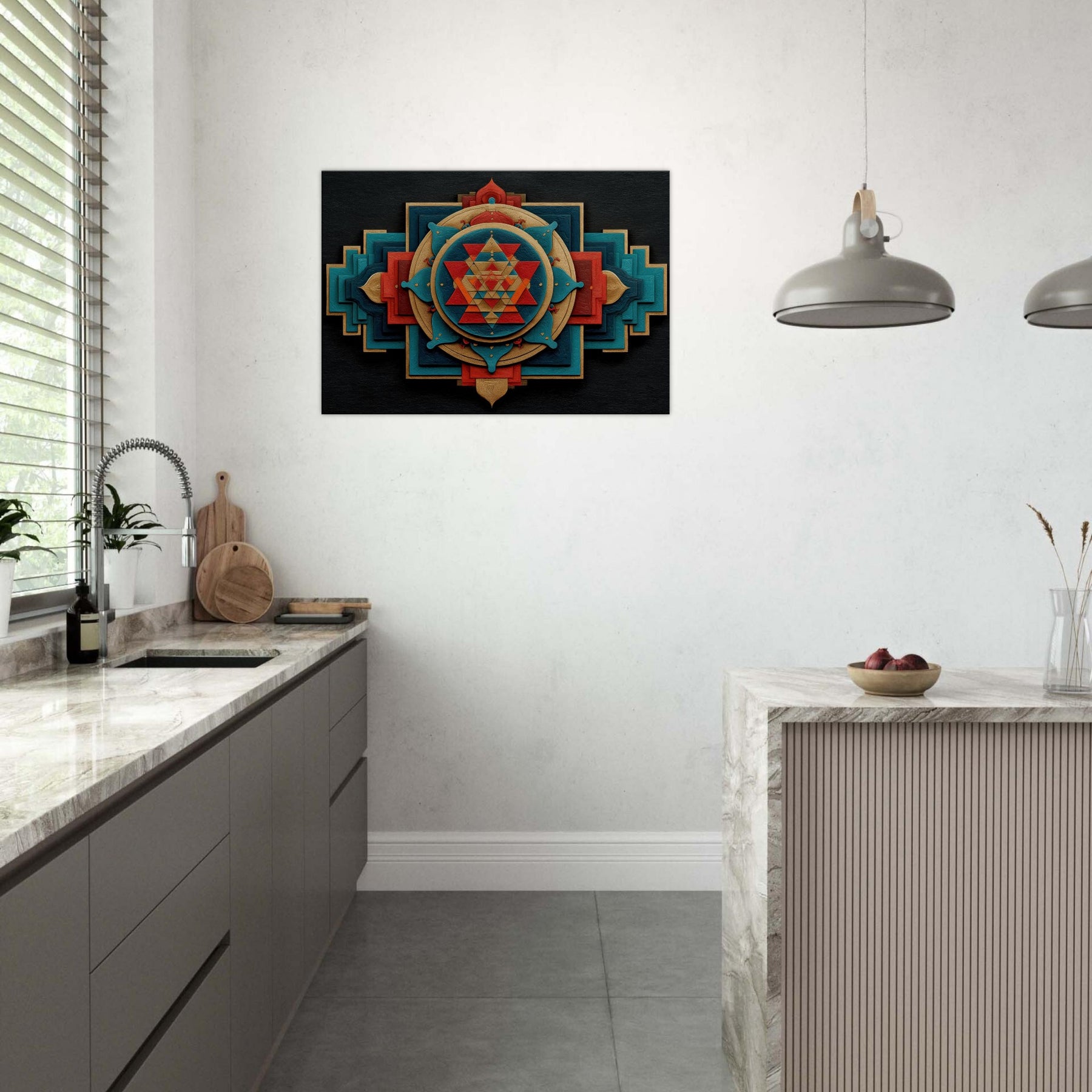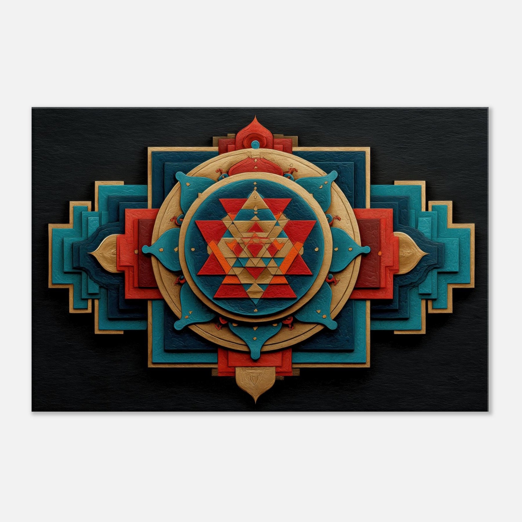 Immerse your space in a tactile meditation of form and color. The Sri Yantra sits at the heart of an ever shifting constellation of layered shapes, circles and triangles, woven in warm gold, turquoise, and crimson, like a temple carved into air. This abstract interpretation invites quiet reflection, turning walls into a doorway for focus and calm. Let it breathe on a living room or study, where light plays across its textures, adding depth, warmth, and a subtle, mystical glow.