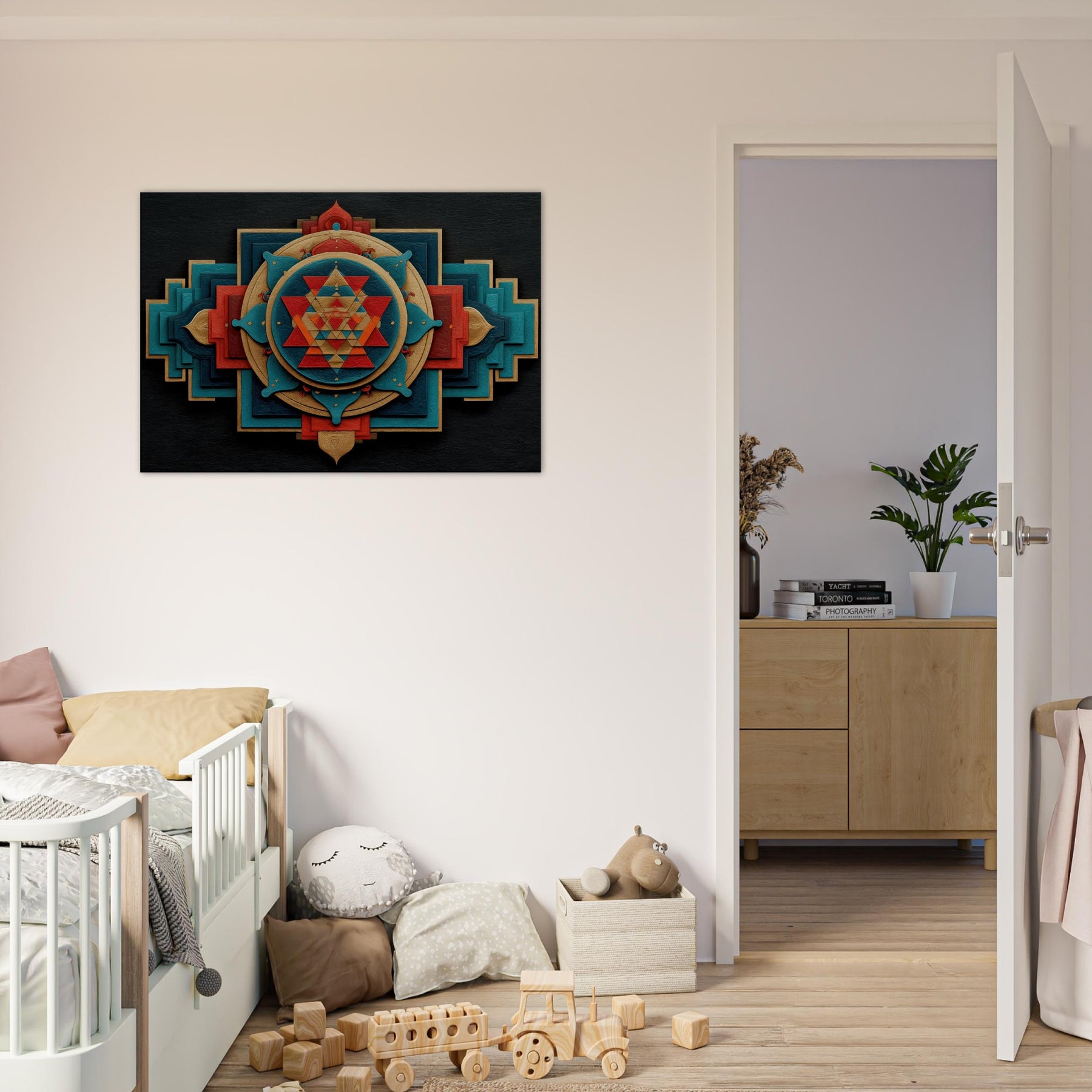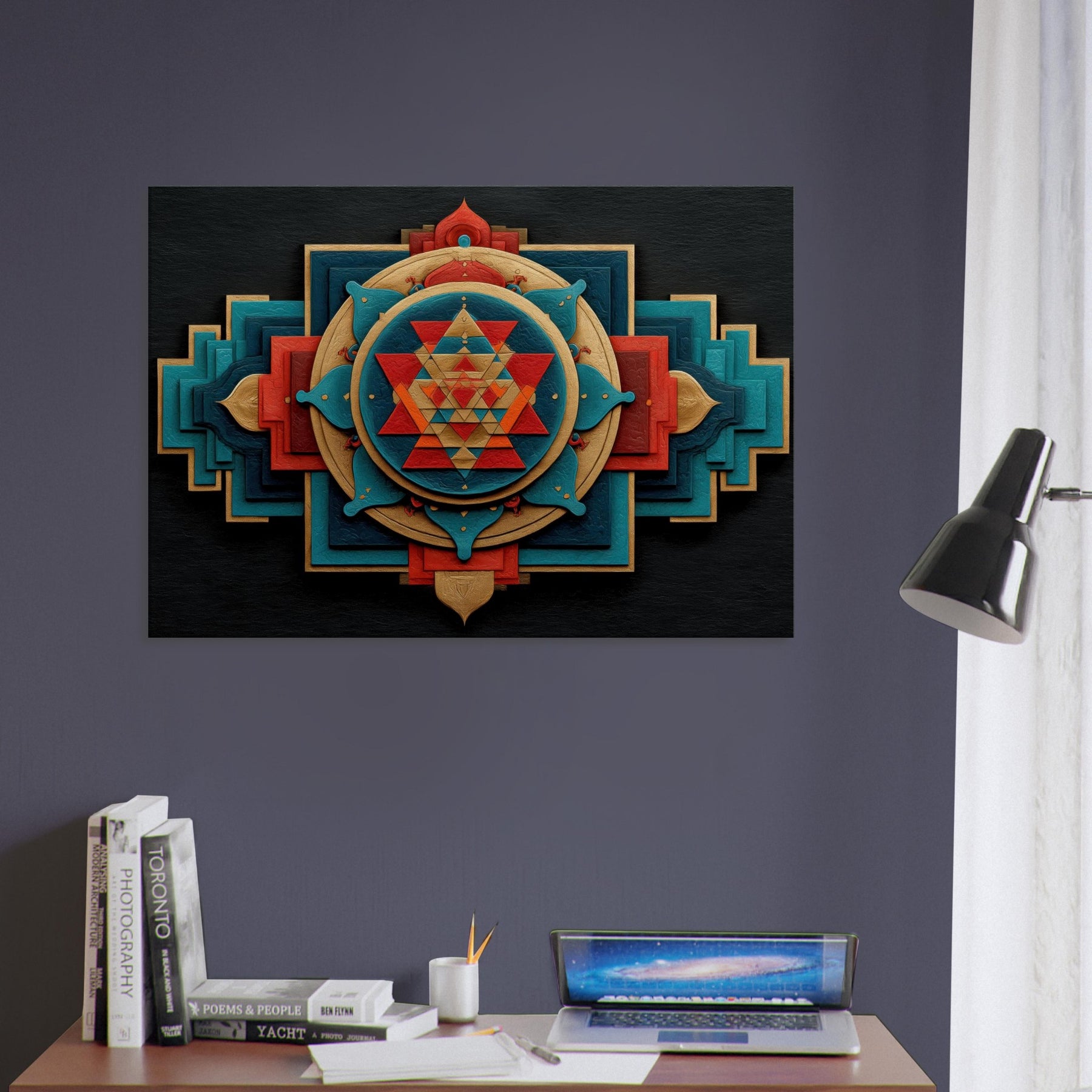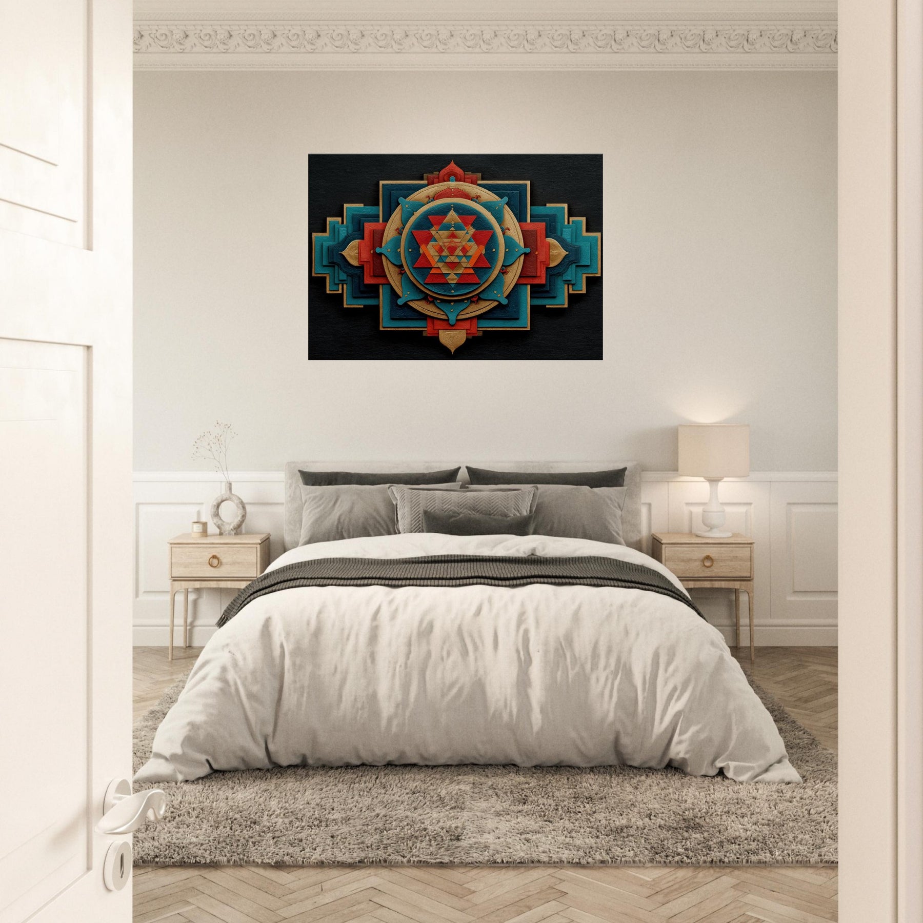Immerse your space in a tactile meditation of form and color. The Sri Yantra sits at the heart of an ever shifting constellation of layered shapes, circles and triangles, woven in warm gold, turquoise, and crimson, like a temple carved into air. This abstract interpretation invites quiet reflection, turning walls into a doorway for focus and calm. Let it breathe on a living room or study, where light plays across its textures, adding depth, warmth, and a subtle, mystical glow.