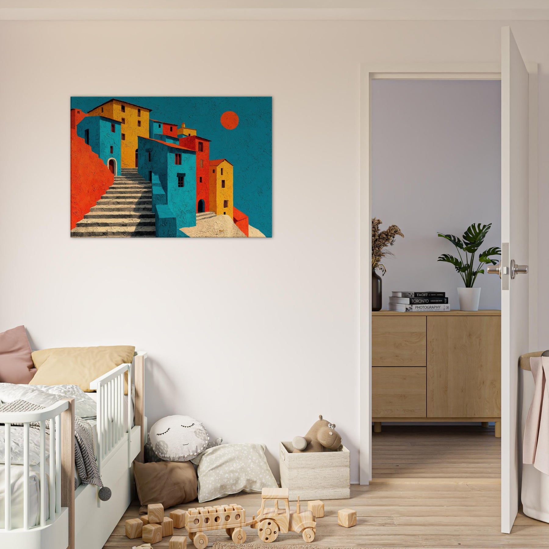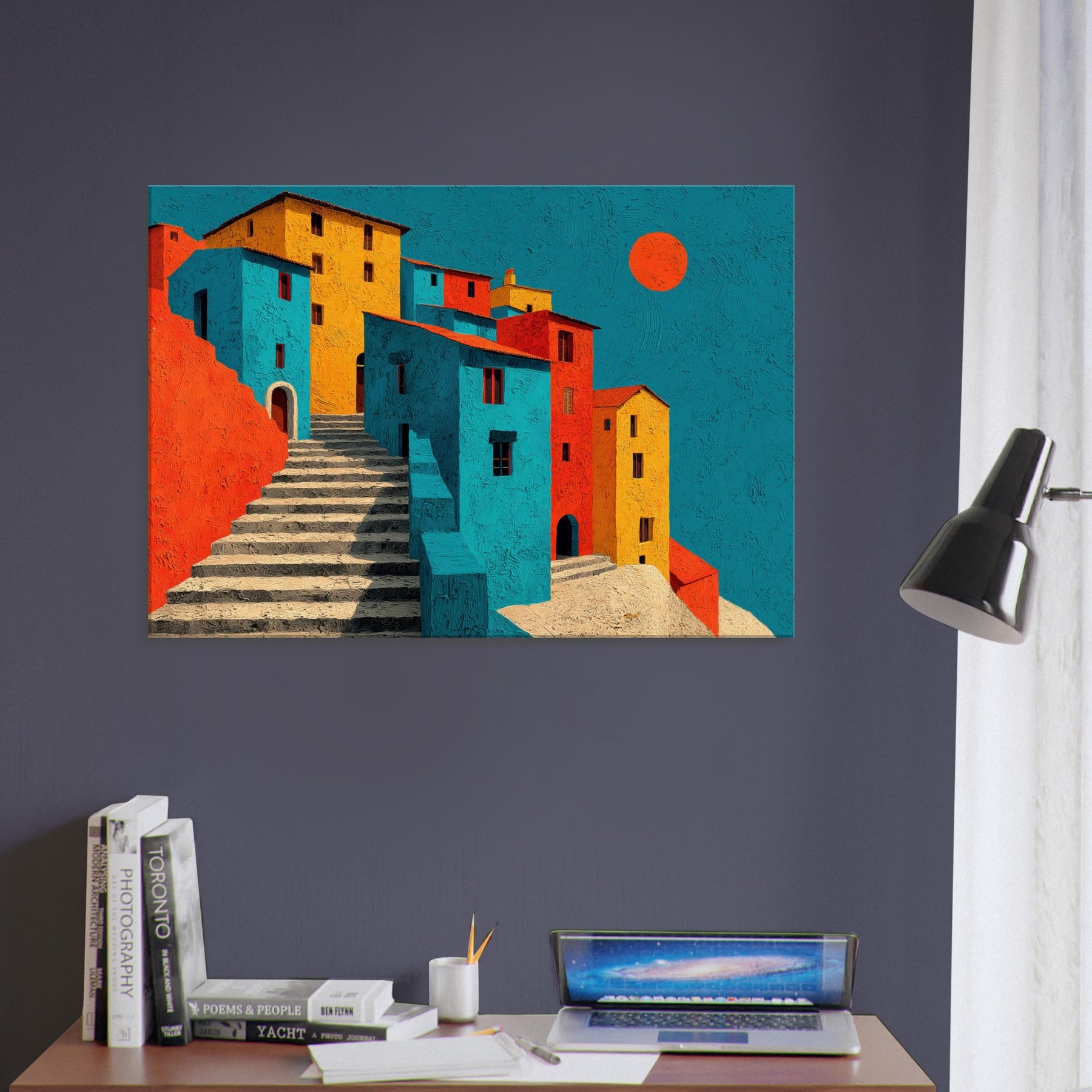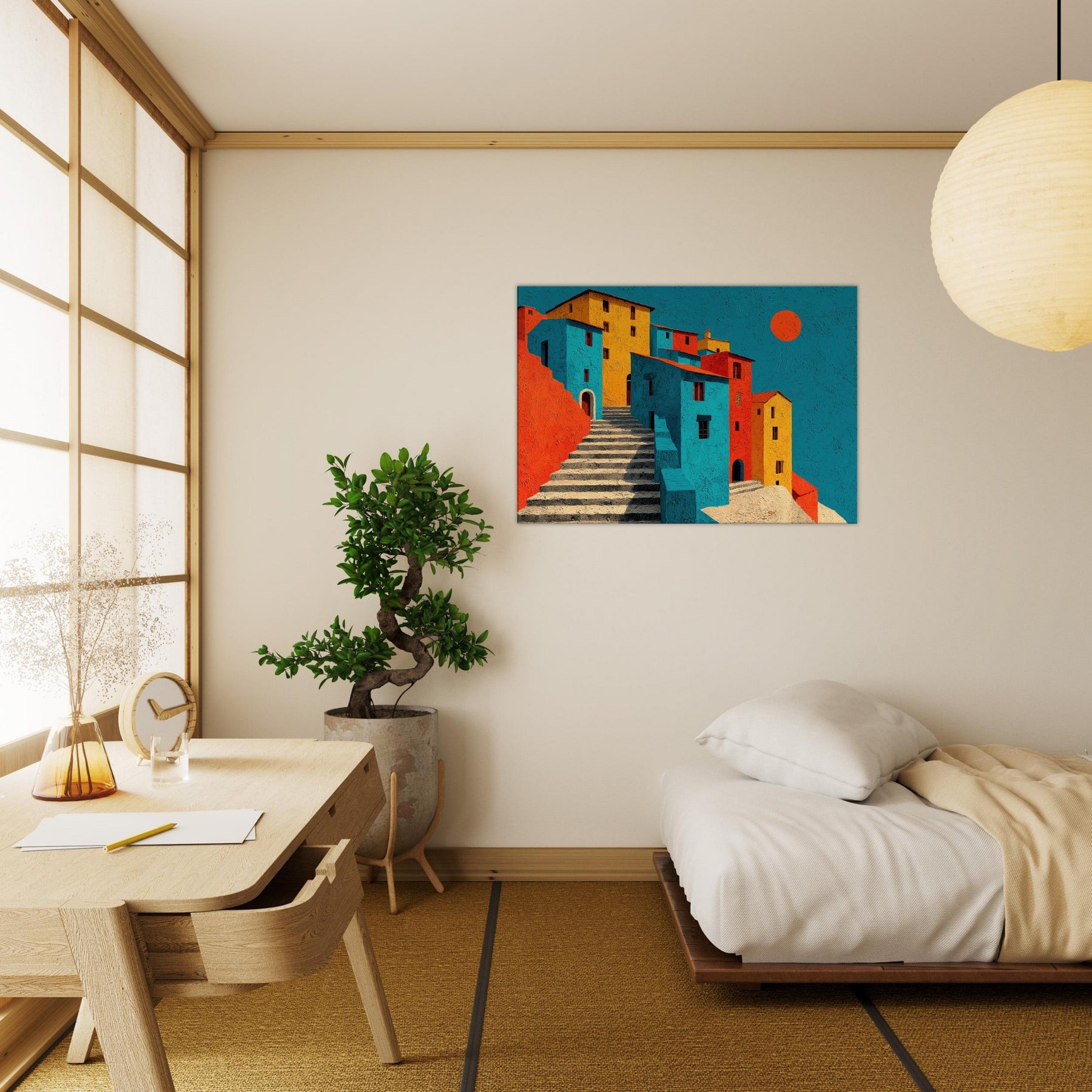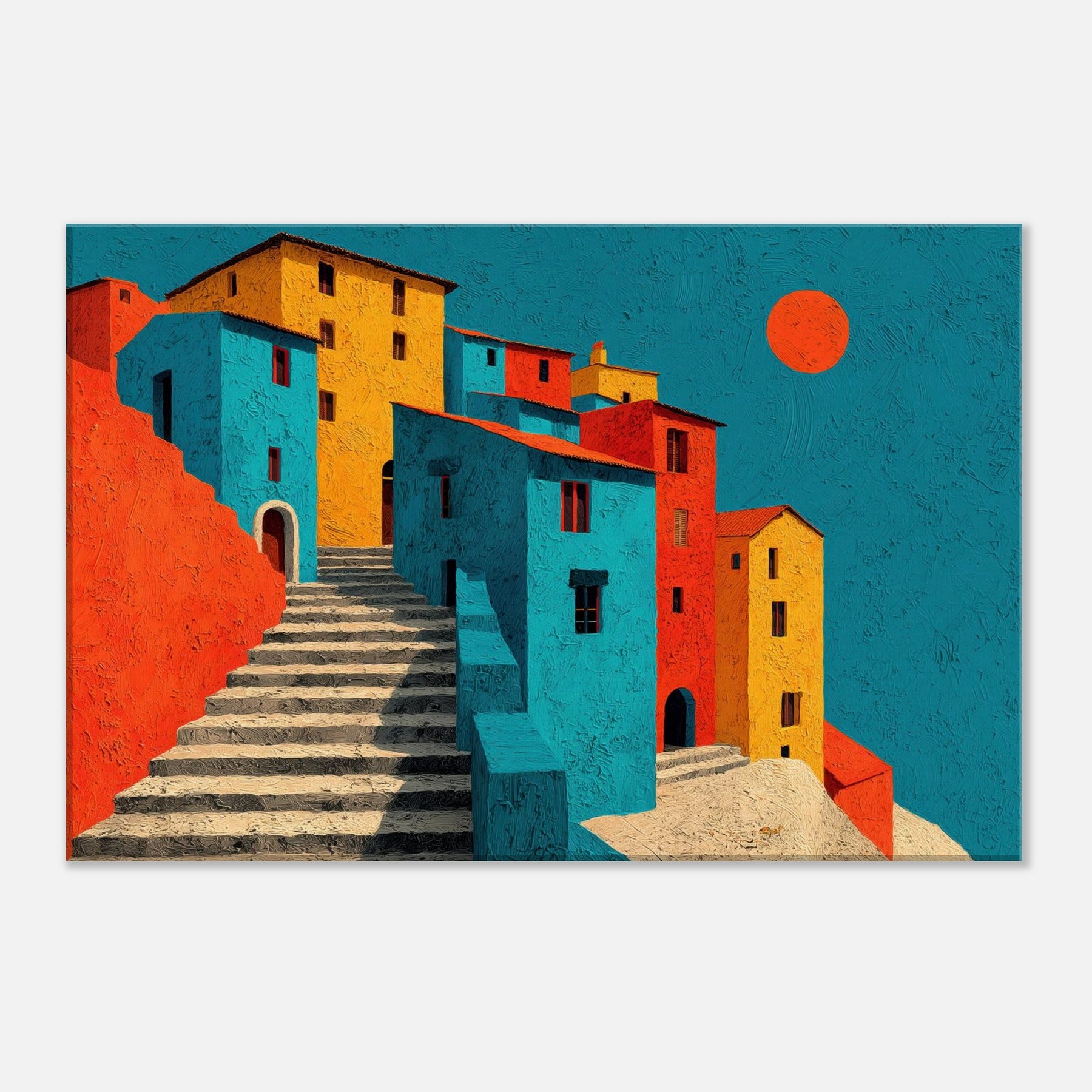 Let the Mountain Village unfold in your room as a chorus of sunlit stairways and warm façades. This vibrant interpretation bathes the scene in saturated blues, yellows, and reds, weaving texture you can almost feel under your fingers. The composition invites the eye upward along winding steps, turning a compact space into a horizon of memory and light. Hang it where you want conversation to linger and the room to glow with cinematic warmth.