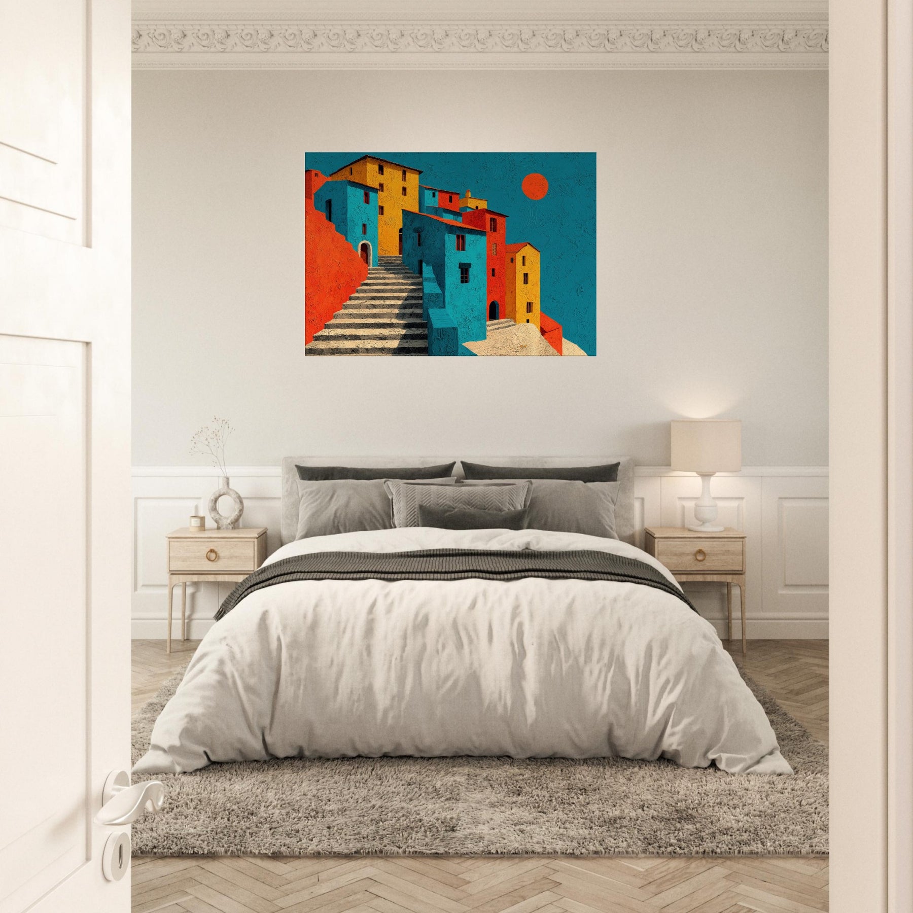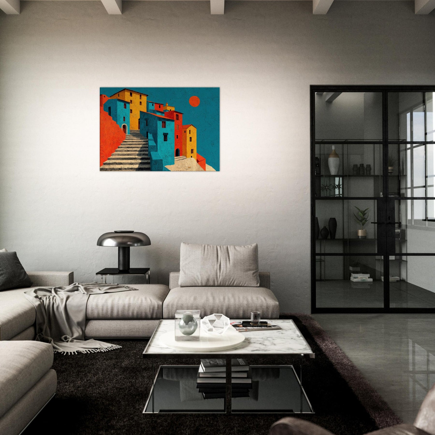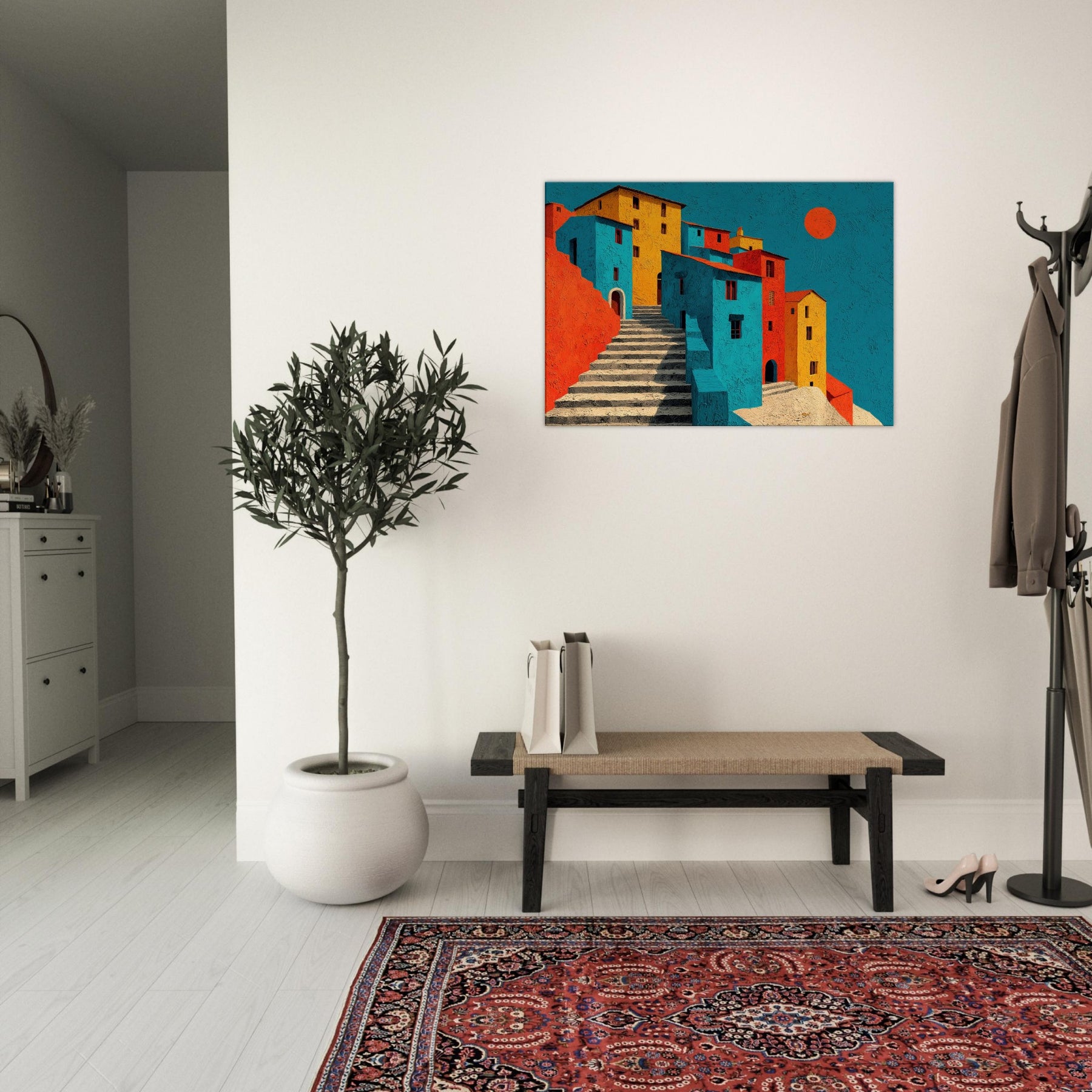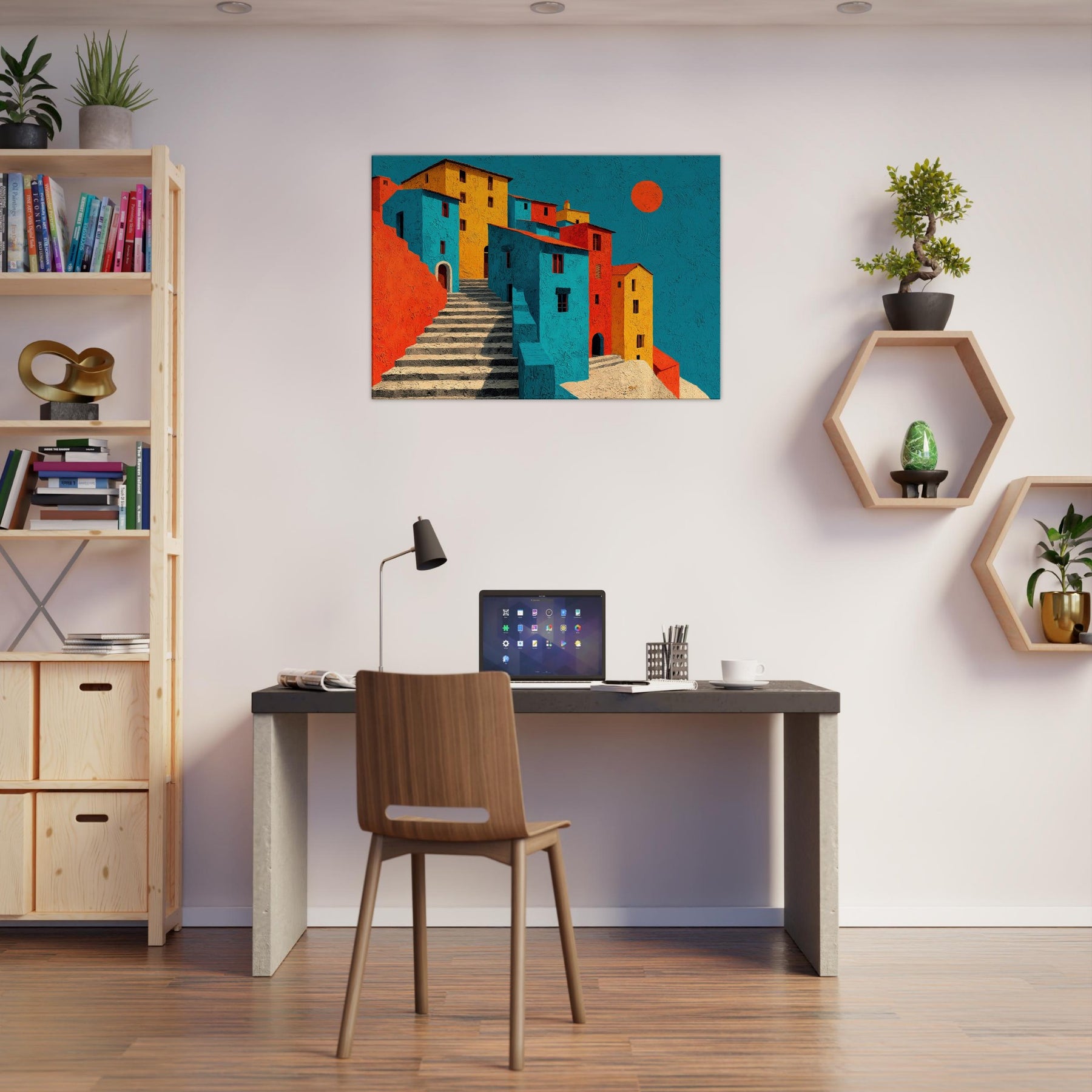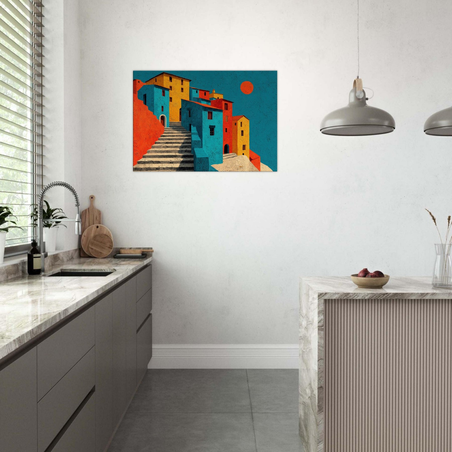 Let the Mountain Village unfold in your room as a chorus of sunlit stairways and warm façades. This vibrant interpretation bathes the scene in saturated blues, yellows, and reds, weaving texture you can almost feel under your fingers. The composition invites the eye upward along winding steps, turning a compact space into a horizon of memory and light. Hang it where you want conversation to linger and the room to glow with cinematic warmth.