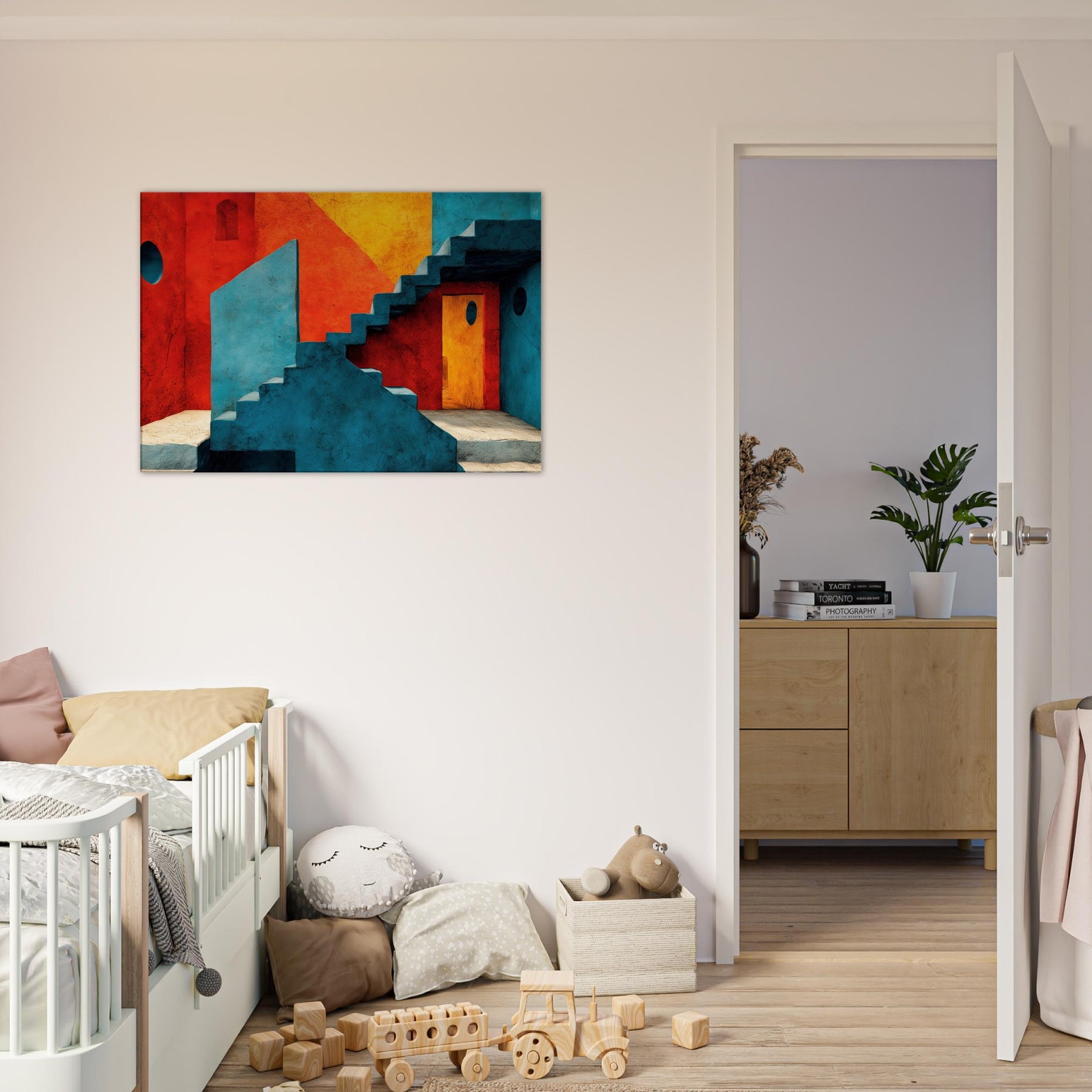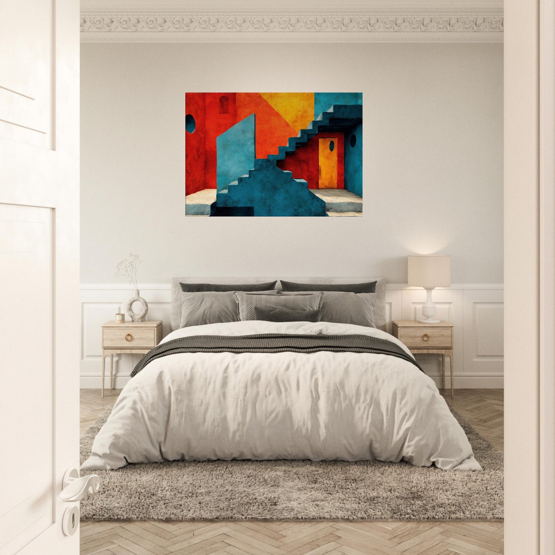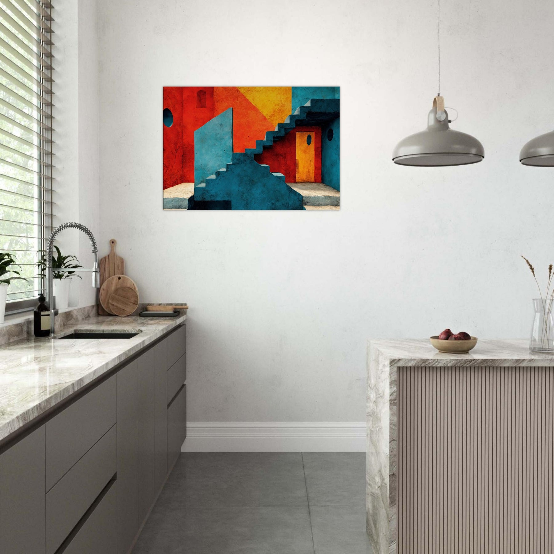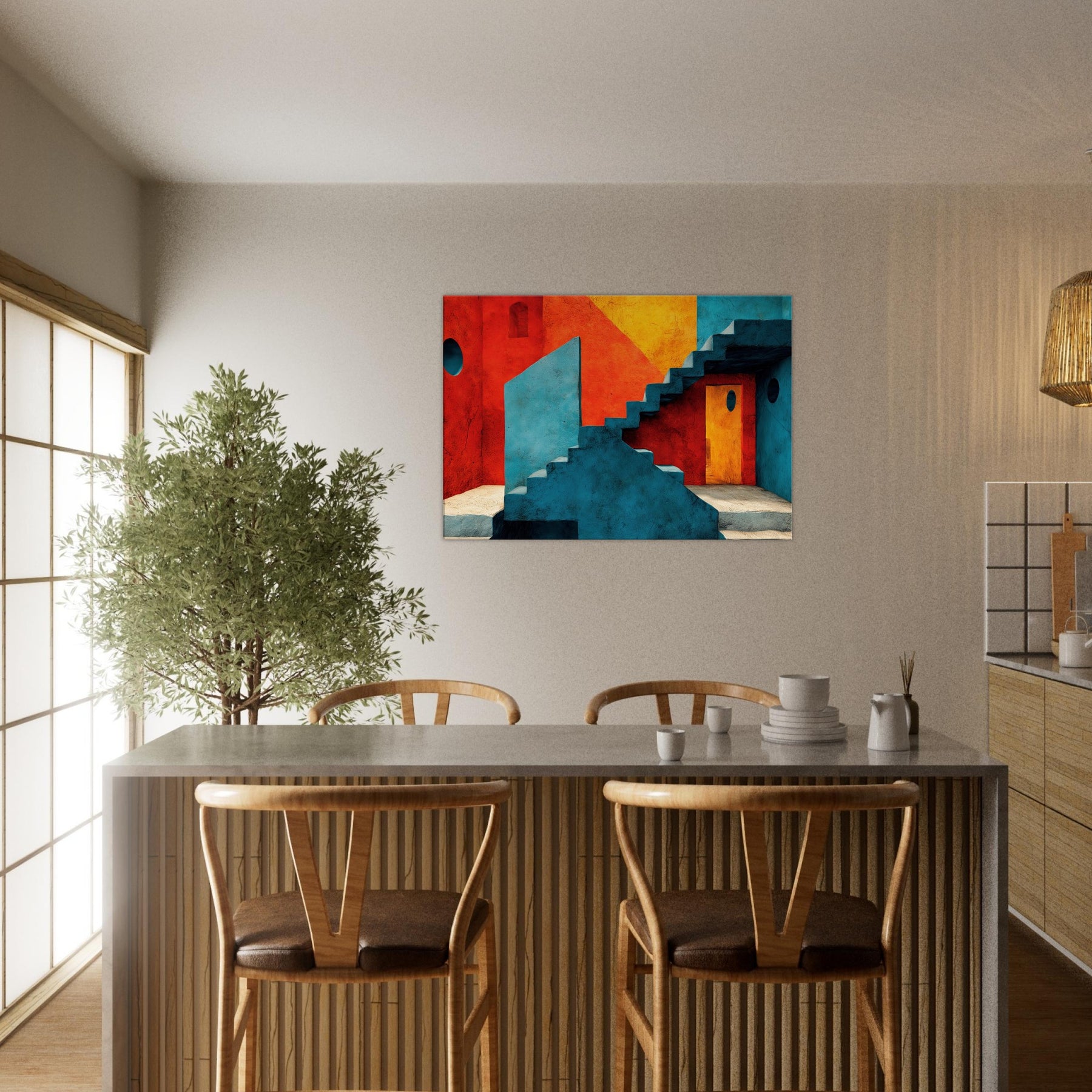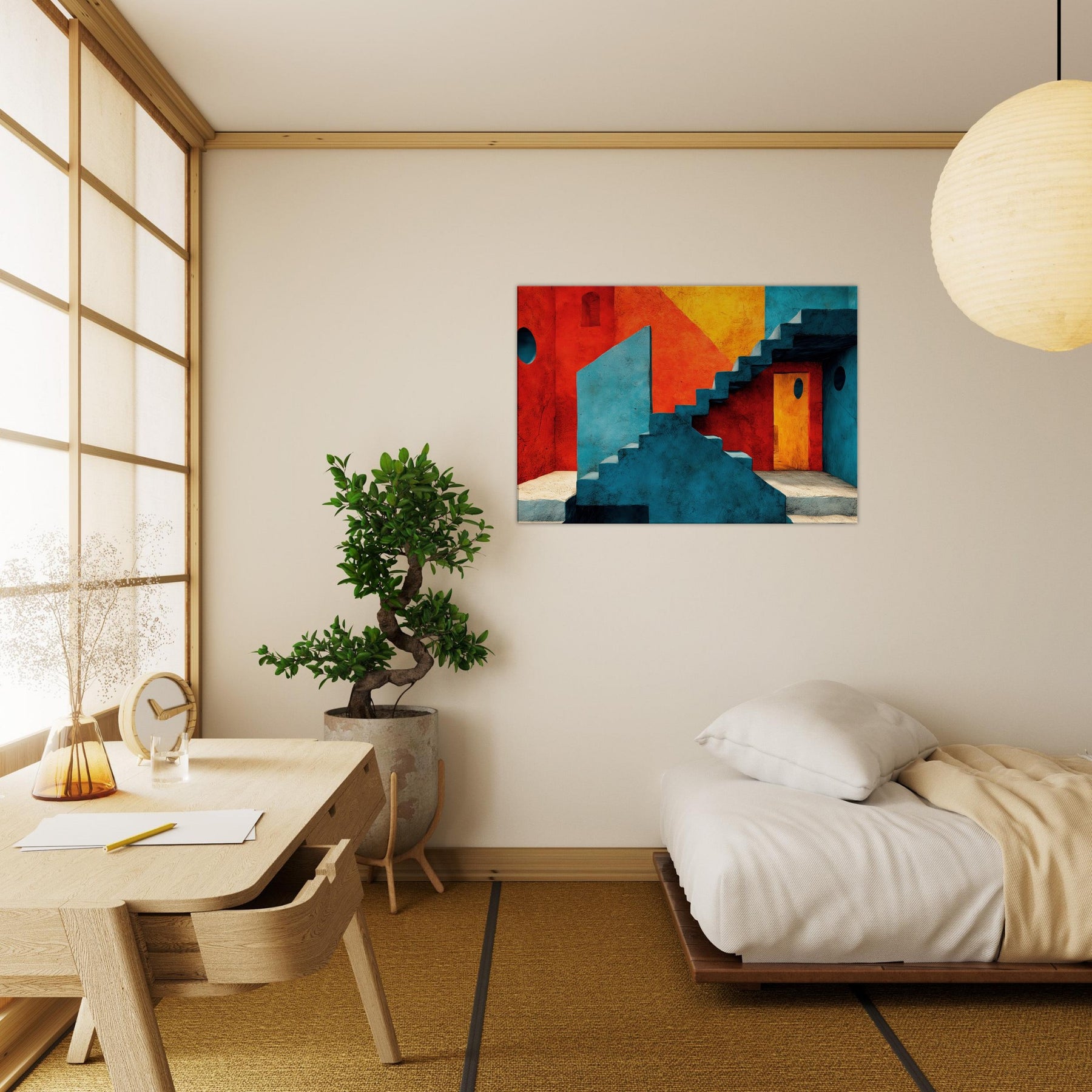 Staircase Switchback unfurls as a vivid urban poem, where angular blue stairs thread through a furnace red wall and a sunlit doorway spills amber light. The scene hums with modern energy, inviting you to step into a dream of movement and memory. In living spaces, it acts like a heartbeat of color calming yet daring, architectural yet intimate drawing the eye upward and guiding conversation. This abstract cityscape turns any room into a gallery of possibility, a tactile escape for everyday life.
