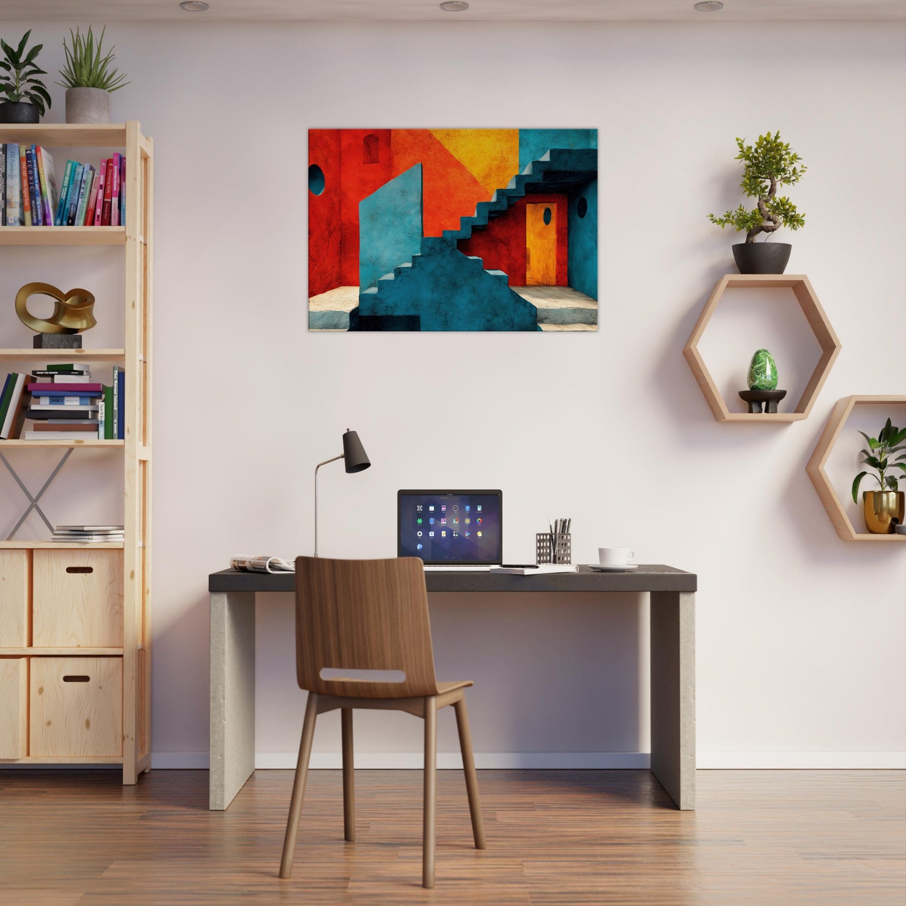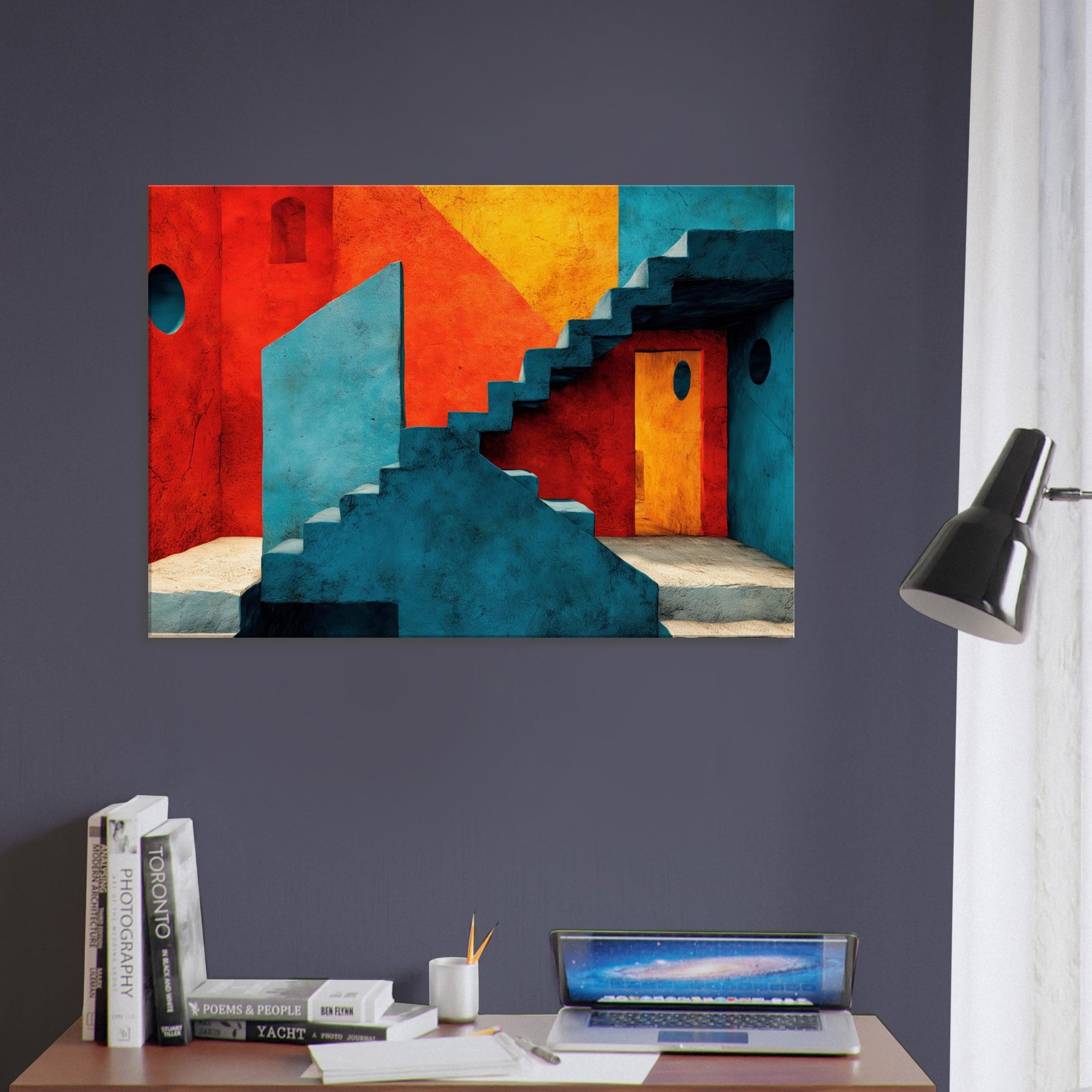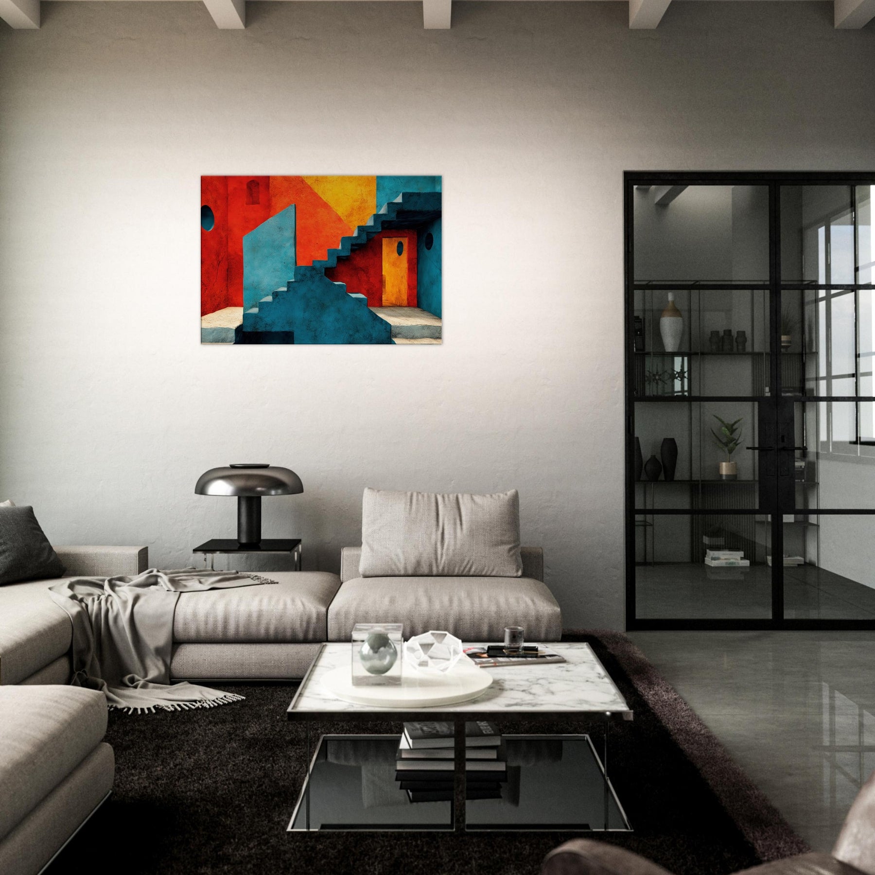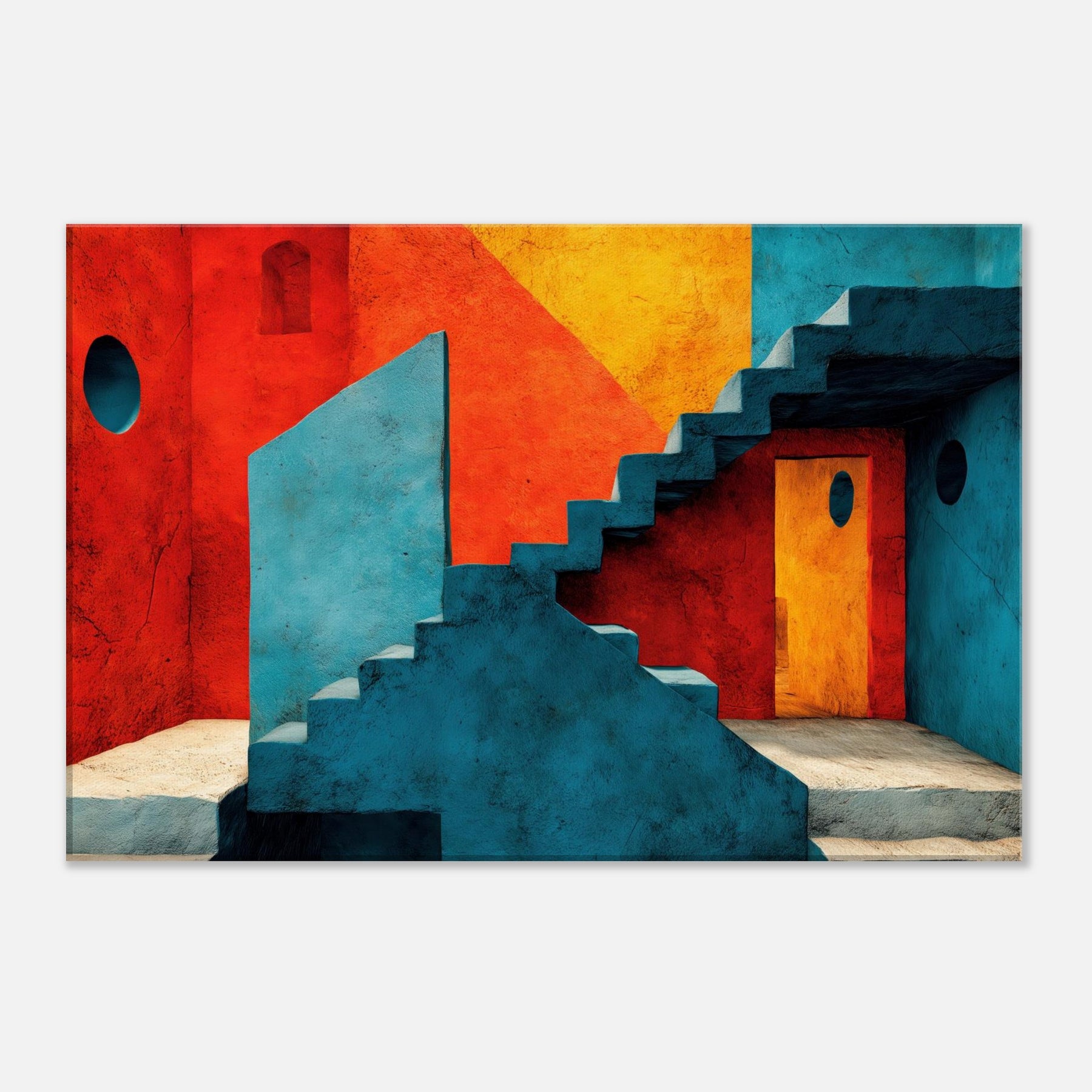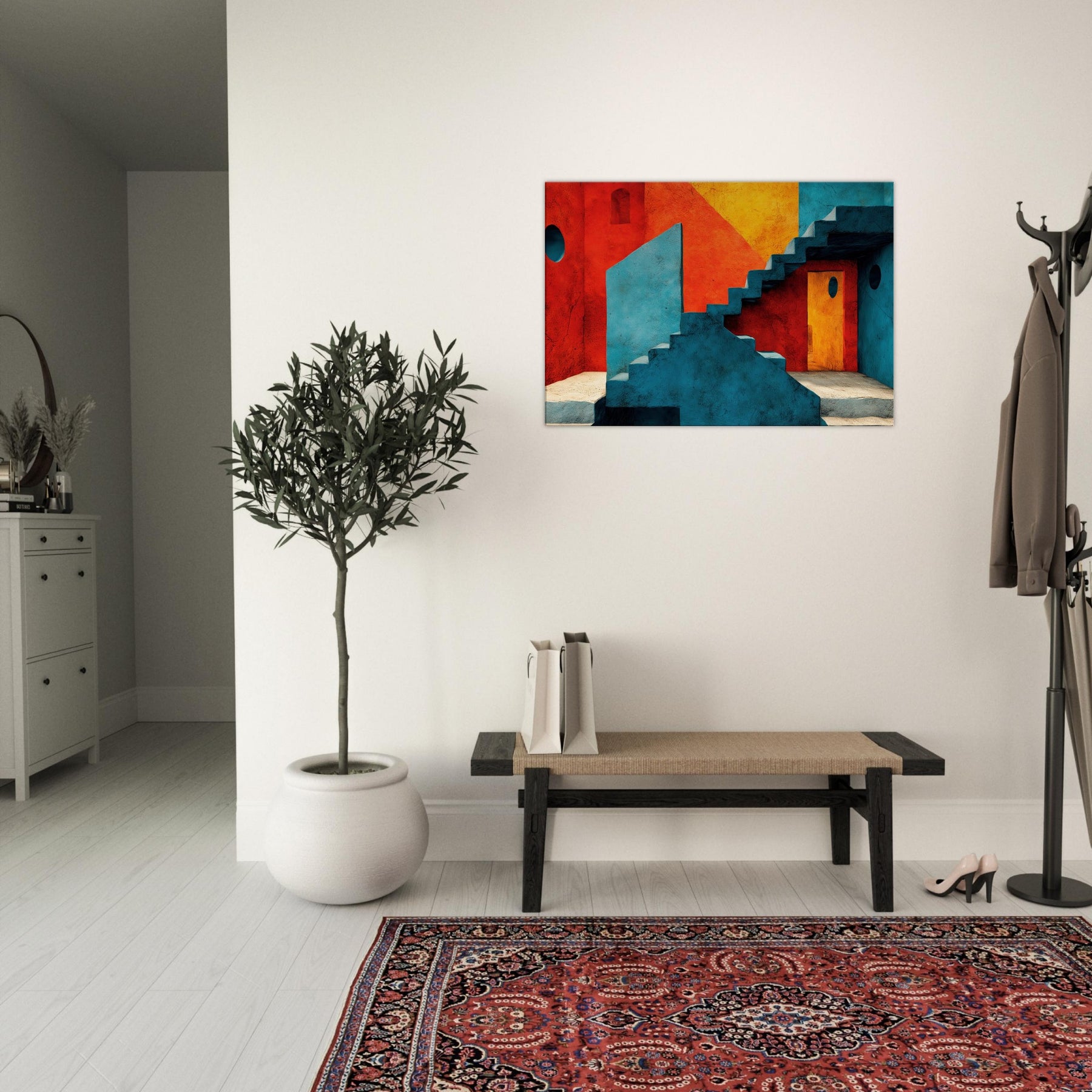 Staircase Switchback unfurls as a vivid urban poem, where angular blue stairs thread through a furnace red wall and a sunlit doorway spills amber light. The scene hums with modern energy, inviting you to step into a dream of movement and memory. In living spaces, it acts like a heartbeat of color calming yet daring, architectural yet intimate drawing the eye upward and guiding conversation. This abstract cityscape turns any room into a gallery of possibility, a tactile escape for everyday life.