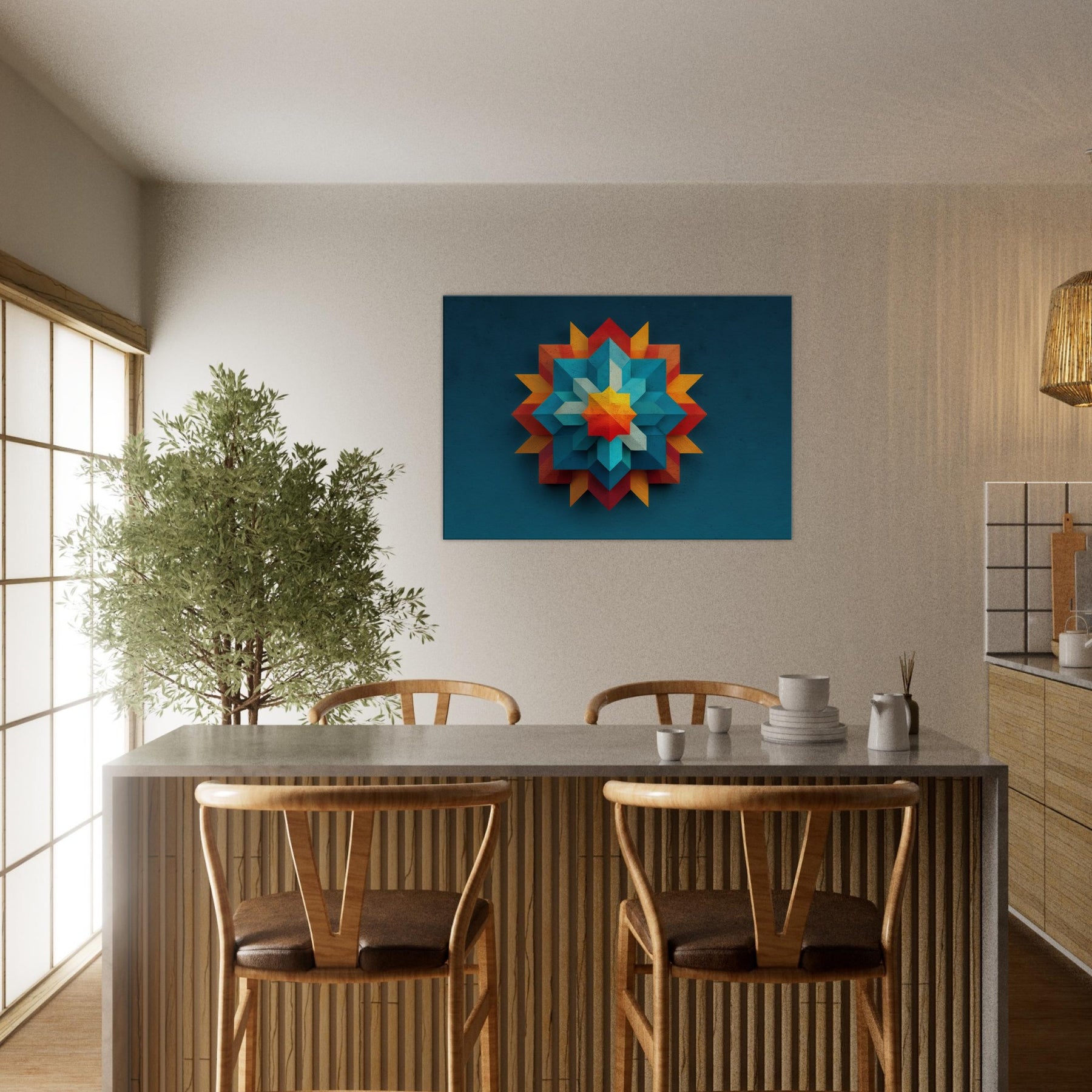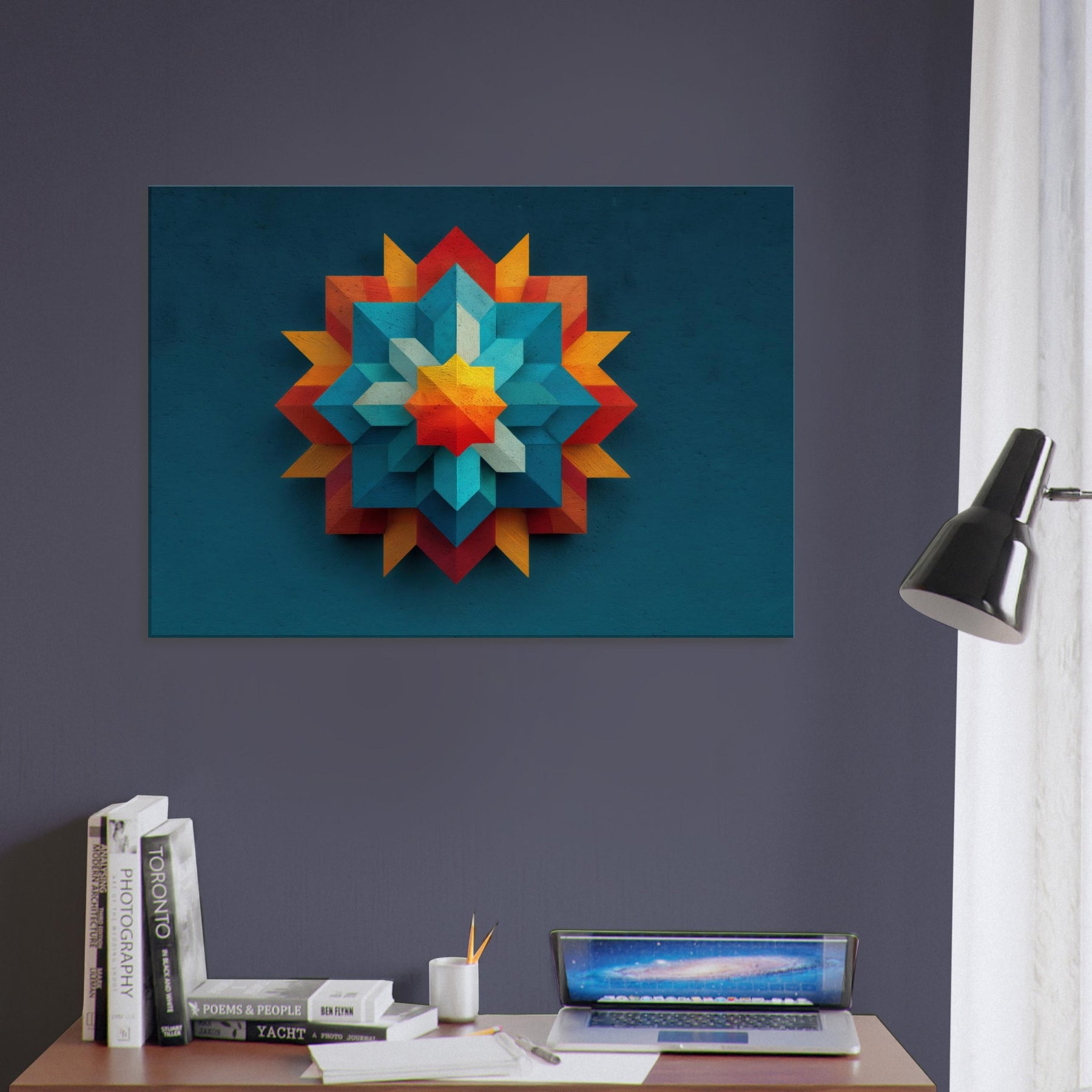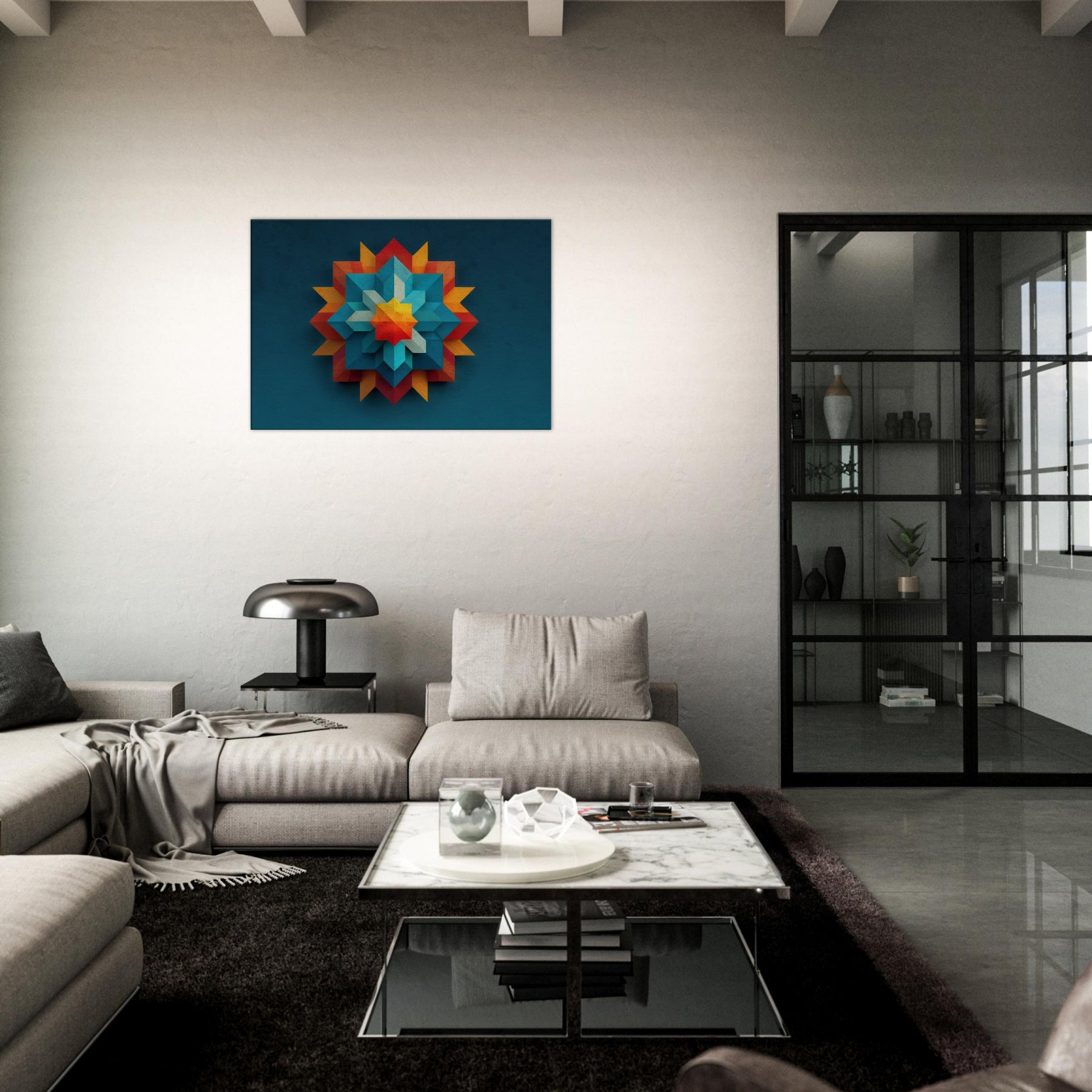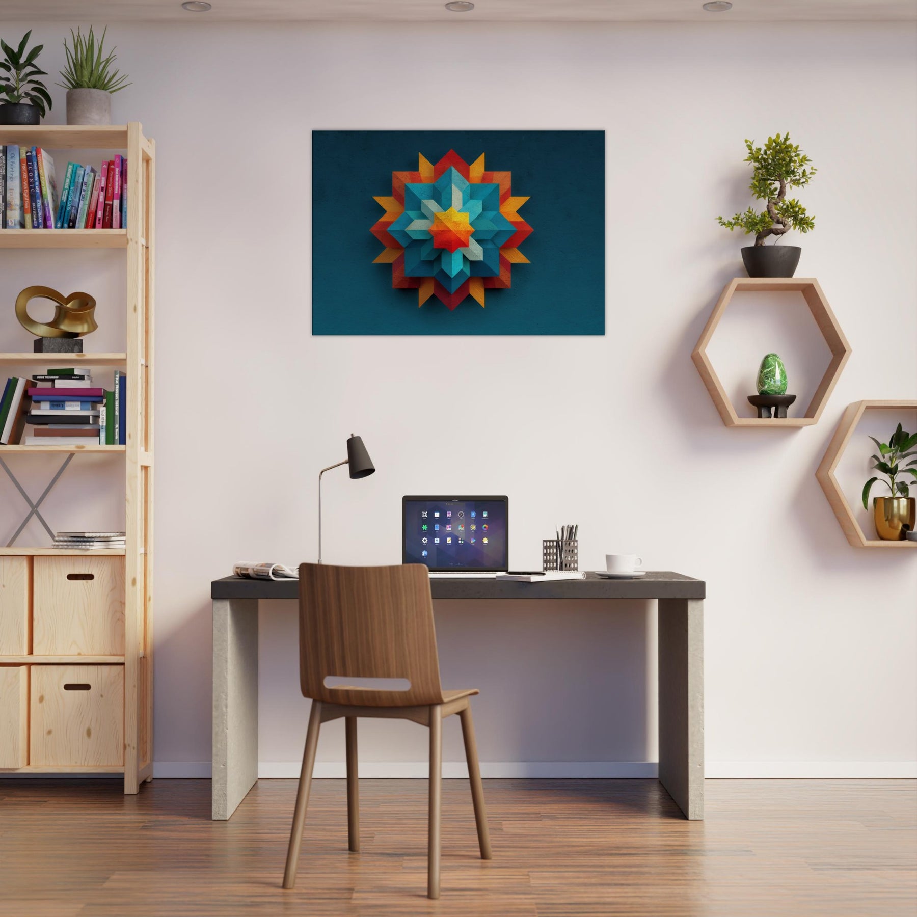 Star of David takes a luminous new shape in this abstract study an intricate lattice of converging facets that feels both ancient and contemporary. The palette dances in teal, turquoise, coral, and gold, catching light and shifting mood as the day moves. Hung in a bright living room or a quiet study, it invites a breath of stillness, turning walls into a softly glowing horizon and infusing the space with wonder, warmth, and a sense of spacious, contemplative calm. The central subject is Star of David (Minimal Line).