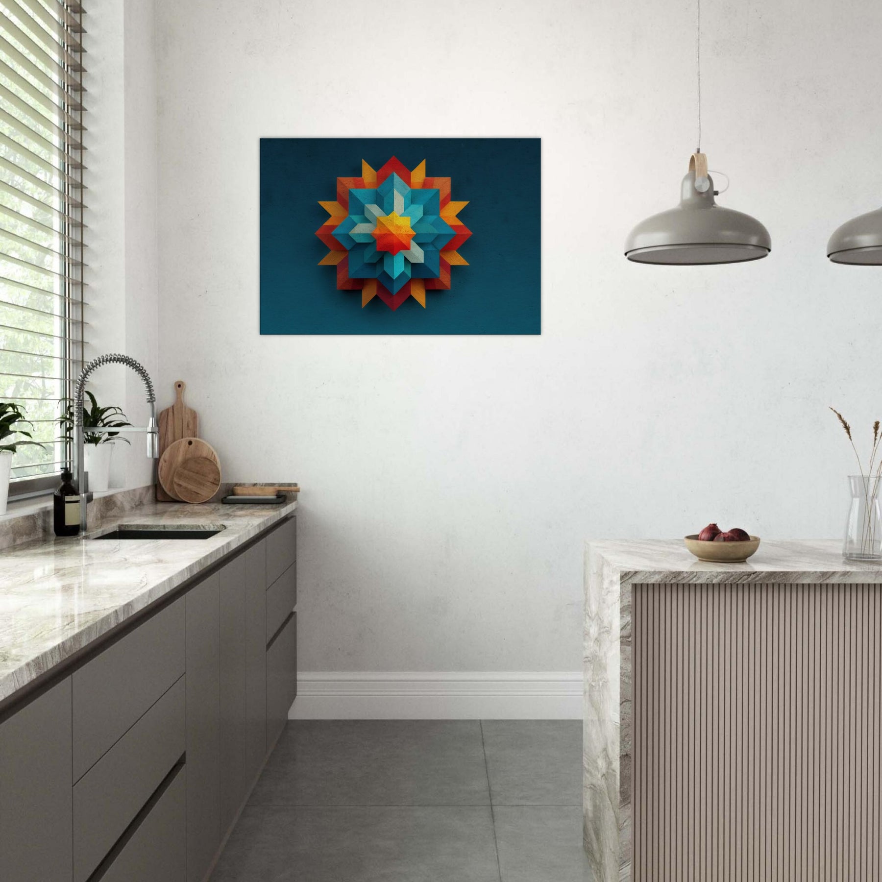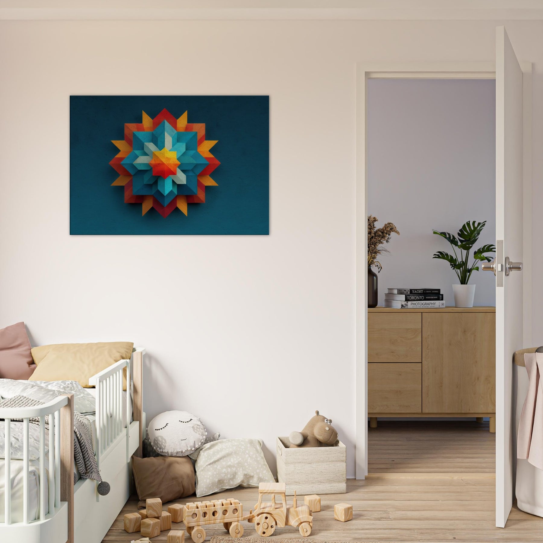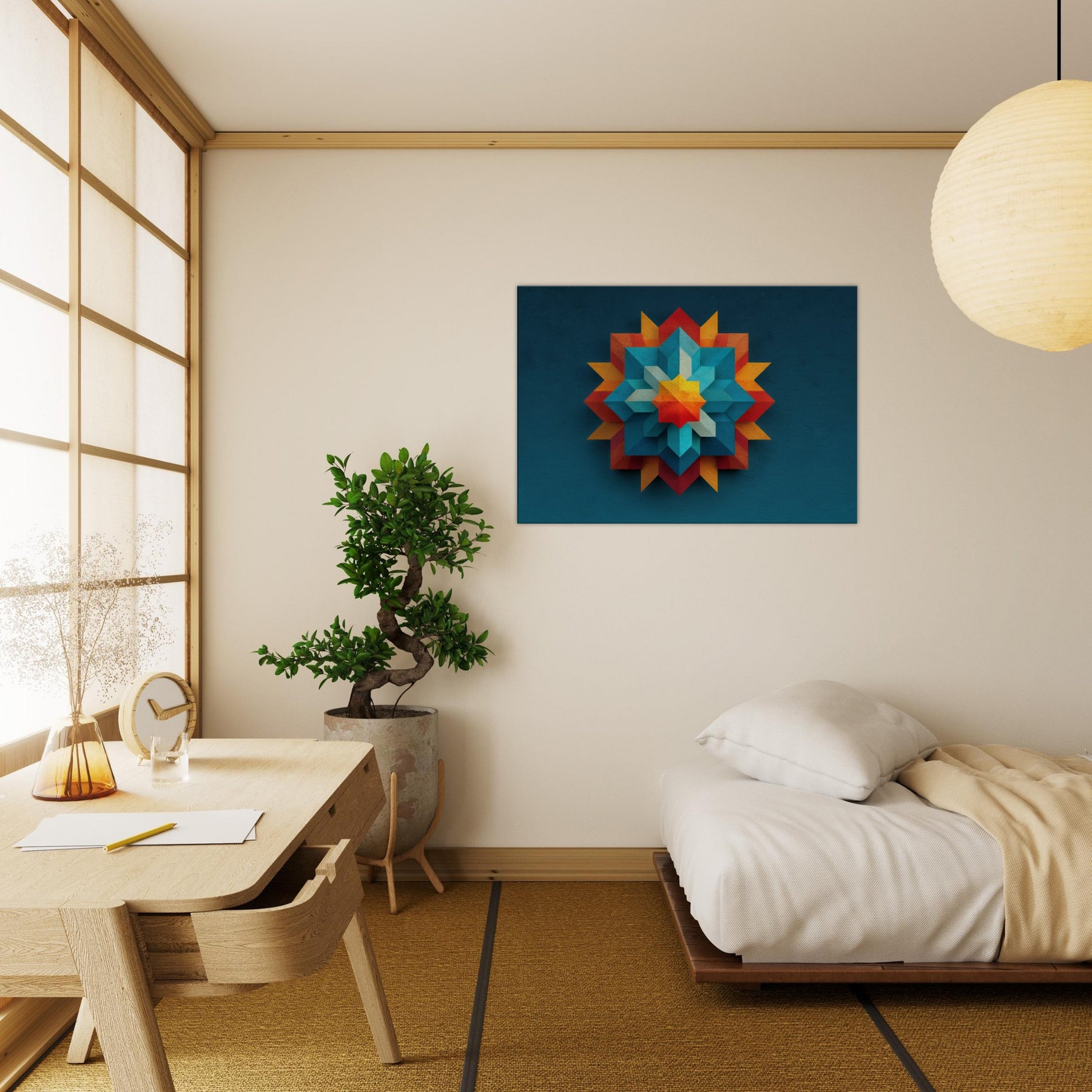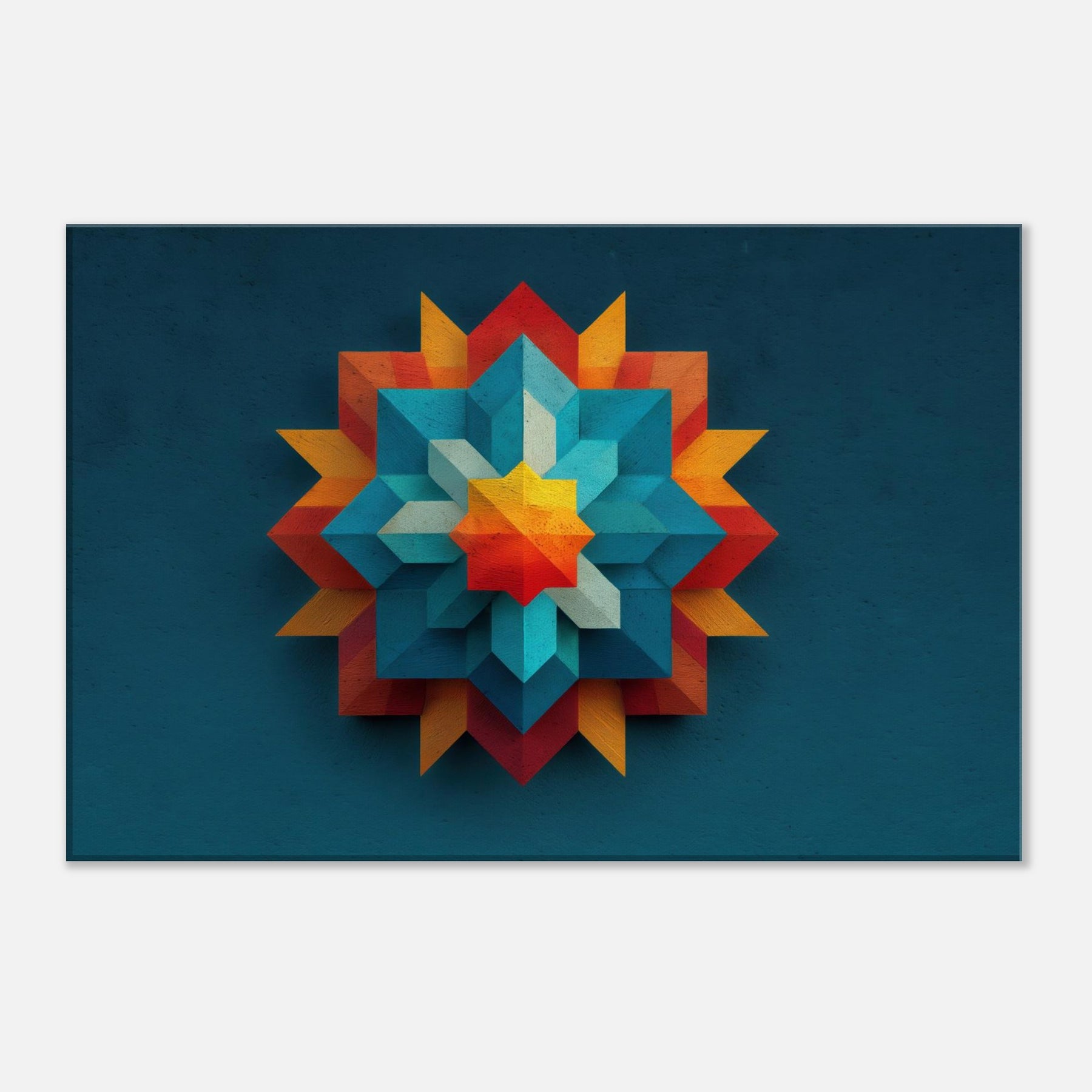 Star of David takes a luminous new shape in this abstract study an intricate lattice of converging facets that feels both ancient and contemporary. The palette dances in teal, turquoise, coral, and gold, catching light and shifting mood as the day moves. Hung in a bright living room or a quiet study, it invites a breath of stillness, turning walls into a softly glowing horizon and infusing the space with wonder, warmth, and a sense of spacious, contemplative calm. The central subject is Star of David (Minimal Line).