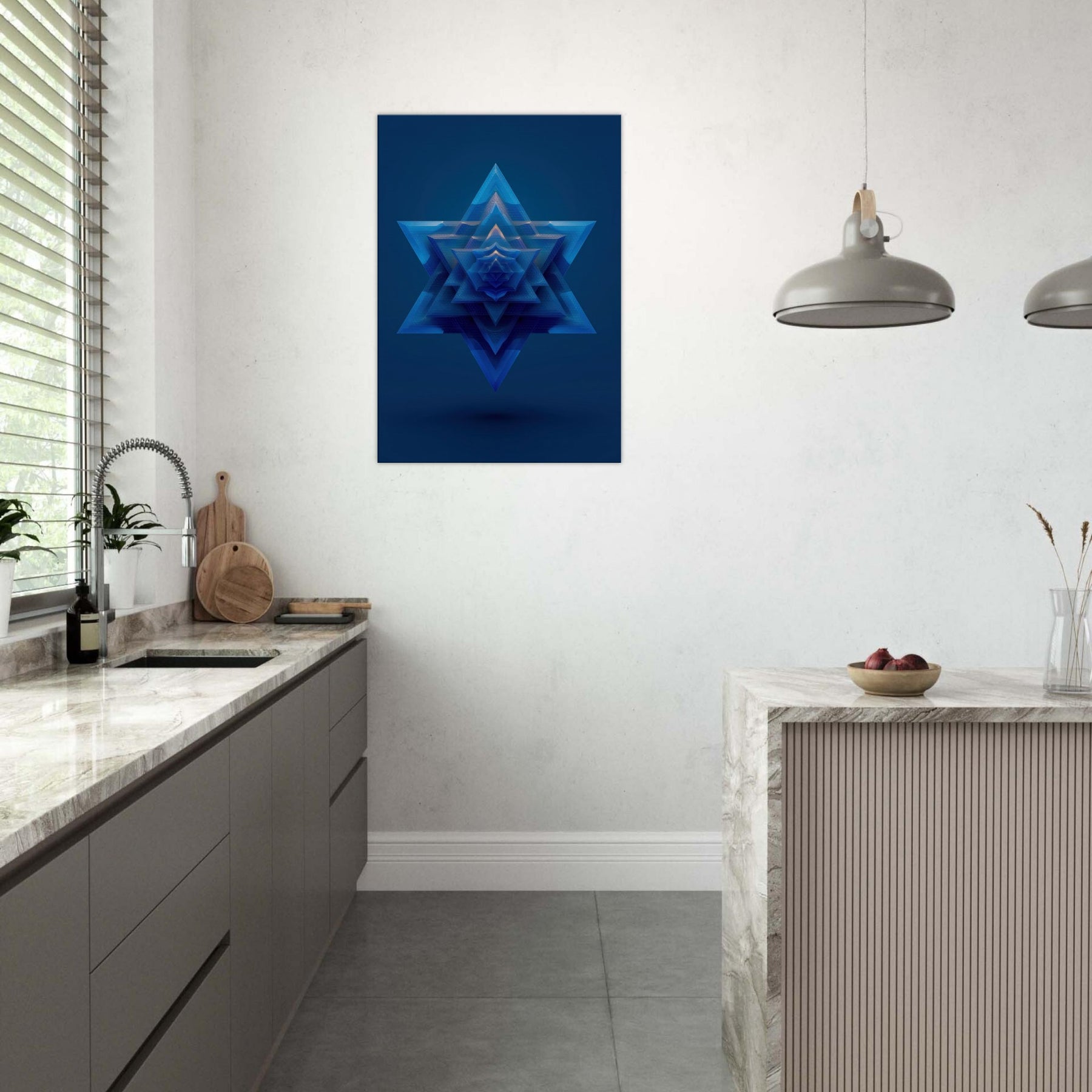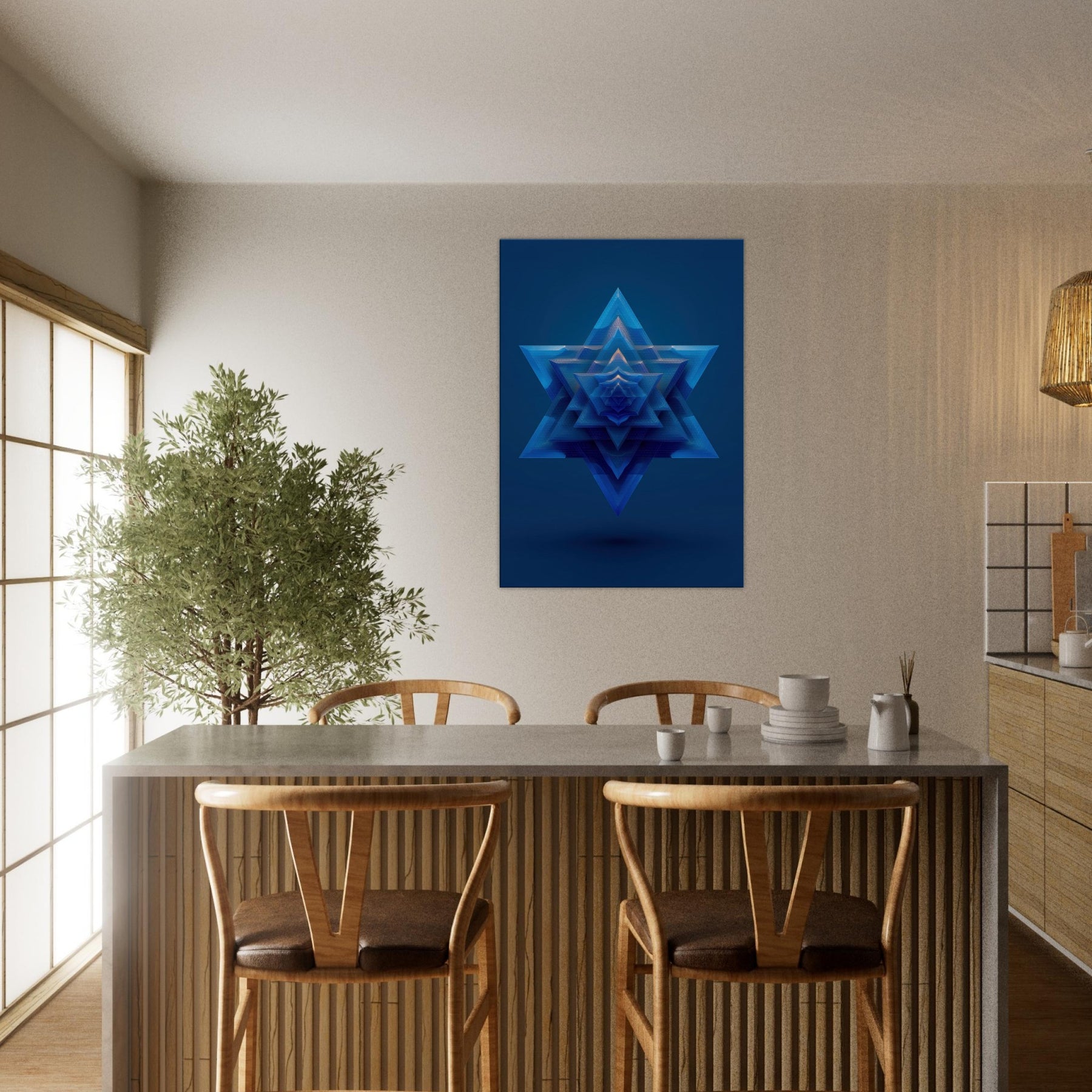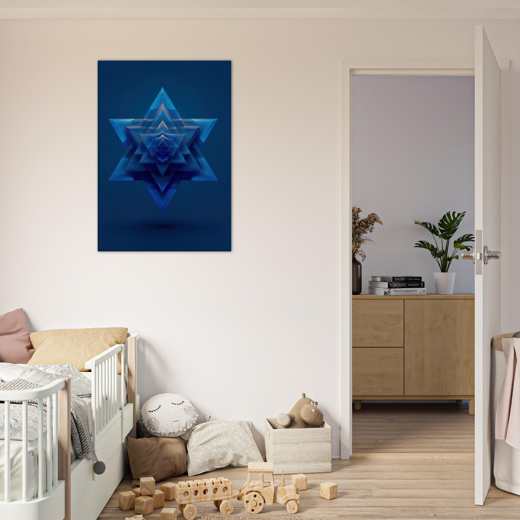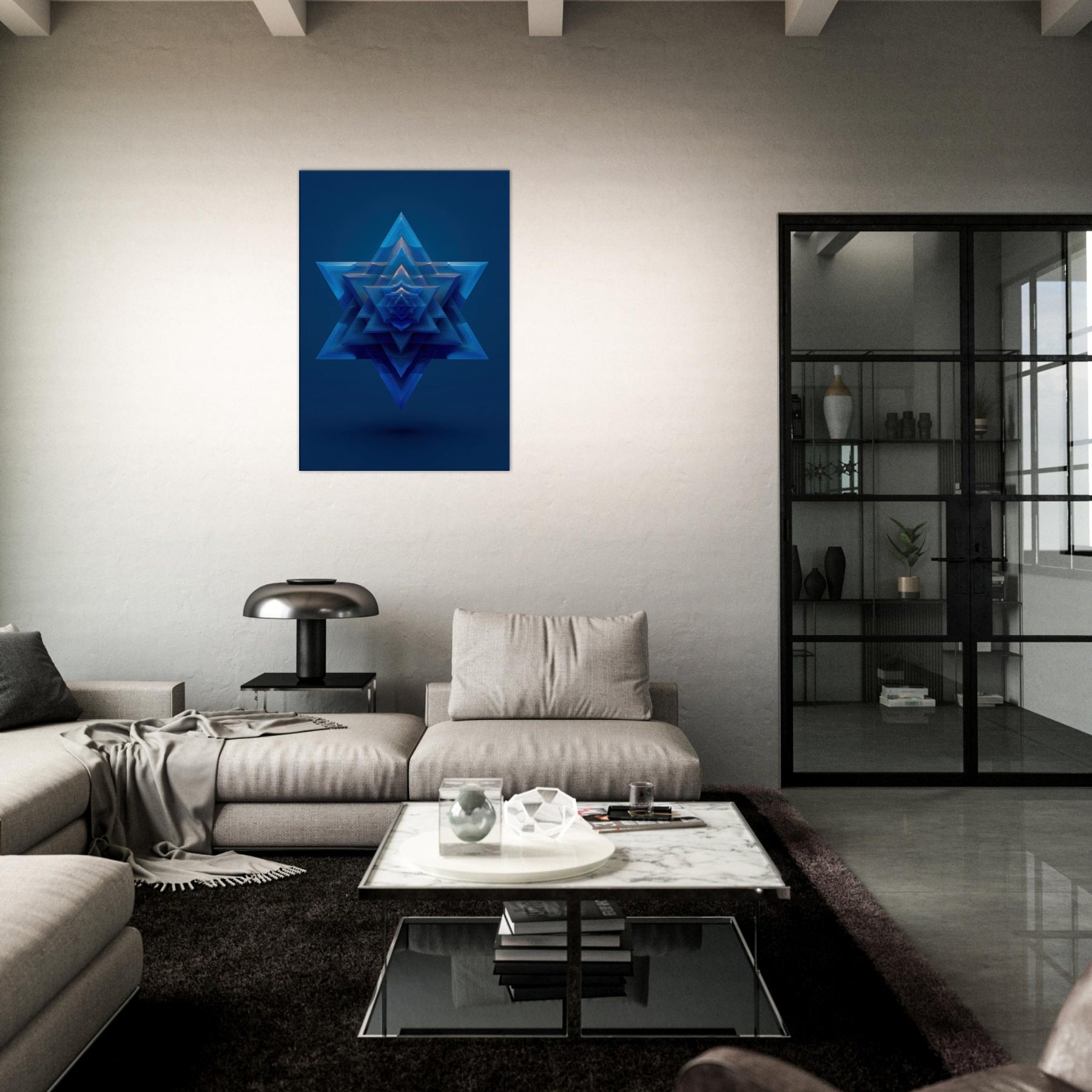 Rendered as a minimal line study, the Star of David unfolds into a luminous geometry that seems to hover between breath and light. Rich blues and subtle gradients create a meditative atmosphere, inviting quiet reflection and a sense of spaciousness. The abstract layers resemble folded prayers, casting soft shadows that deepen a living space with texture and calm. Ideal for a corner or entry, it brings mysticism, balance, and refined modernity to any wall. The central subject is Star of David (Minimal Line).