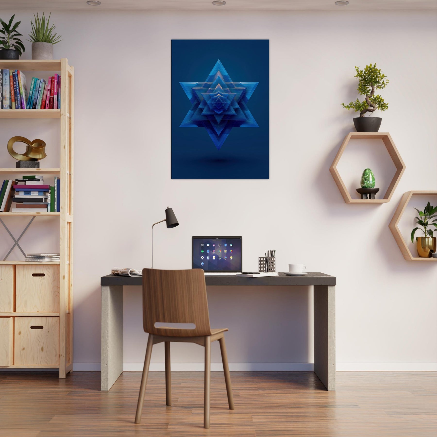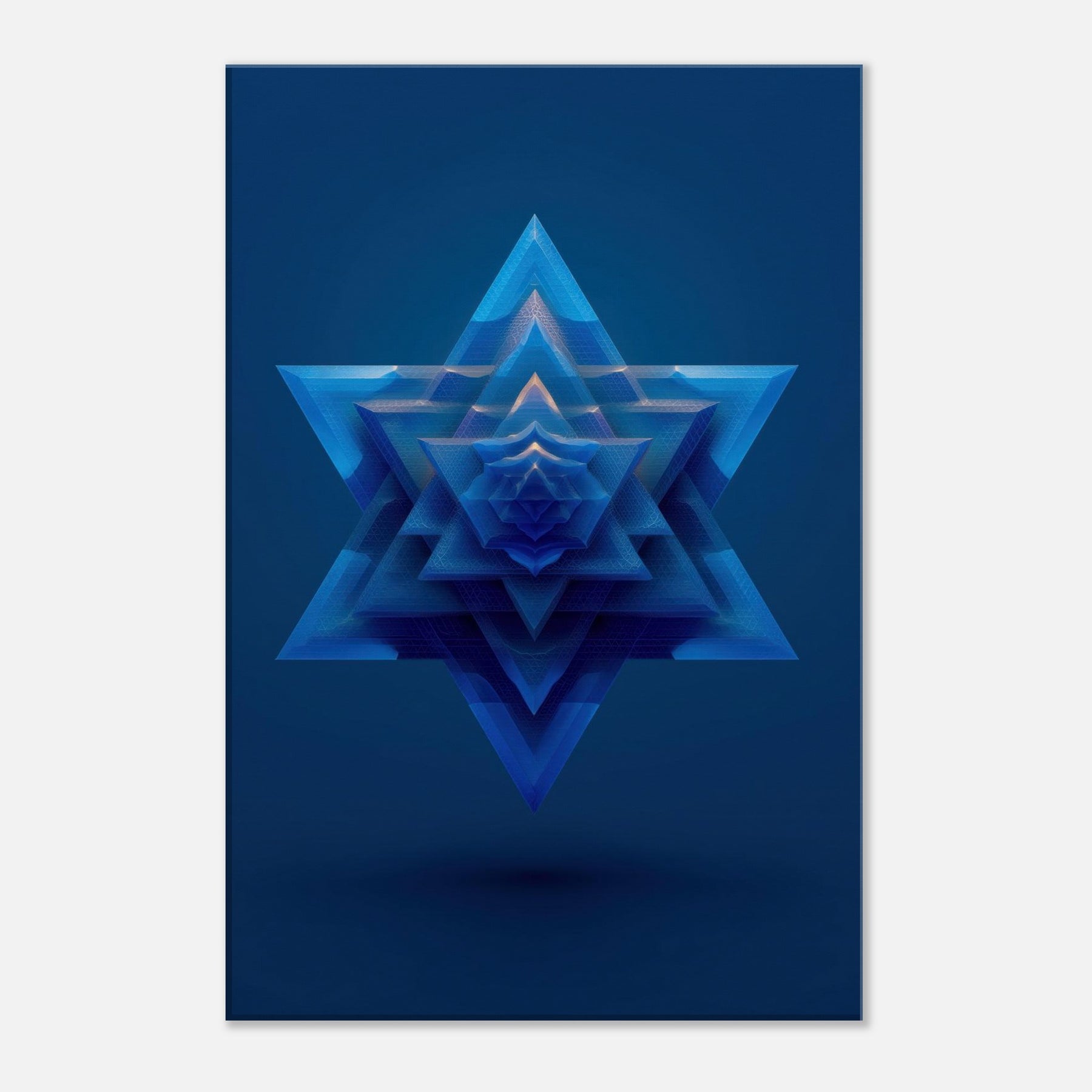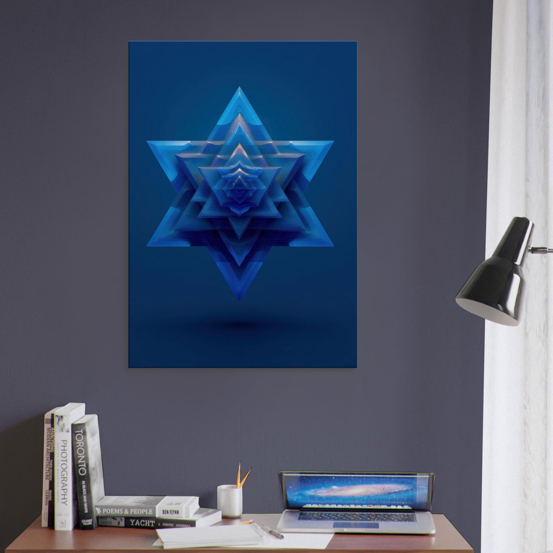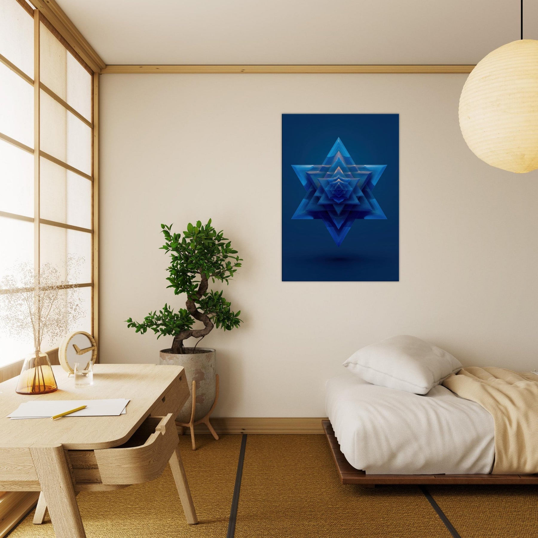 Rendered as a minimal line study, the Star of David unfolds into a luminous geometry that seems to hover between breath and light. Rich blues and subtle gradients create a meditative atmosphere, inviting quiet reflection and a sense of spaciousness. The abstract layers resemble folded prayers, casting soft shadows that deepen a living space with texture and calm. Ideal for a corner or entry, it brings mysticism, balance, and refined modernity to any wall. The central subject is Star of David (Minimal Line).