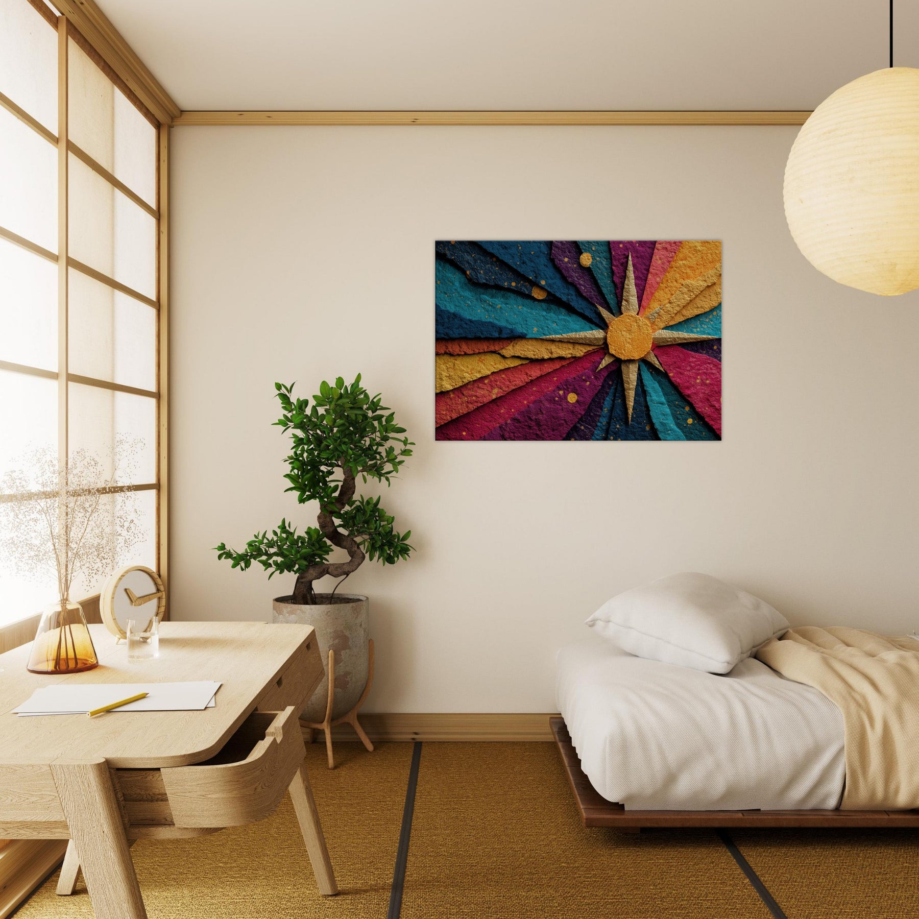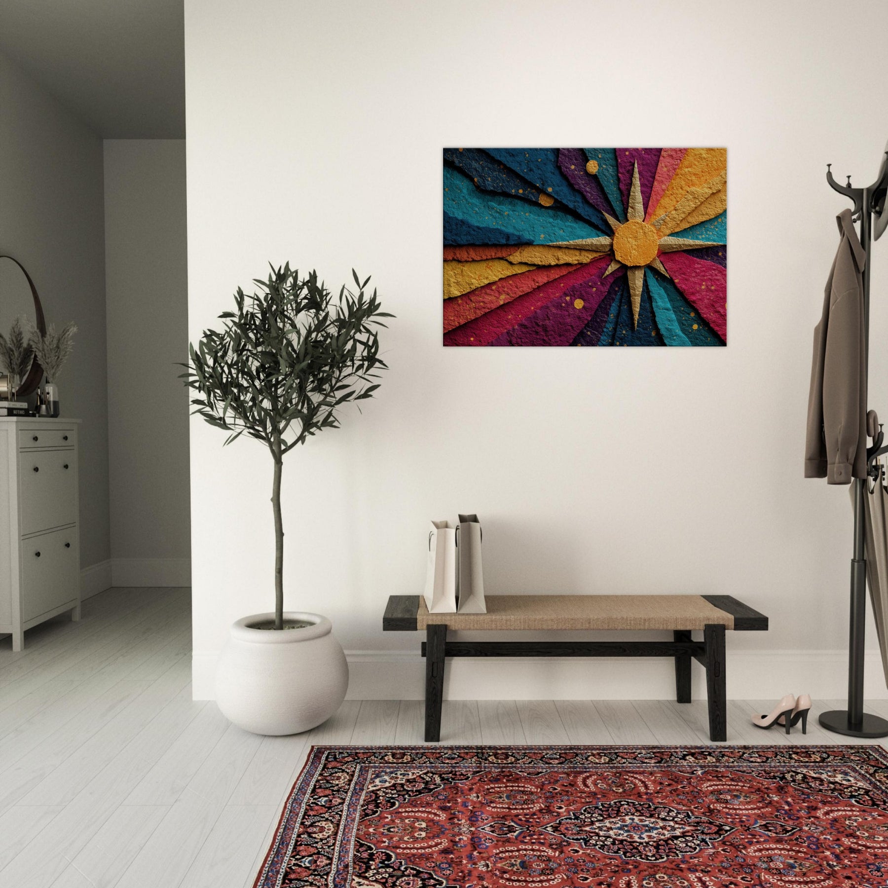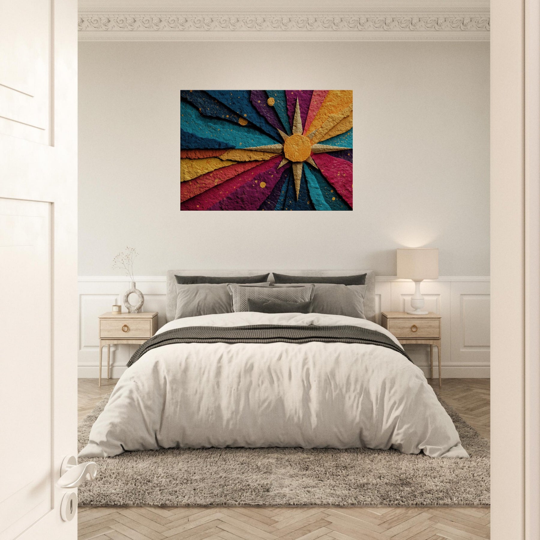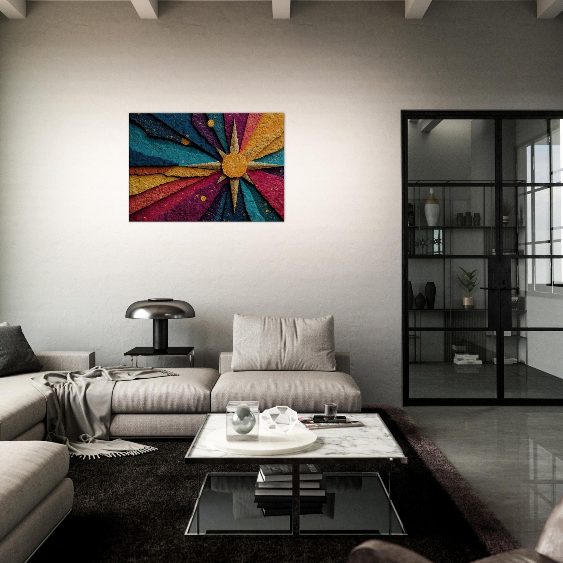 In this abstract meditation, Constellations drift across a velvet horizon of color, radiant fragments weaving a nocturnal tapestry. The artwork hums with galaxy bright hues lapis, amber, magenta and a sun like center that anchors the motion. It invites quiet awe, turning a living room into a contemplative observatory. Light shifts with every angle, revealing depth and memory. Displayed in a softly lit corner, it nourishes conversation, mood, and a mystical sense of belonging to the universe.