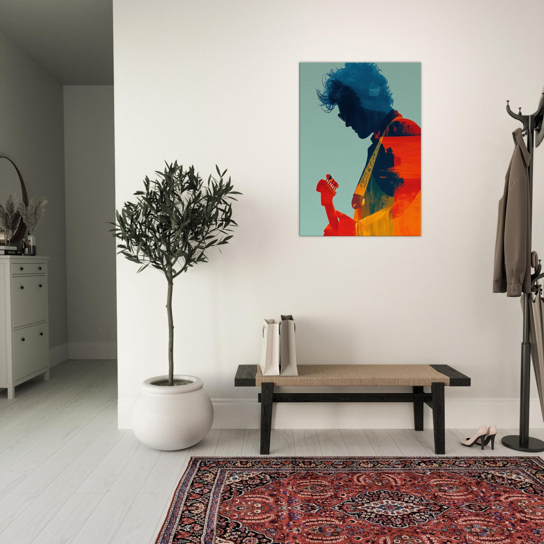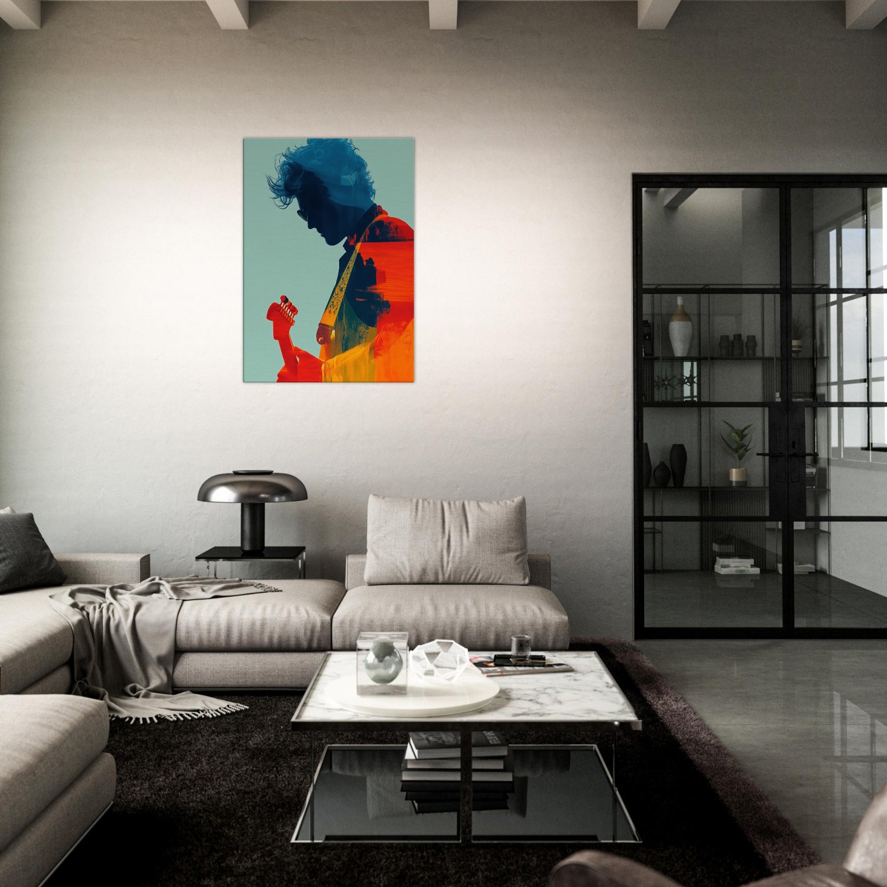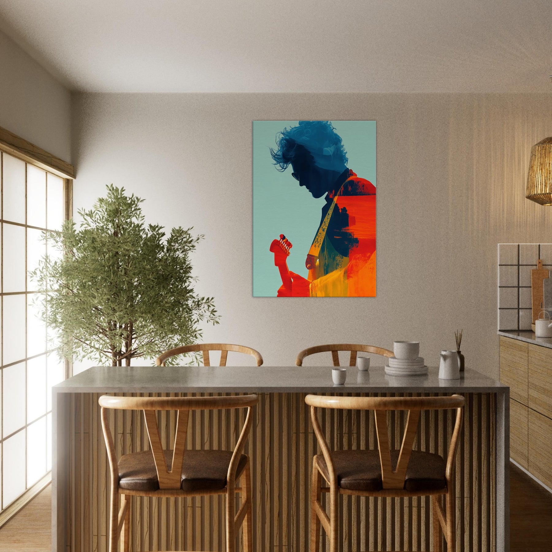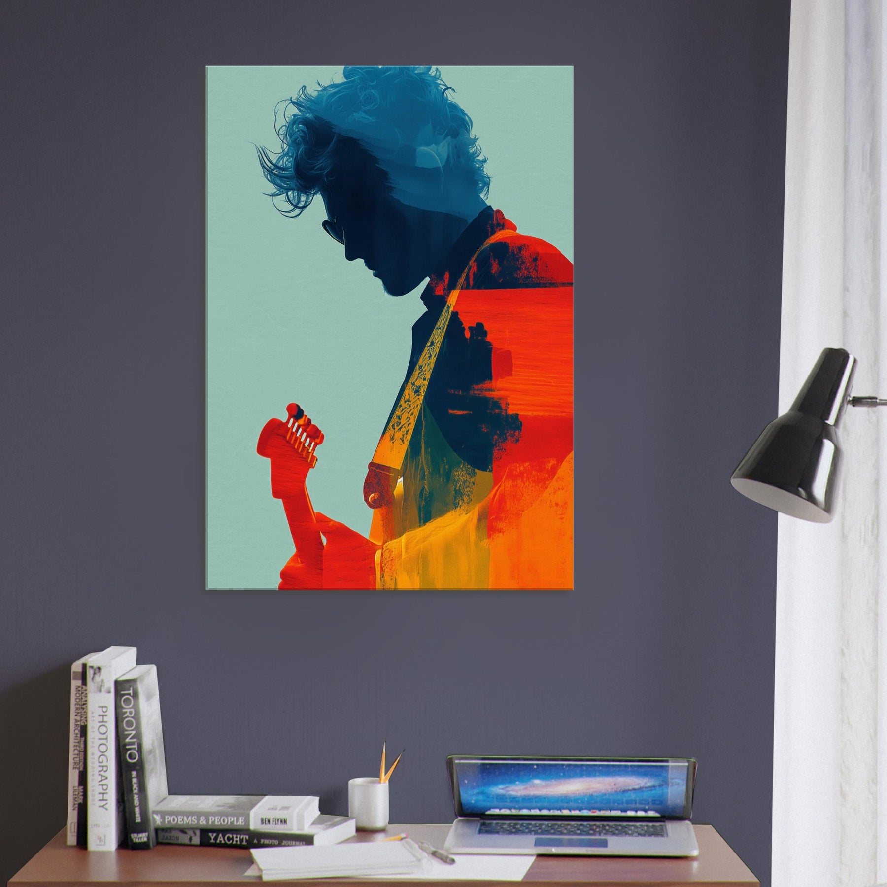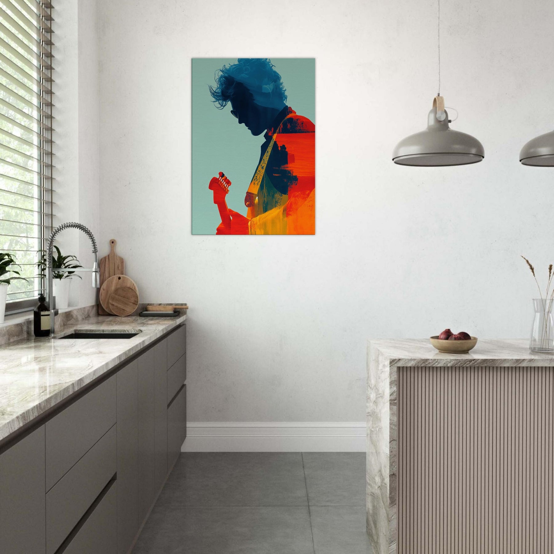 Immerse your space in the moody glow of a guitarist, where abstract forms braid his silhouette with vibrant color. This piece breathes with rhythm blue shadows, fiery reds, and sunlit yellows collide to evoke late night gigs and quiet introspection. The layered, translucent figures invite a gaze that shifts with the light, making the room feel alive and intimate. Ideal for a living area or studio, it thickens the atmosphere with memory, motion, and the electric pulse of performance.