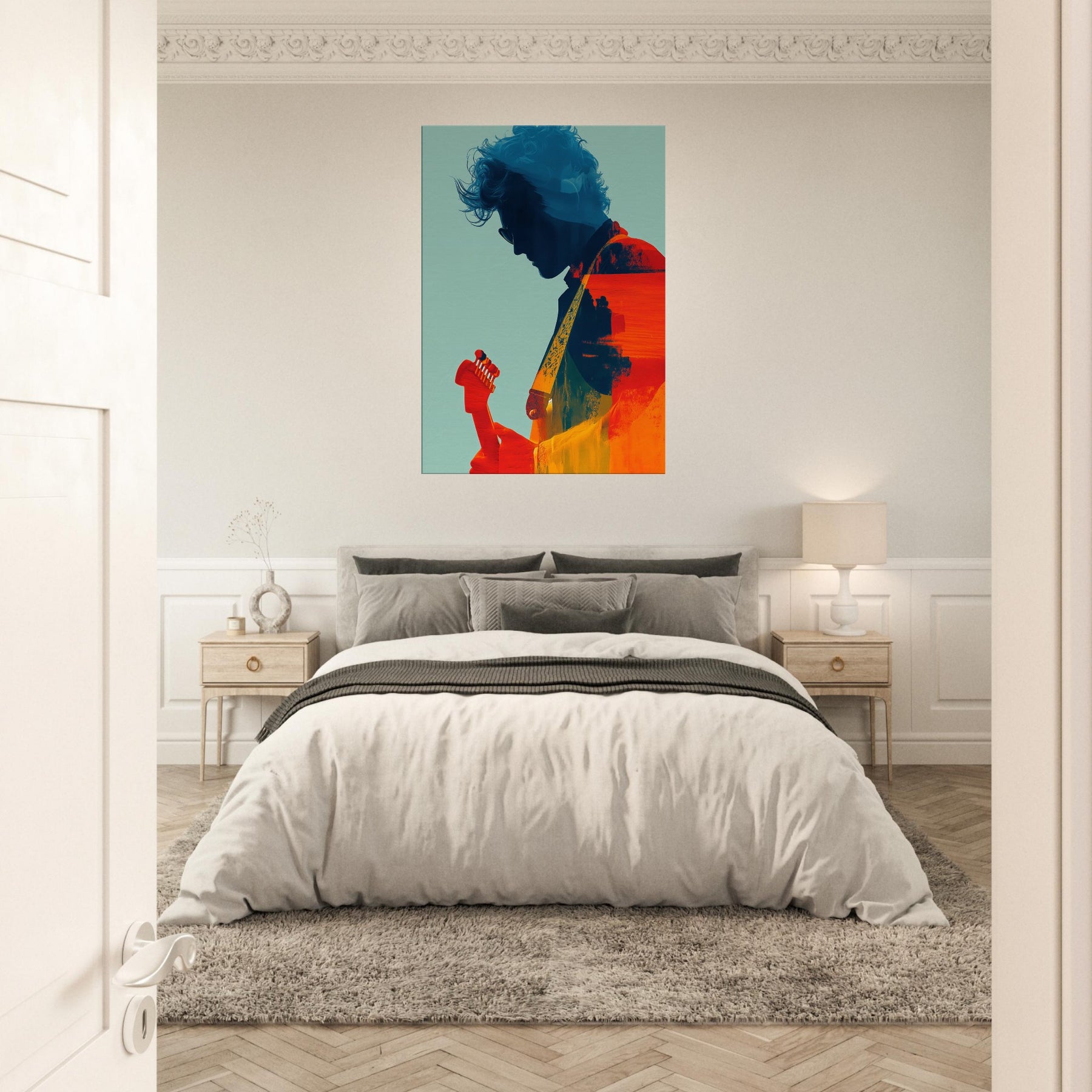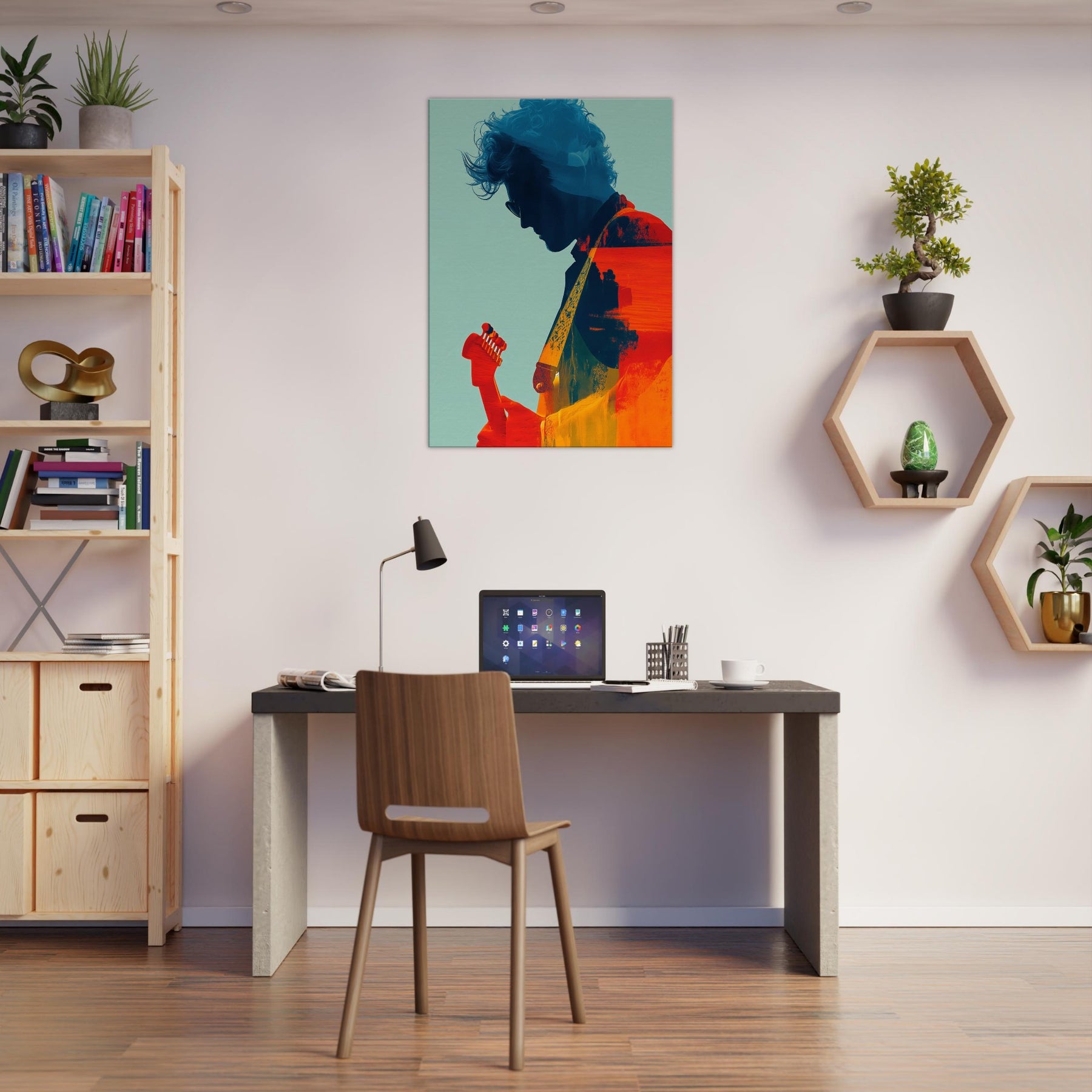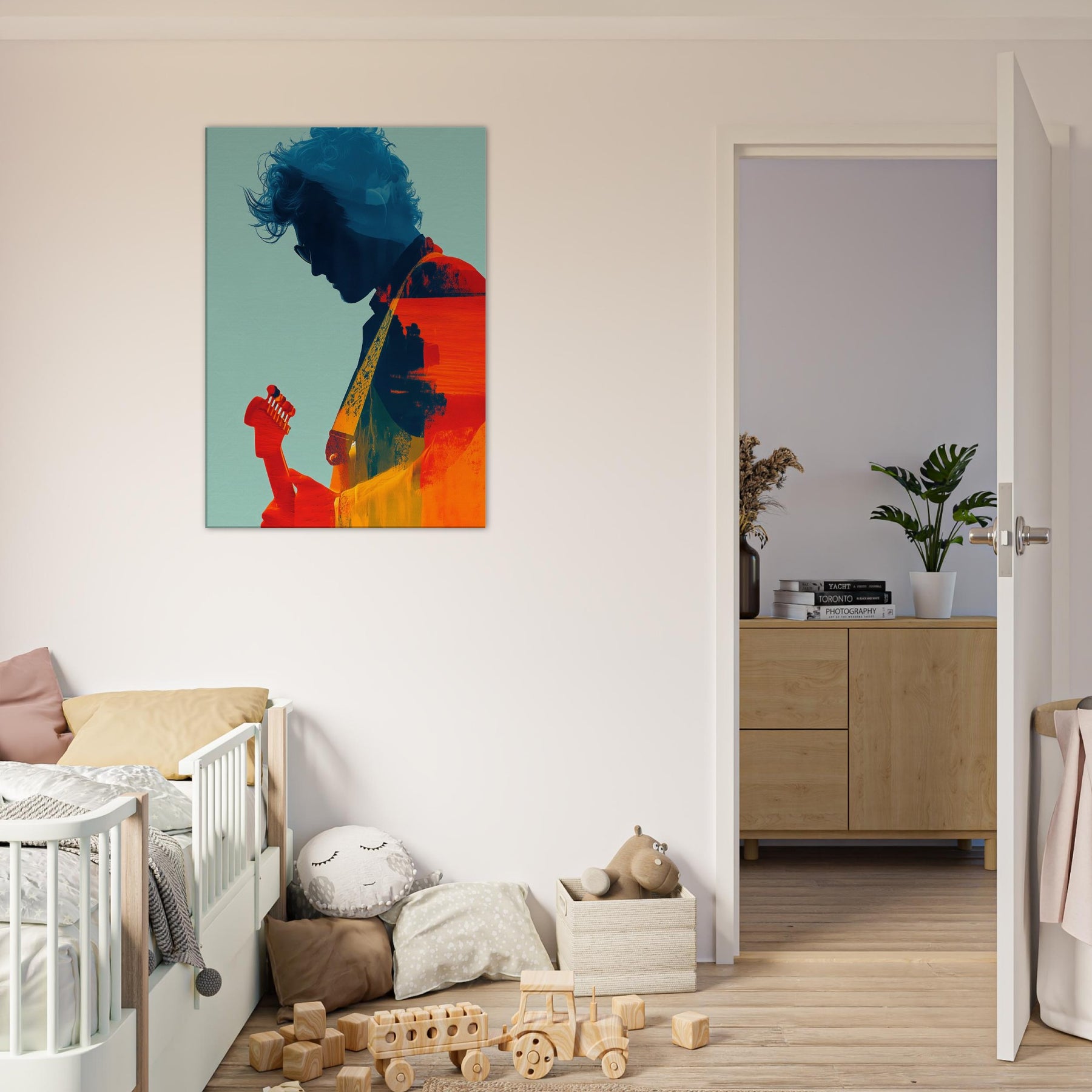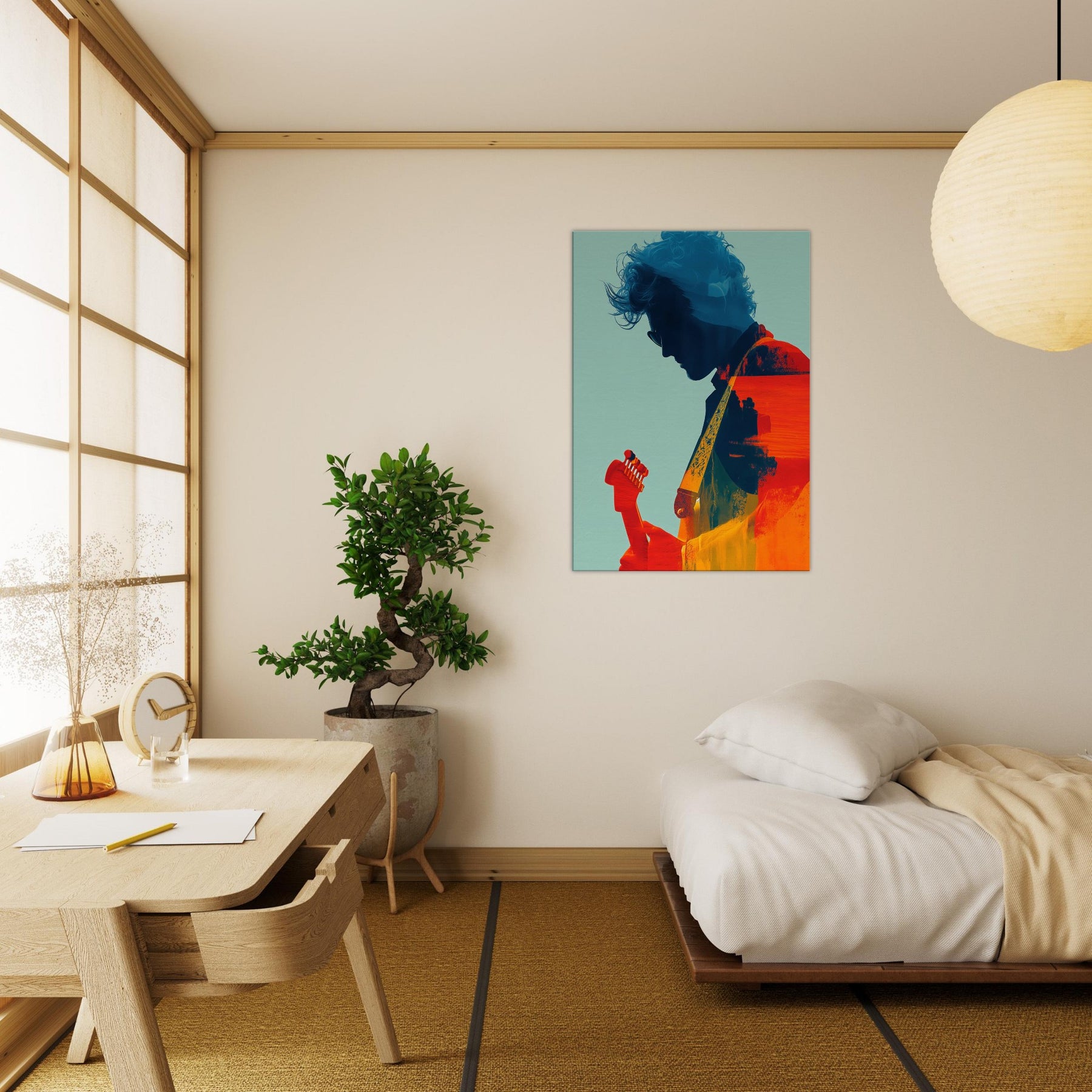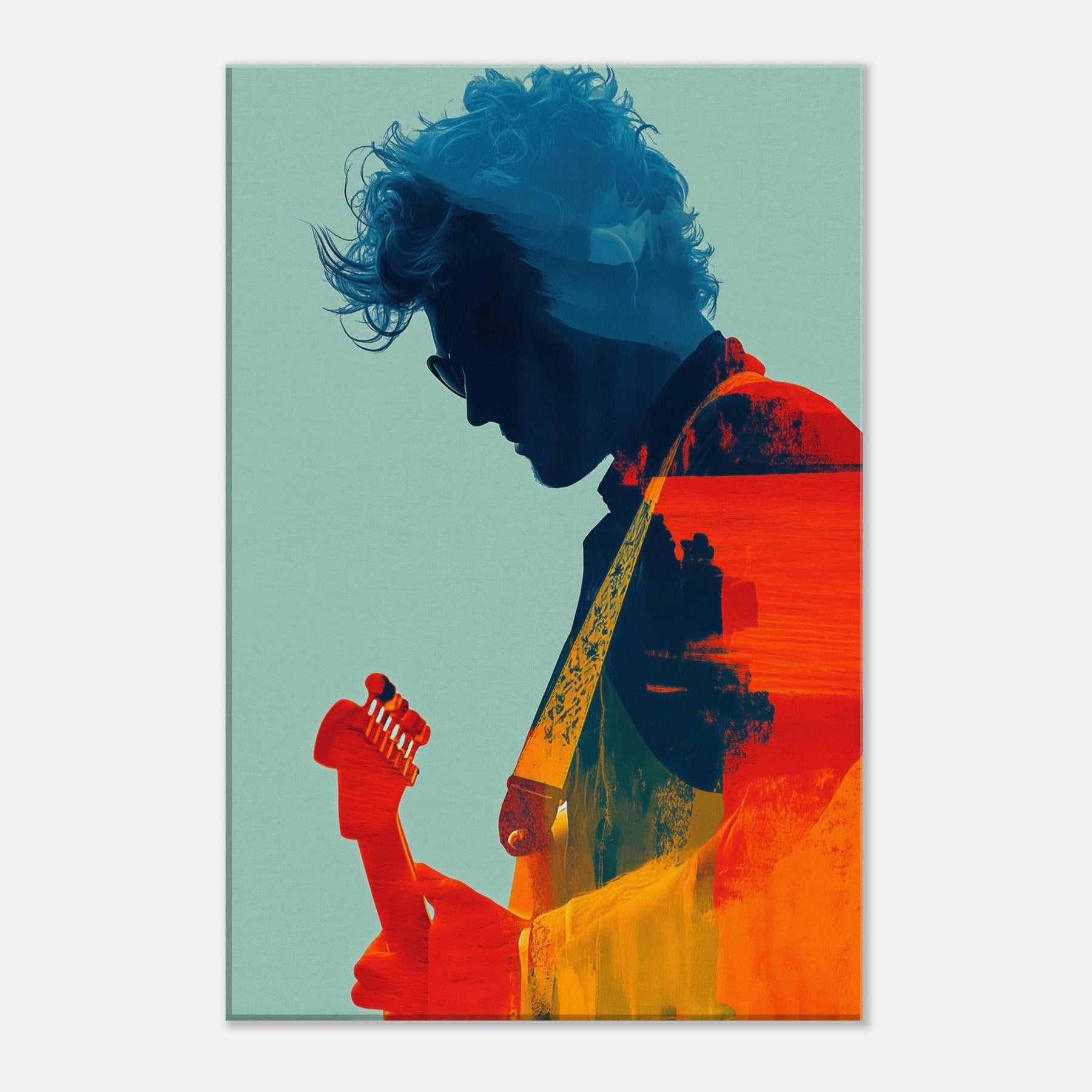 Immerse your space in the moody glow of a guitarist, where abstract forms braid his silhouette with vibrant color. This piece breathes with rhythm blue shadows, fiery reds, and sunlit yellows collide to evoke late night gigs and quiet introspection. The layered, translucent figures invite a gaze that shifts with the light, making the room feel alive and intimate. Ideal for a living area or studio, it thickens the atmosphere with memory, motion, and the electric pulse of performance.
