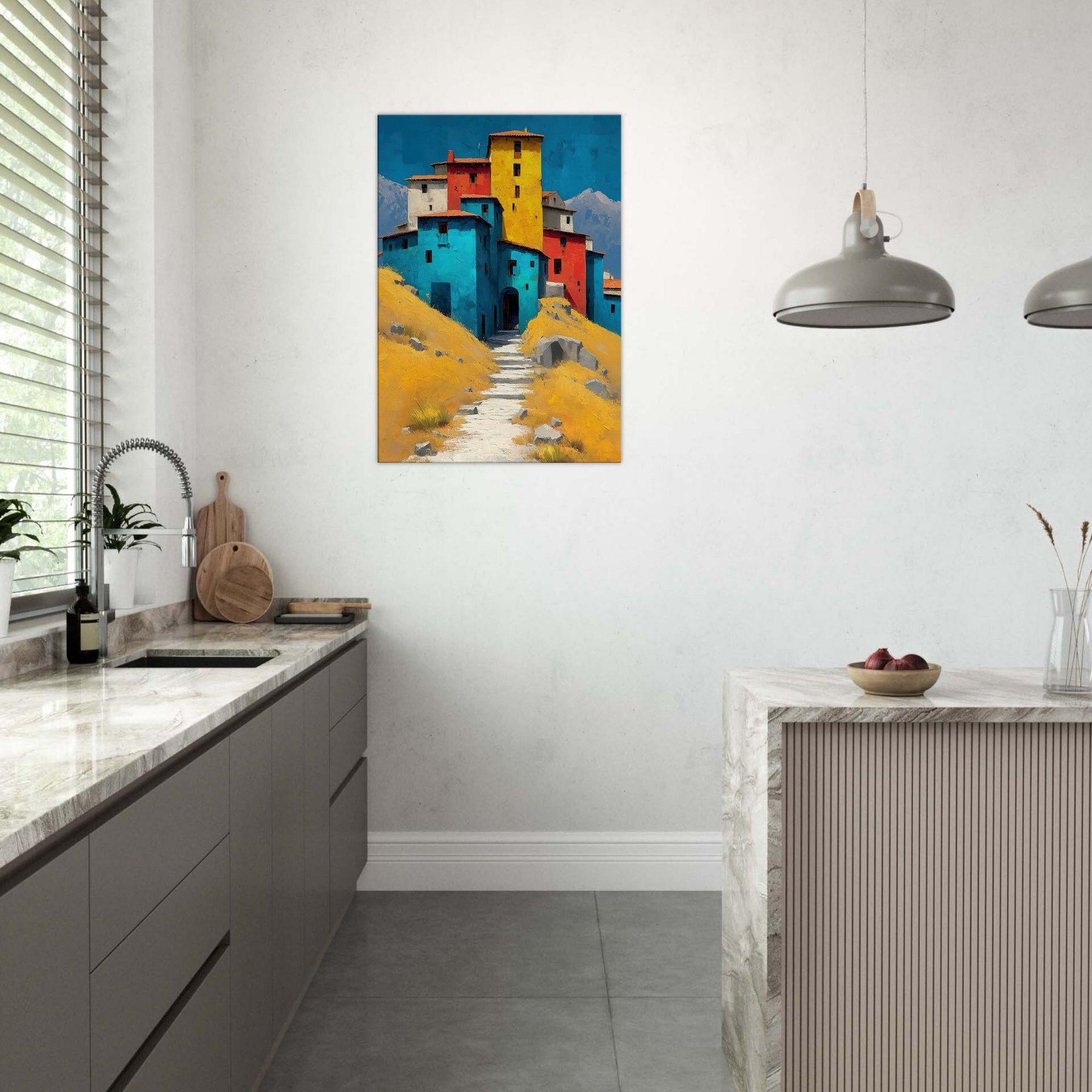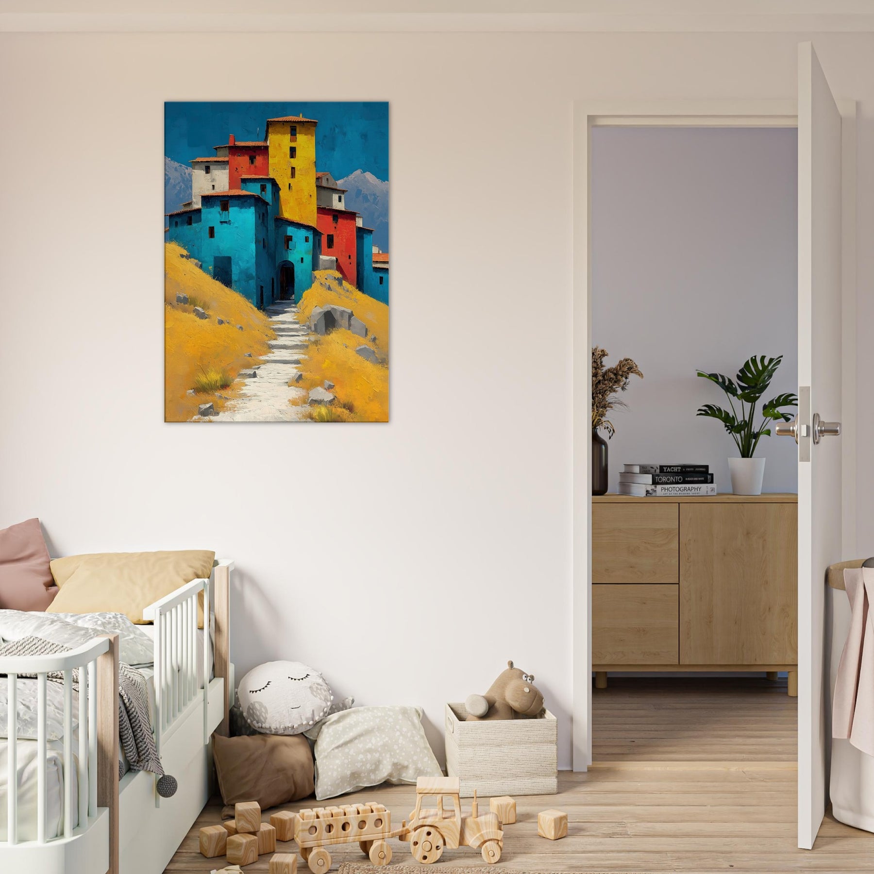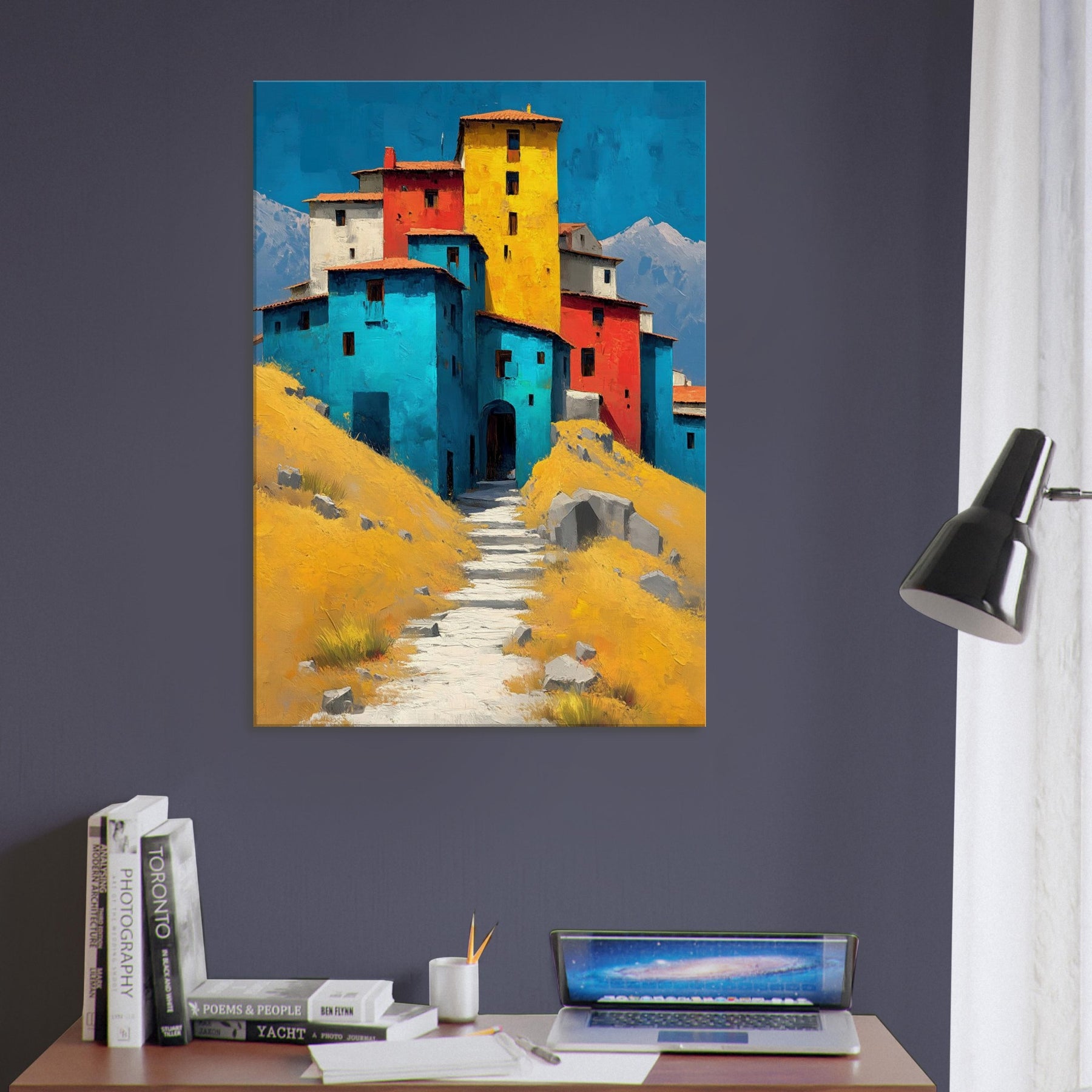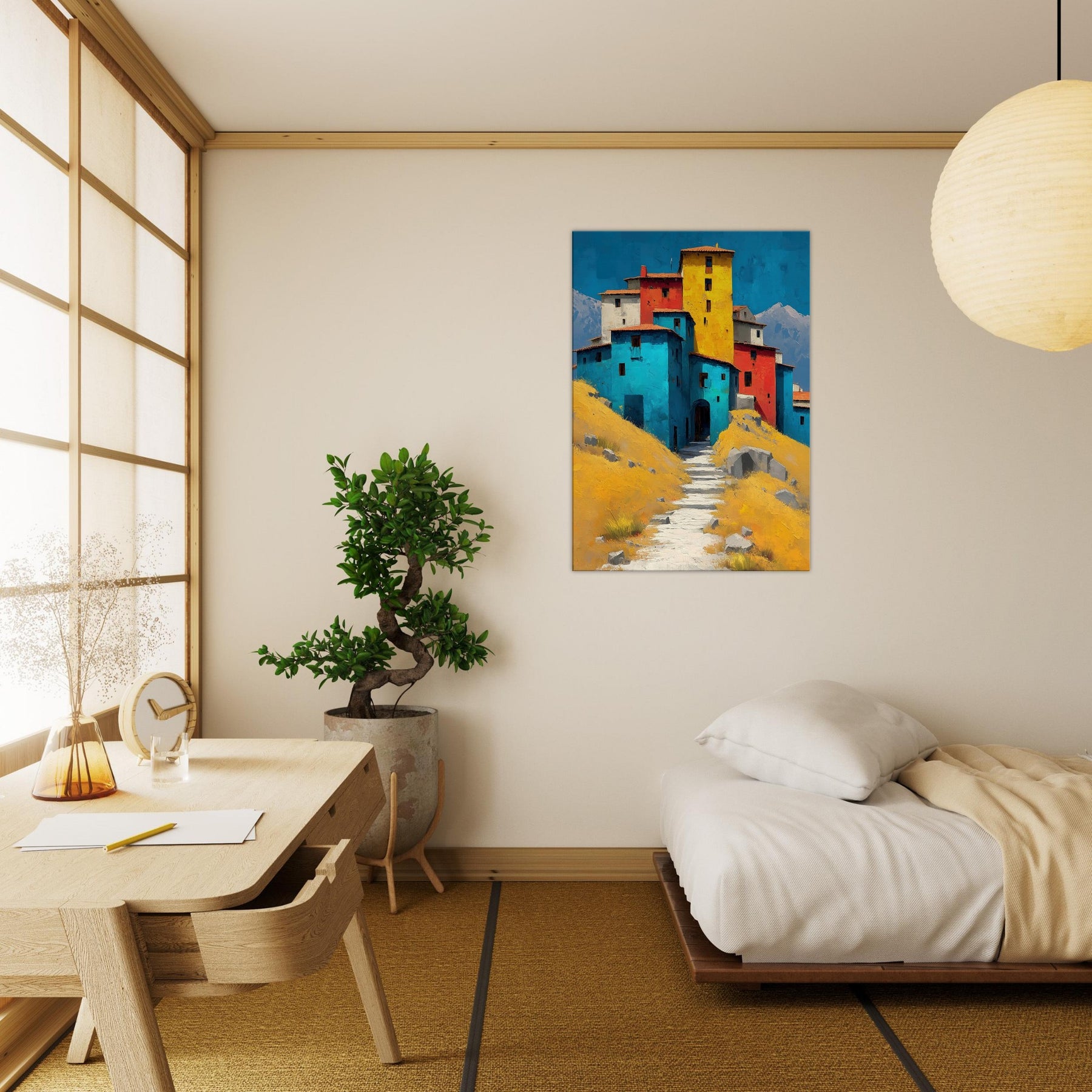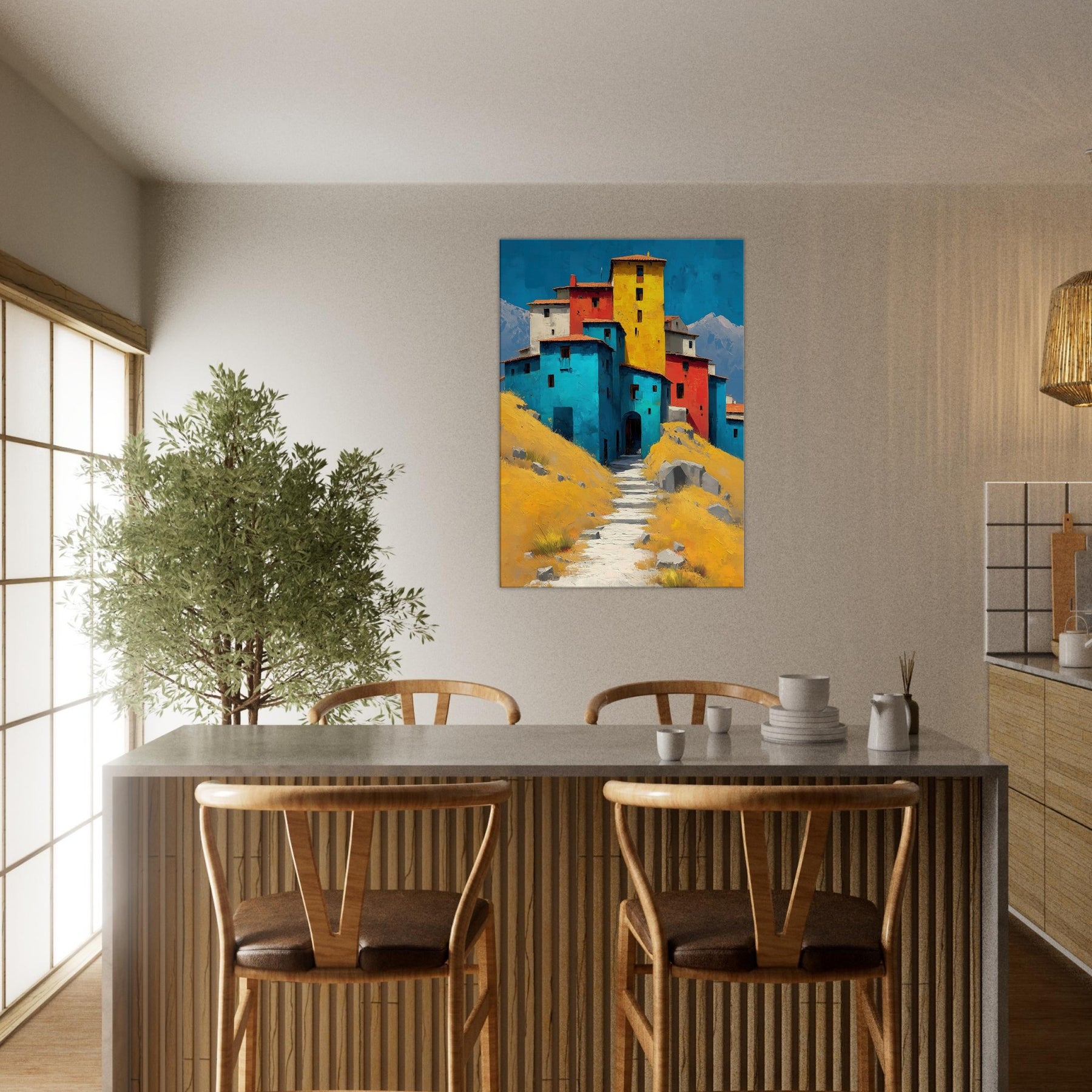 Where color climbs the hillside, this Mountain Village scene invites warmth, wonder, and a playful rhythm into your room. The bold towers in cobalt, turquoise, crimson, and sunlit yellow rise against a crisp blue sky, catching light from every corner and turning walls into a quiet, cinematic . This abstract interpretation of a hillside town adds texture and movement, turning ordinary days into moments of escape. Hang it to anchor conversation and soften living spaces with luminous, uplifting energy.