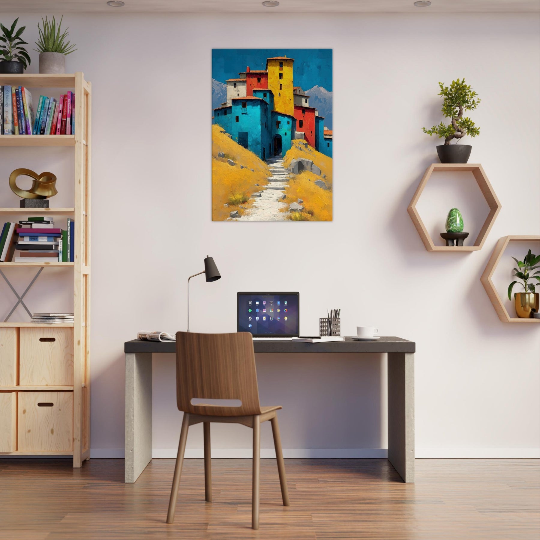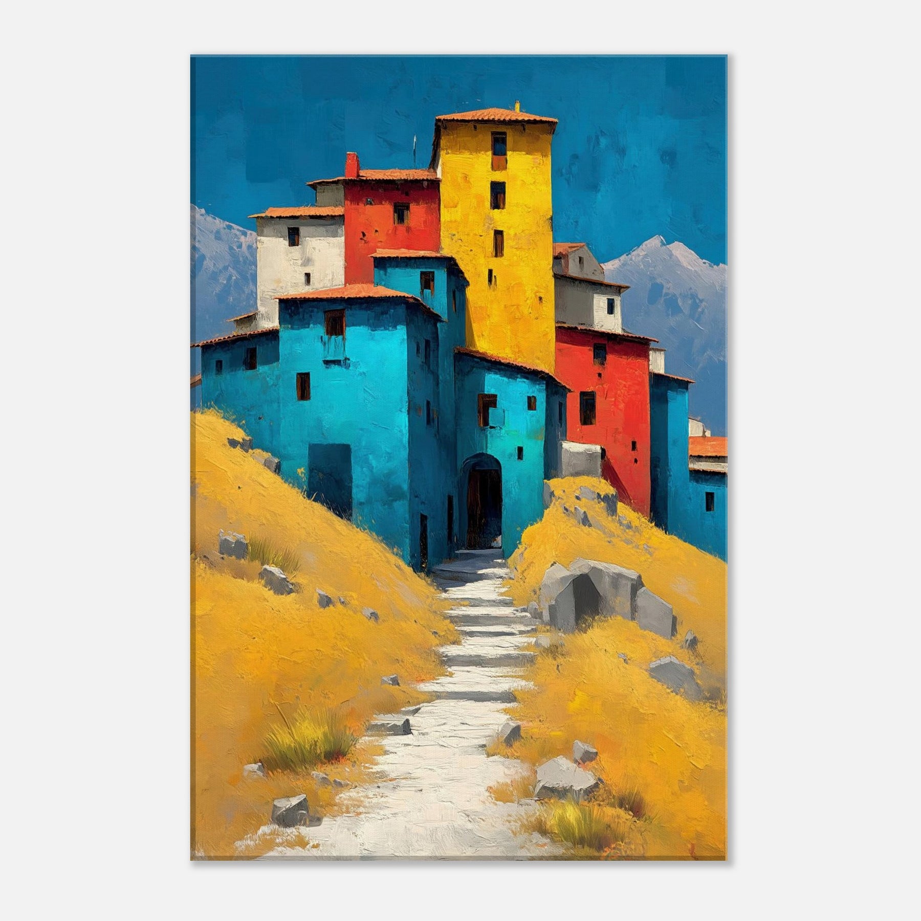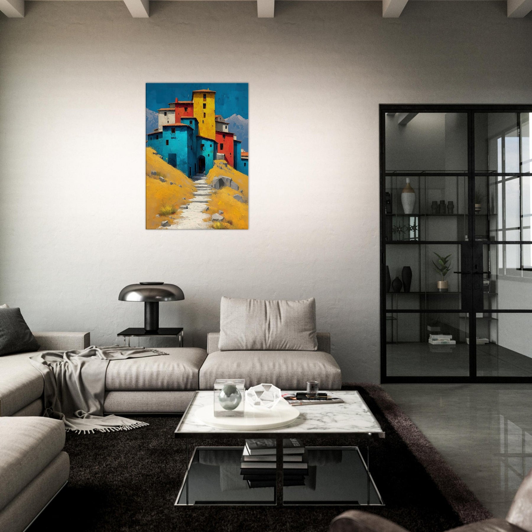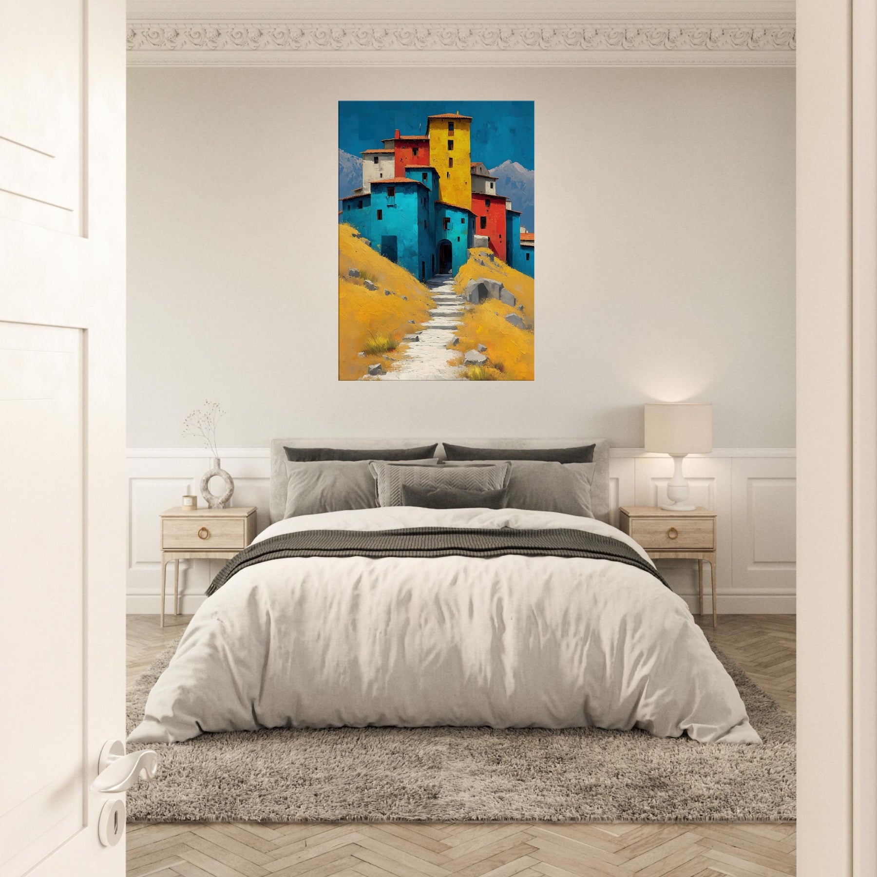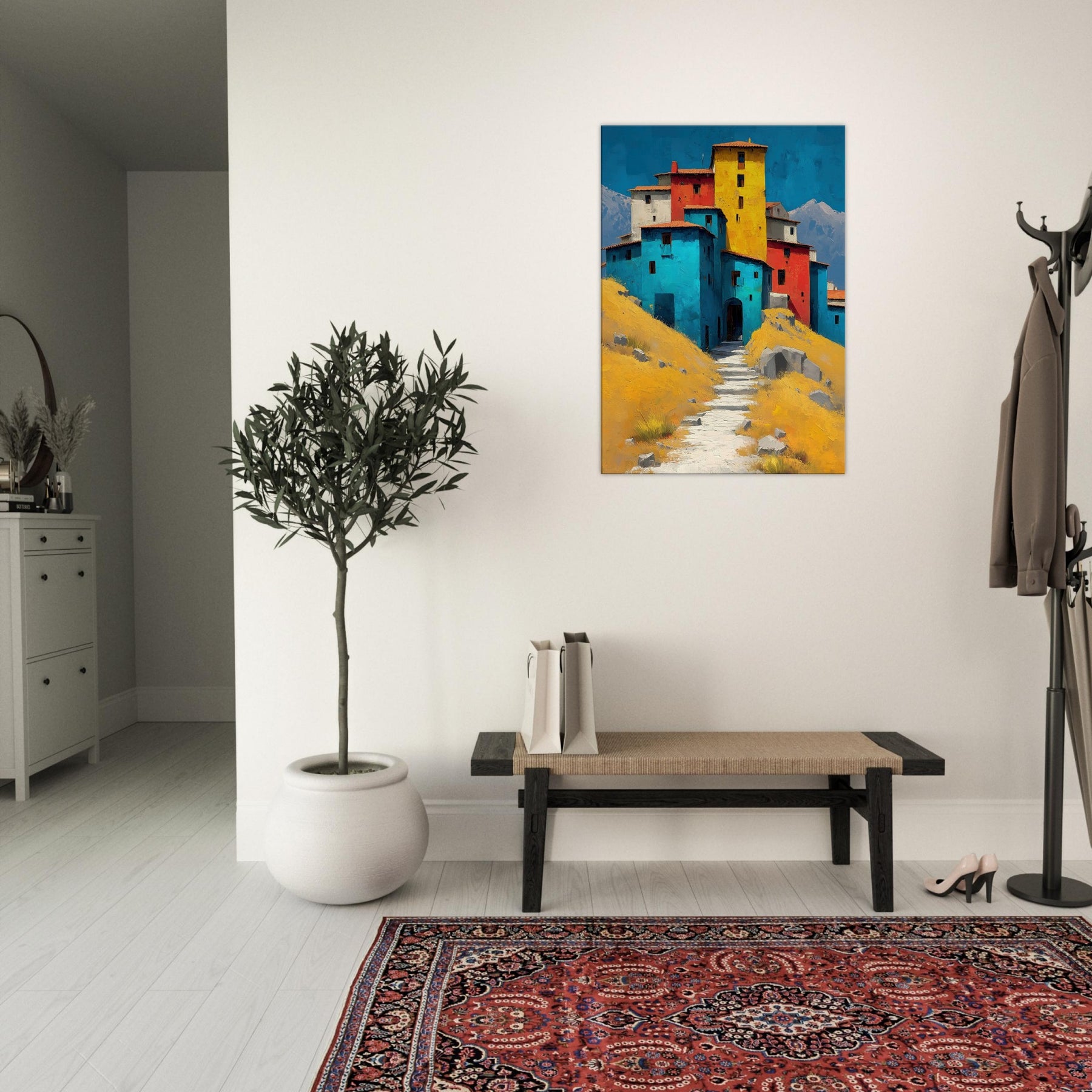 Where color climbs the hillside, this Mountain Village scene invites warmth, wonder, and a playful rhythm into your room. The bold towers in cobalt, turquoise, crimson, and sunlit yellow rise against a crisp blue sky, catching light from every corner and turning walls into a quiet, cinematic . This abstract interpretation of a hillside town adds texture and movement, turning ordinary days into moments of escape. Hang it to anchor conversation and soften living spaces with luminous, uplifting energy.