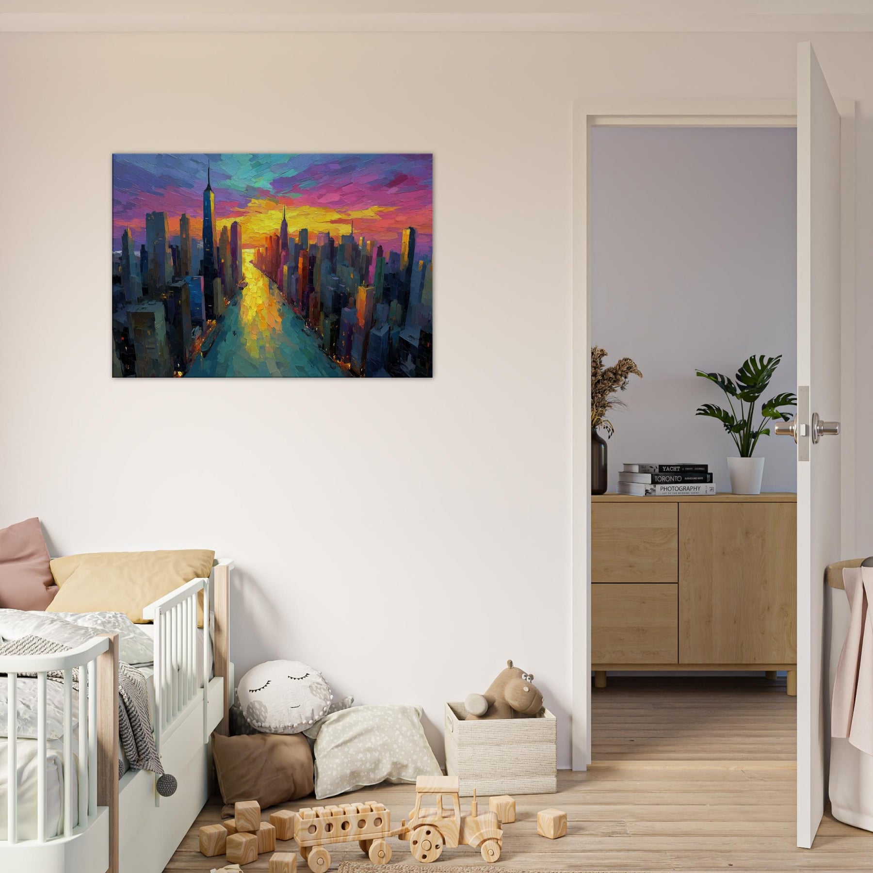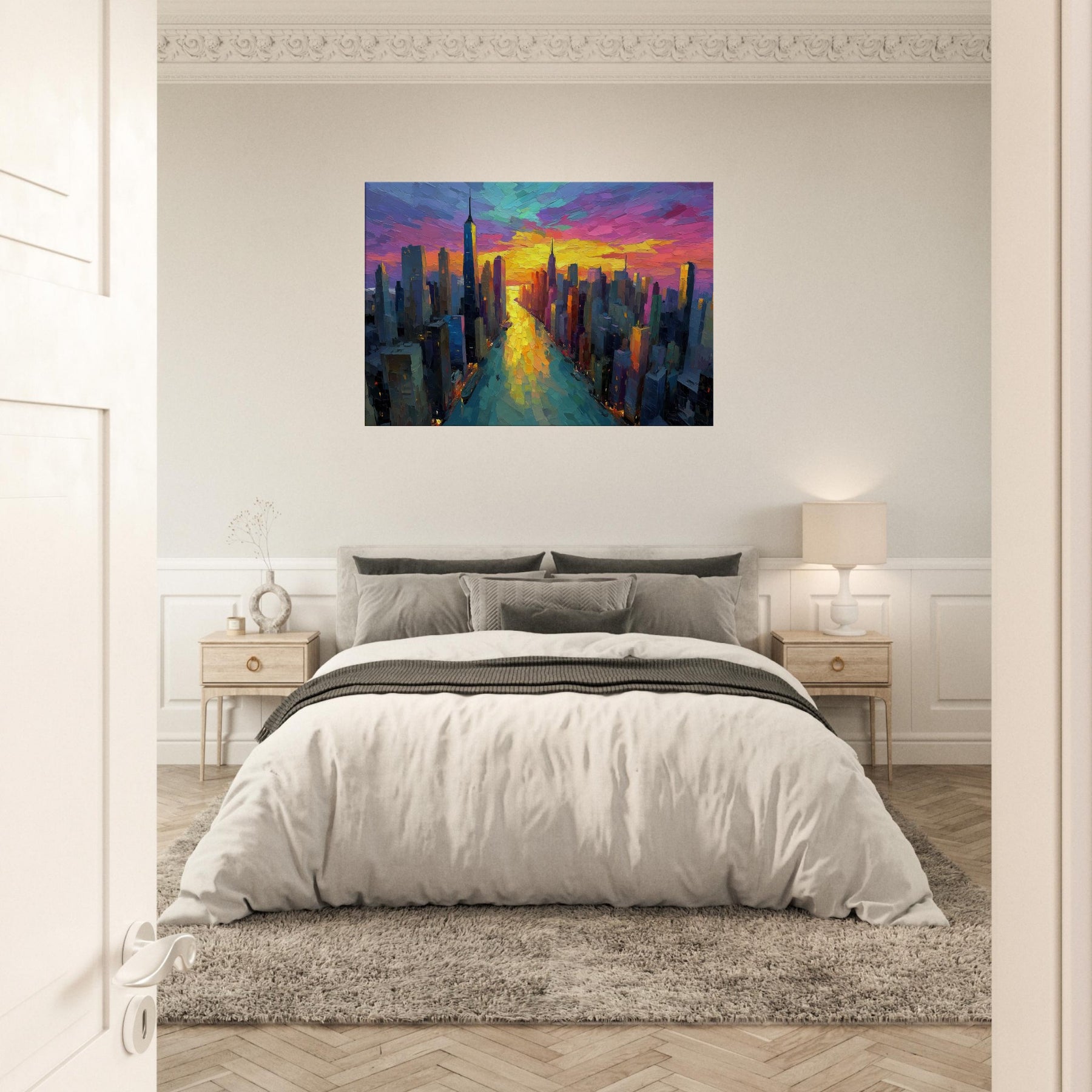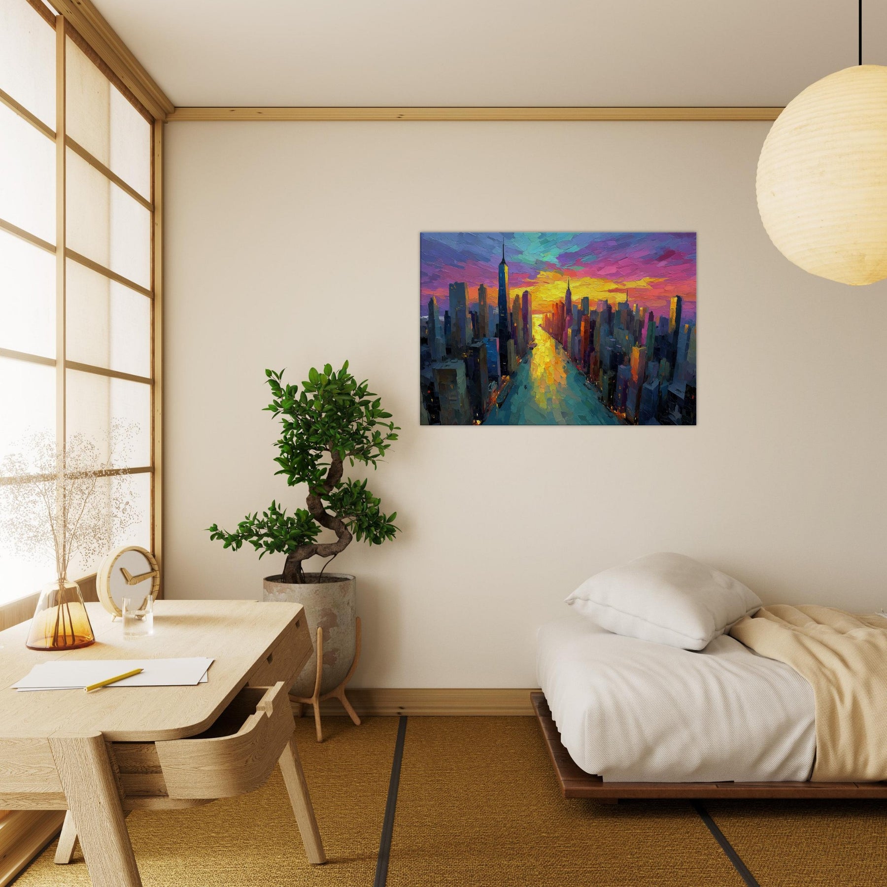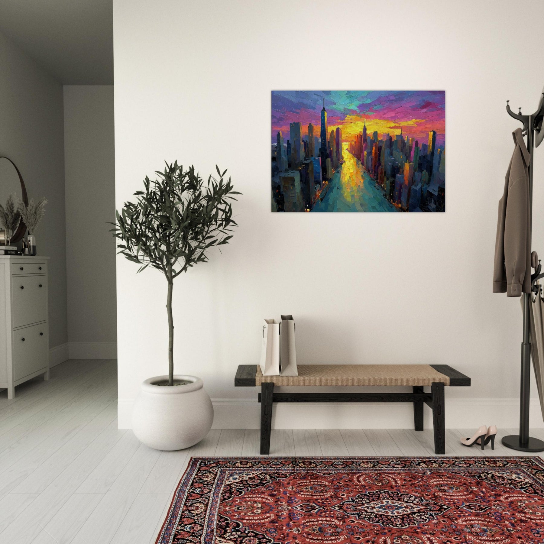 New York surges into your room as if seen from a quiet ferry at dusk: a tapestry of blocky towers, a river of light, and a sky that shifts from cobalt to molten gold. This abstract cityscape breathes with movement, inviting you to pause and feel the pulse of the metropolis. The piece channels memory of neon nights, steel and glass, and the hush after rush hour, turning a living space into a gallery of possibility and urban poetry.