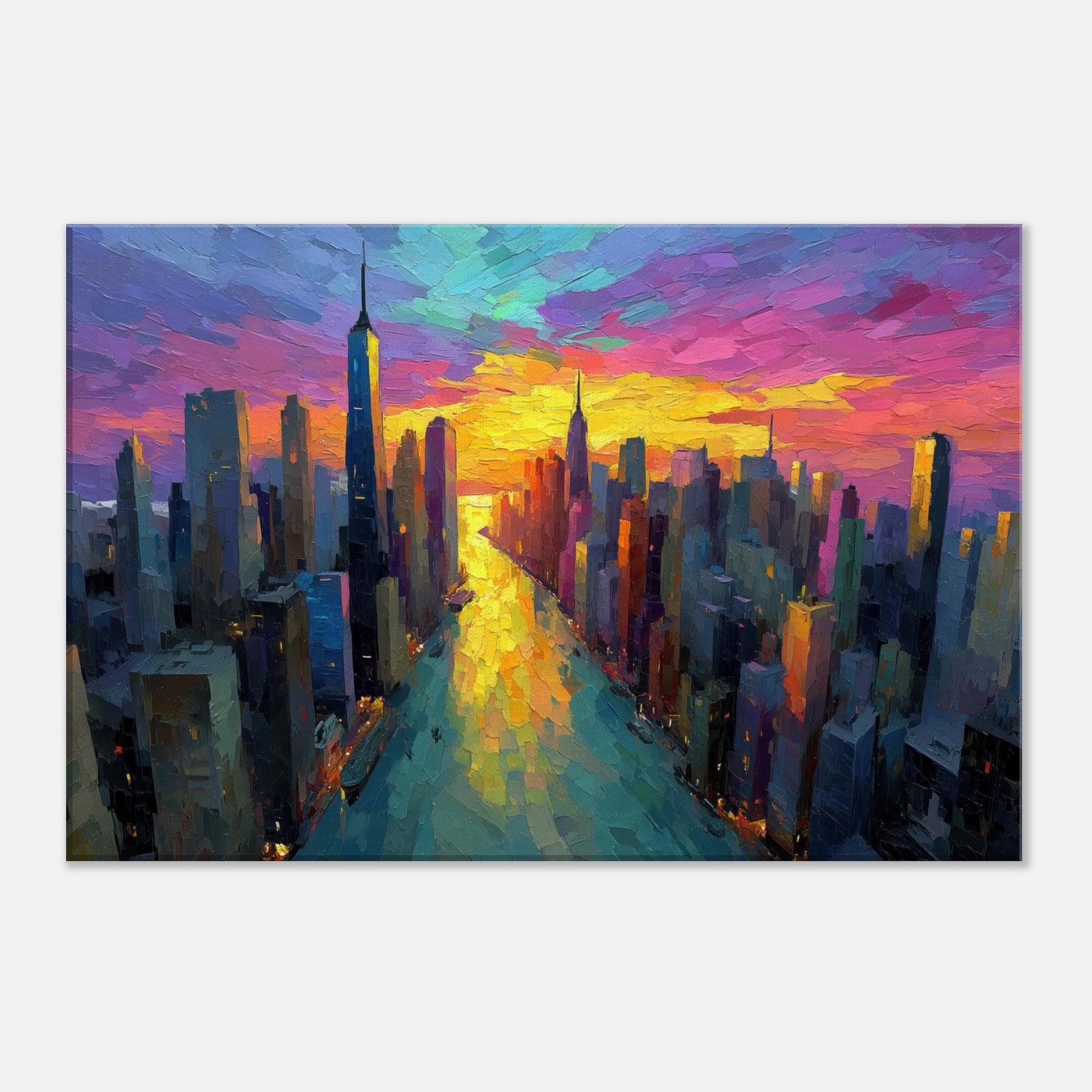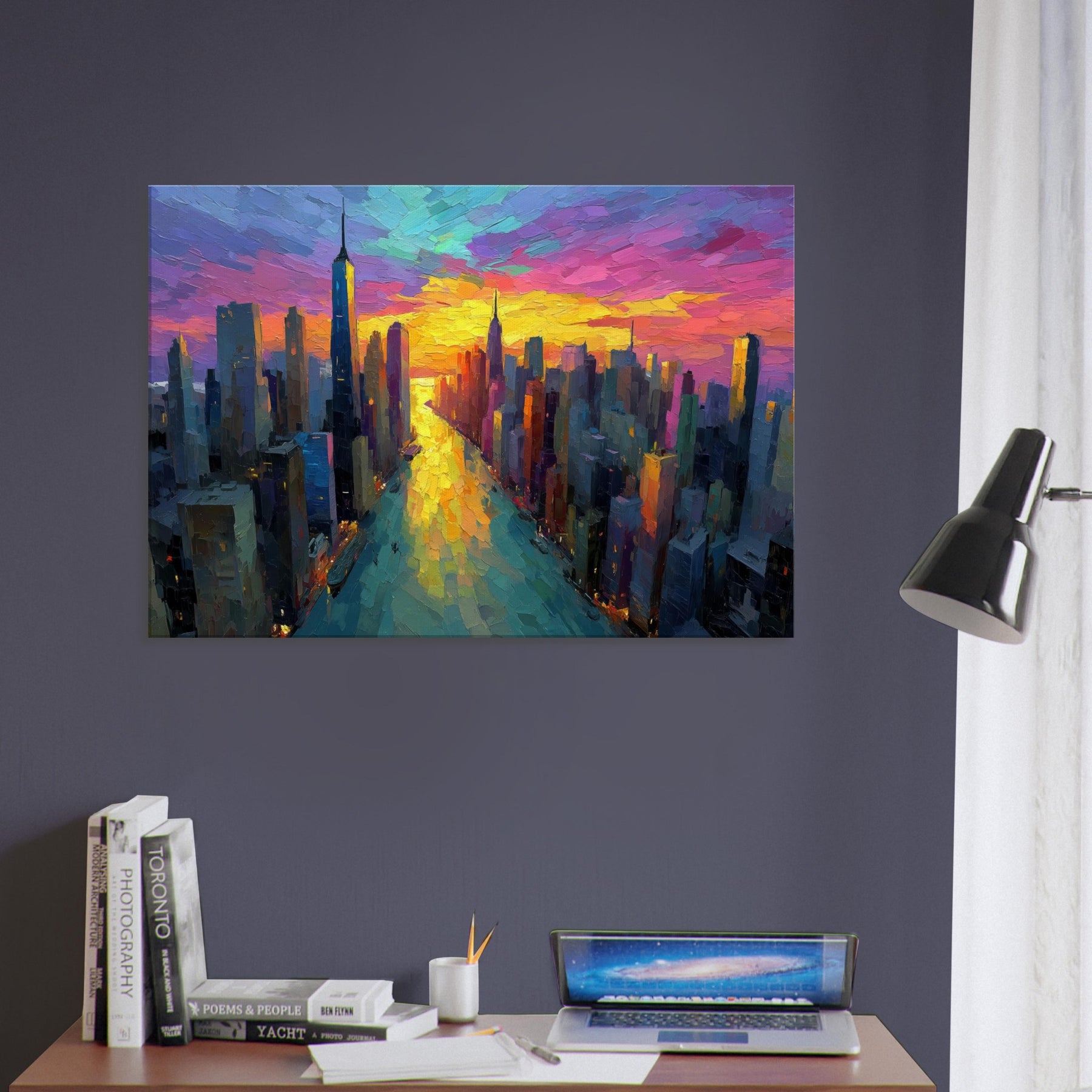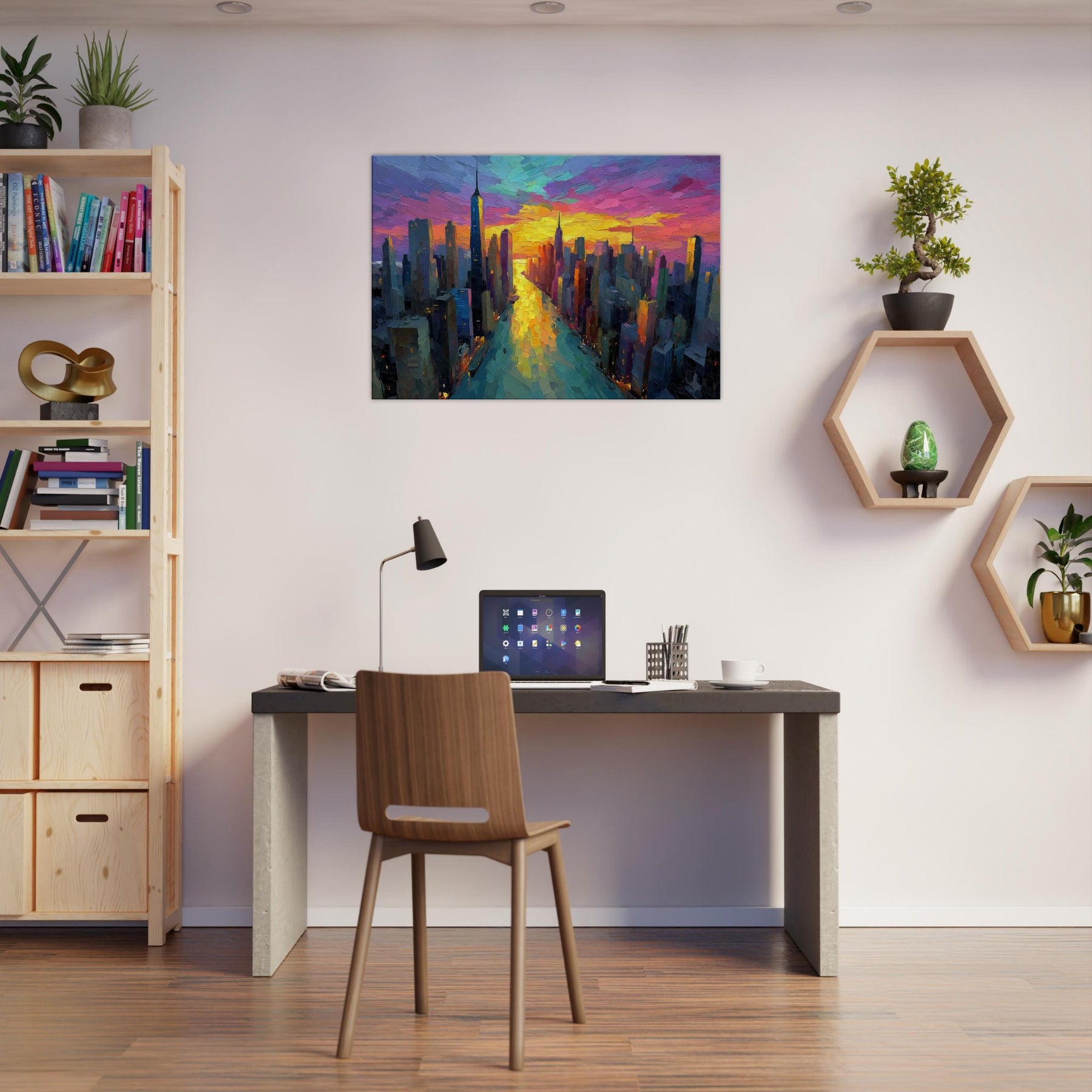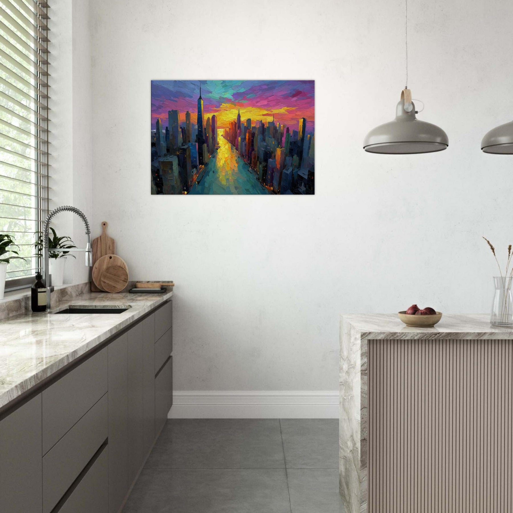 New York surges into your room as if seen from a quiet ferry at dusk: a tapestry of blocky towers, a river of light, and a sky that shifts from cobalt to molten gold. This abstract cityscape breathes with movement, inviting you to pause and feel the pulse of the metropolis. The piece channels memory of neon nights, steel and glass, and the hush after rush hour, turning a living space into a gallery of possibility and urban poetry.