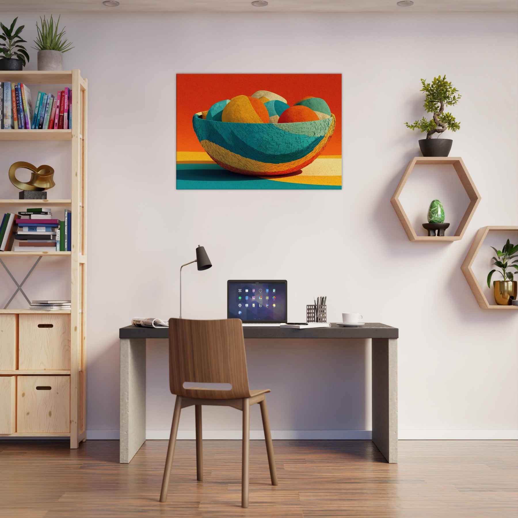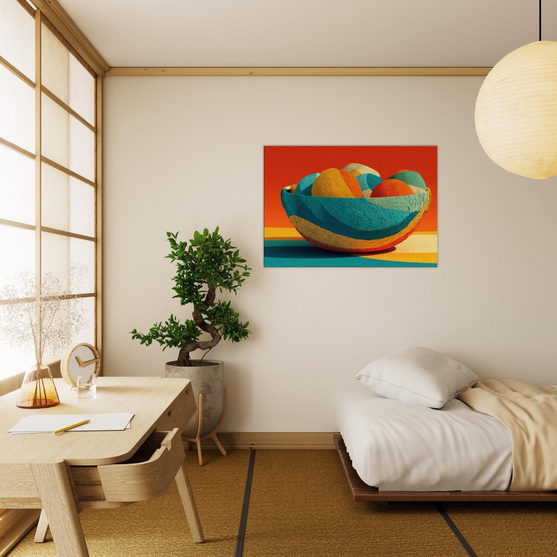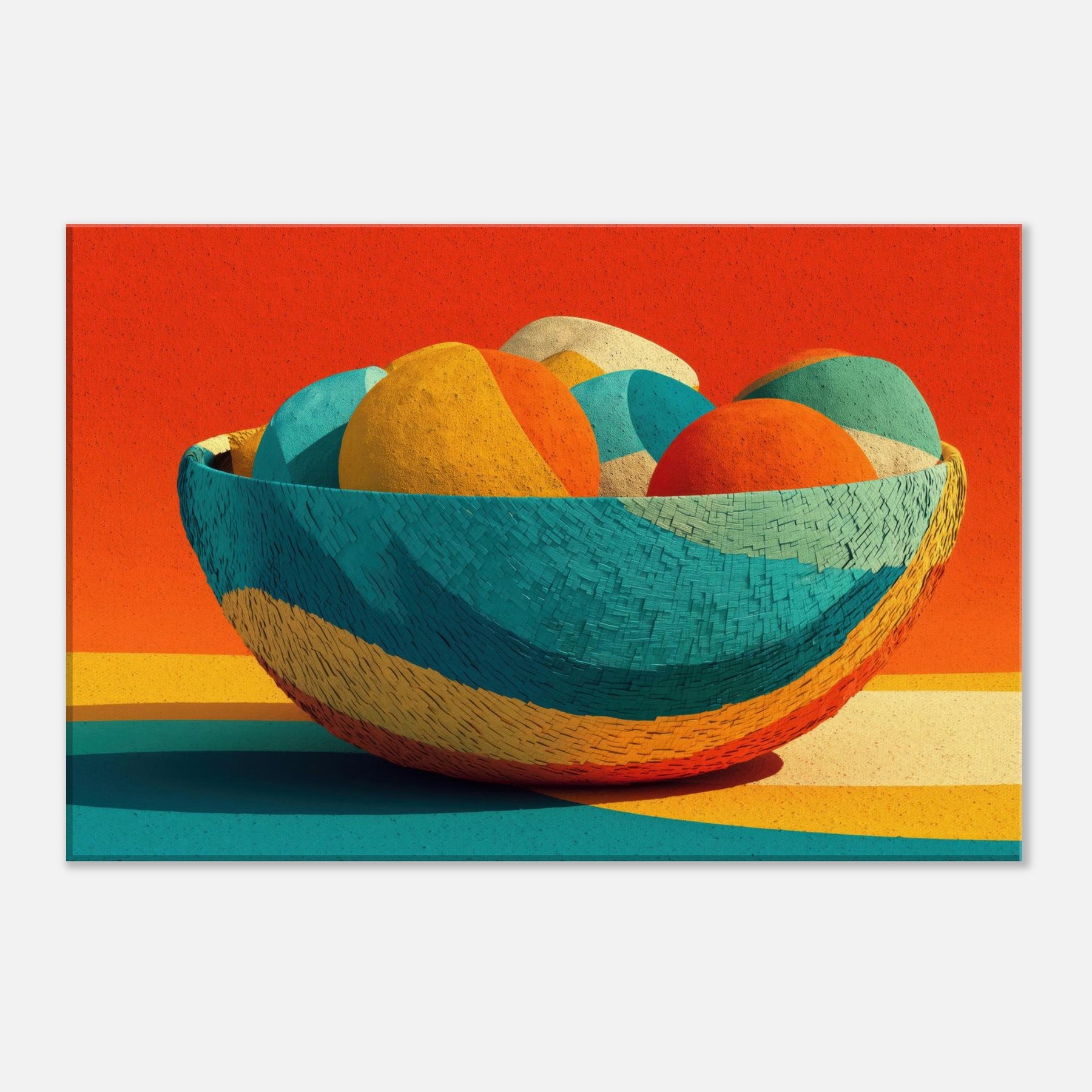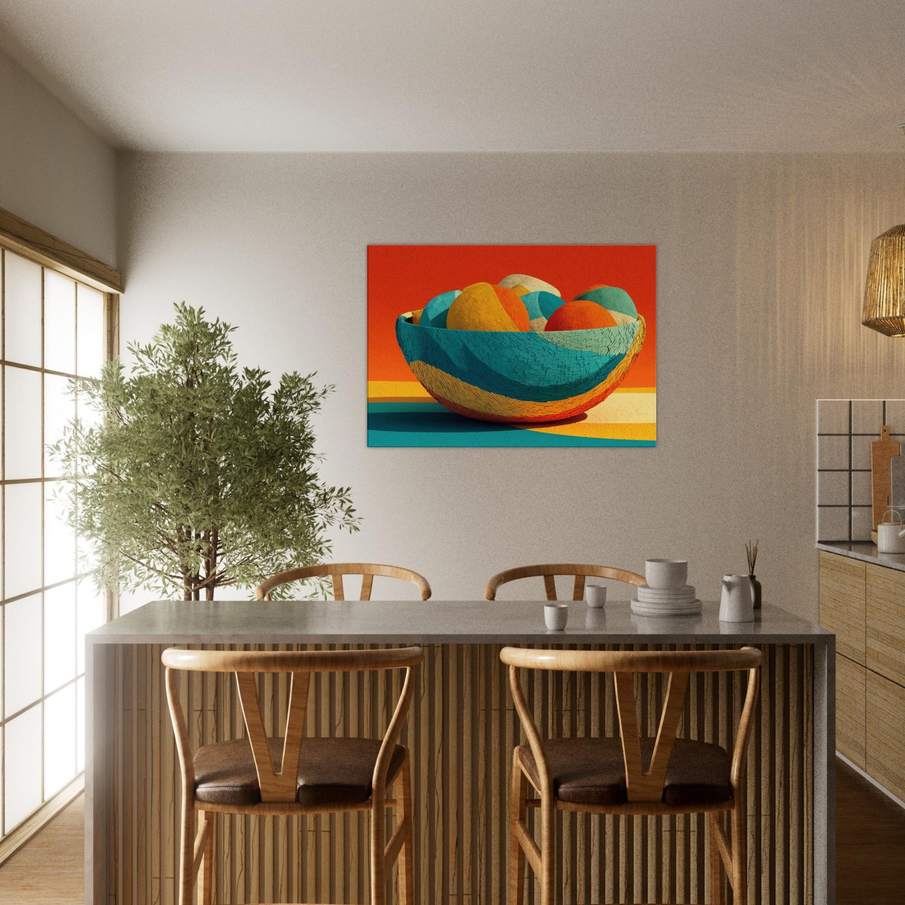 Bamboo Basket rises as a pocket of warm color and quiet rhythm, its abstract curves echoing the hand woven texture of a timeless vessel. In this Iconsandobjects moment, the color sphere shifts through citrus, teal, and coral, inviting the eye to travel and rest. The piece invites light to play across walls and floors, turning a living space into a sanctuary of tone and texture. A tactile, uplifting presence that breathes life into any room.