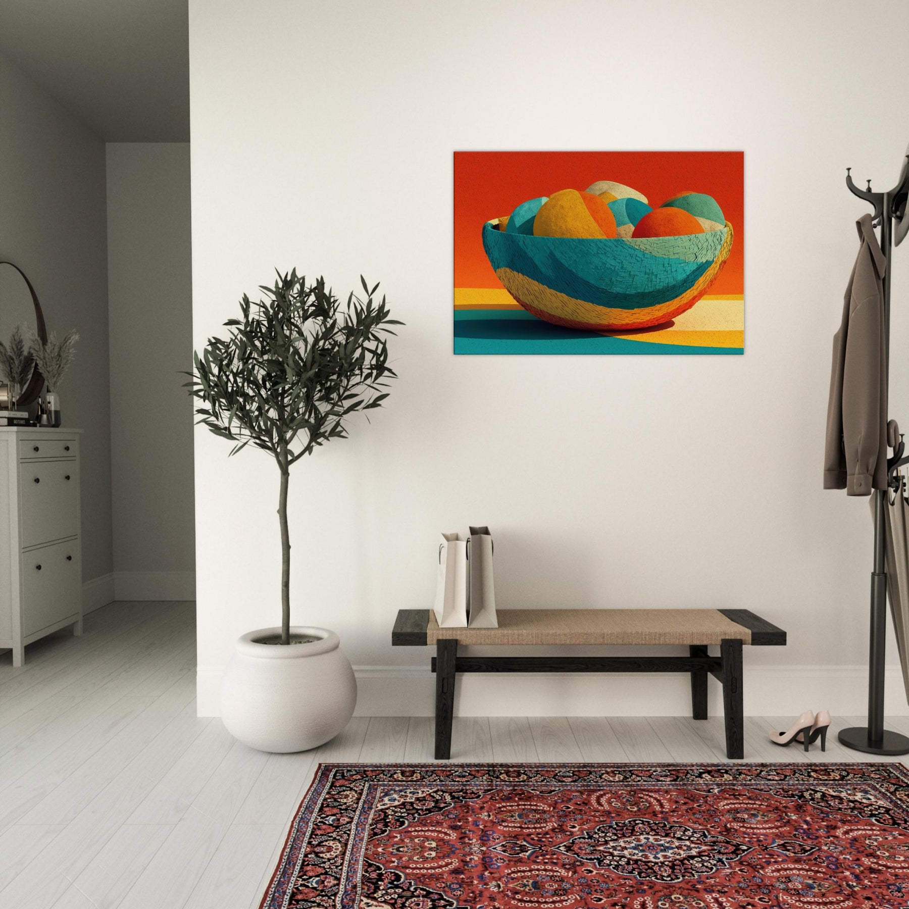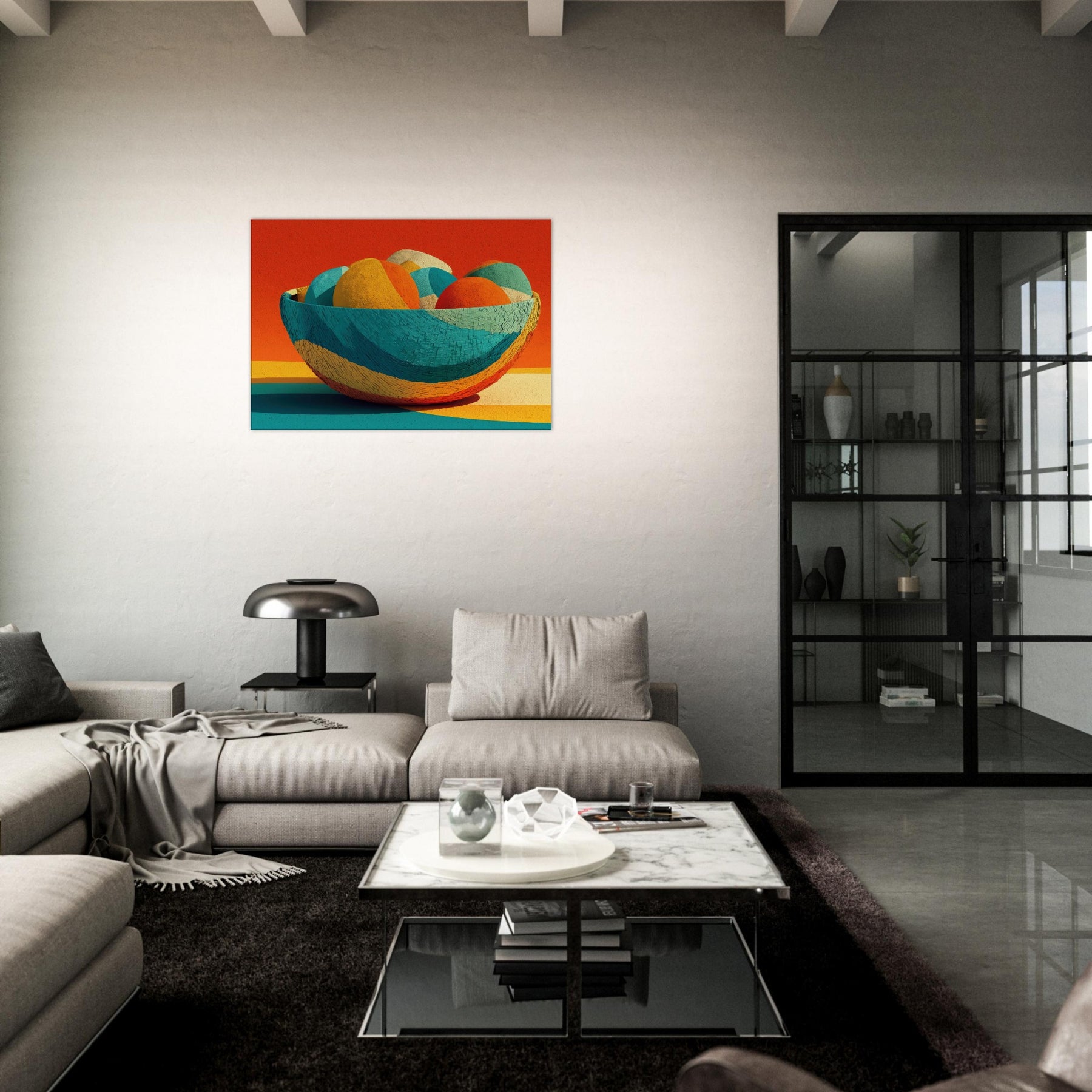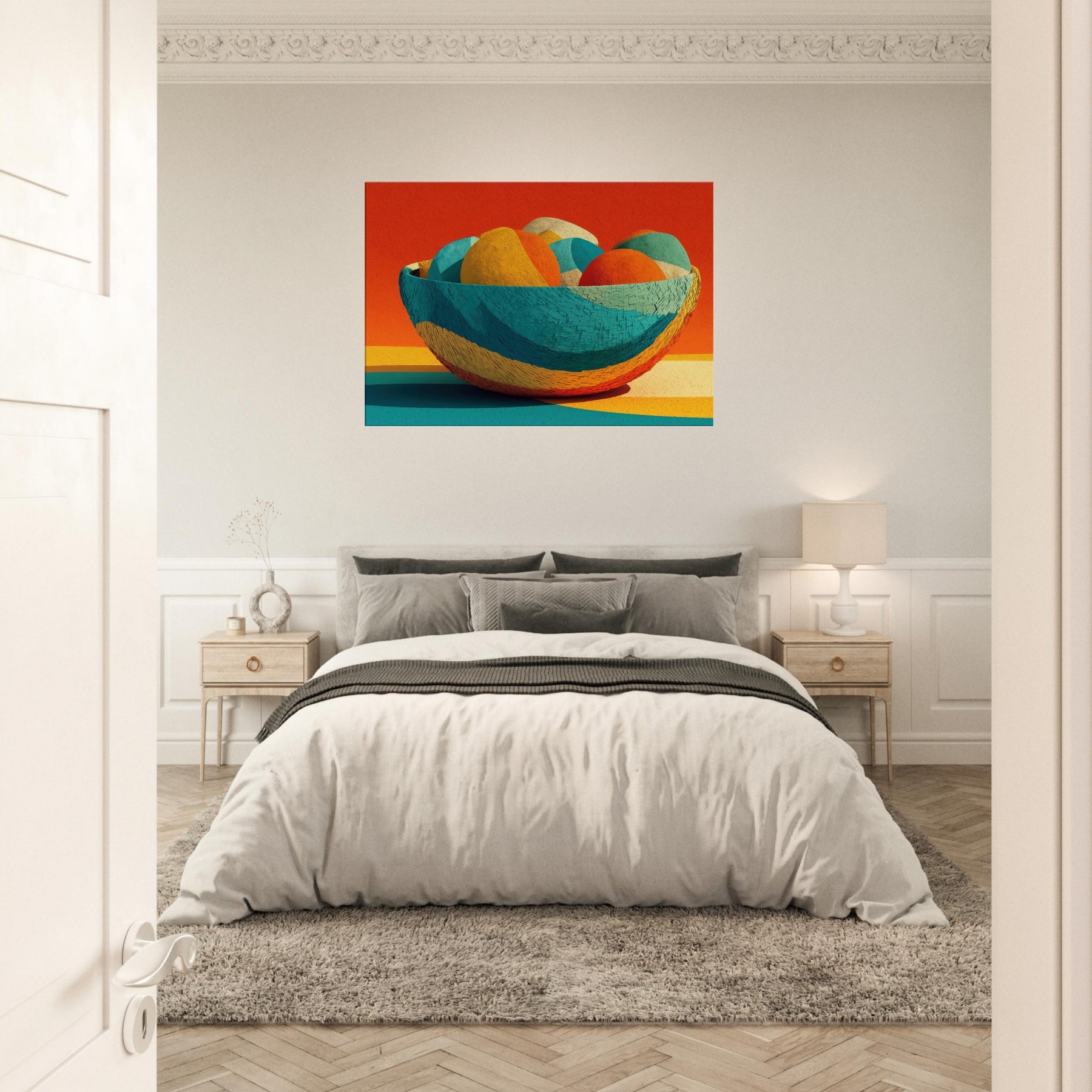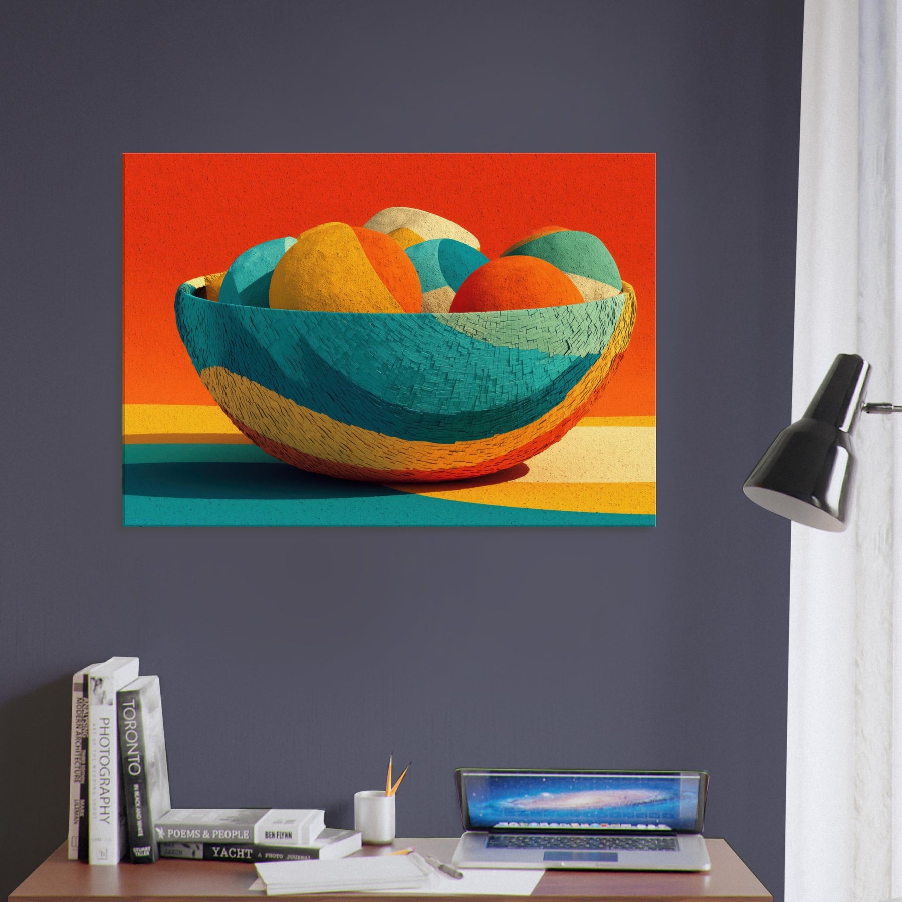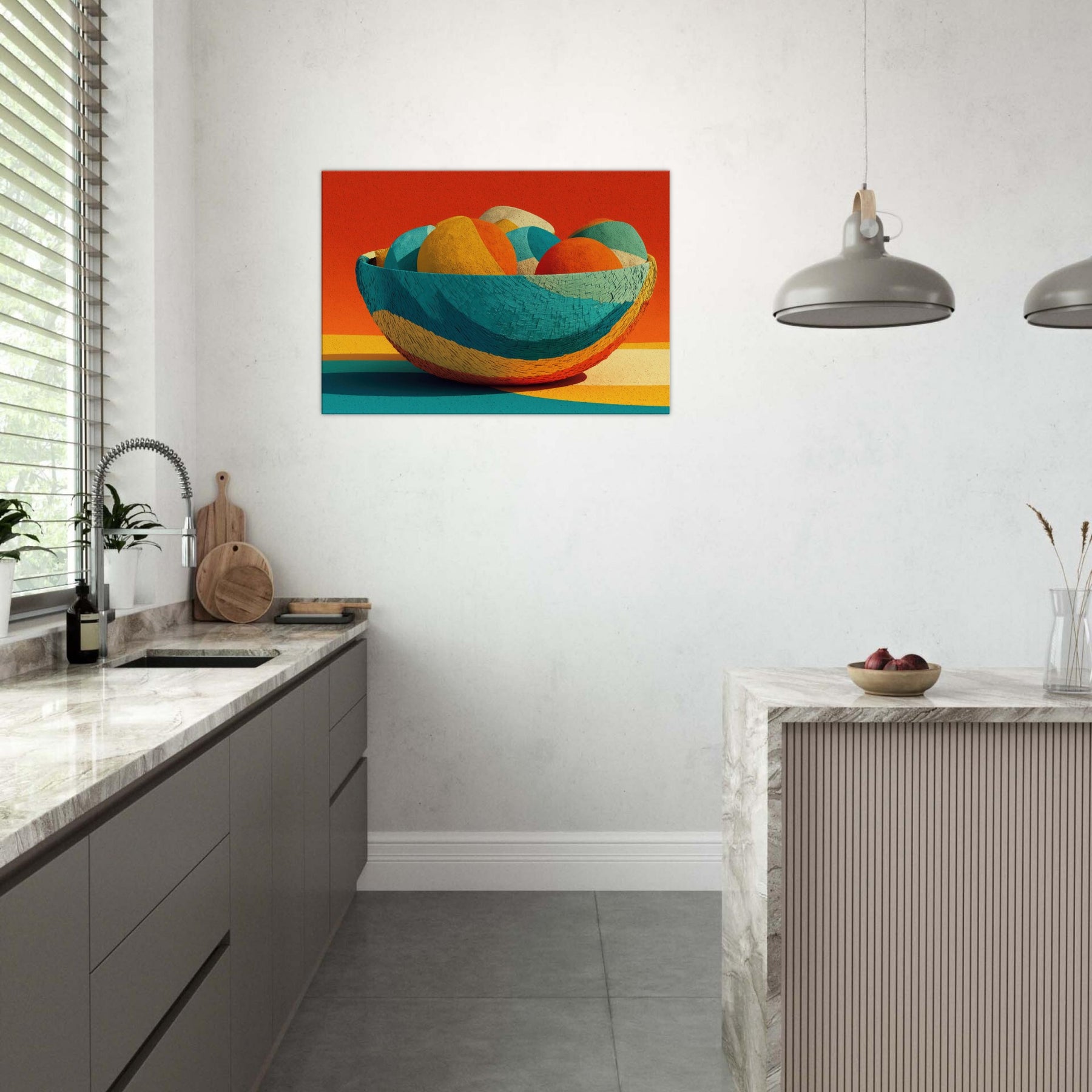 Bamboo Basket rises as a pocket of warm color and quiet rhythm, its abstract curves echoing the hand woven texture of a timeless vessel. In this Iconsandobjects moment, the color sphere shifts through citrus, teal, and coral, inviting the eye to travel and rest. The piece invites light to play across walls and floors, turning a living space into a sanctuary of tone and texture. A tactile, uplifting presence that breathes life into any room.