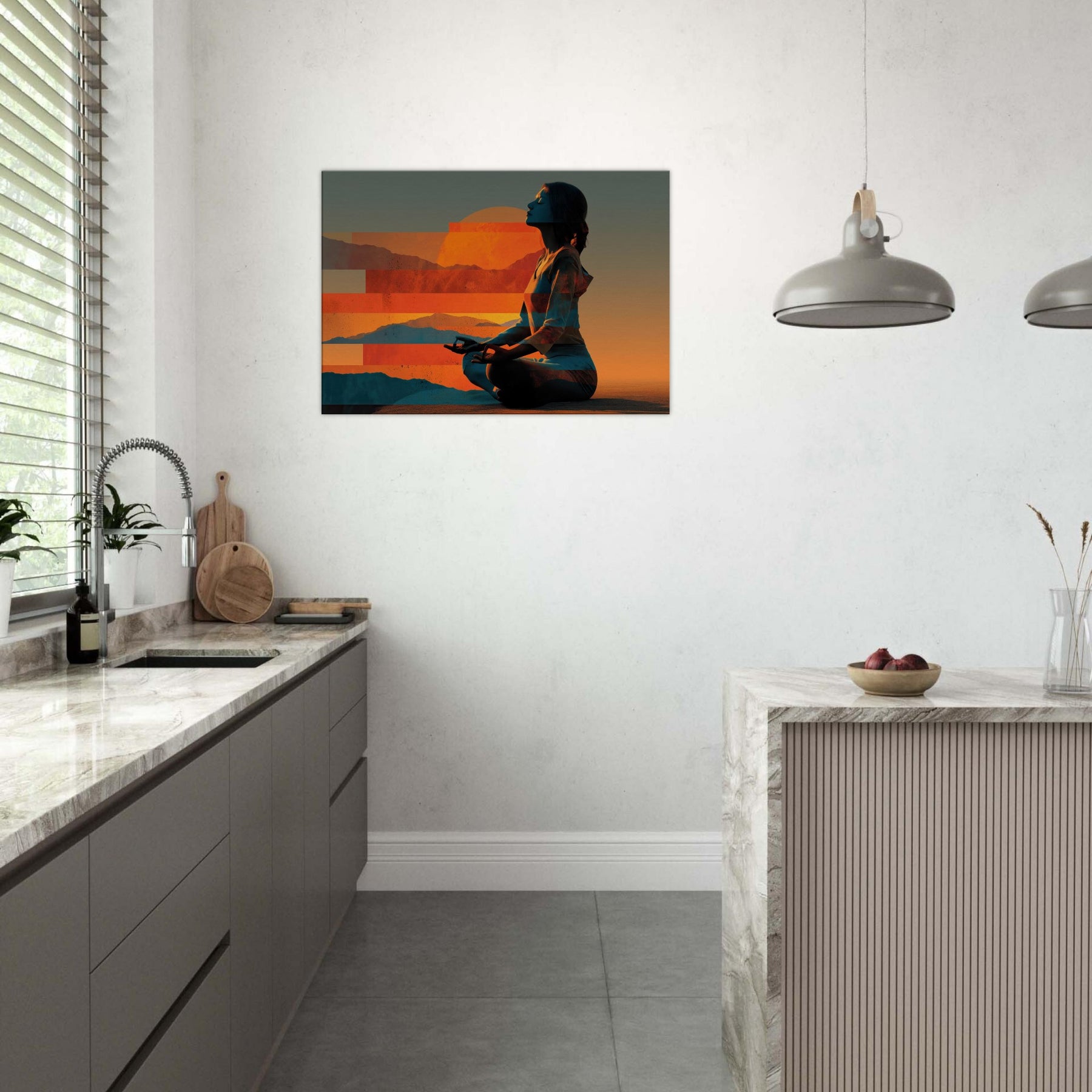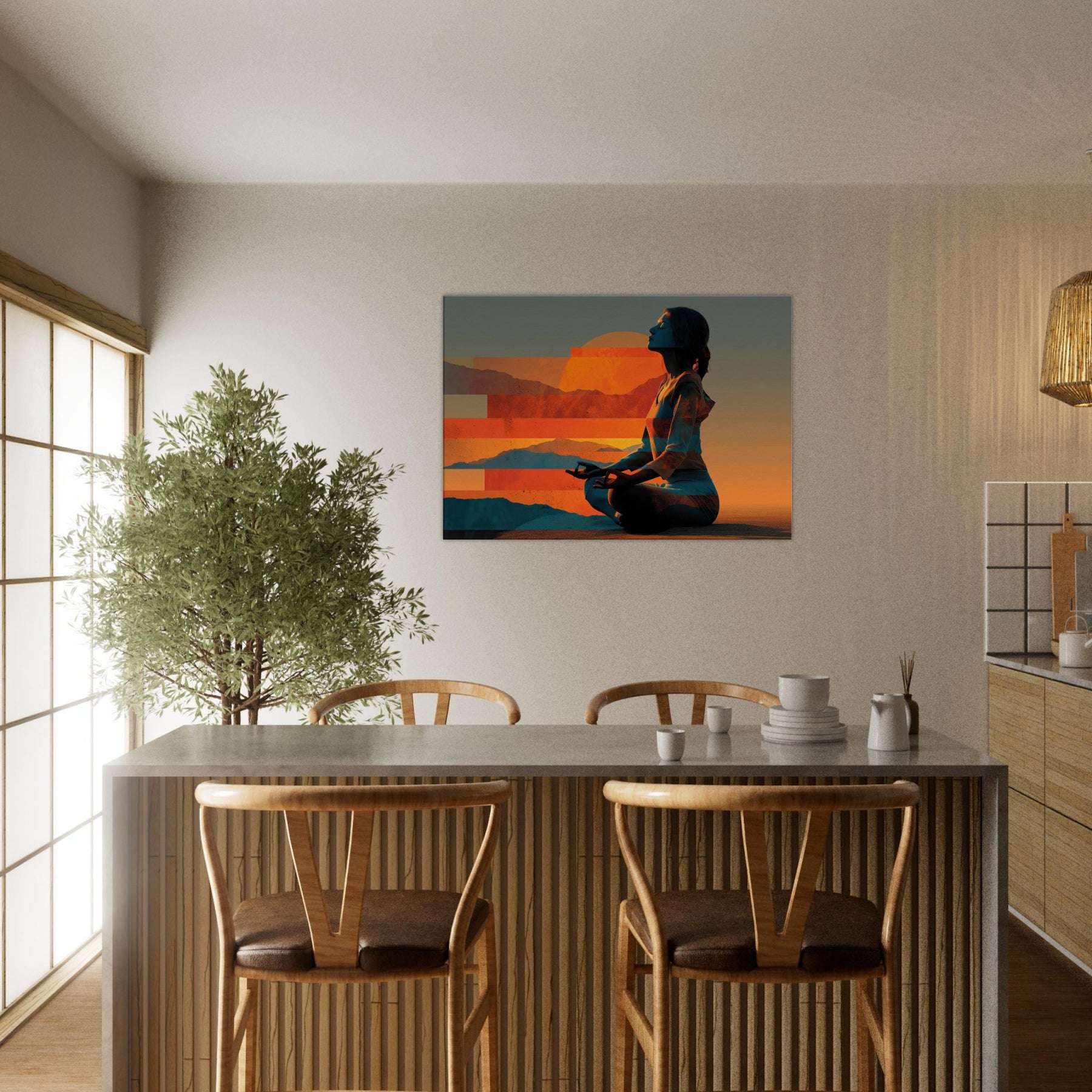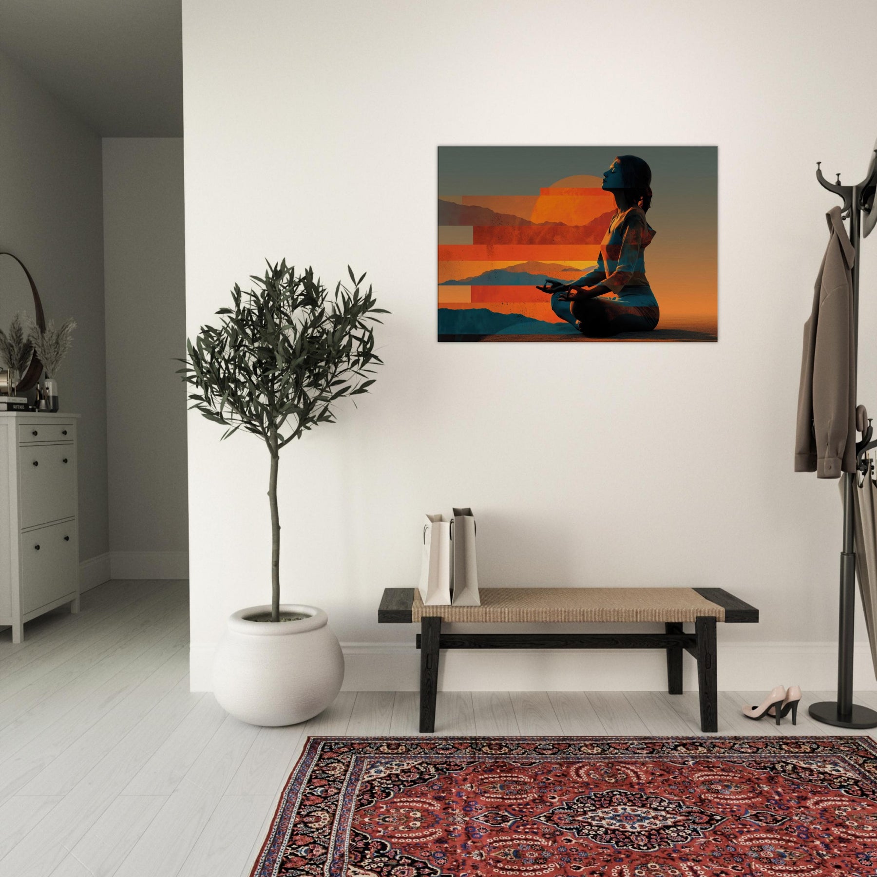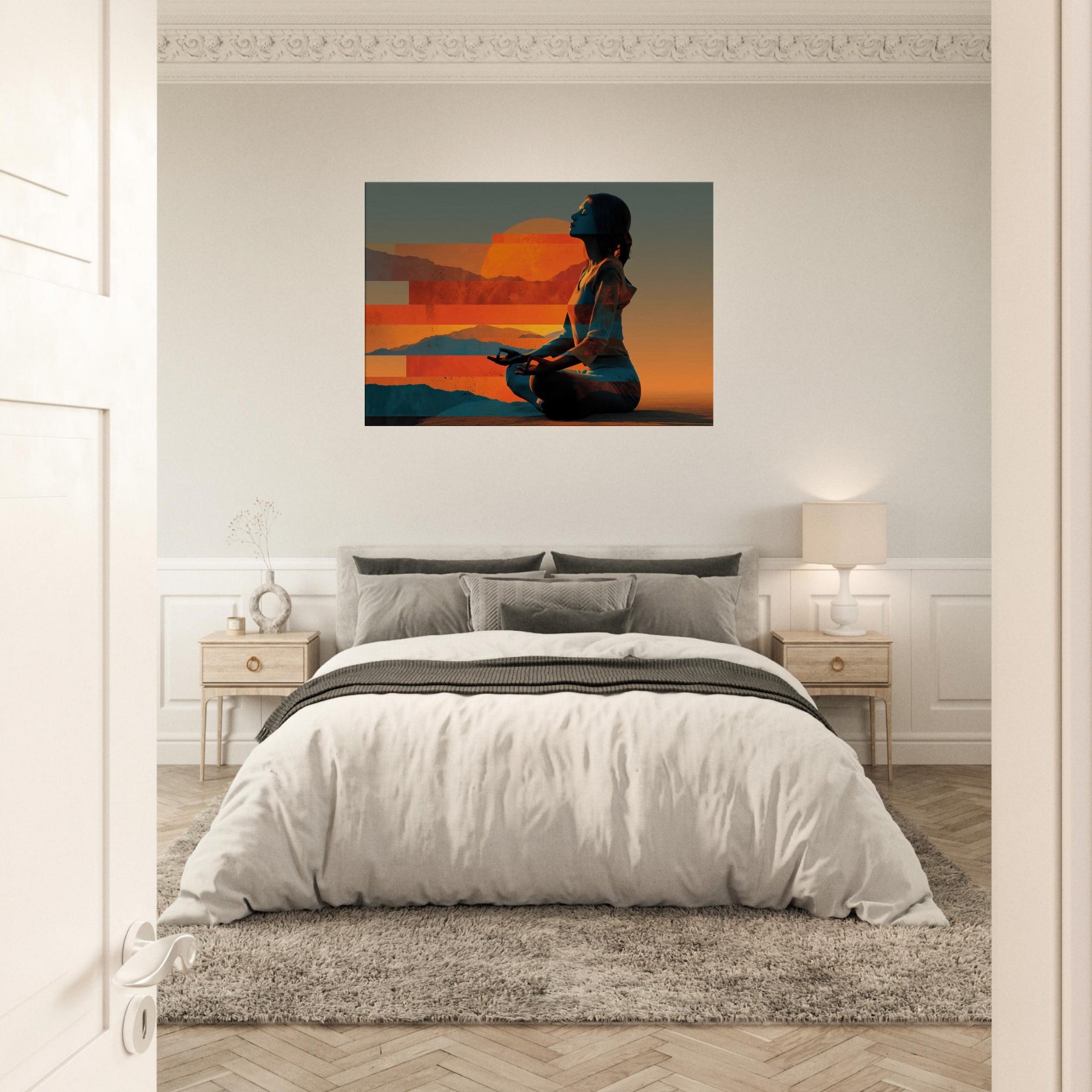 In this abstract meditation, the figure rests in Yoga Lotus Pose as orange ribbons drift across a blue horizon. The composition radiates calm, turning a room into a sanctuary of focus and grace. Saturated sunset hues whisper to the walls, inviting slow mornings and mindful rituals. The air feels warmer, the light softer, and the space seems to breathe with you. A living space is elevated by stillness, balance, and luminous energy, perfect for a meditation corner or serene living room.