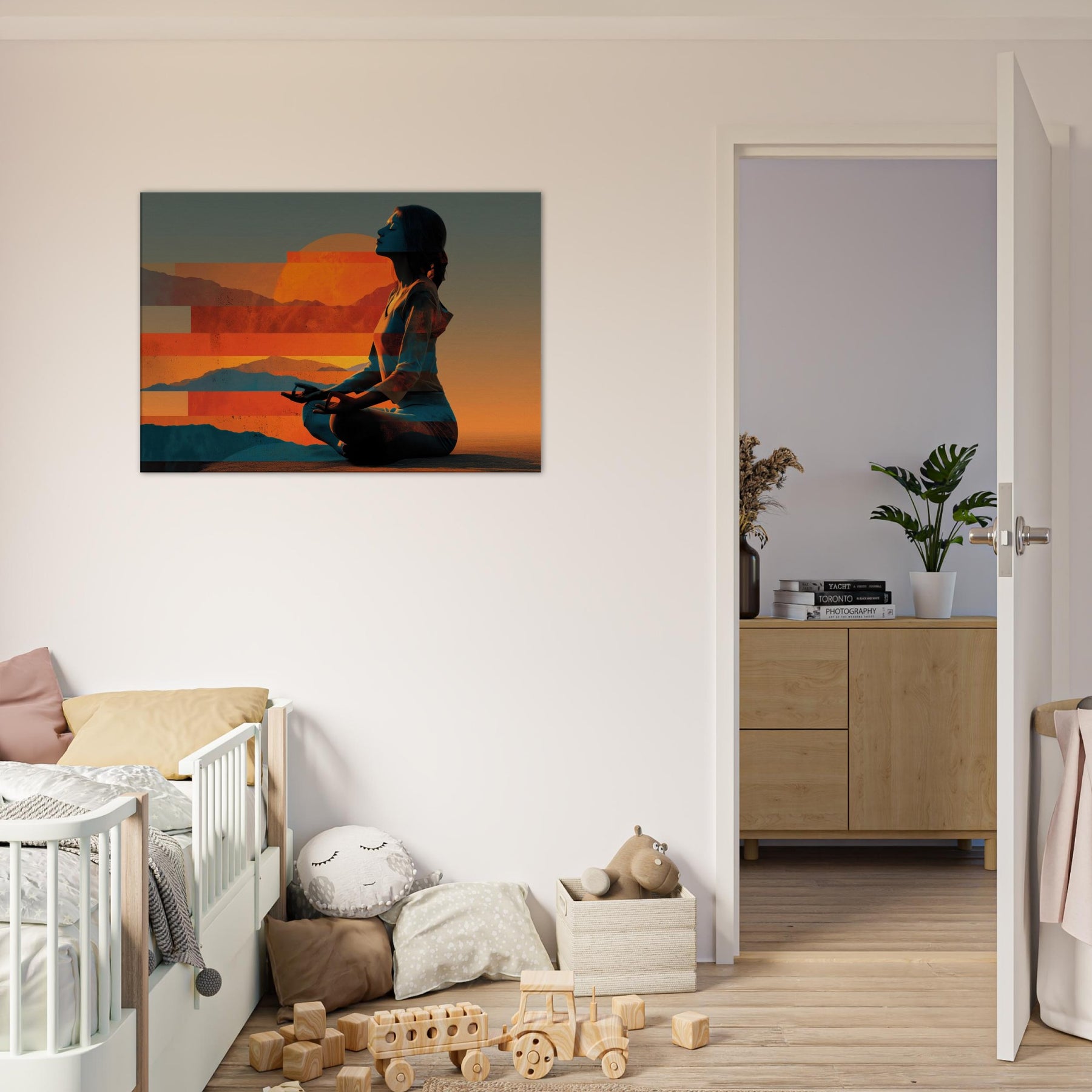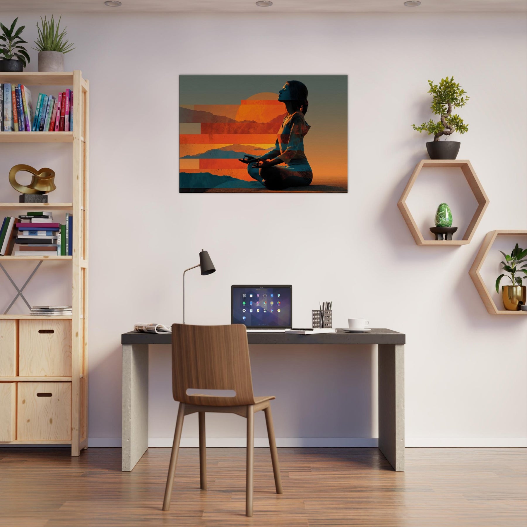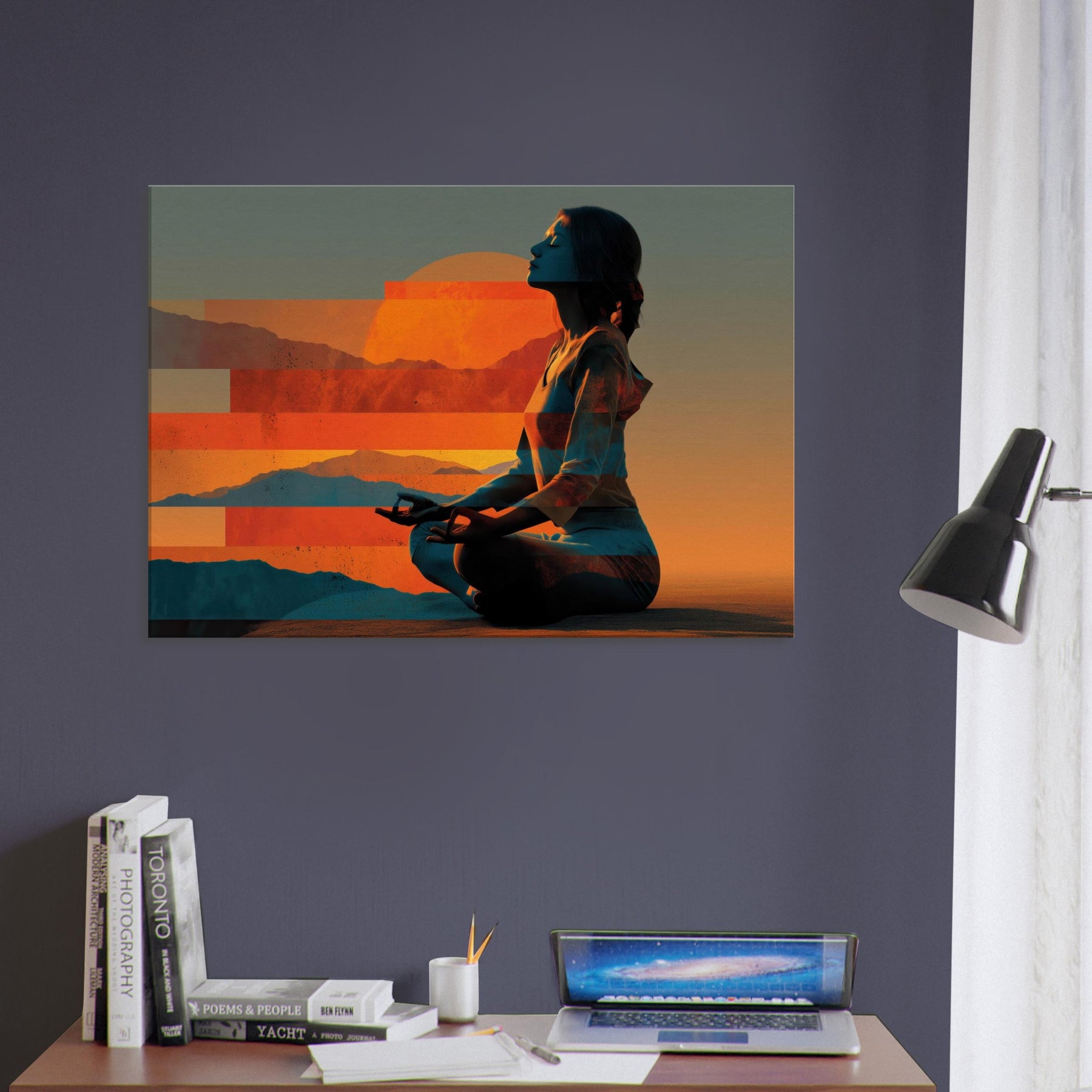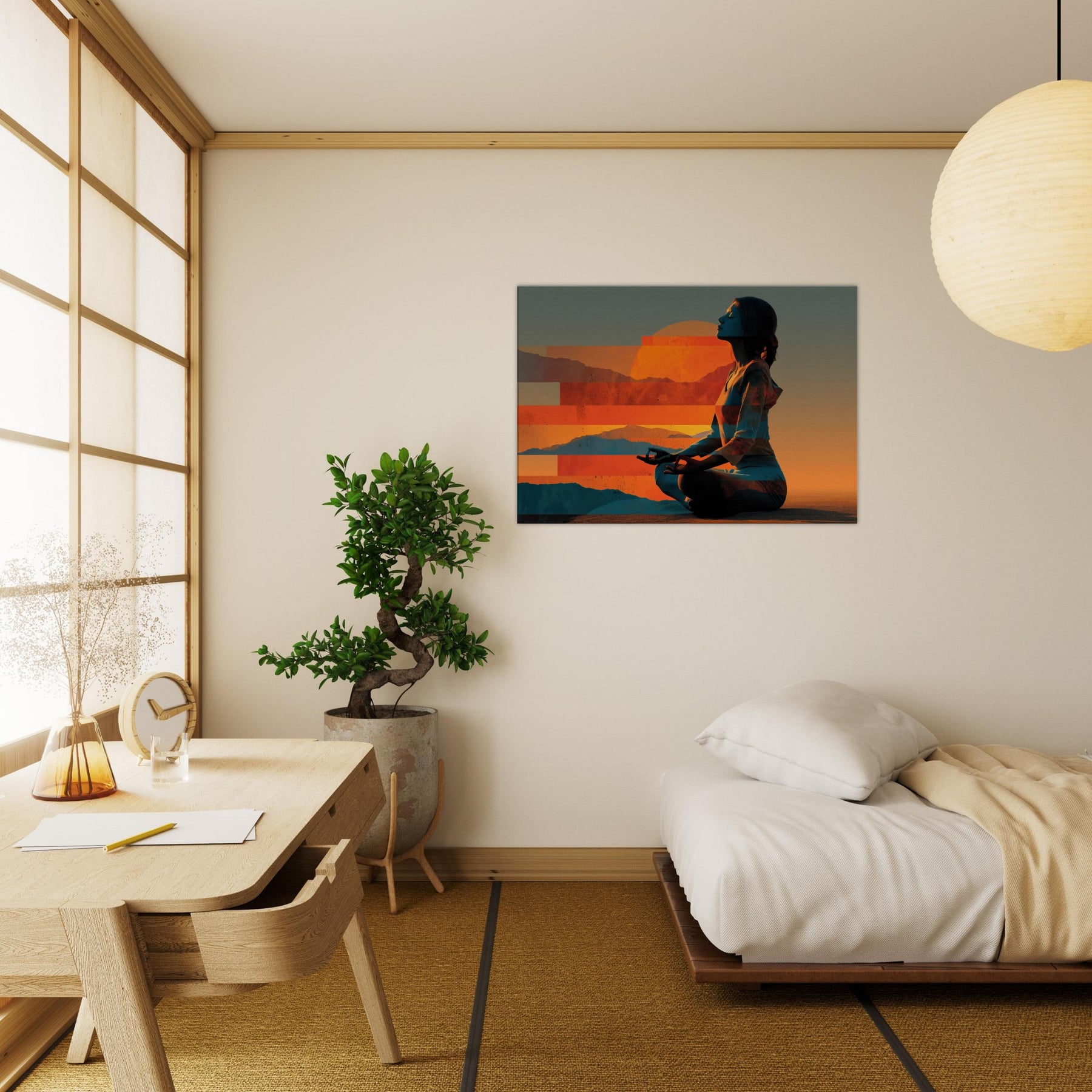 In this abstract meditation, the figure rests in Yoga Lotus Pose as orange ribbons drift across a blue horizon. The composition radiates calm, turning a room into a sanctuary of focus and grace. Saturated sunset hues whisper to the walls, inviting slow mornings and mindful rituals. The air feels warmer, the light softer, and the space seems to breathe with you. A living space is elevated by stillness, balance, and luminous energy, perfect for a meditation corner or serene living room.