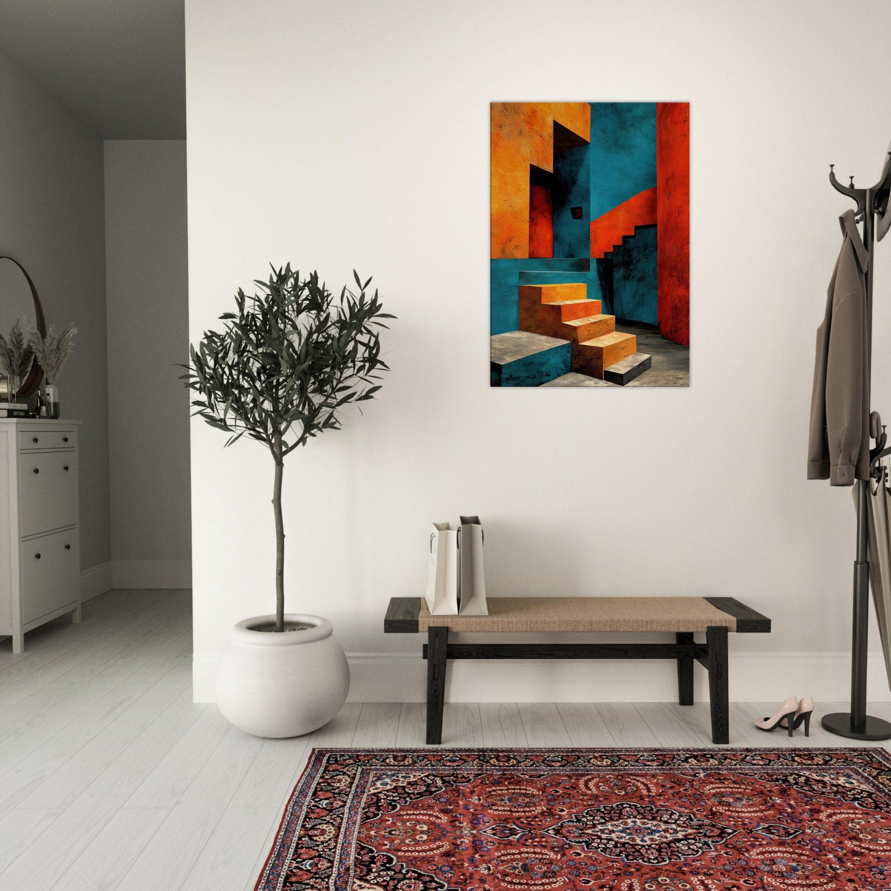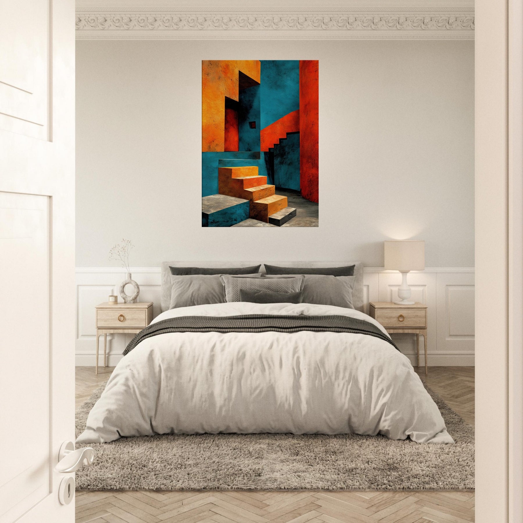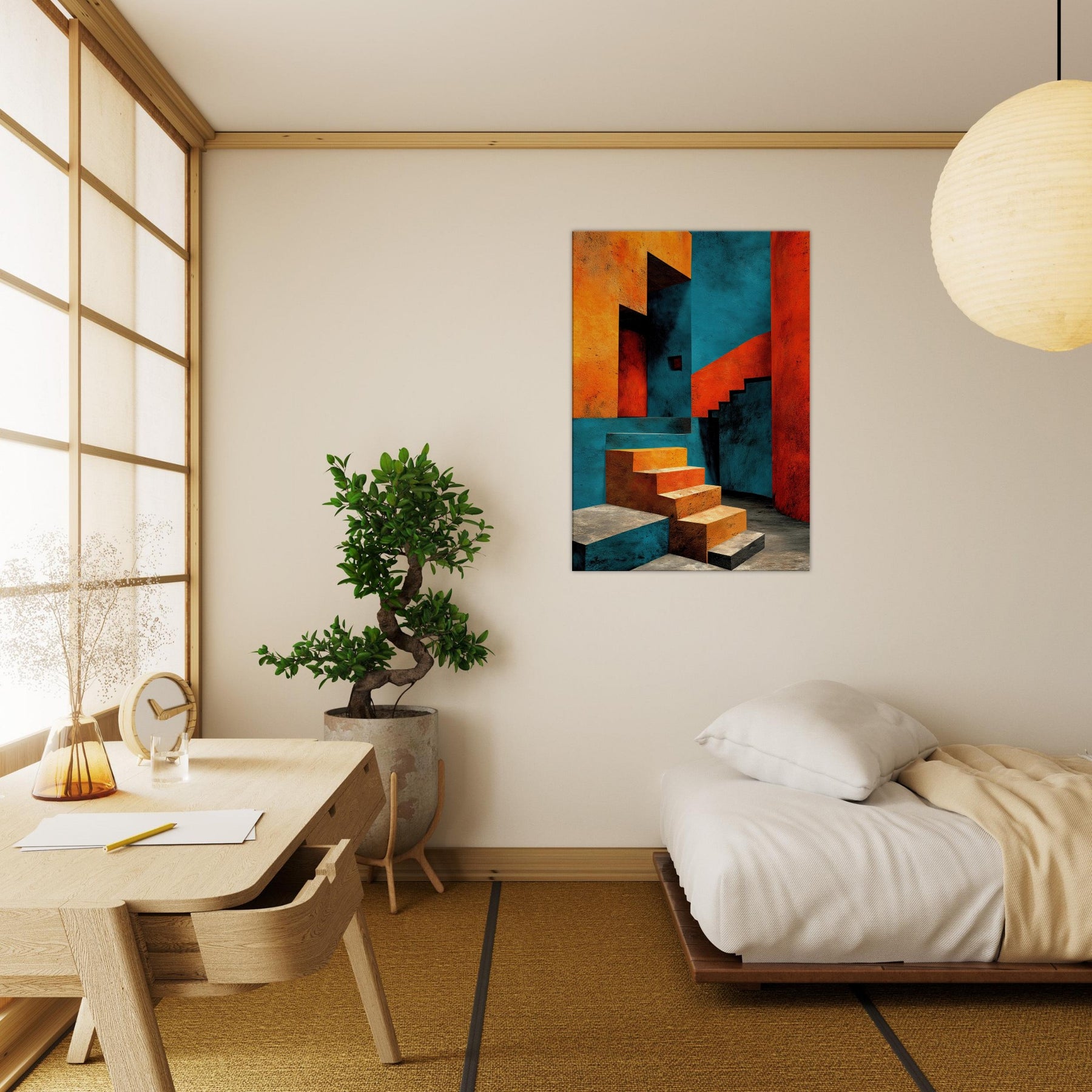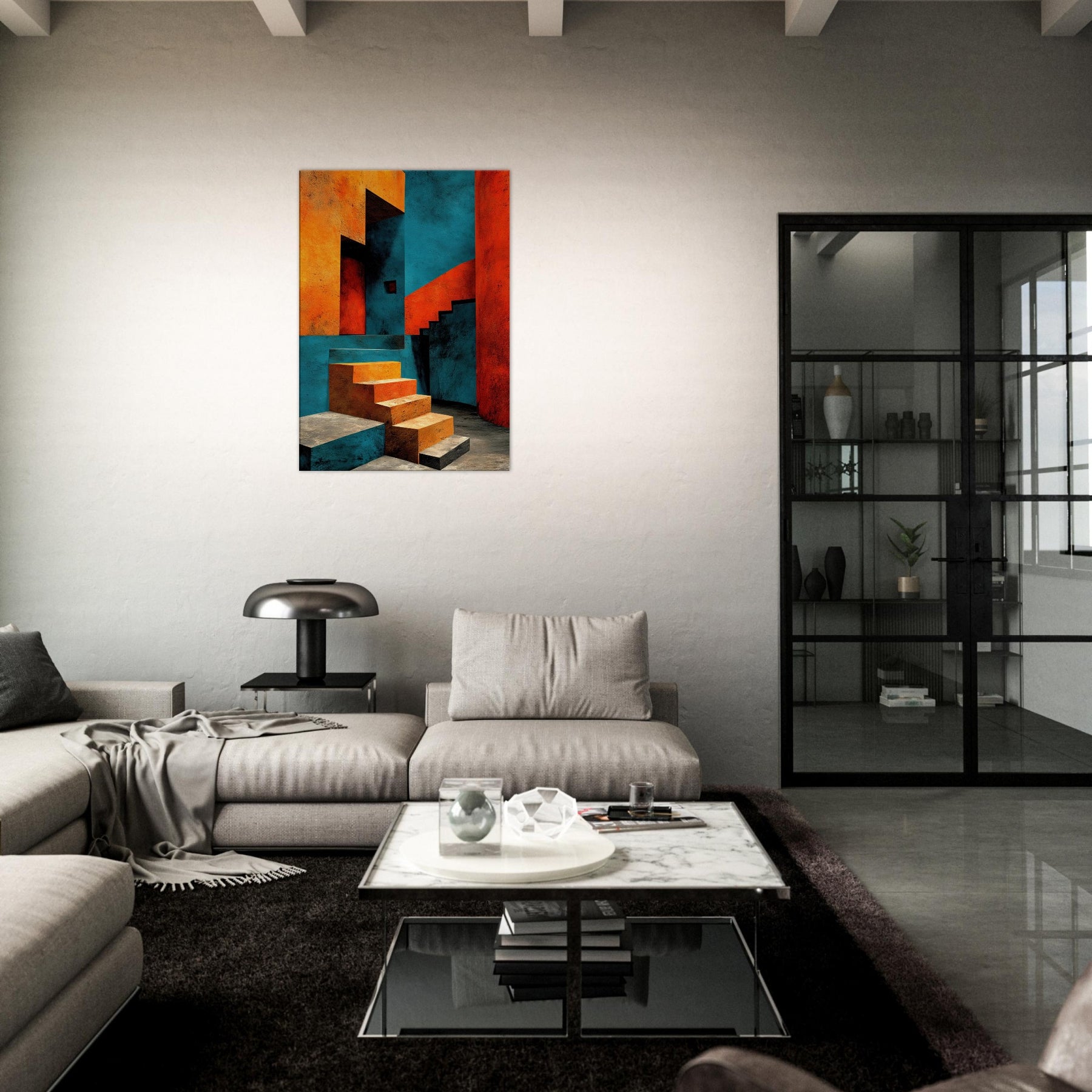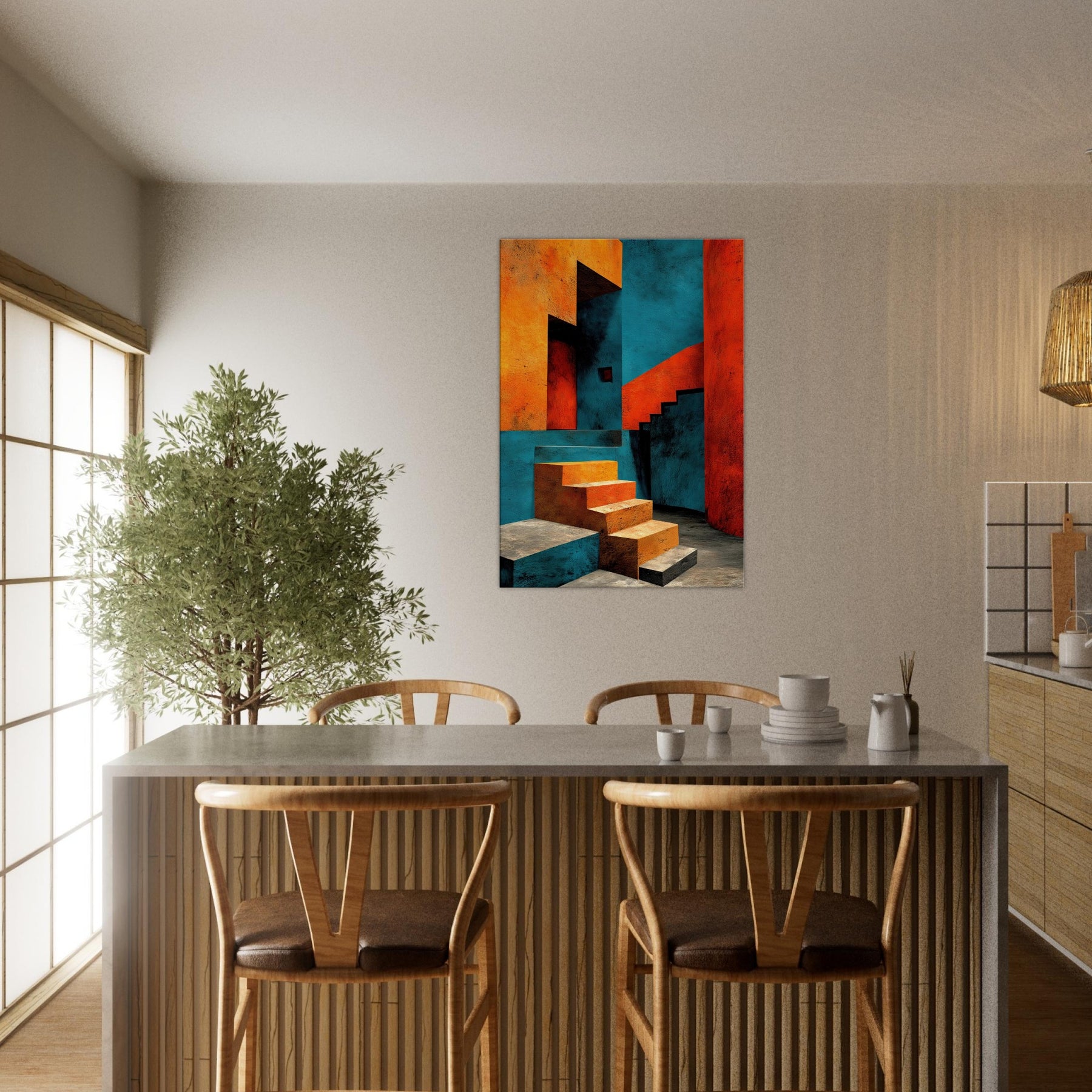 Staircase Switchback unfolds as a bold dialogue of color and gravity, where slabs of orange and teal orbit a sunlit void. The scene hums with architectural rhythm, inviting contemplation and a sense of ascent in a living room or hallway. This abstract composition wraps walls in warmth and momentum, transforming ordinary spaces into a gallery of movement and memory. A quiet drama lingers long after the lights fade.