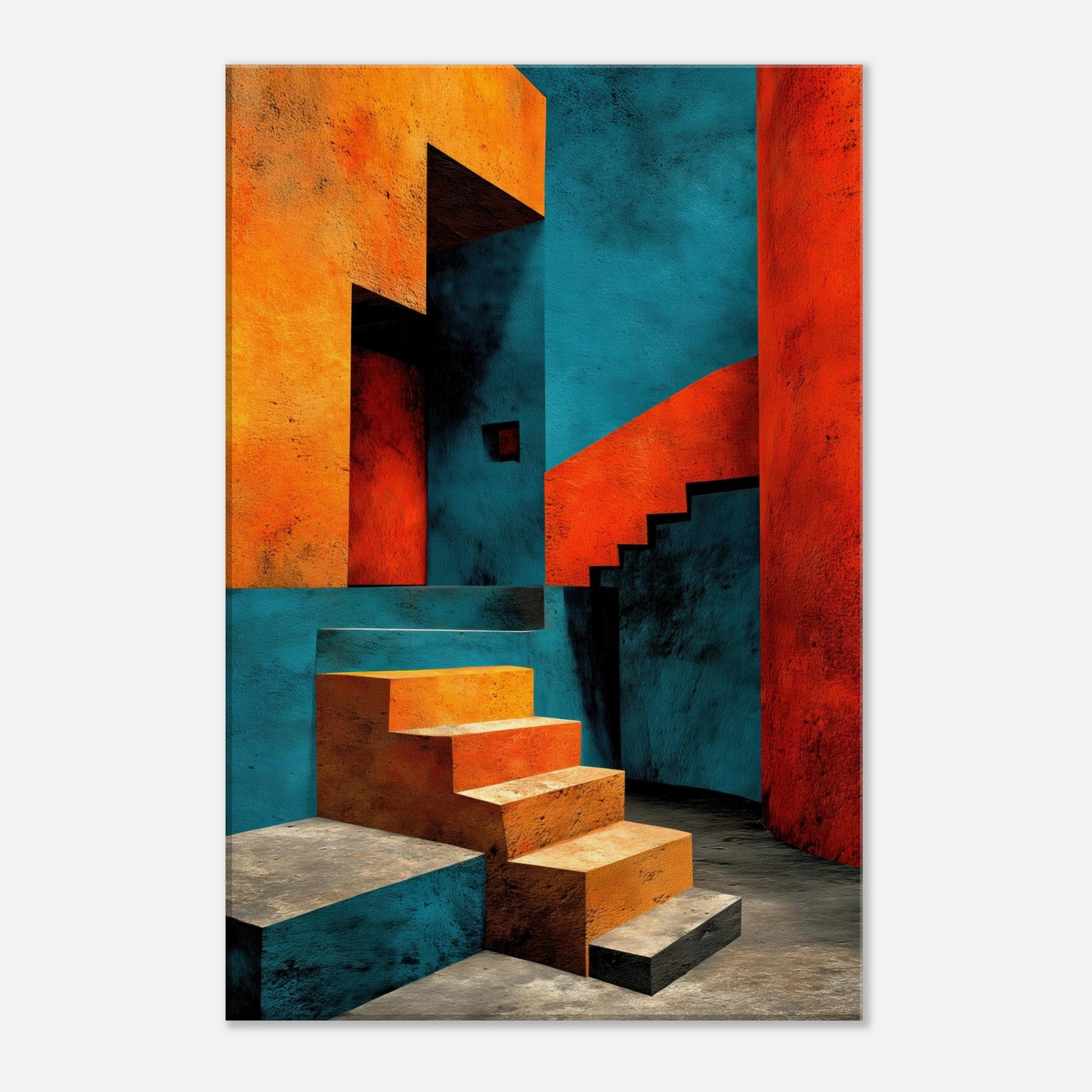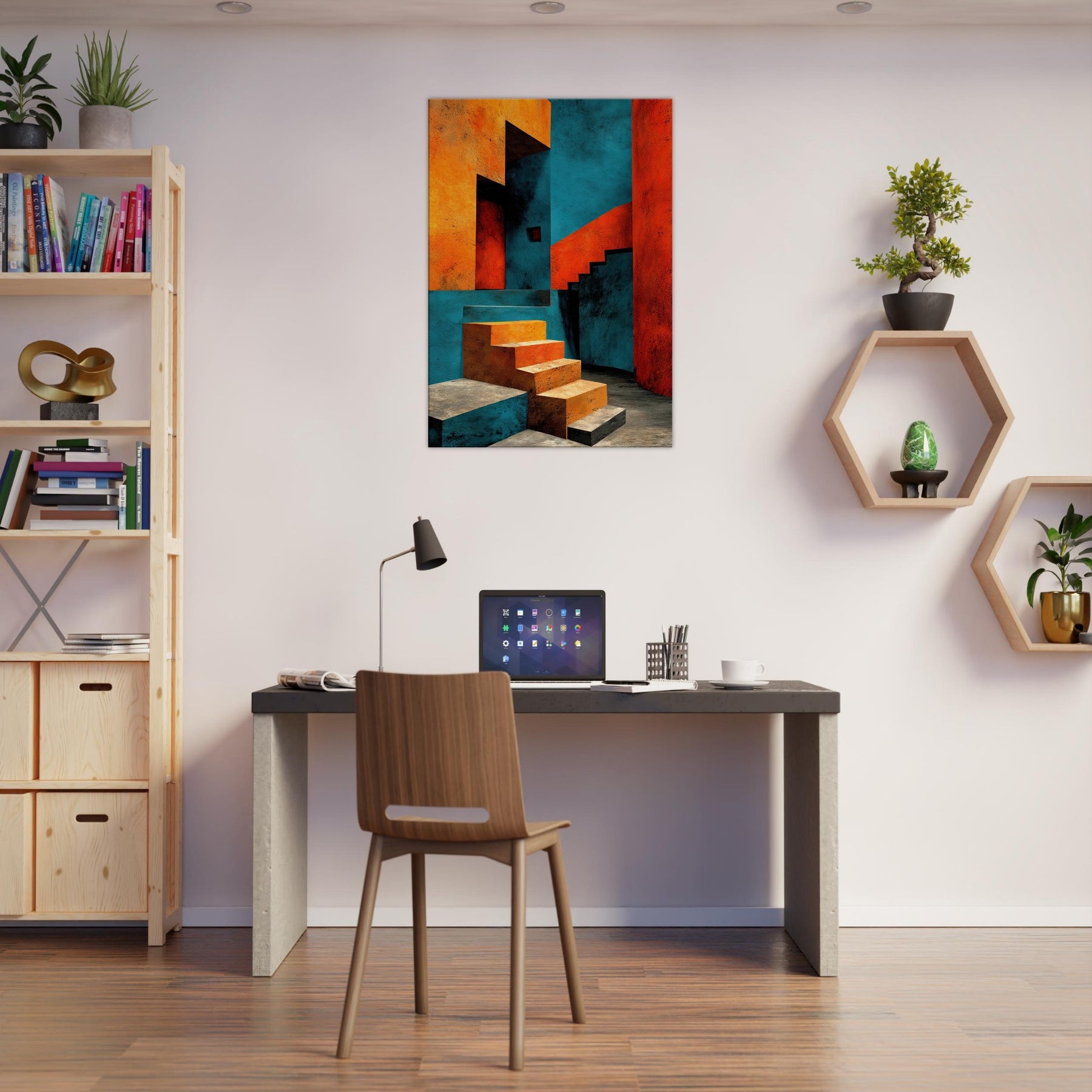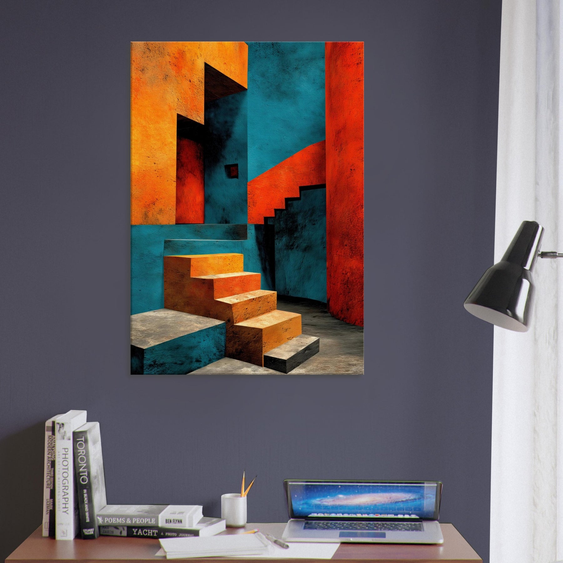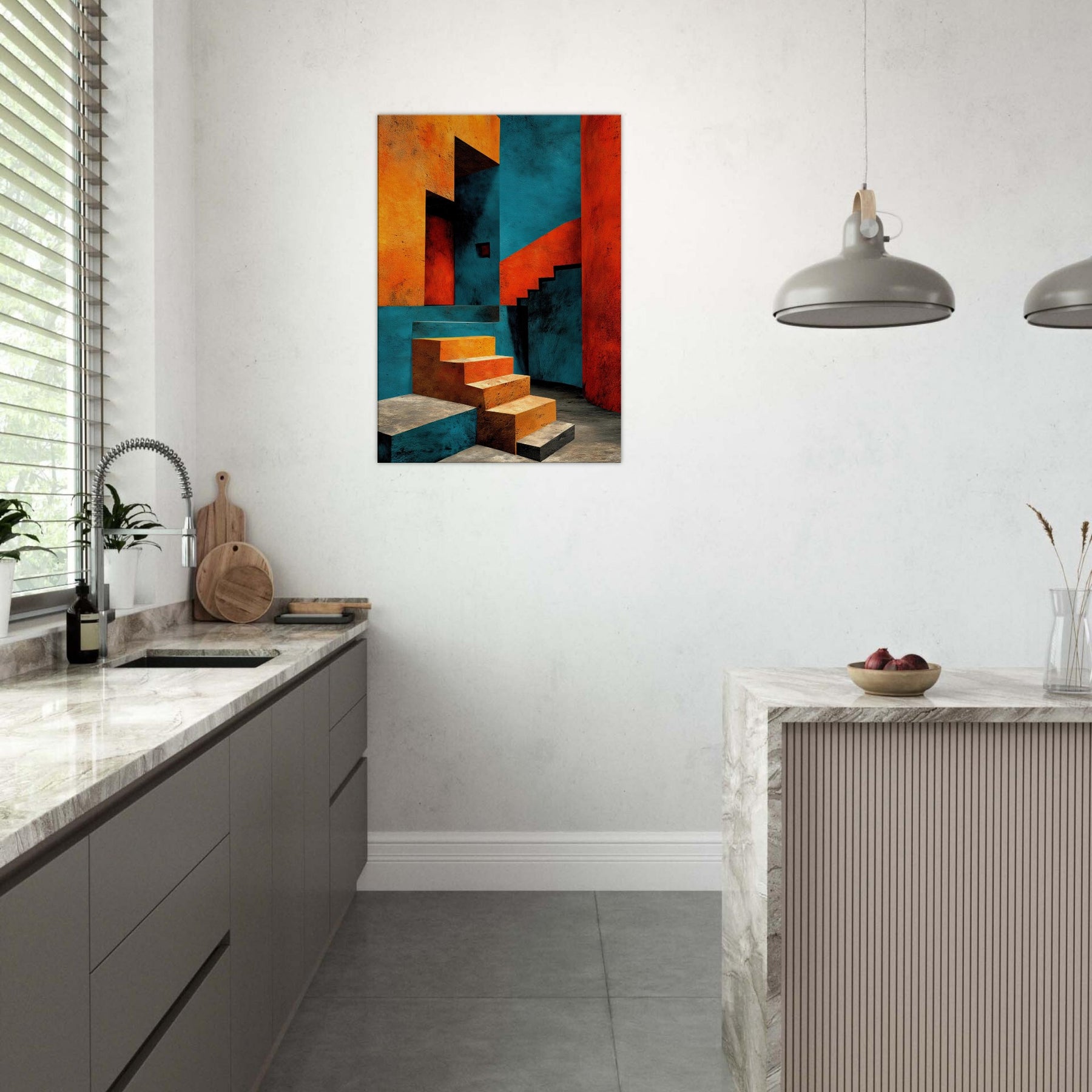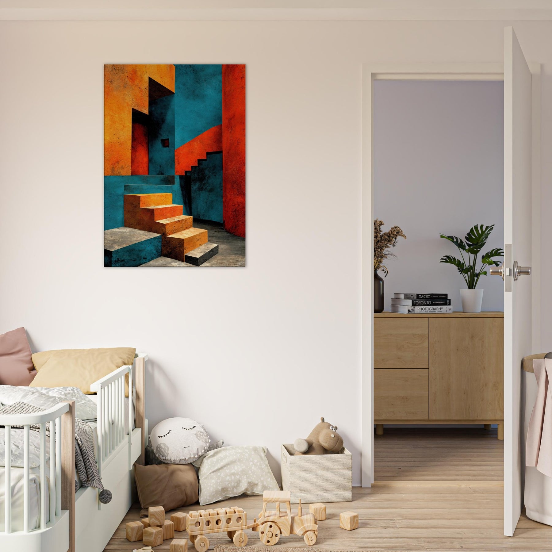 Staircase Switchback unfolds as a bold dialogue of color and gravity, where slabs of orange and teal orbit a sunlit void. The scene hums with architectural rhythm, inviting contemplation and a sense of ascent in a living room or hallway. This abstract composition wraps walls in warmth and momentum, transforming ordinary spaces into a gallery of movement and memory. A quiet drama lingers long after the lights fade.