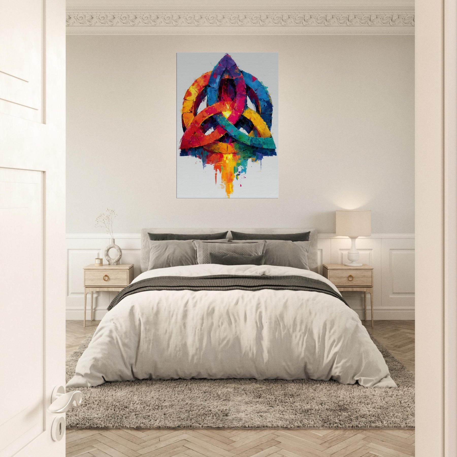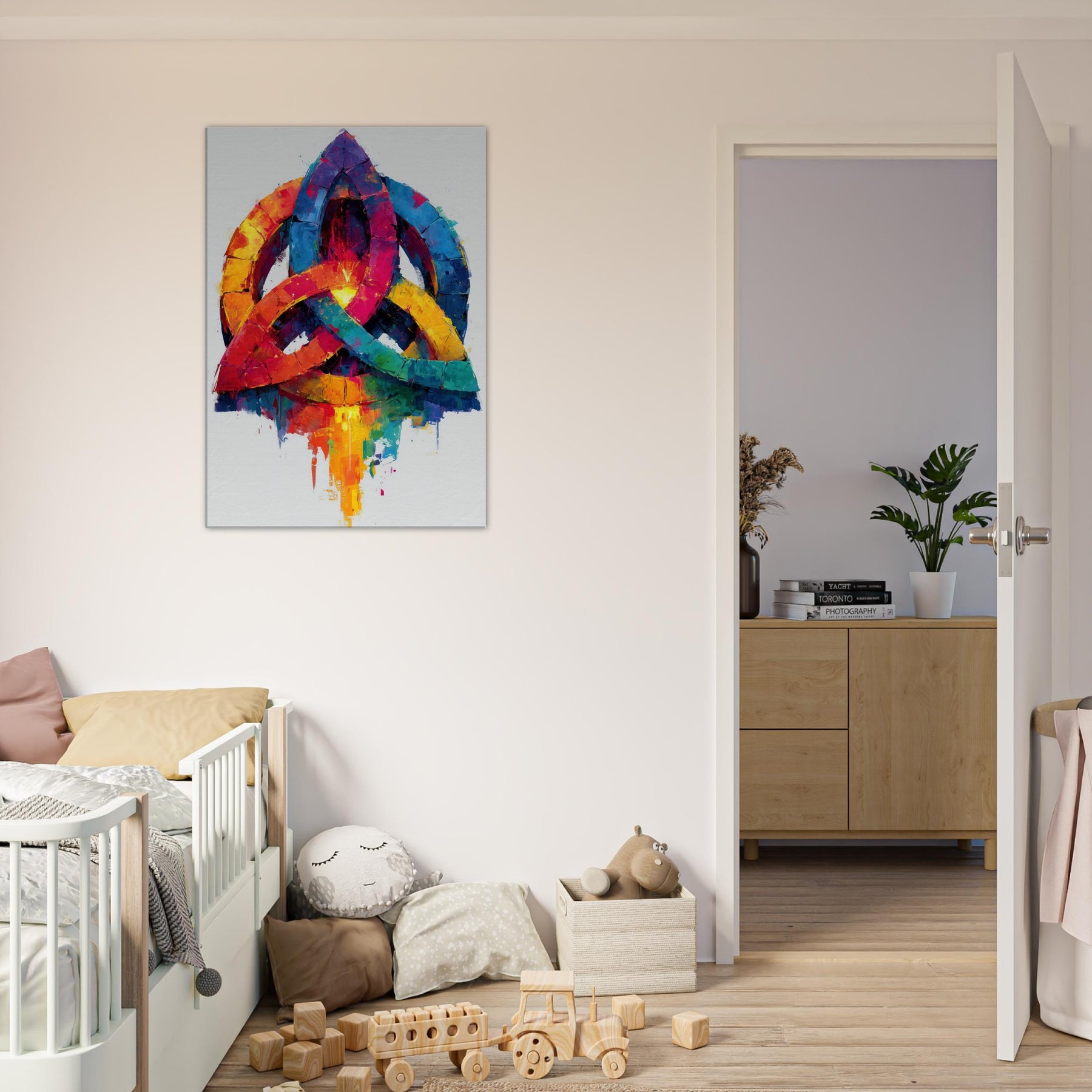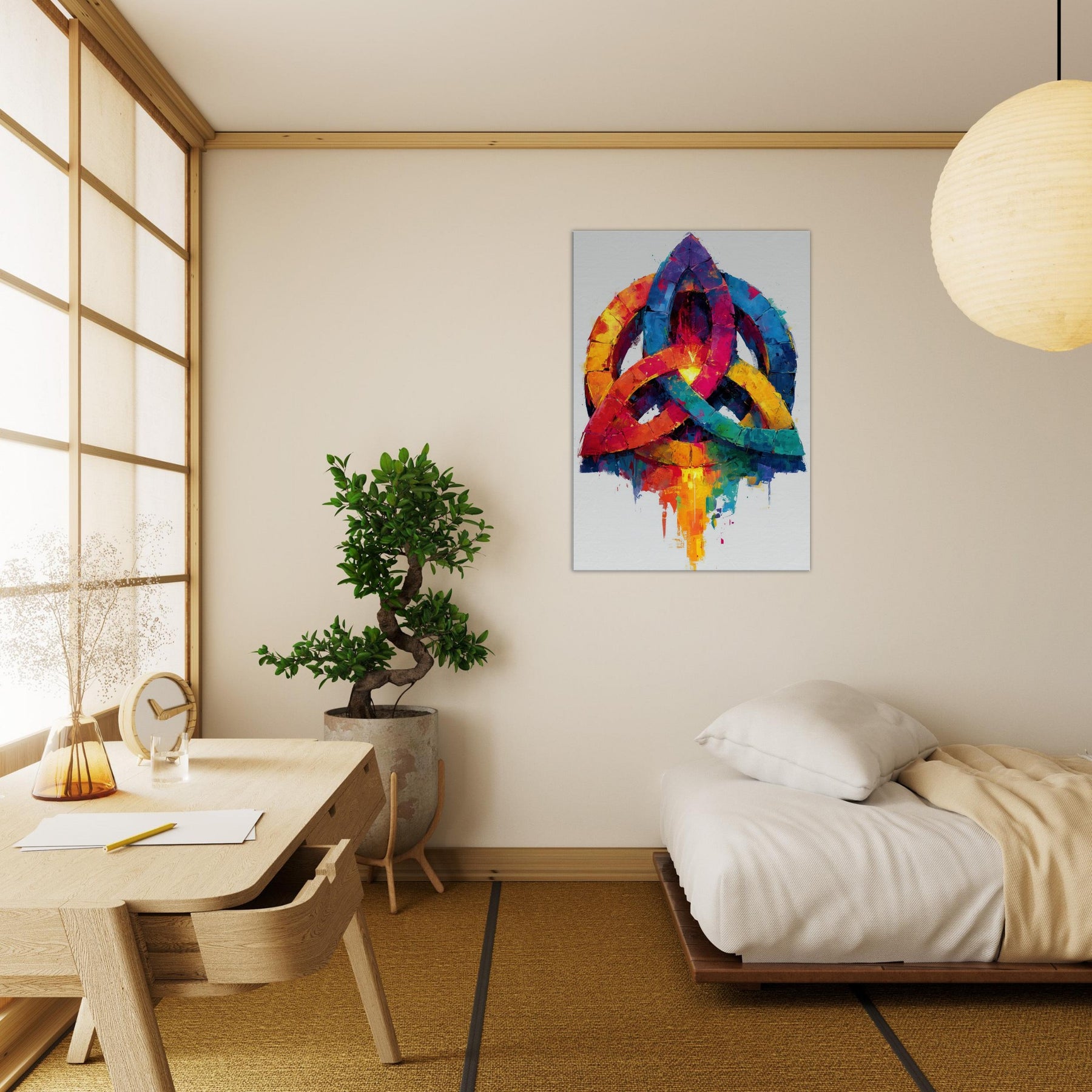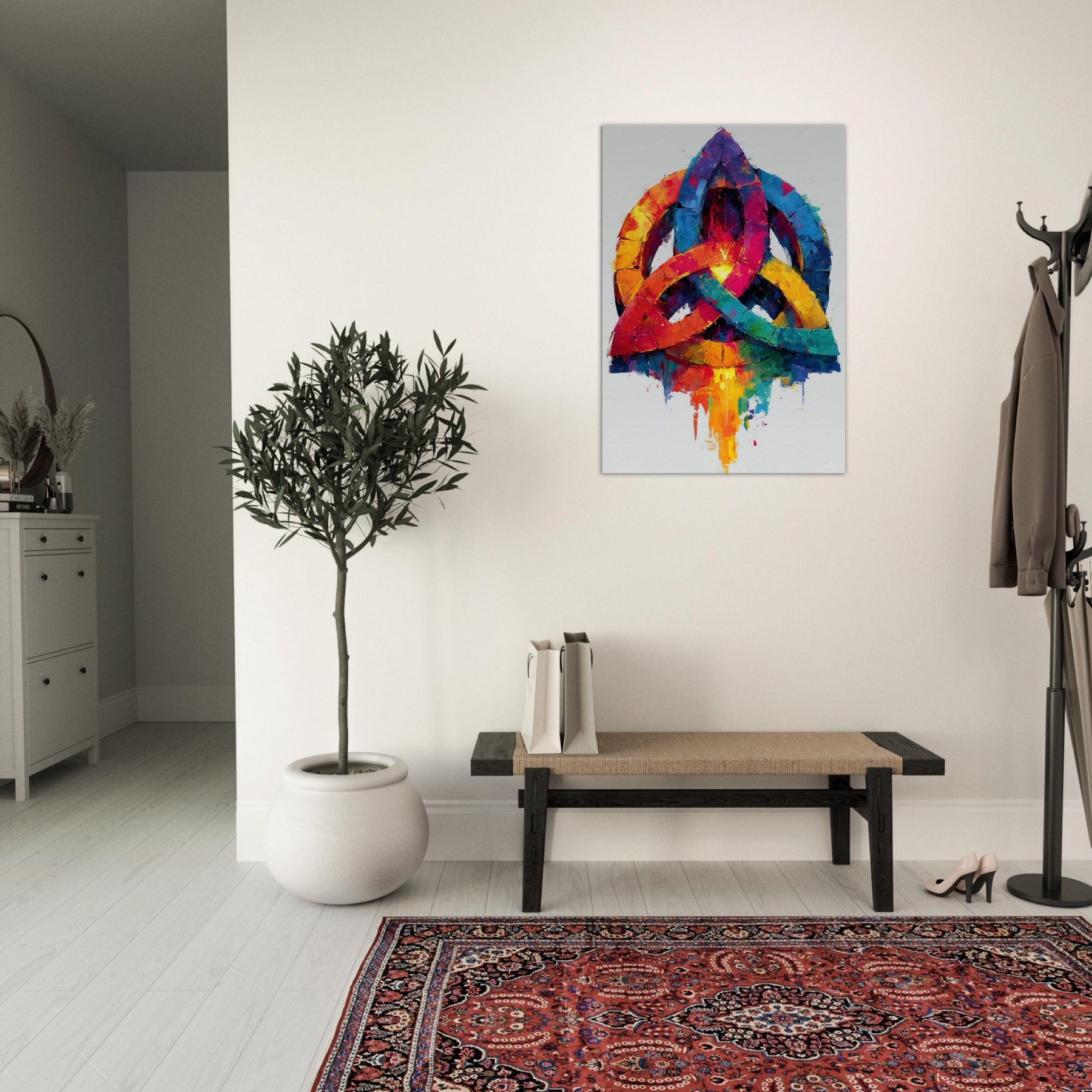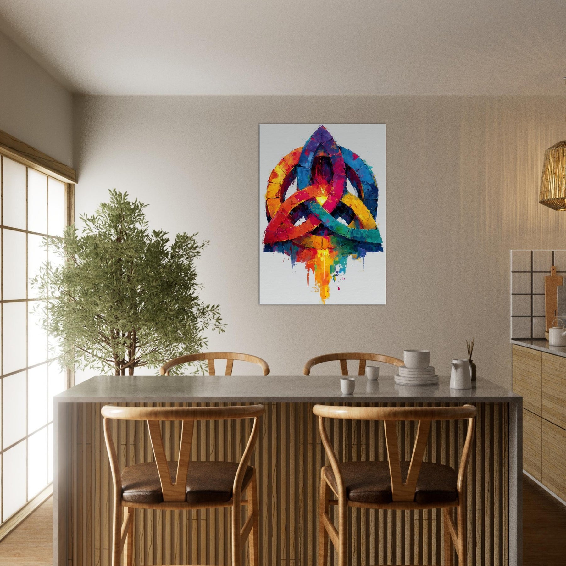 A luminous ode to timeless symbol, the Celtic Triquetra dissolves into a radiant cascade of color and light. Bold, textured strokes weave a luminous knot that seems to breathe, inviting quiet contemplation and luminous energy into any room. The interplay of crimson, gold, cobalt and emerald creates a shimmering aura that shifts with the light, turning a wall into a sanctuary of ceremony and wonder. Perfect for a living room or study, it elevates mood and sparks conversation.