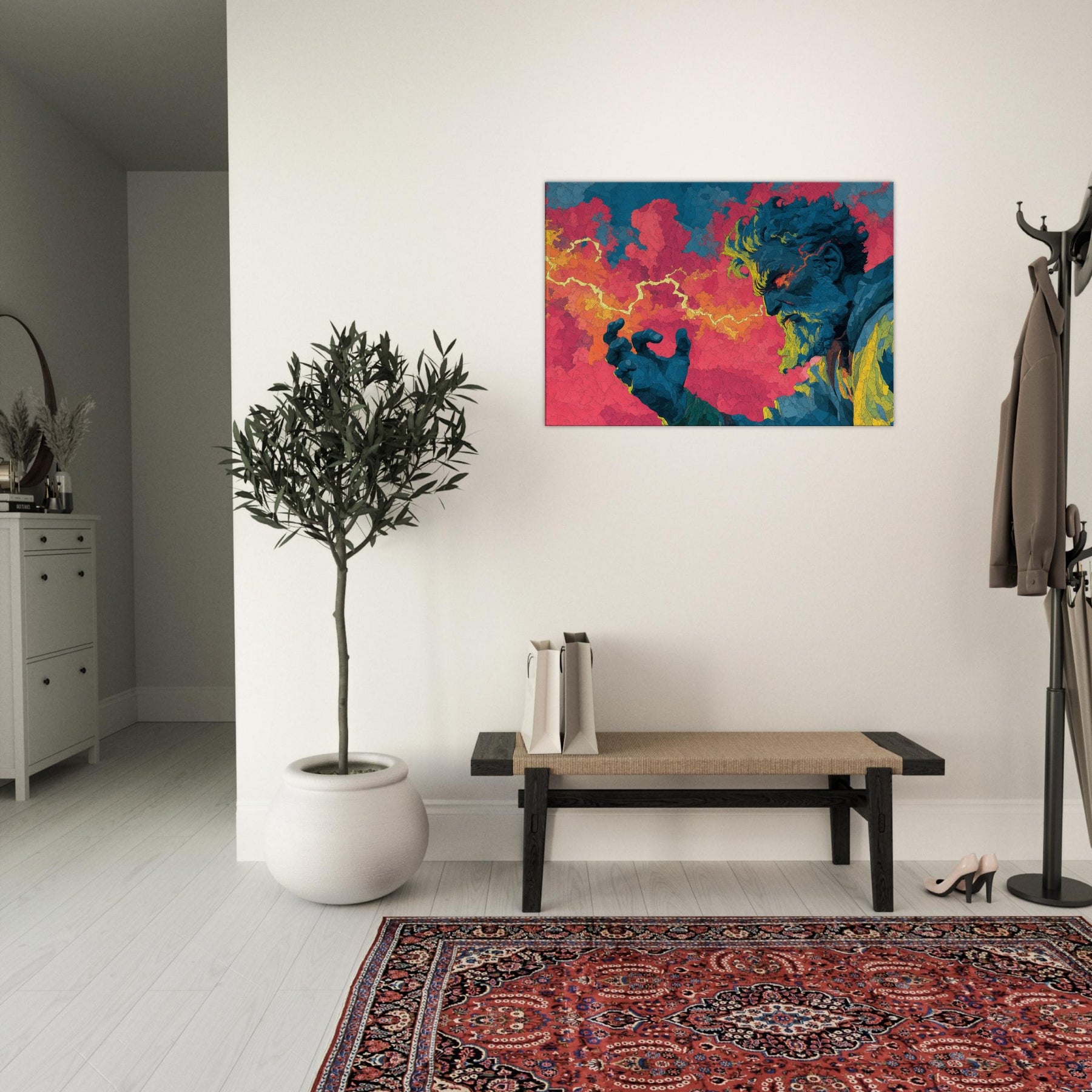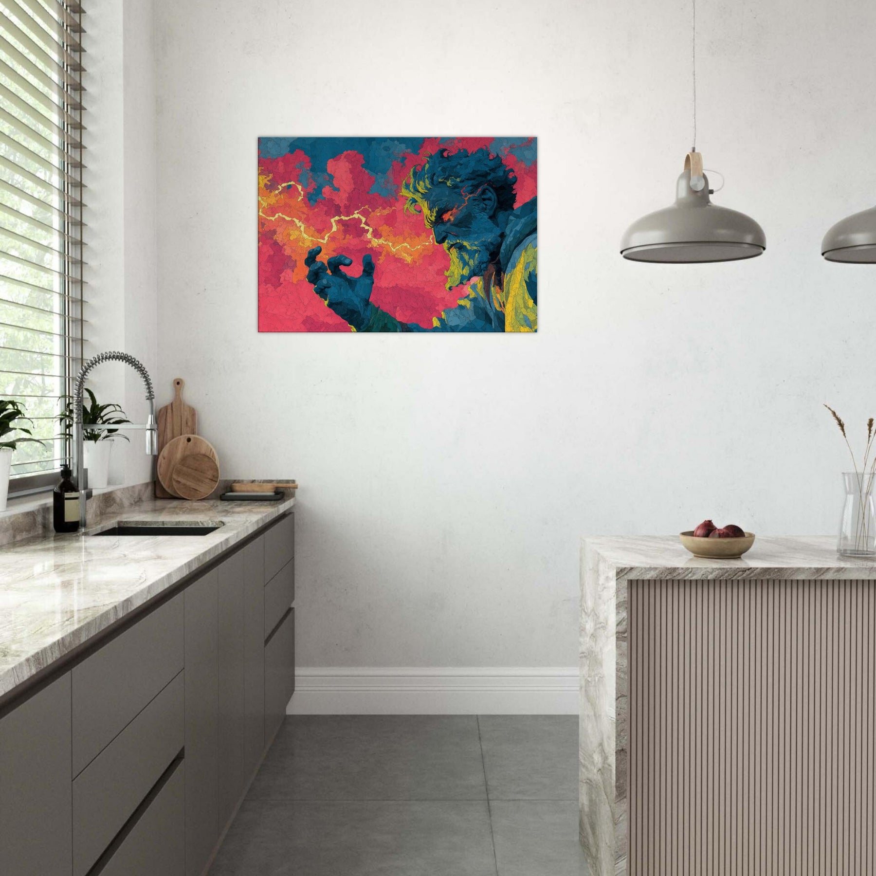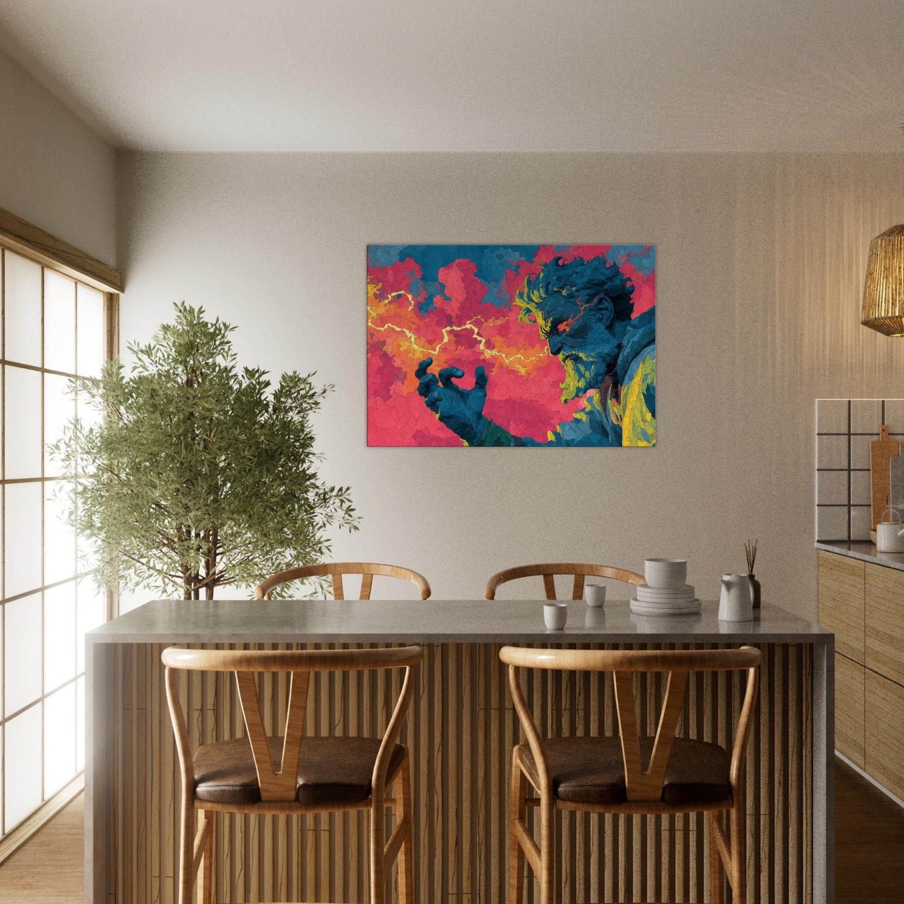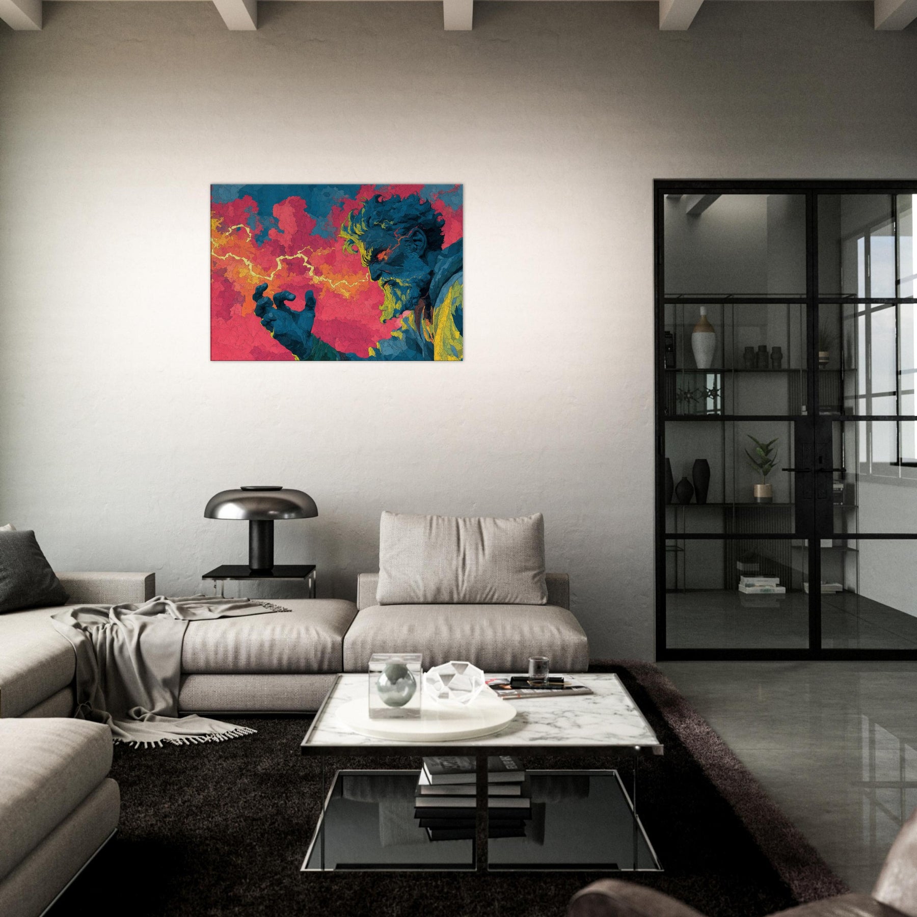 Allow the electric atmosphere of this abstract composition to elevate any room. The palette swirls from stormy blues to sunrise pinks, a tactile echo of thunder and sky forged into emotion rather than form. Zeus, God of Thunder and Sky, becomes a luminous presence whose silhouette seems to crackle with energy as you move closer. The piece invites contemplation and conversation, turning a wall into a doorway of imagination perfect for a living room, study, or entry that craves atmosphere and awe.