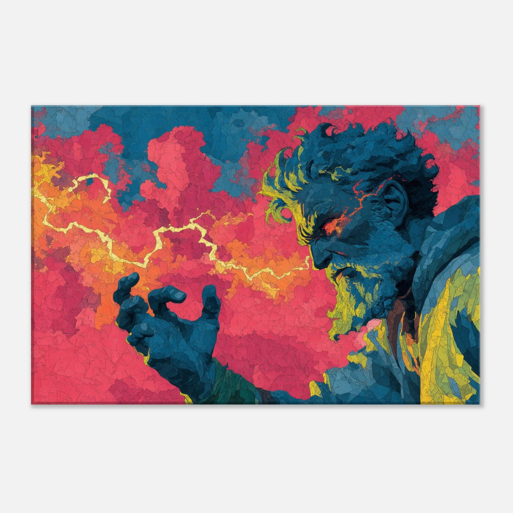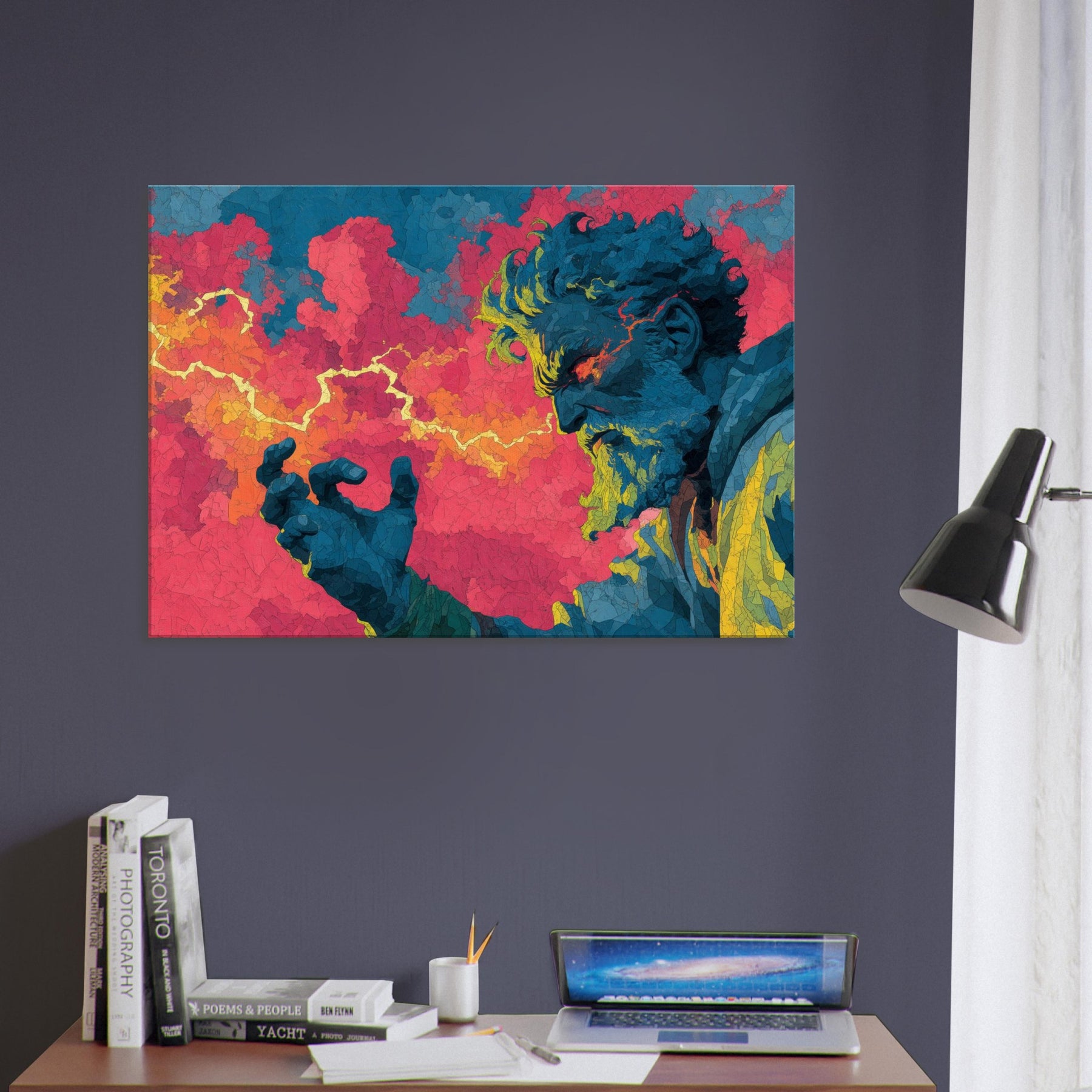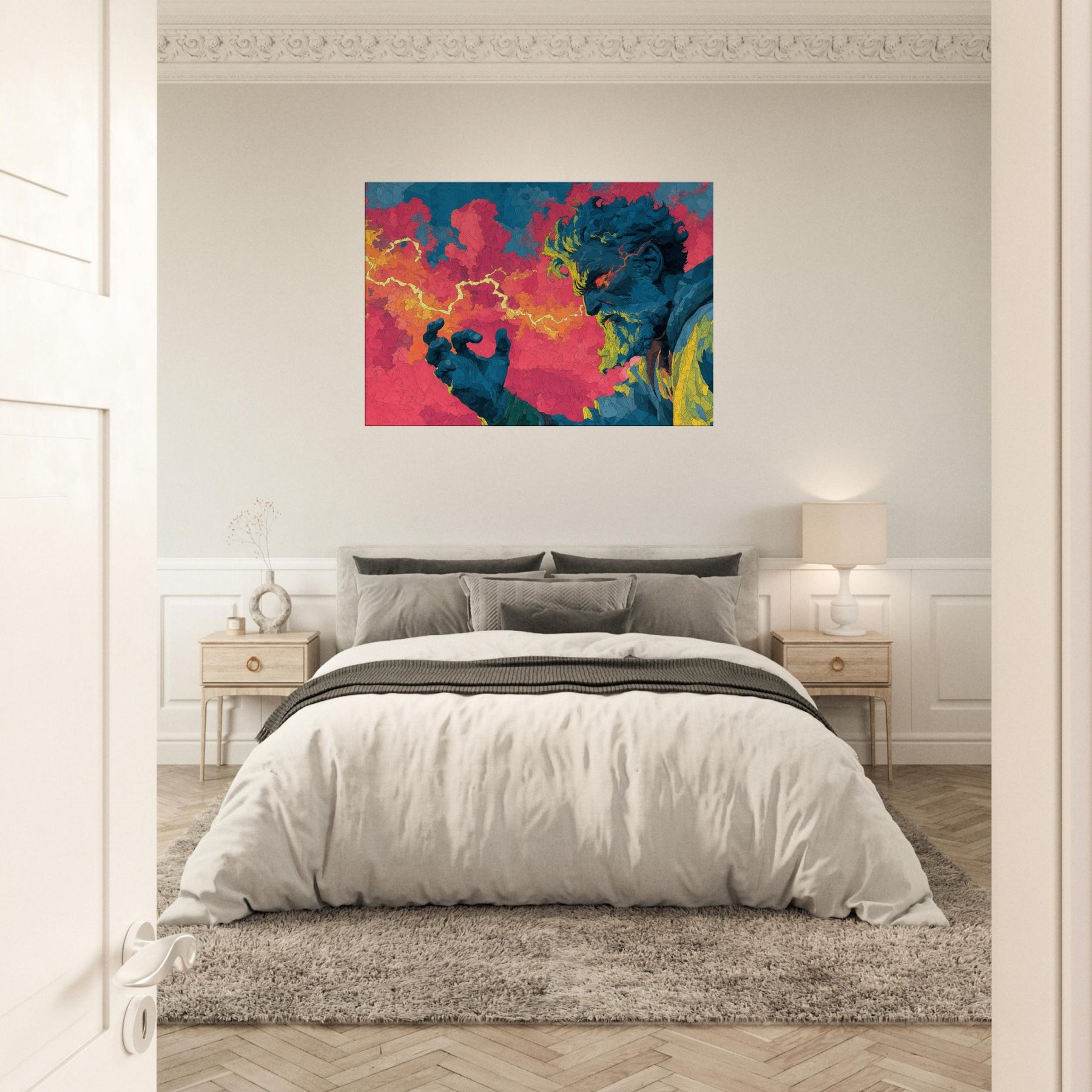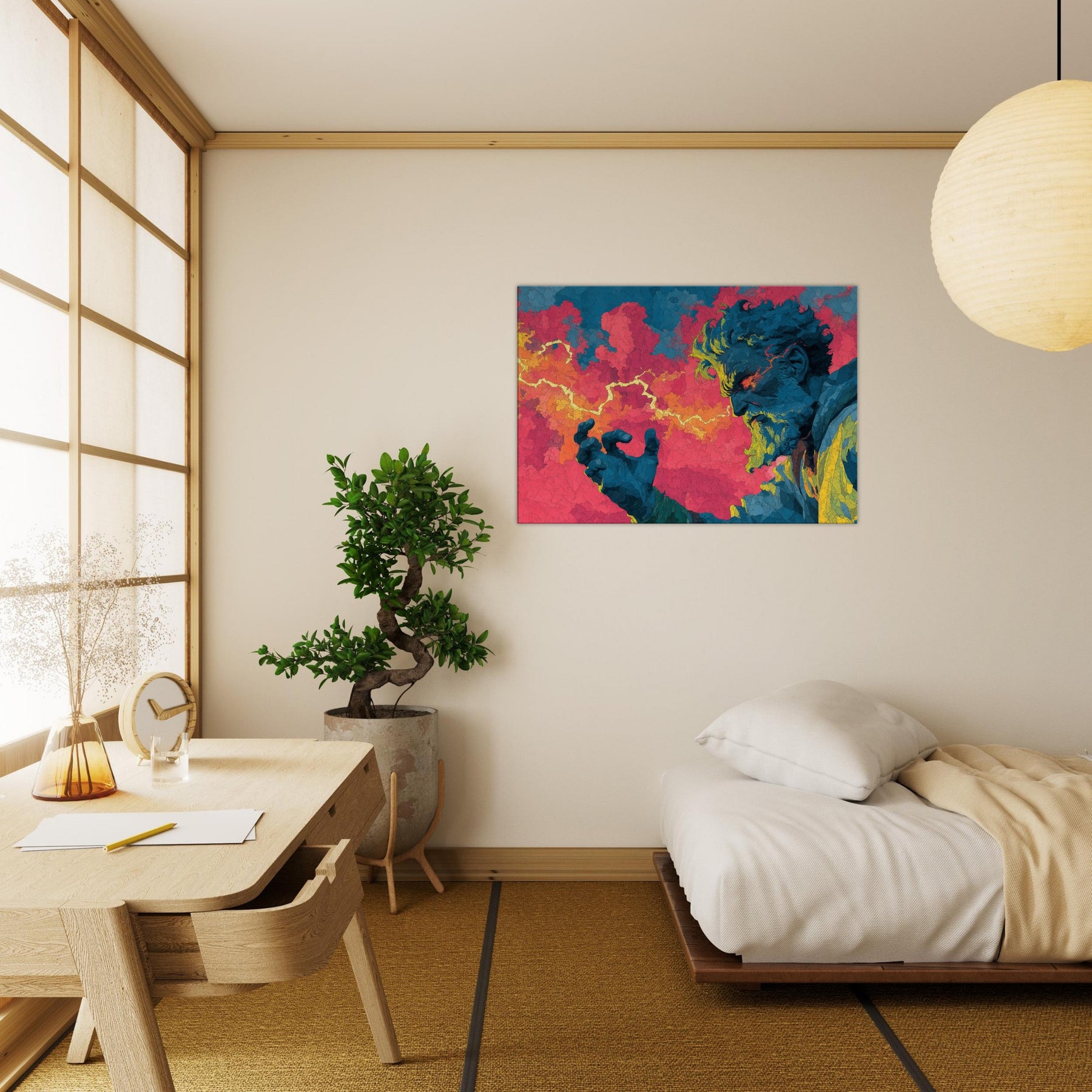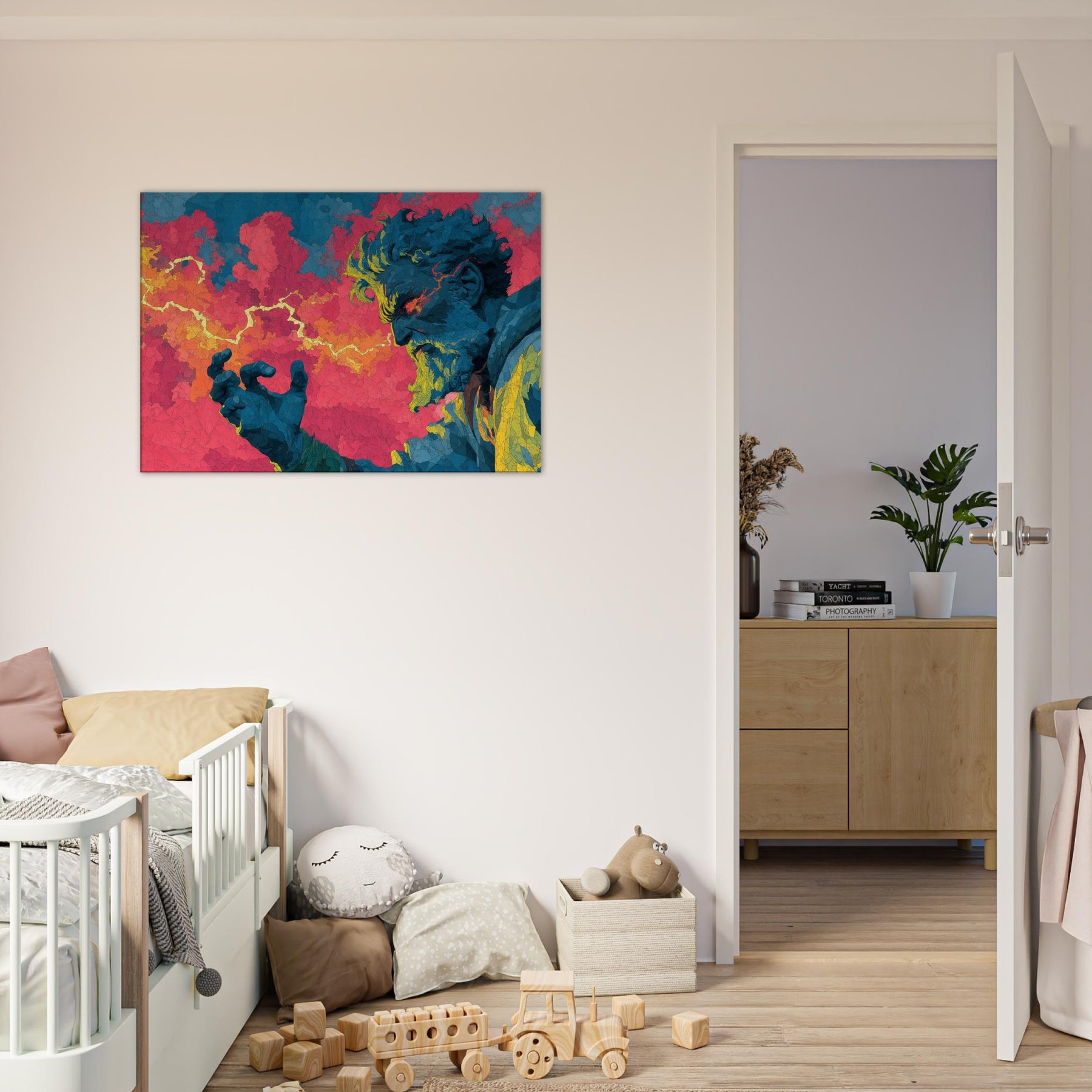 Allow the electric atmosphere of this abstract composition to elevate any room. The palette swirls from stormy blues to sunrise pinks, a tactile echo of thunder and sky forged into emotion rather than form. Zeus, God of Thunder and Sky, becomes a luminous presence whose silhouette seems to crackle with energy as you move closer. The piece invites contemplation and conversation, turning a wall into a doorway of imagination perfect for a living room, study, or entry that craves atmosphere and awe.