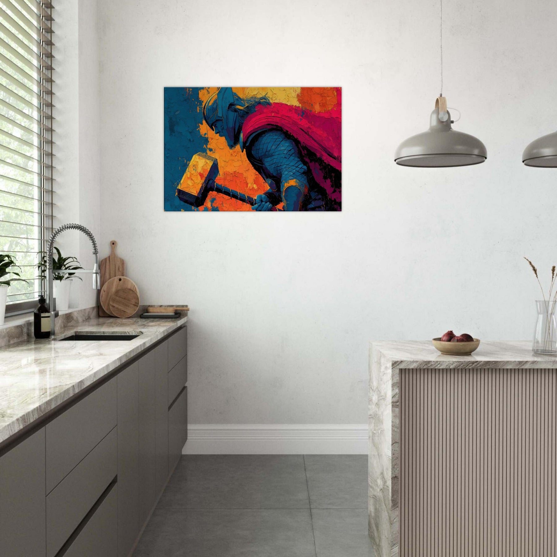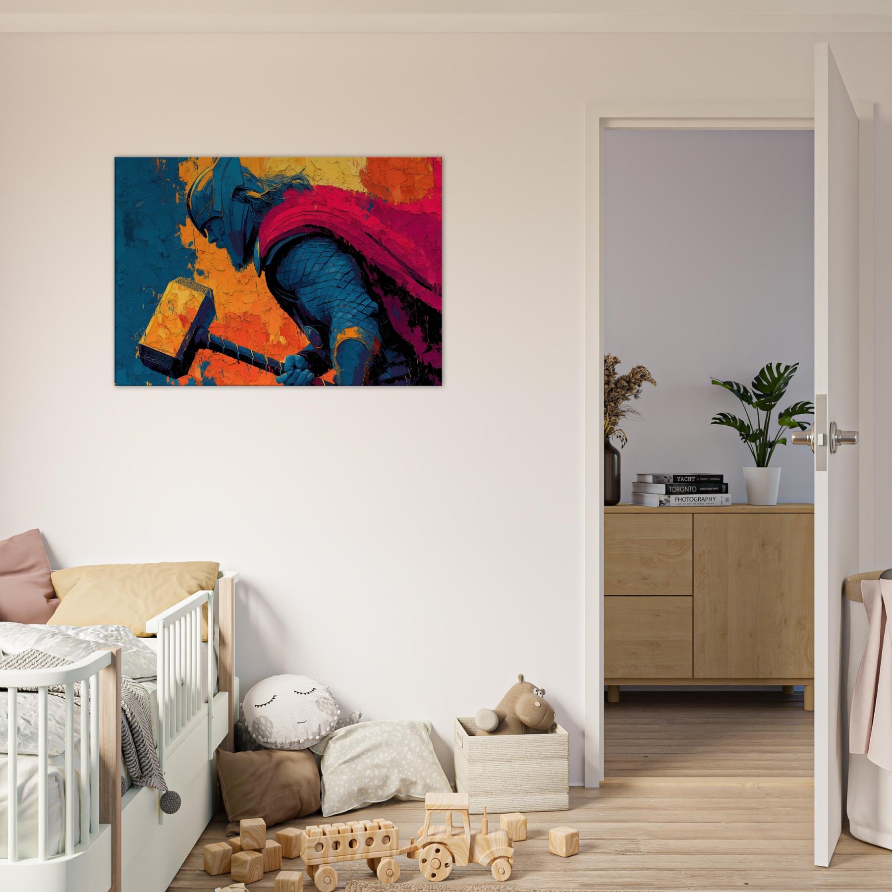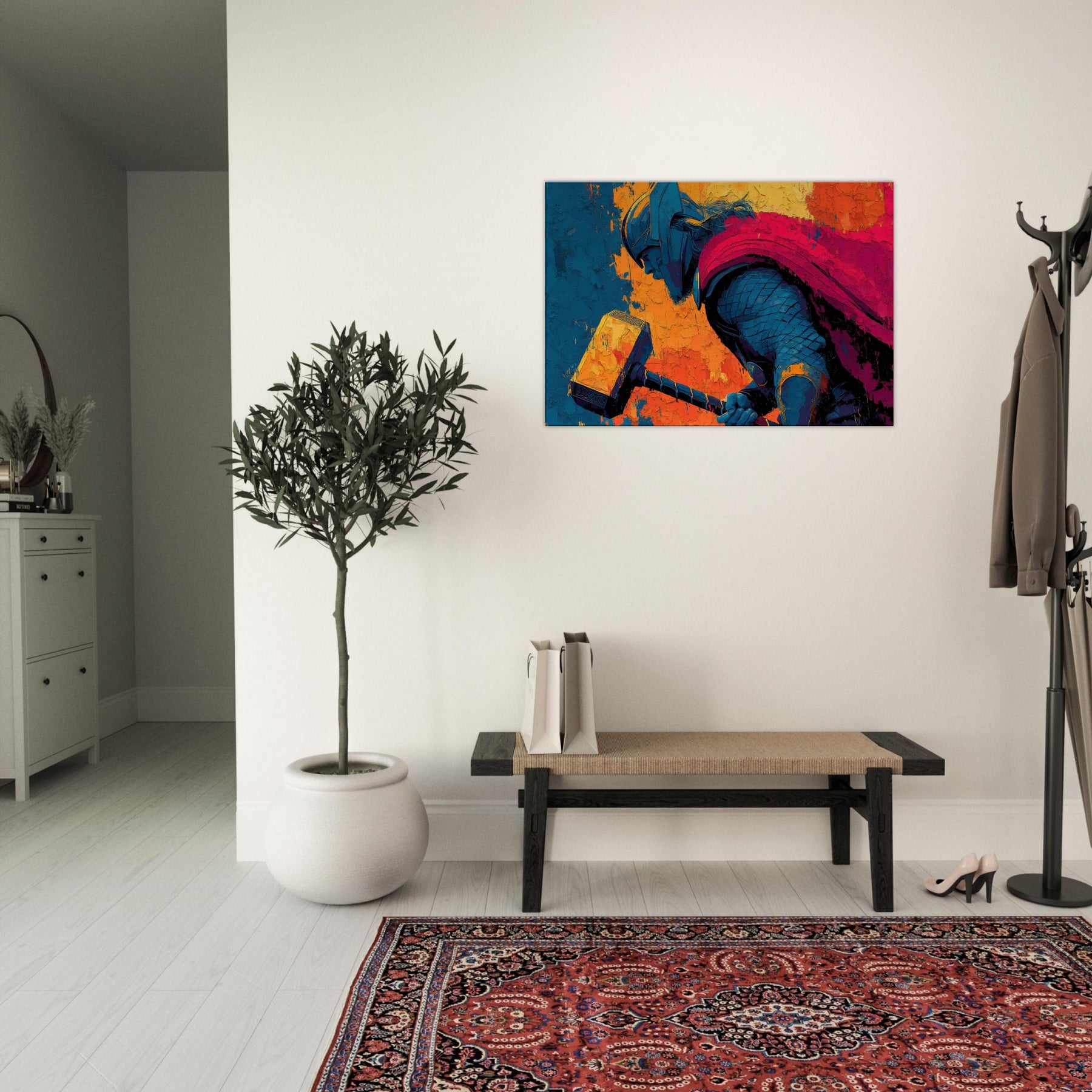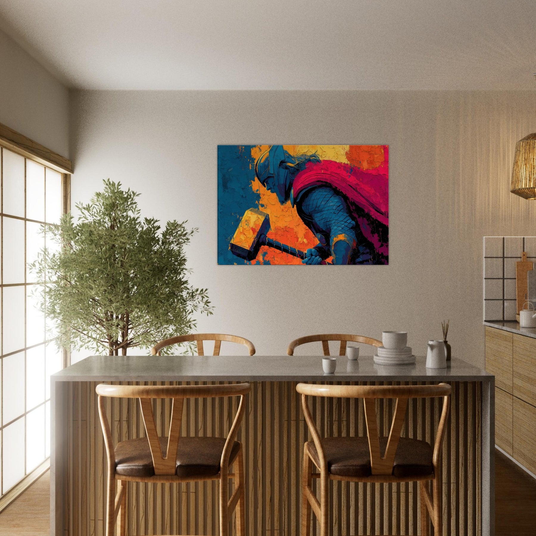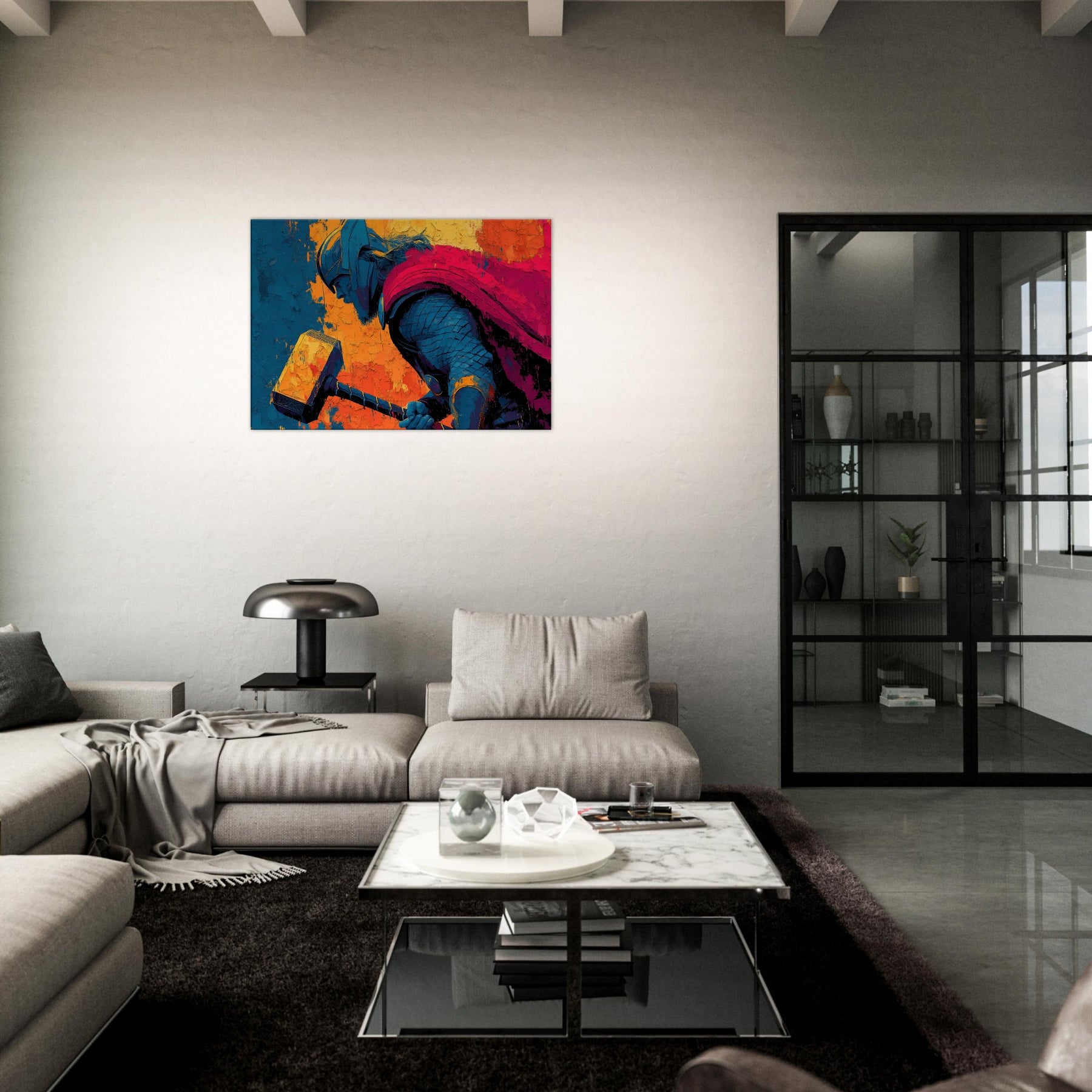 Feel the mythic storm settle into your living room as Thor, God of Thunder Wielding Mjölnir strides from luminous tides of color. Abstract currents braid the armor with electric blues and molten oranges, inviting the eye to travel across the surface like a storm washed horizon. The figure anchors the room with strength and grace, turning walls into a portal where heroism and imagination meet. Hang this piece, and the air hums with energy, conversation, and quiet reverence.