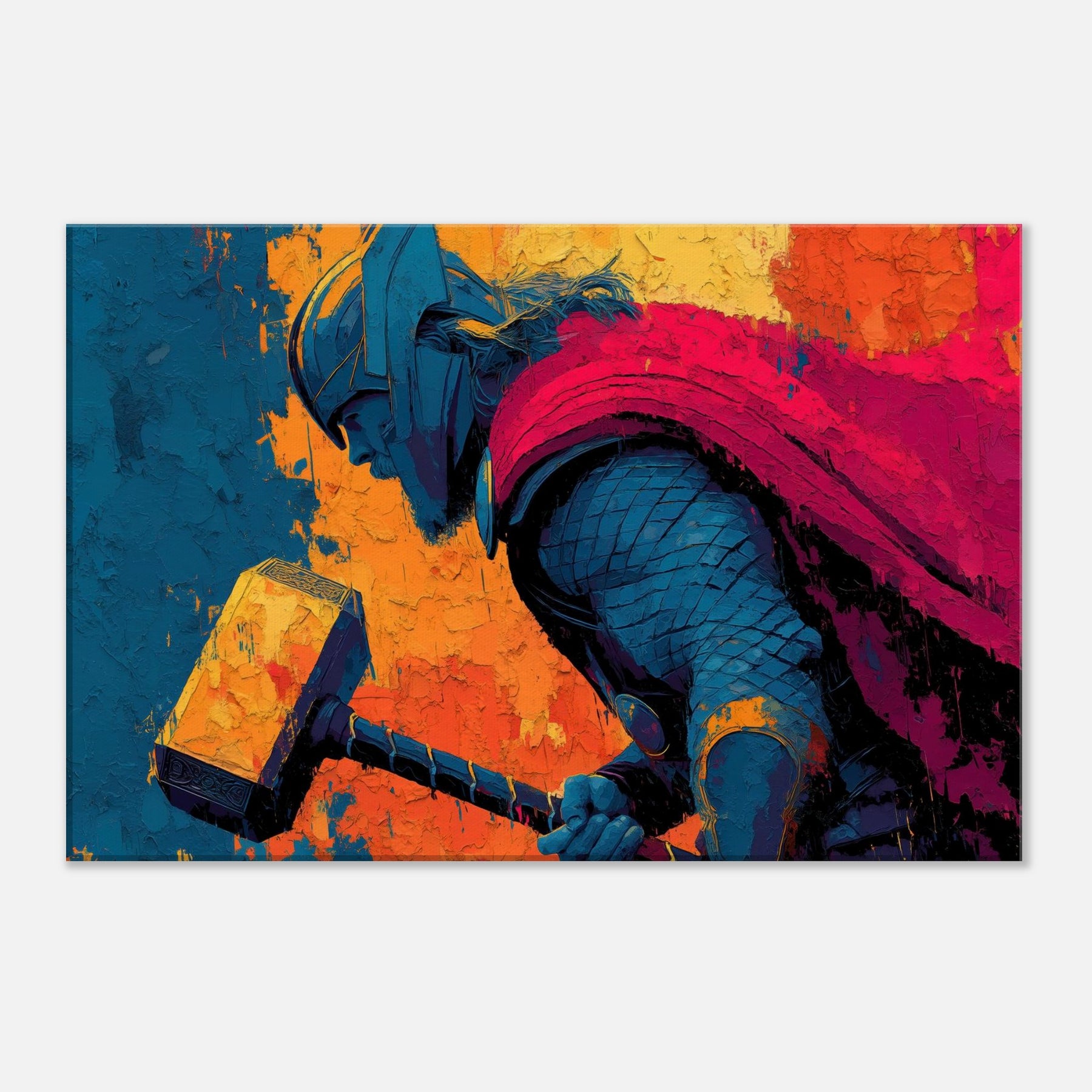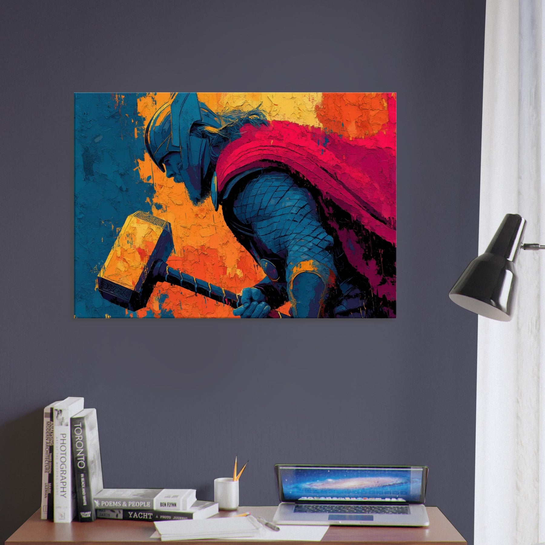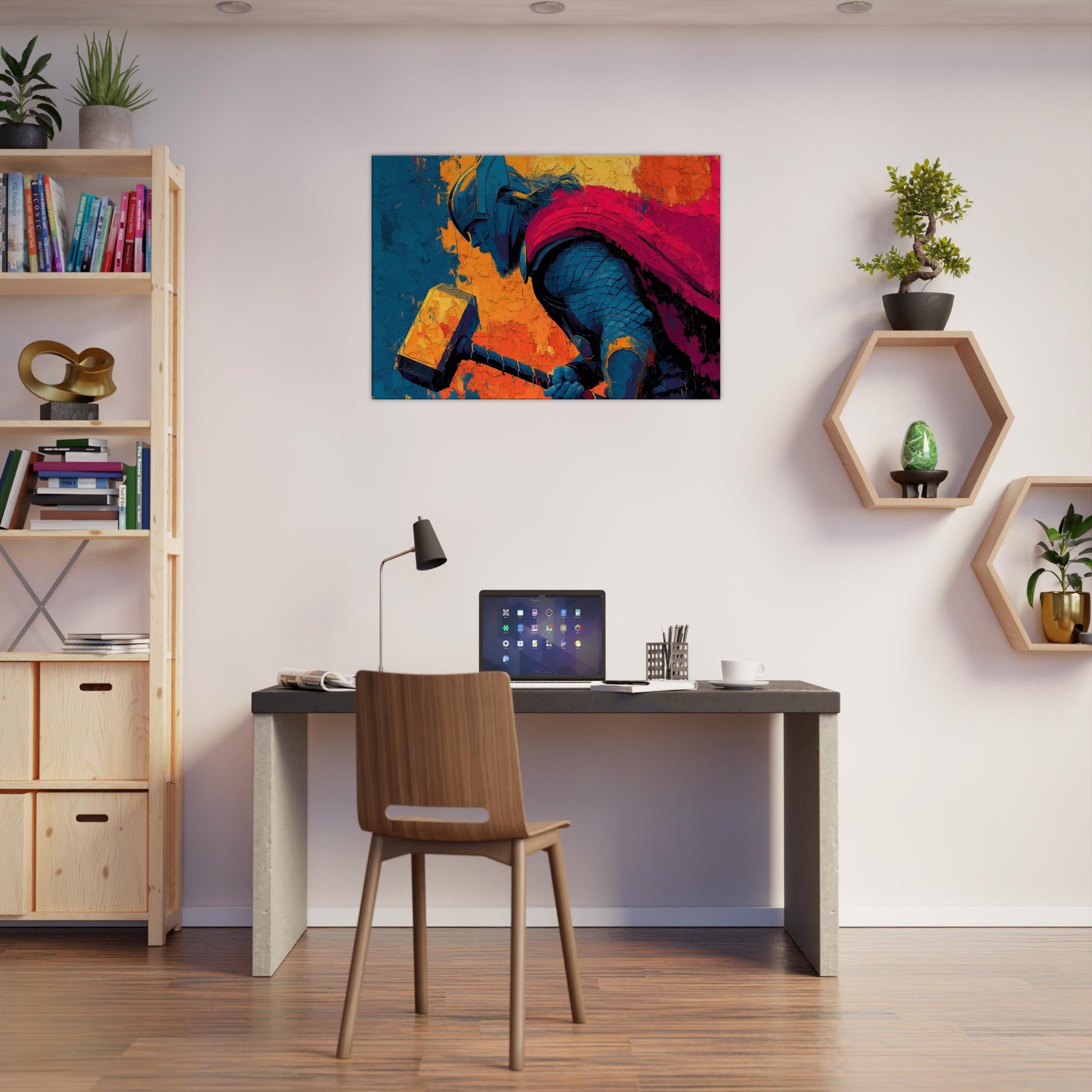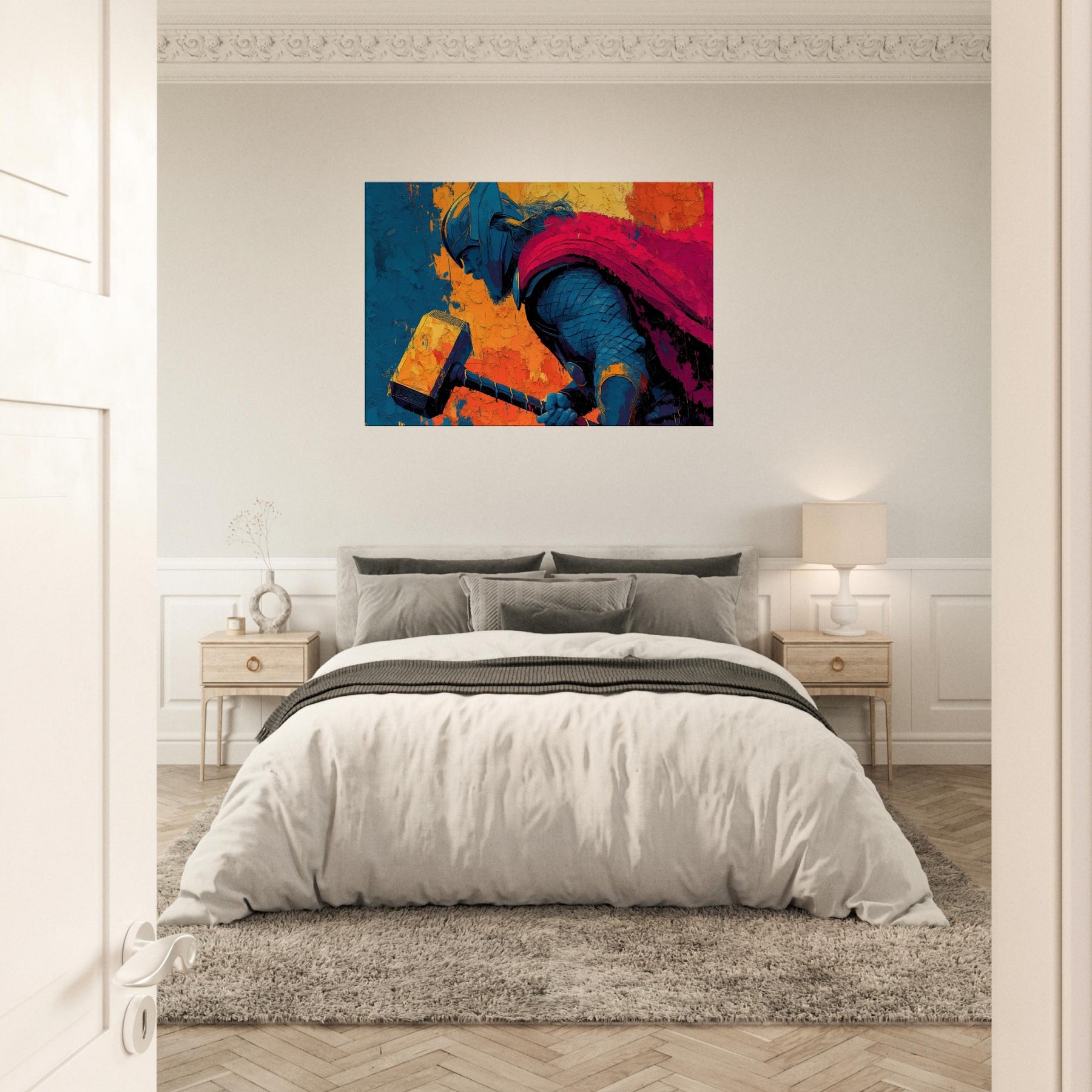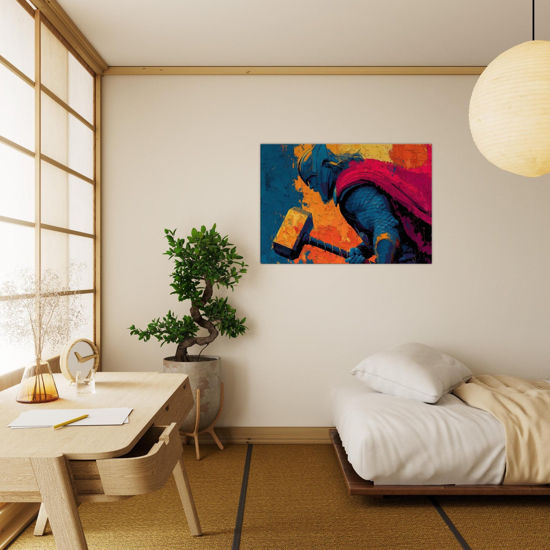Feel the mythic storm settle into your living room as Thor, God of Thunder Wielding Mjölnir strides from luminous tides of color. Abstract currents braid the armor with electric blues and molten oranges, inviting the eye to travel across the surface like a storm washed horizon. The figure anchors the room with strength and grace, turning walls into a portal where heroism and imagination meet. Hang this piece, and the air hums with energy, conversation, and quiet reverence.