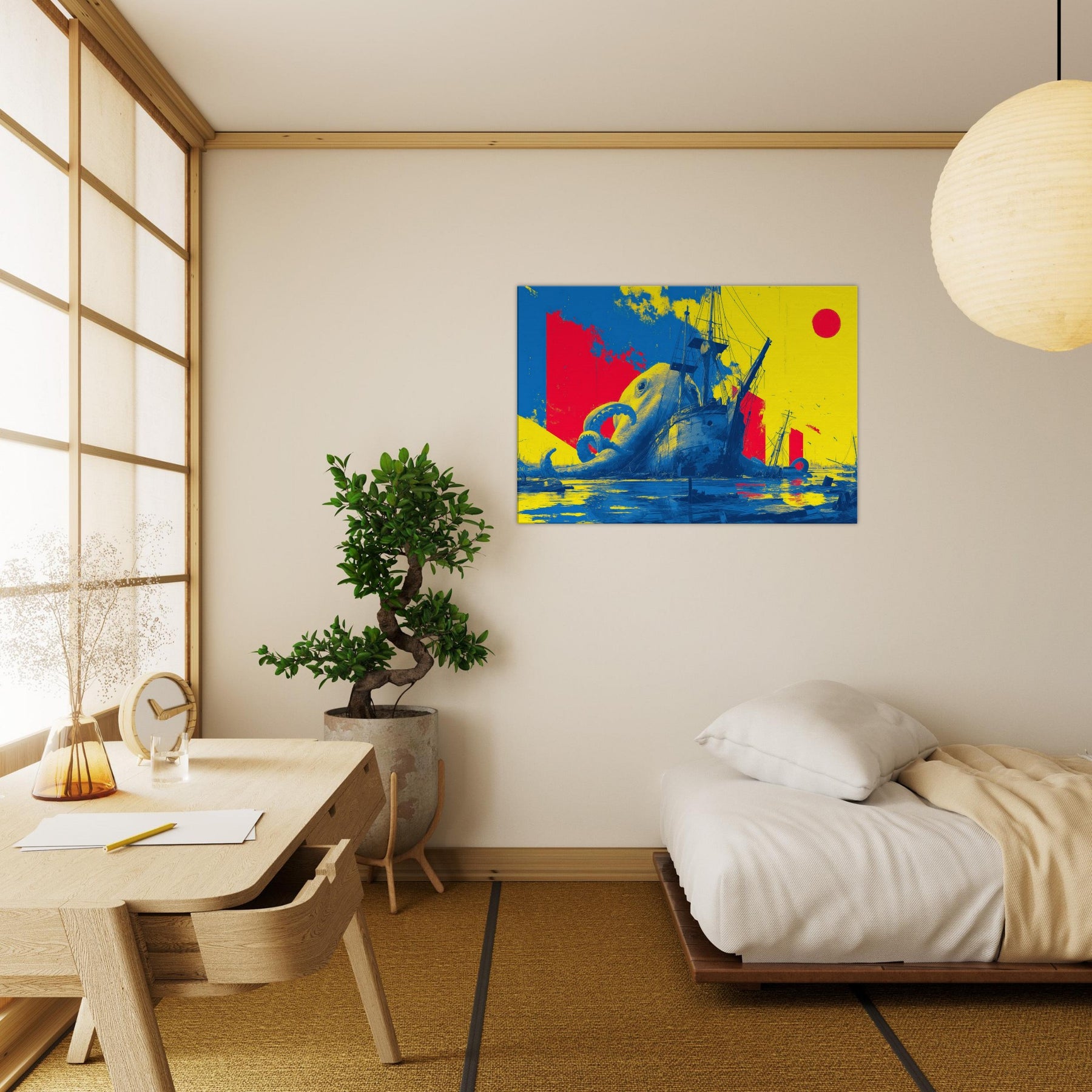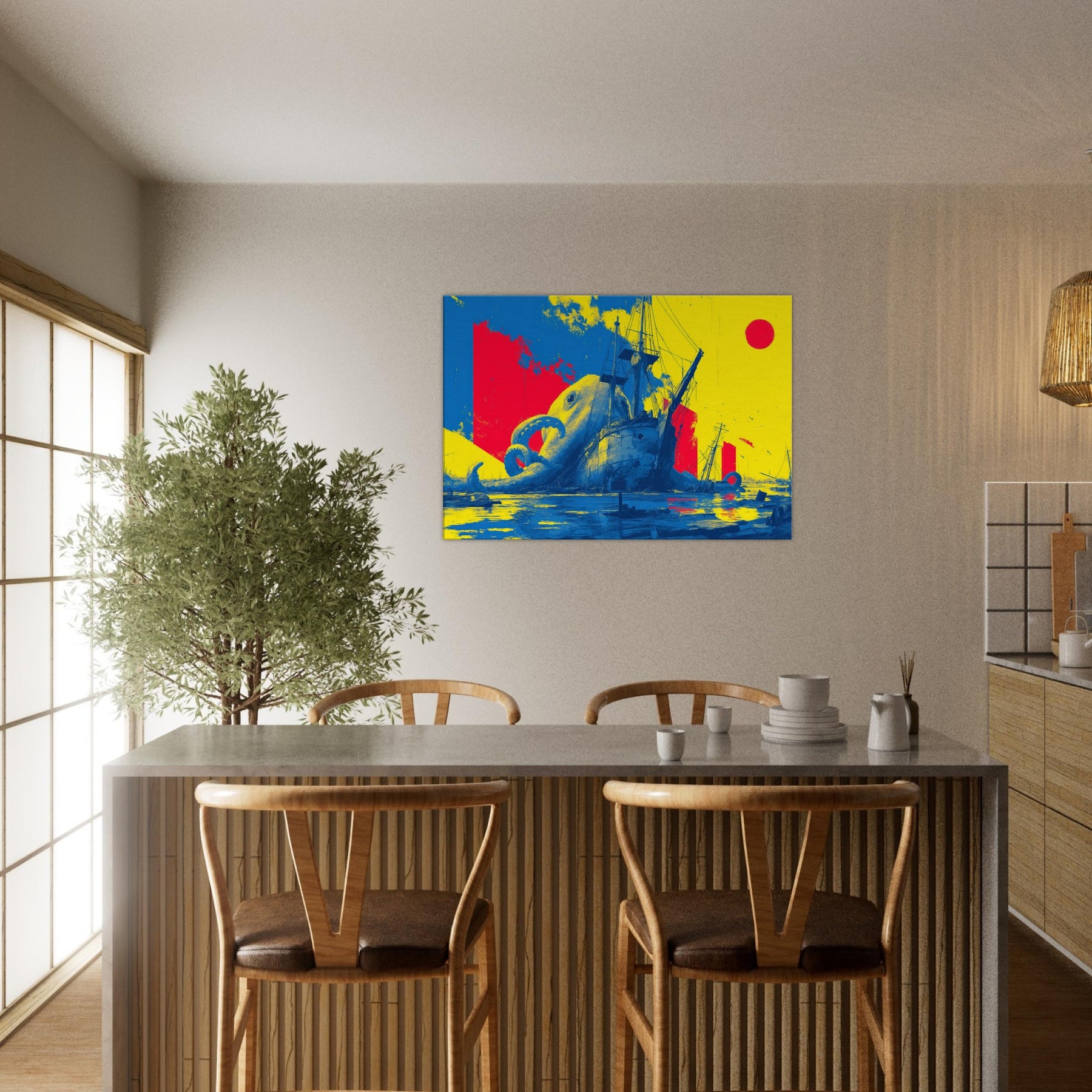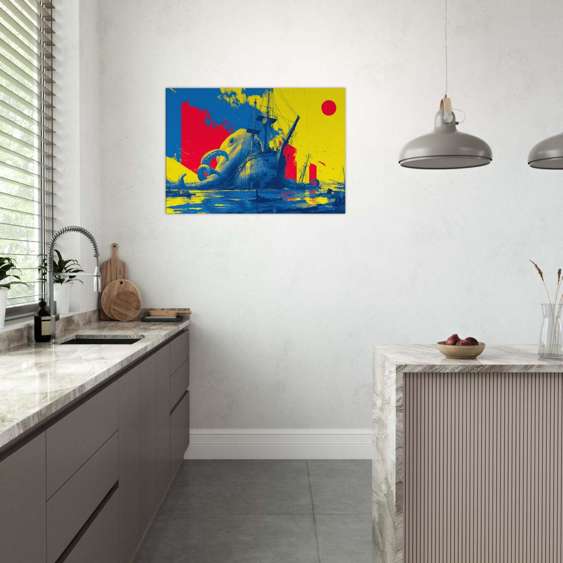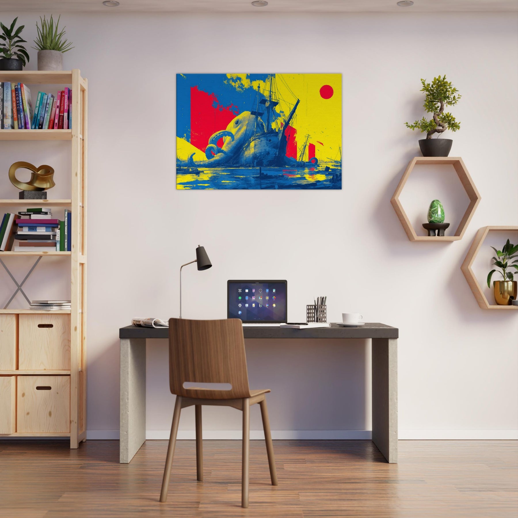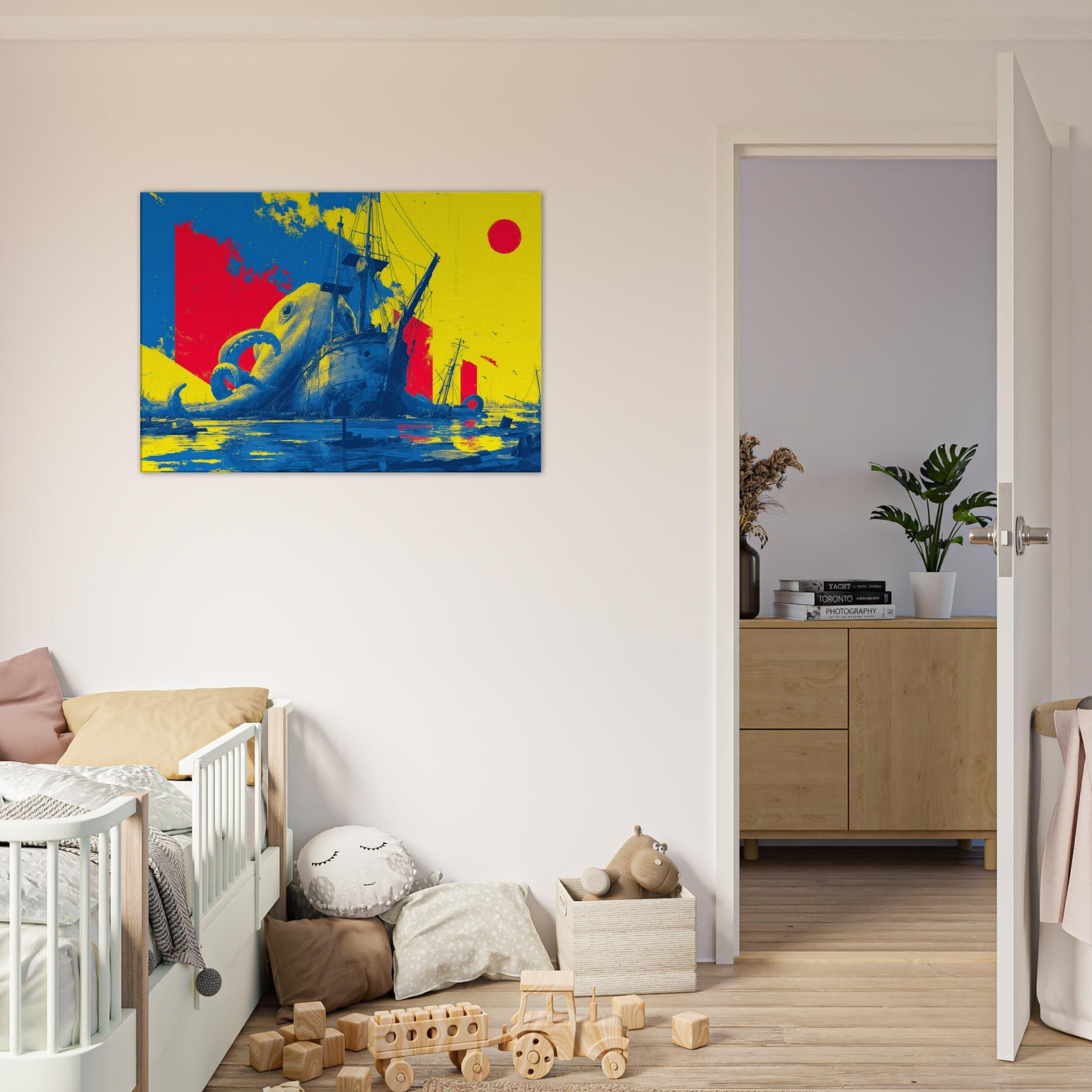Let the Giant Kraken Emerging from the Sea rise in your room as a symbolic tide of wonder. This abstract composition fuses cobalt shadows with electric yellows and scarlet accents, creating a mood that is both ominous and luminous. The dynamic brushwork pulls your gaze toward the horizon, while the textured, painterly lines suggest wind and foam. Perfect above a sofa or in a hallway, it enlivens space with drama, mystery, and a fearless sense of scale.