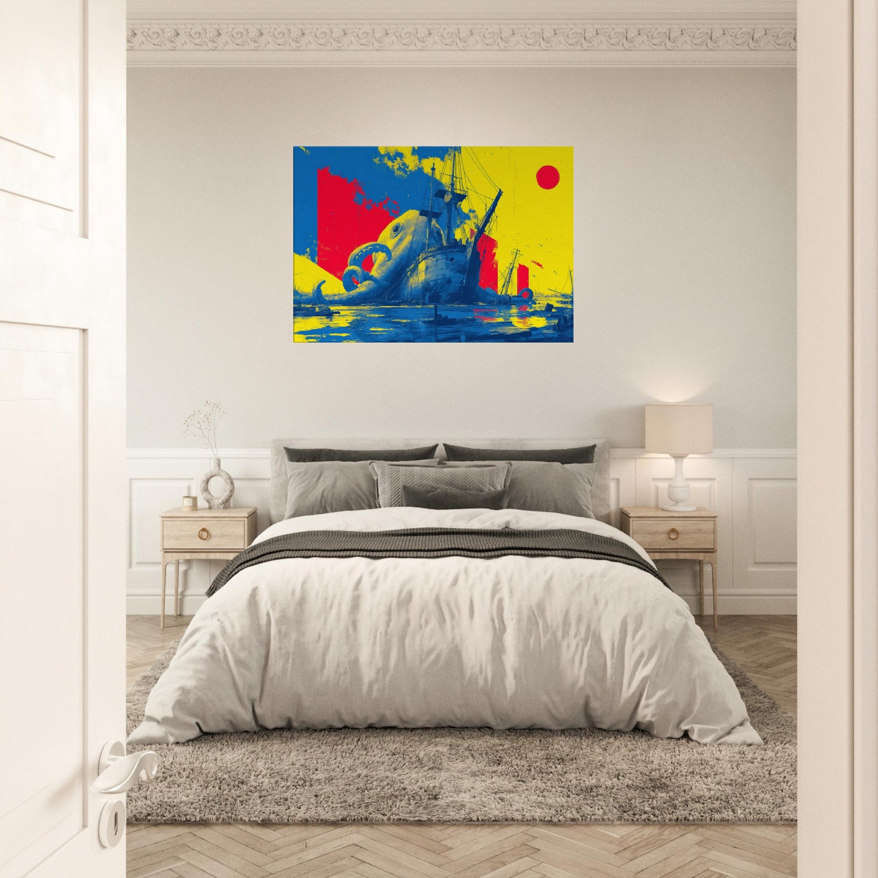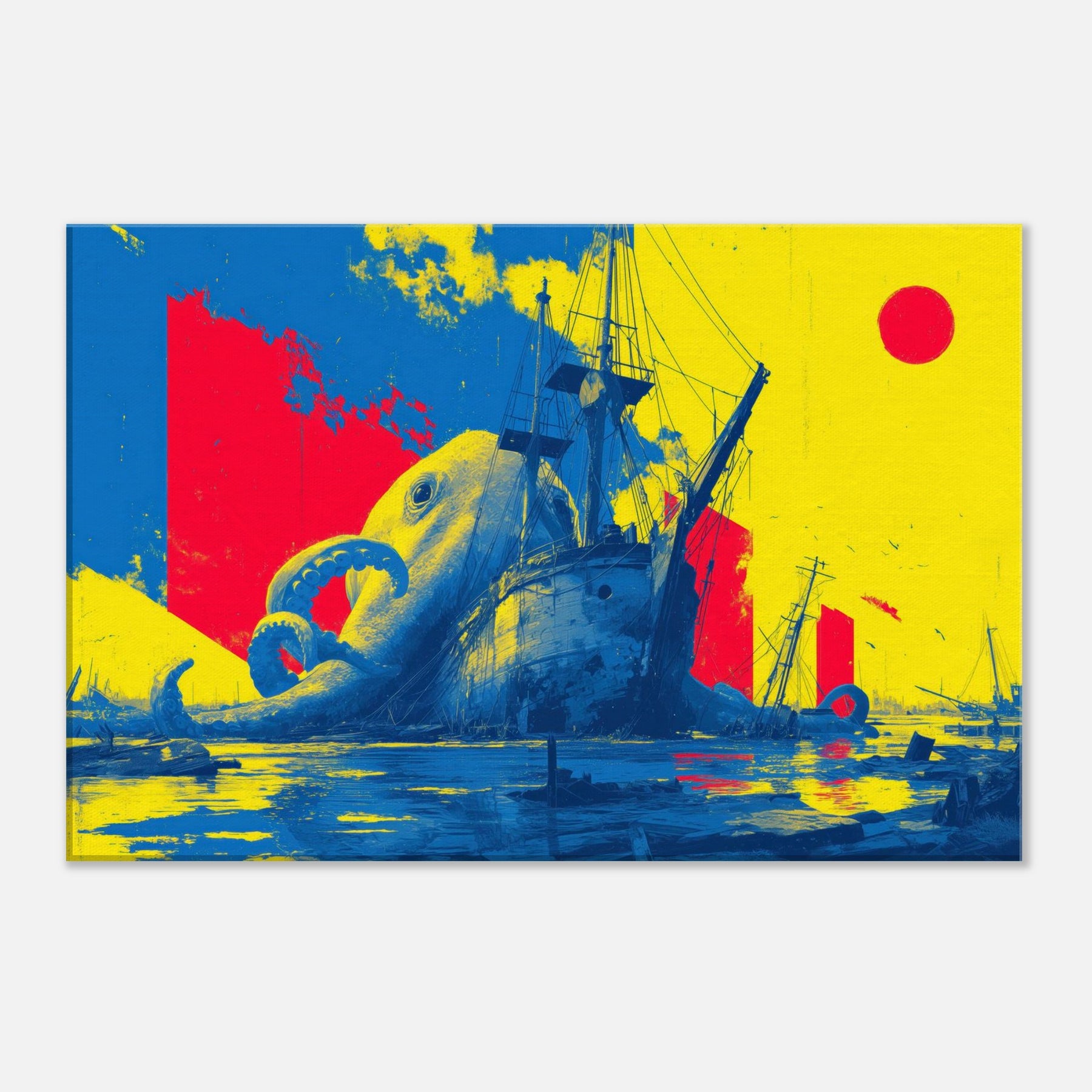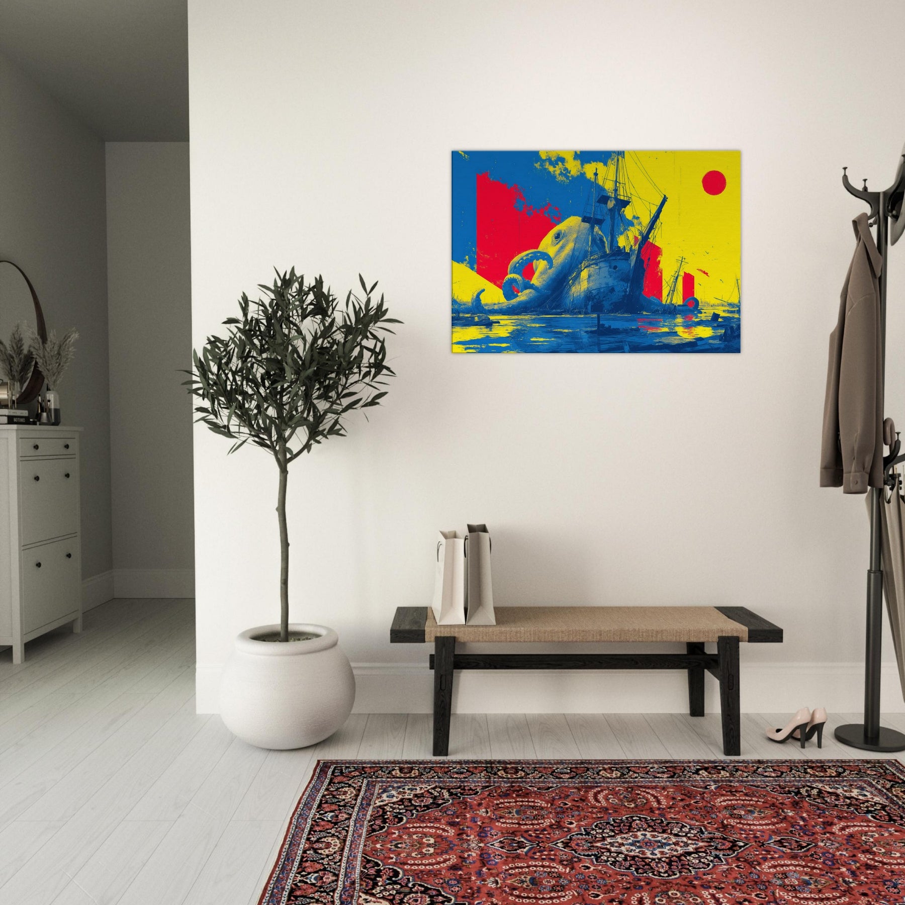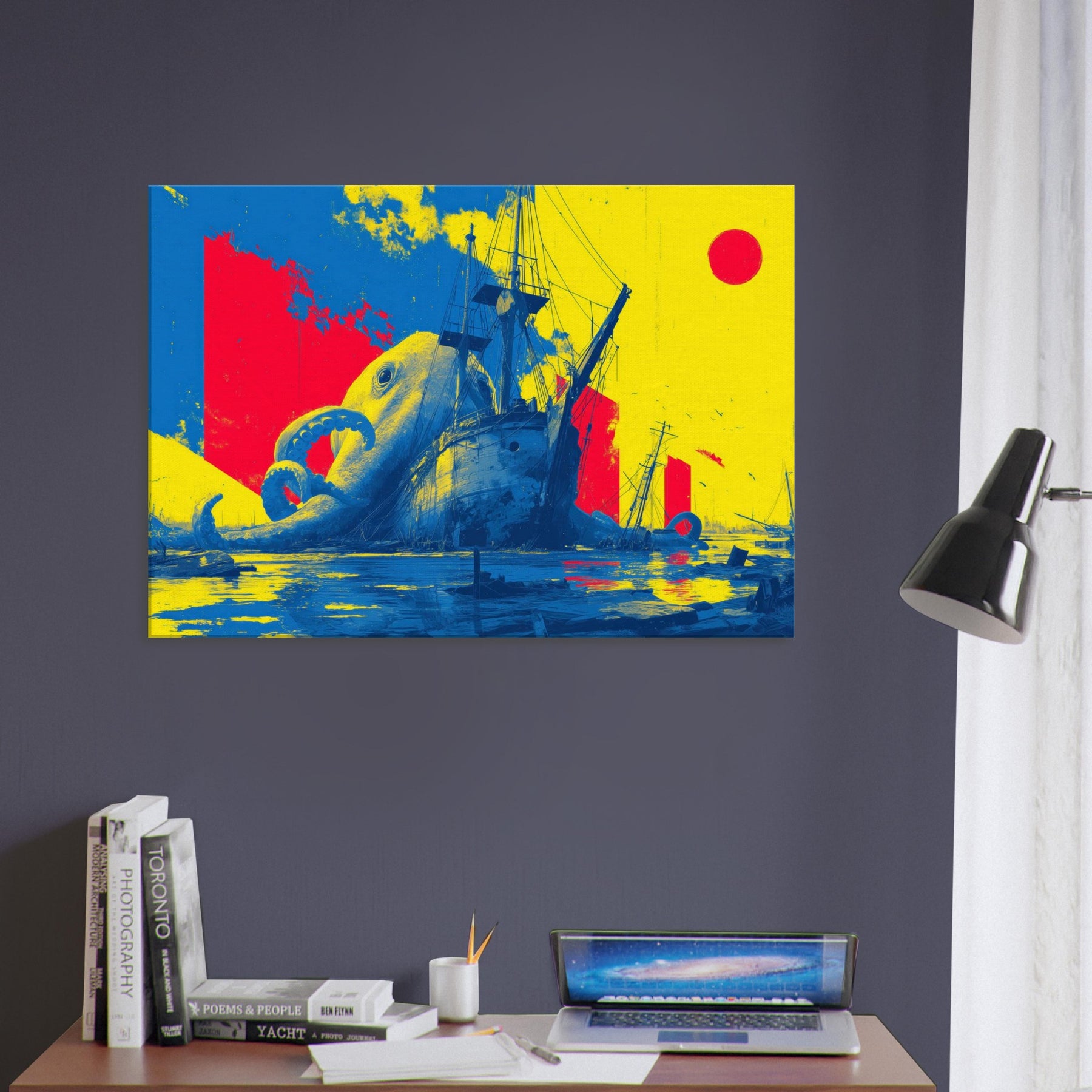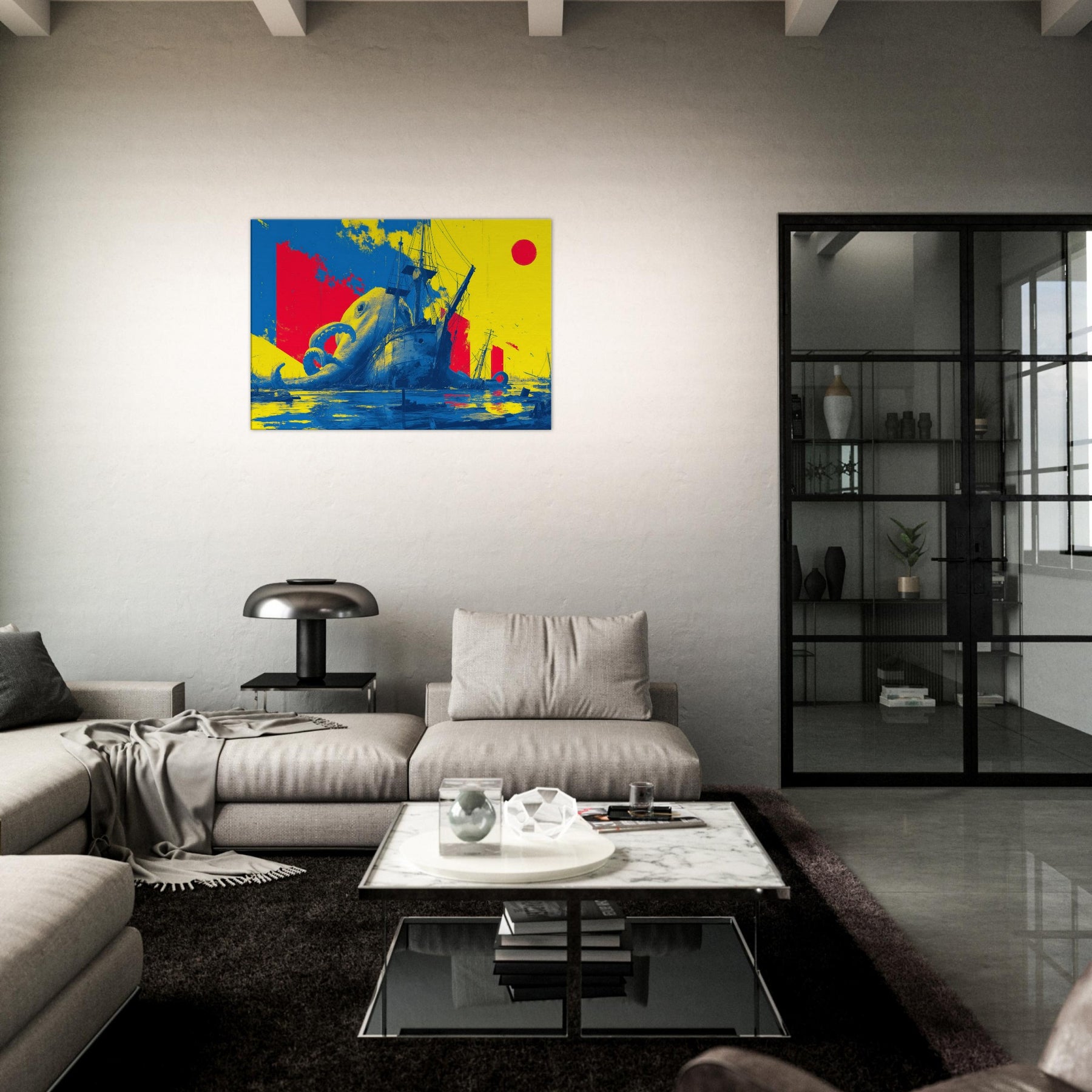Let the Giant Kraken Emerging from the Sea rise in your room as a symbolic tide of wonder. This abstract composition fuses cobalt shadows with electric yellows and scarlet accents, creating a mood that is both ominous and luminous. The dynamic brushwork pulls your gaze toward the horizon, while the textured, painterly lines suggest wind and foam. Perfect above a sofa or in a hallway, it enlivens space with drama, mystery, and a fearless sense of scale.