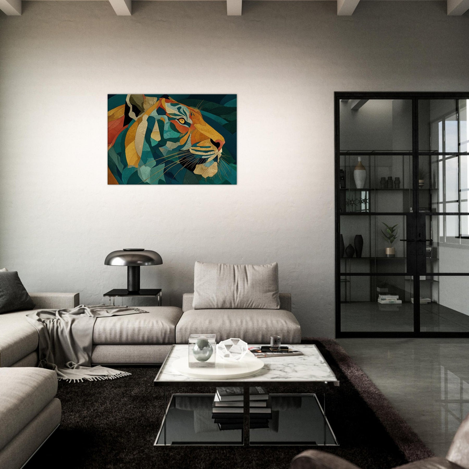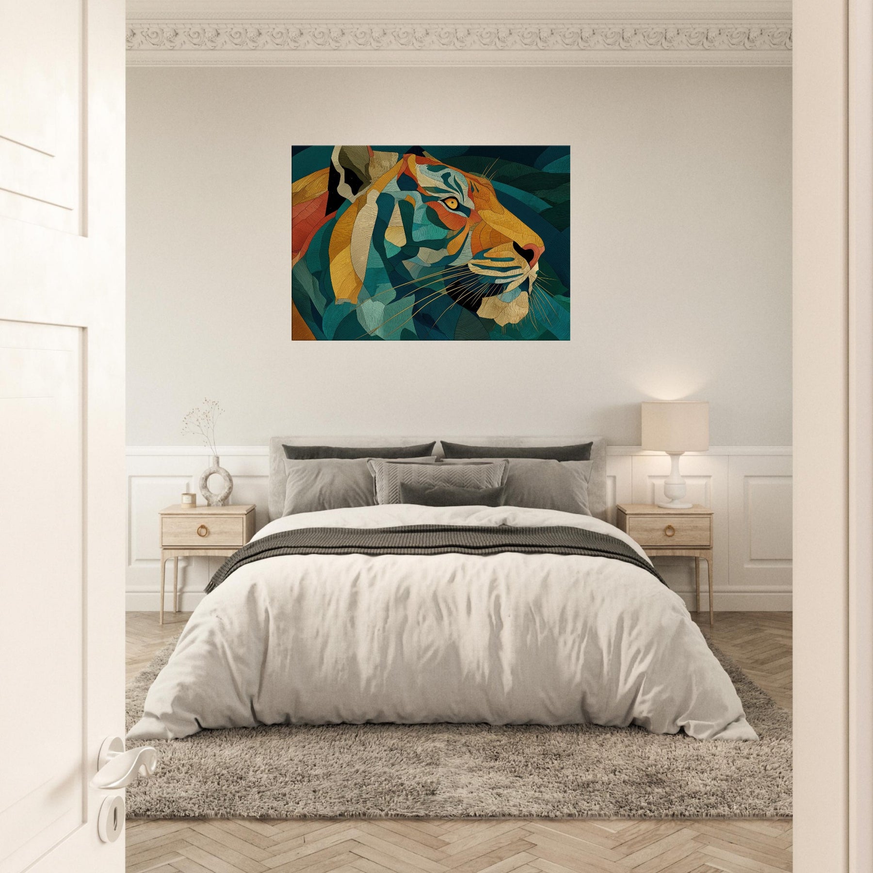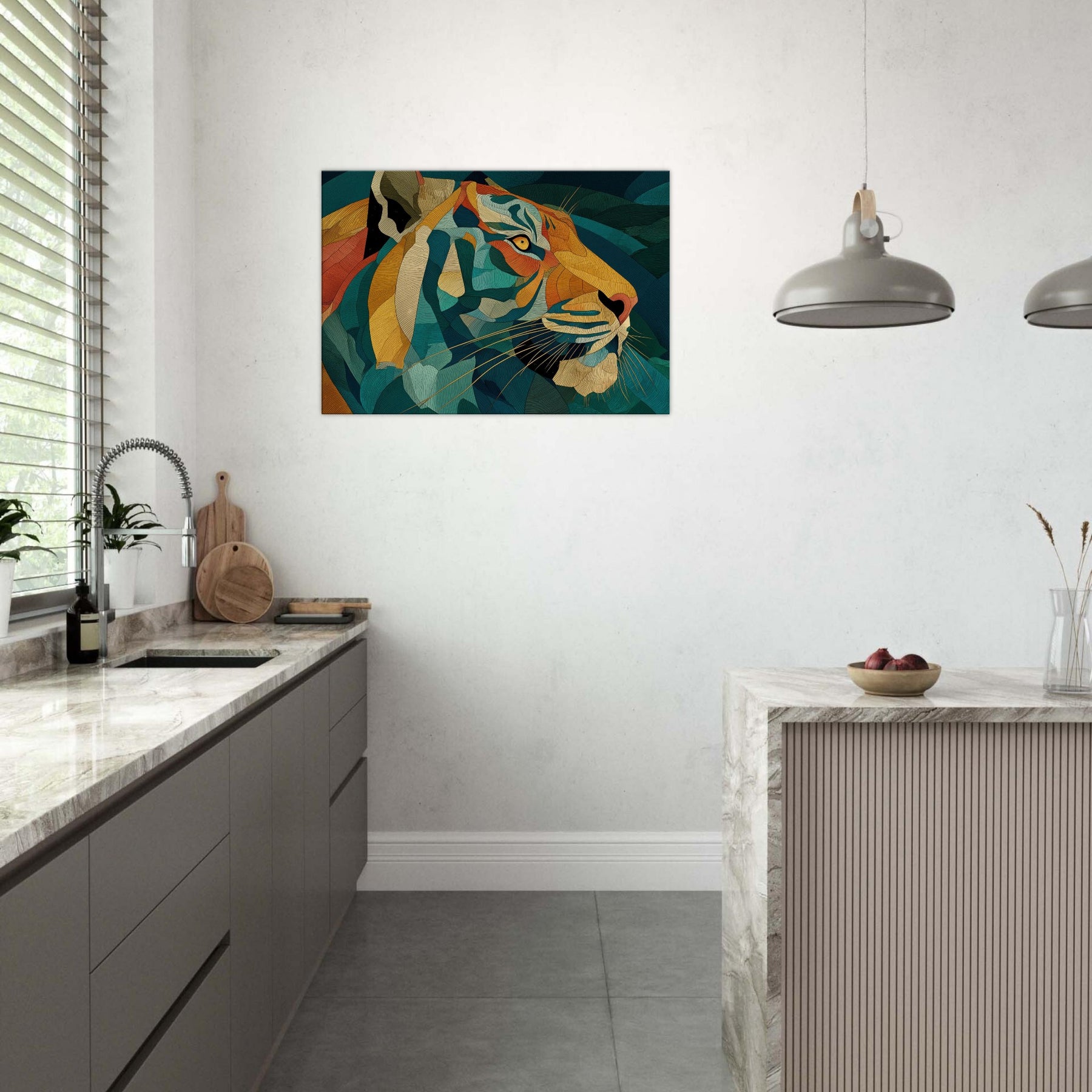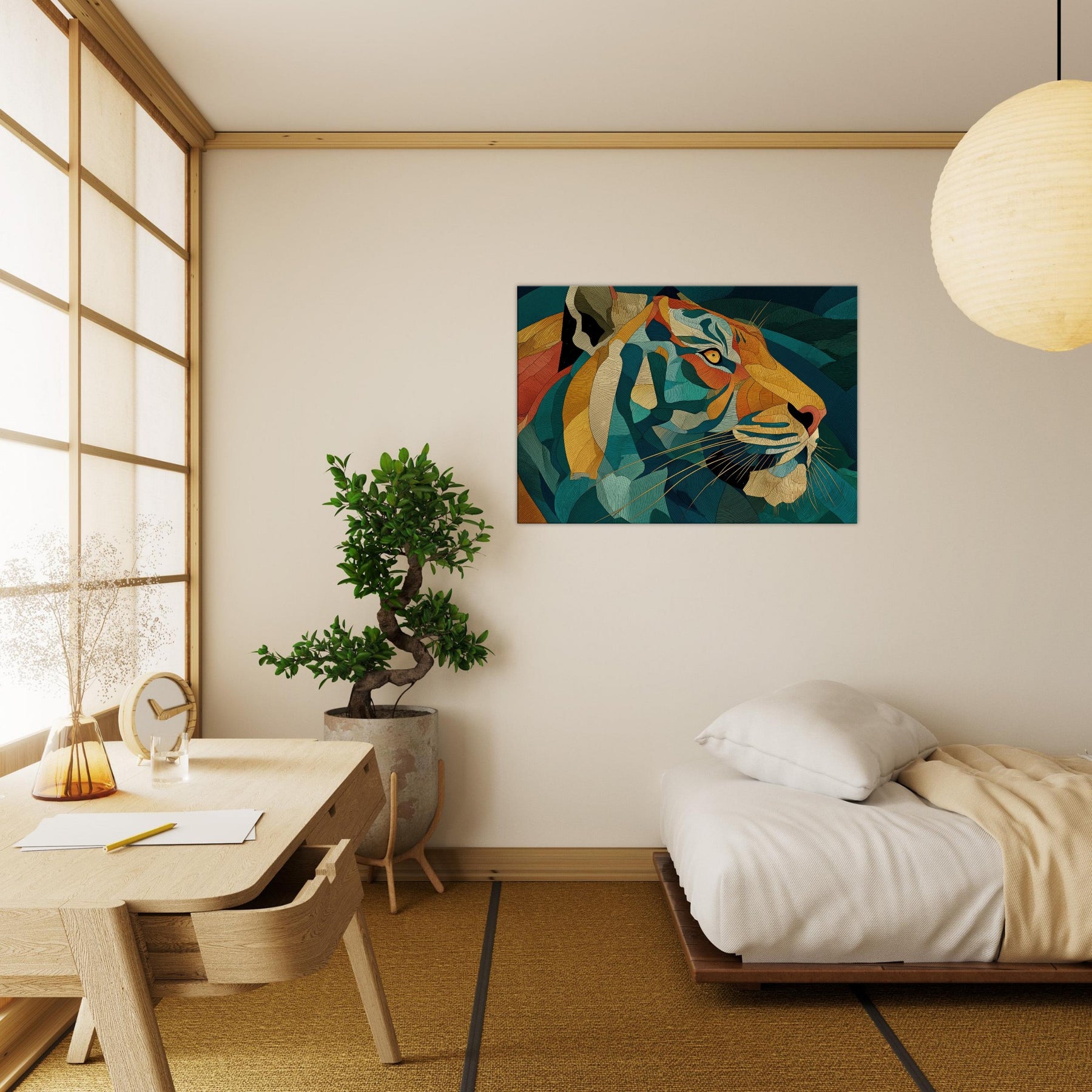 Immersed in jewel toned harmonies, this Tiger steps through an abstract of curves and rhythm. The composition glows with dusk gold, teal, coral, and deep indigo, a sensory tide that breathes warmth into any room. You feel the quiet authority of the tiger as it gazes beyond the frame, inviting presence without shouting. Hang it in a living space or study to spark conversation; the piece moves light across walls, heightens texture in fabrics, and wraps the room in a bold, atmospheric energy.