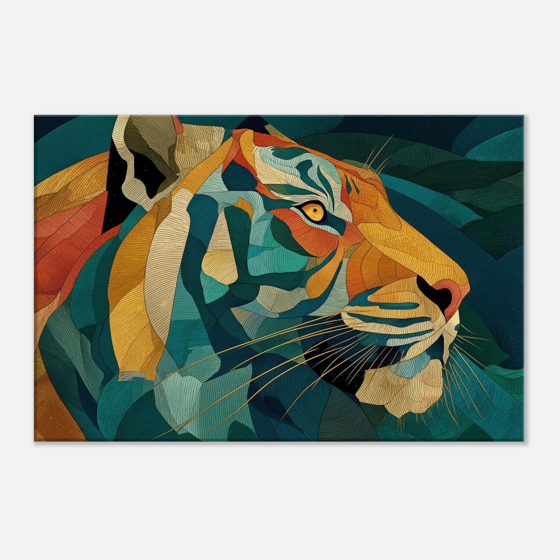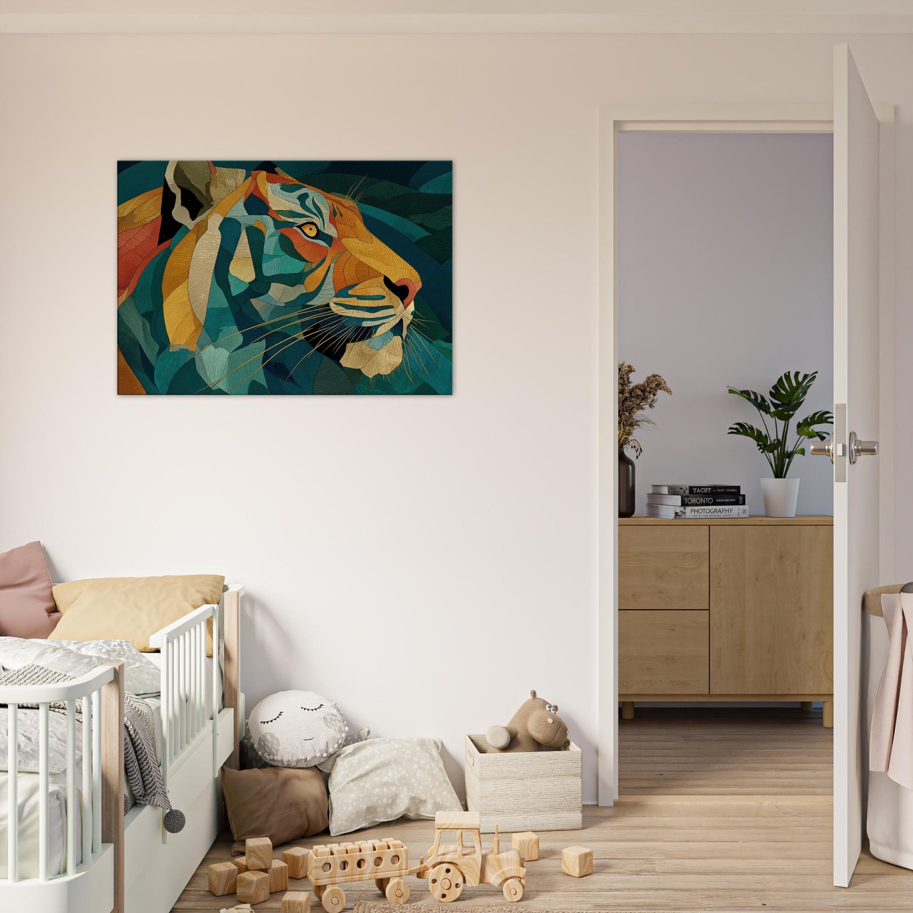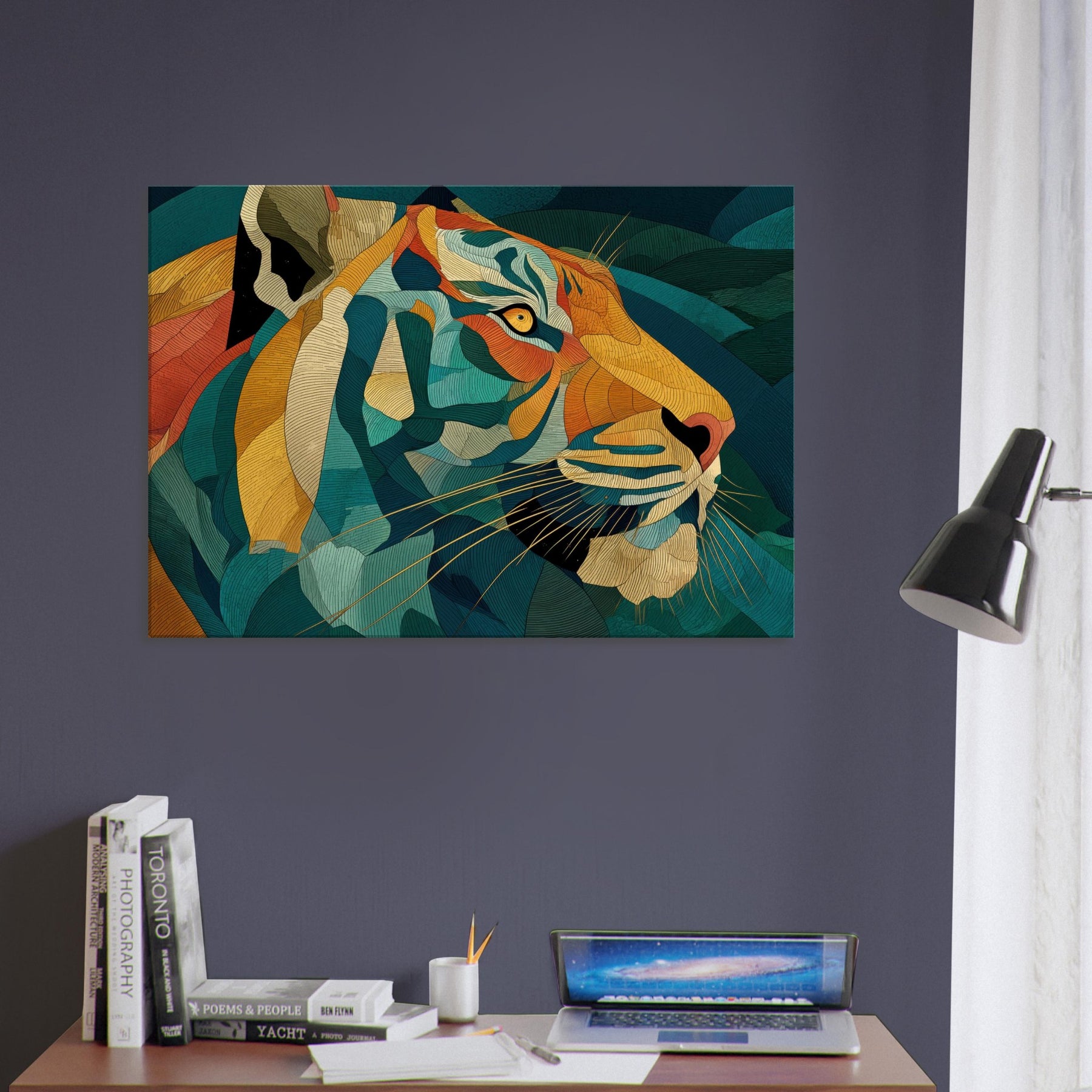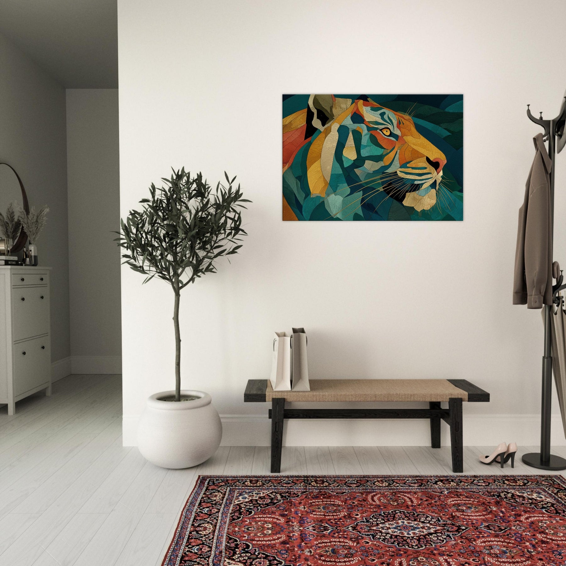 Immersed in jewel toned harmonies, this Tiger steps through an abstract of curves and rhythm. The composition glows with dusk gold, teal, coral, and deep indigo, a sensory tide that breathes warmth into any room. You feel the quiet authority of the tiger as it gazes beyond the frame, inviting presence without shouting. Hang it in a living space or study to spark conversation; the piece moves light across walls, heightens texture in fabrics, and wraps the room in a bold, atmospheric energy.